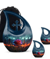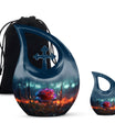 Expertly handcrafted from premium aluminum, this urn features a deep blue teardrop silhouette accented by a delicately engraved dark rose and cross. The striking design captures both strength and grace, making it one of the most elegant burial urns for human ashes or cremation urns for burial in ground. Designed to endure, its durable construction ensures long-lasting preservation, while the secure screw-top lid keeps ashes safely sealed.