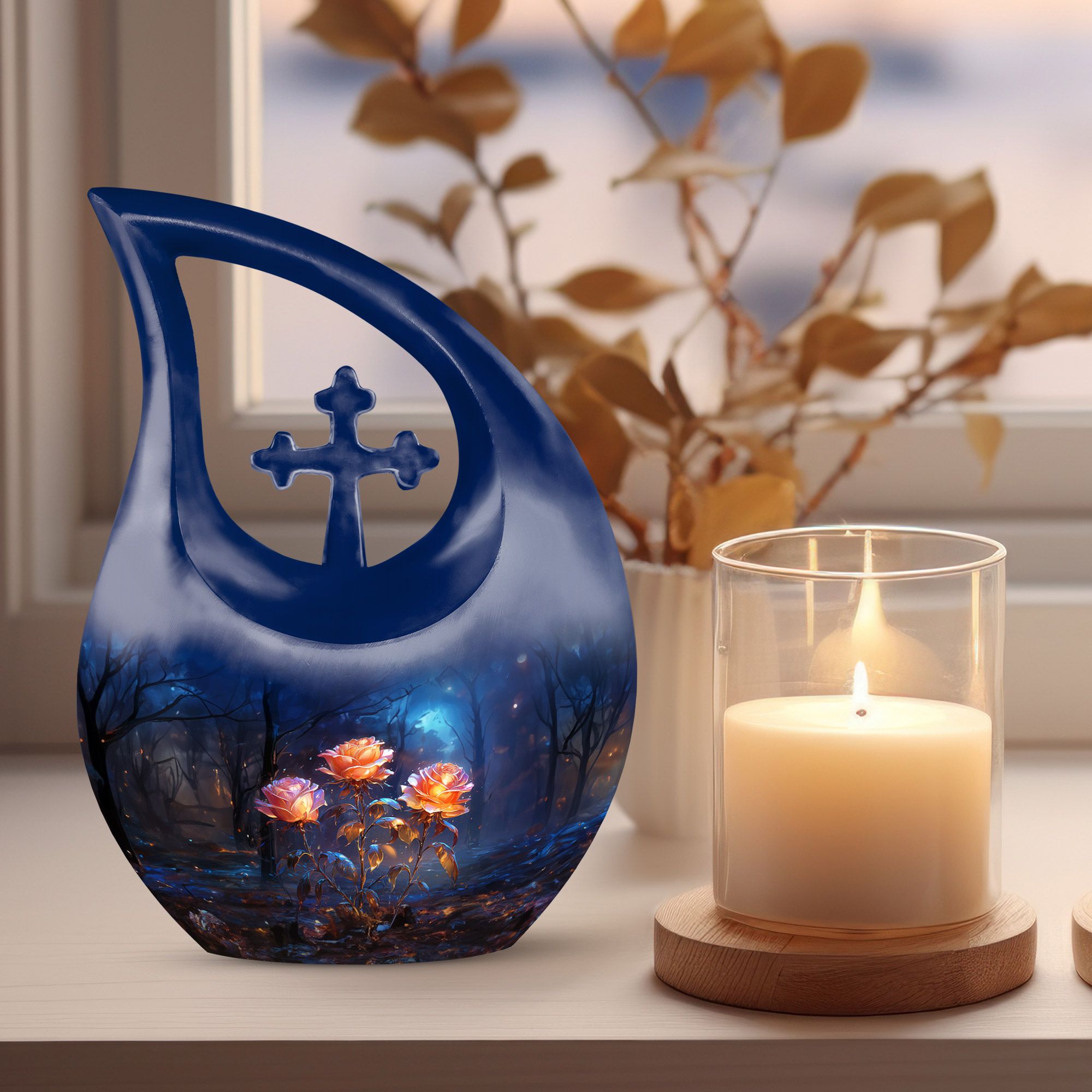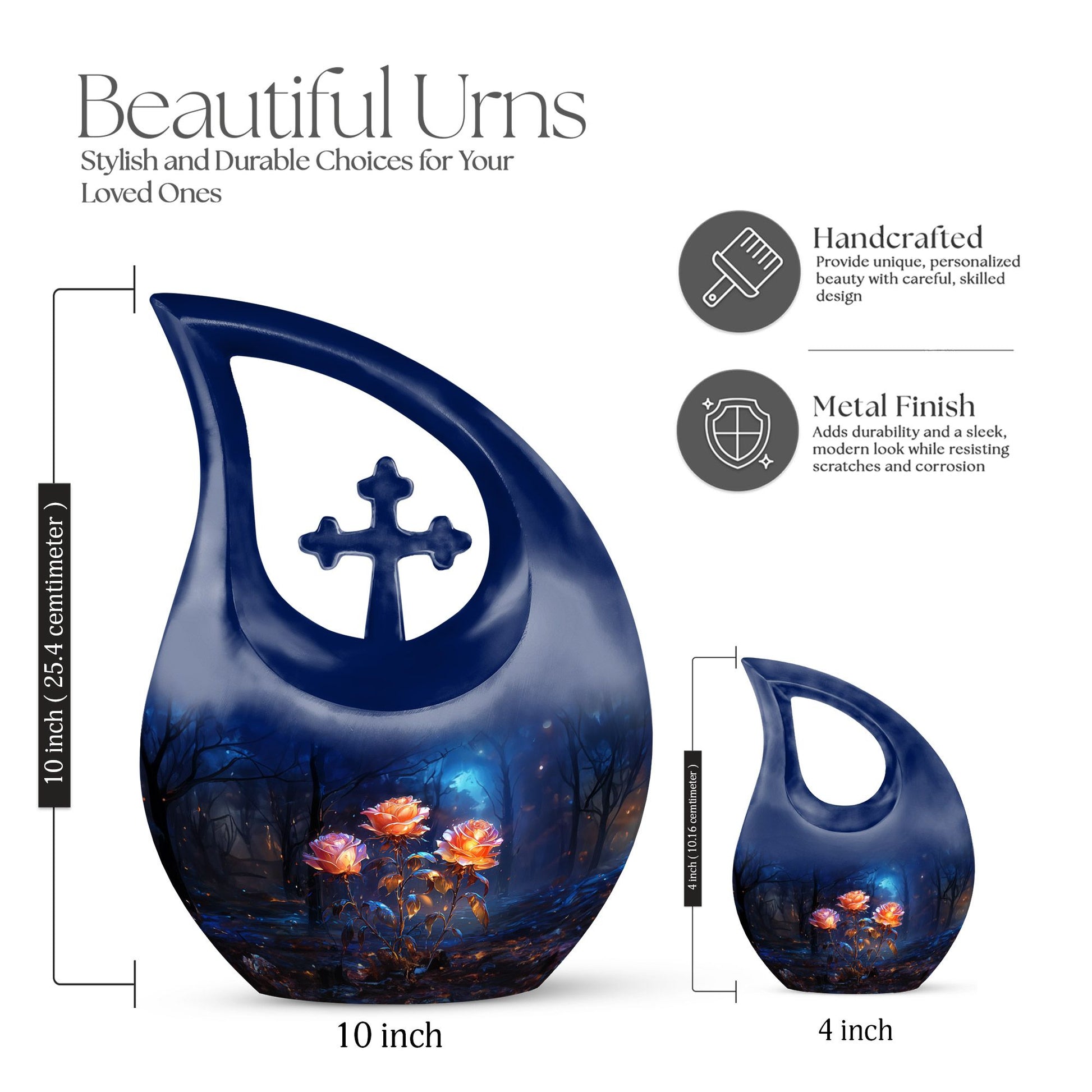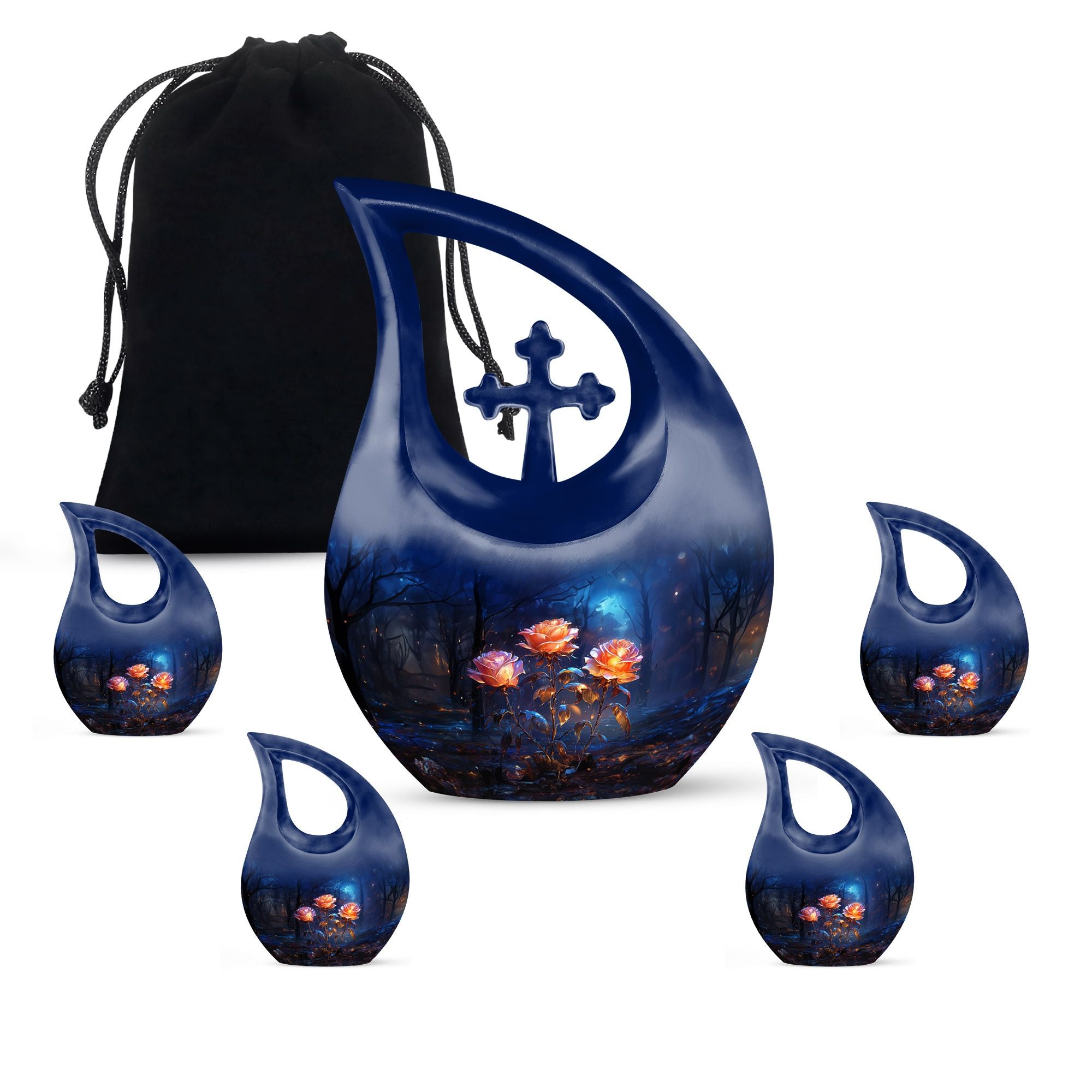 Expertly handcrafted from premium aluminum, this large cremation urn features a rich dark blue teardrop shape adorned with radiant glowing roses — a design that signifies eternal love and remembrance. Whether you’re honoring an urn large adult male or selecting a large urn for adult ashes, its combination of artistry and durability ensures it remains a lasting keepsake. This piece stands among the most refined adult urns for human ashes large, blending elegance with heartfelt symbolism.