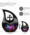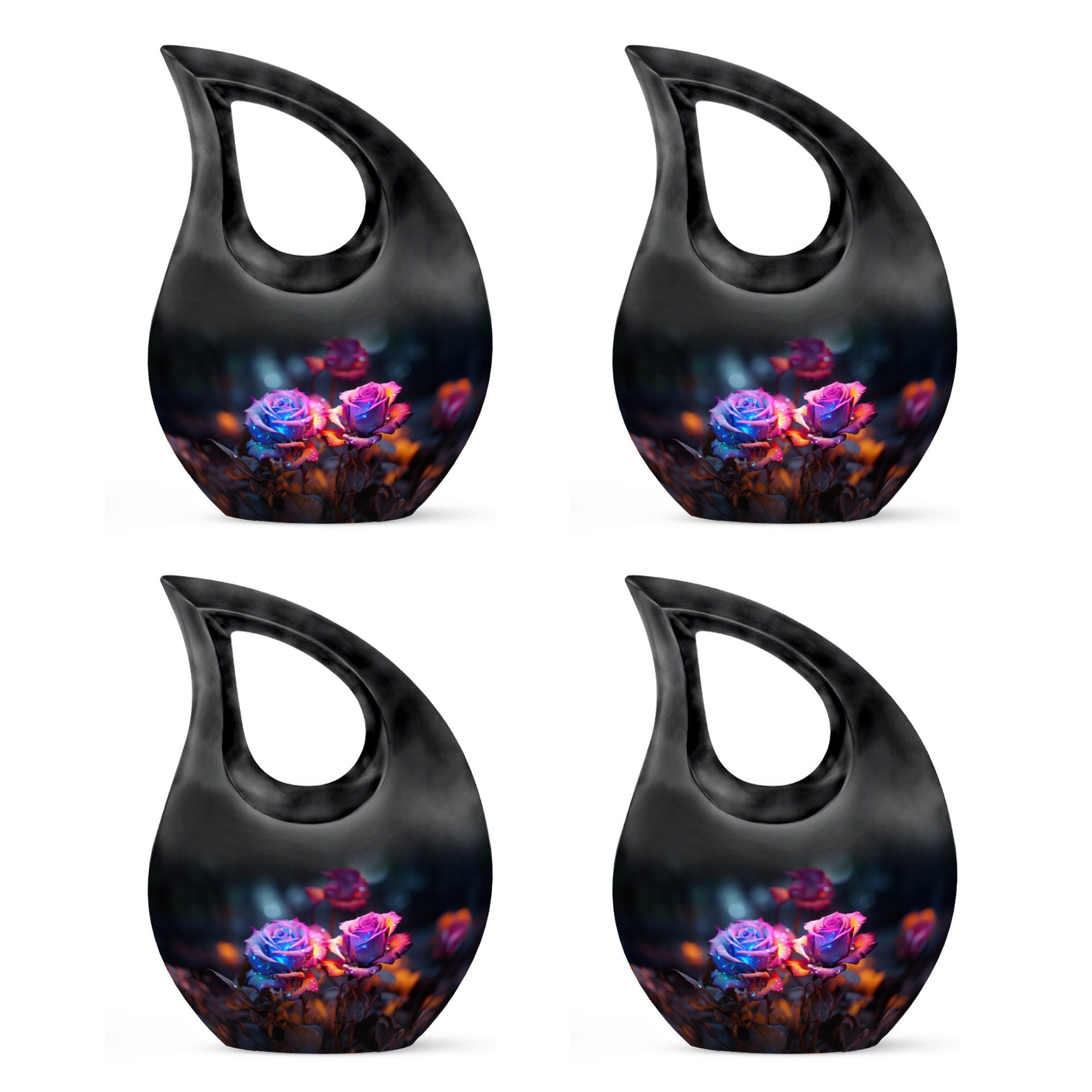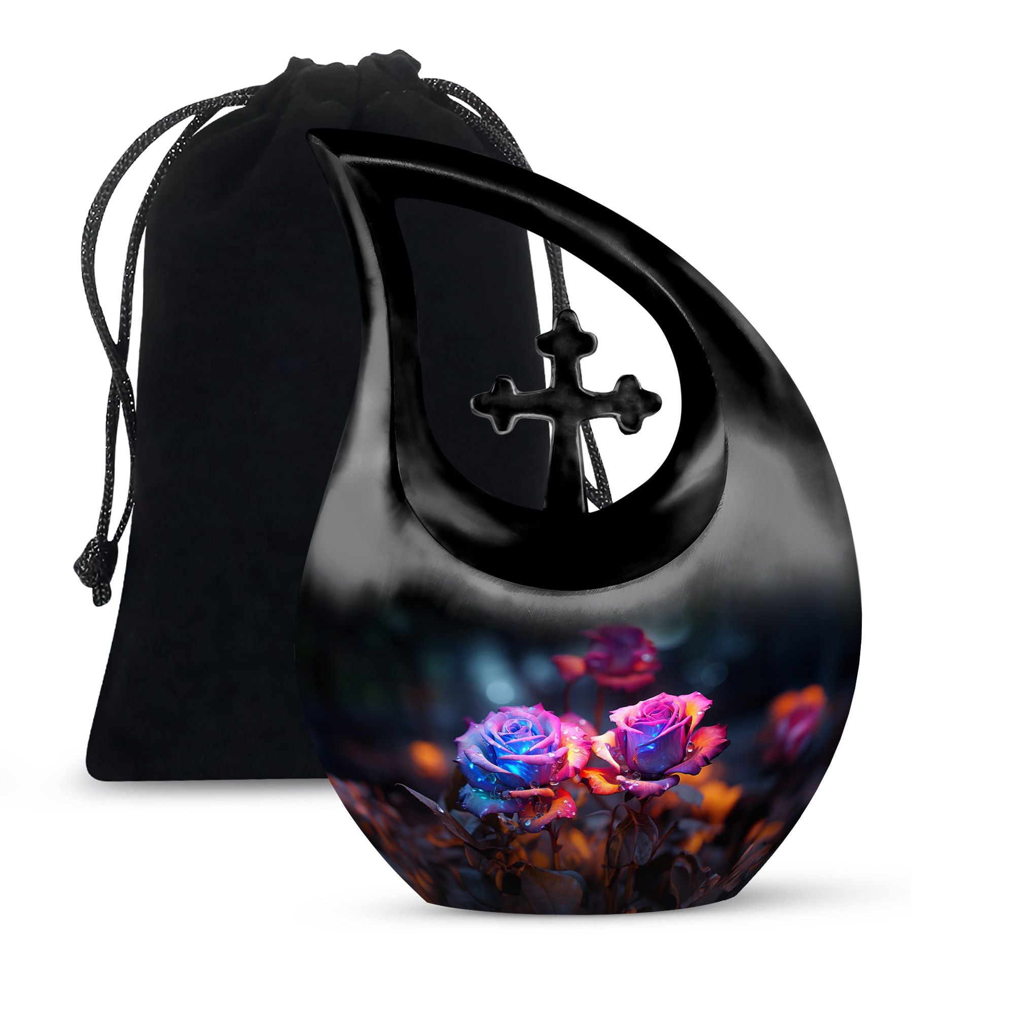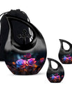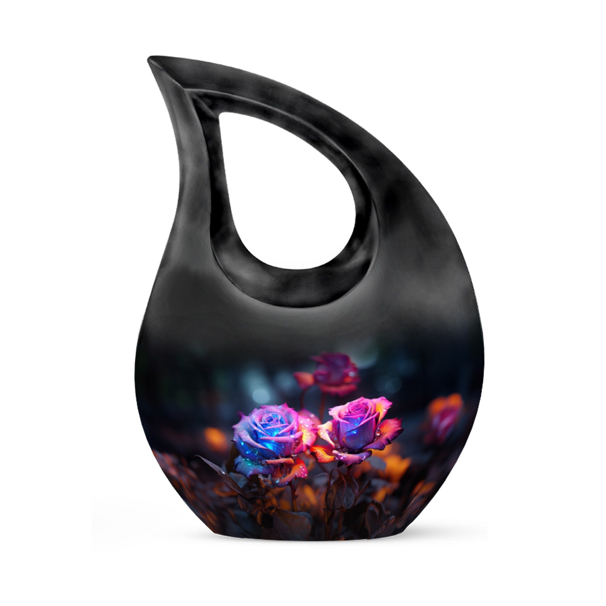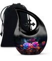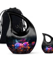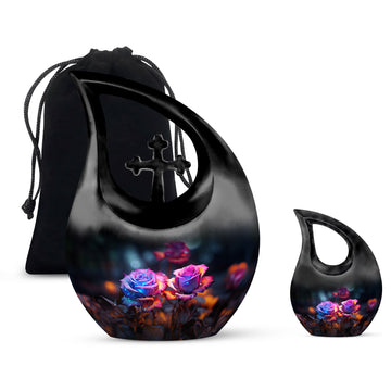 Crafted from high-quality aluminum, this funeral urn combines durability and artistry in one timeless piece. The sleek black finish is adorned with a striking neon pink and blue rose motif — symbolizing beauty, strength, and everlasting connection. Designed for both large and small needs, this urn can be part of cremation urns large & small combo sets or used individually as a funeral urn ashes keepsake. The secure screw-top lid ensures ashes remain safely sealed, providing peace of mind and dignity in remembrance.