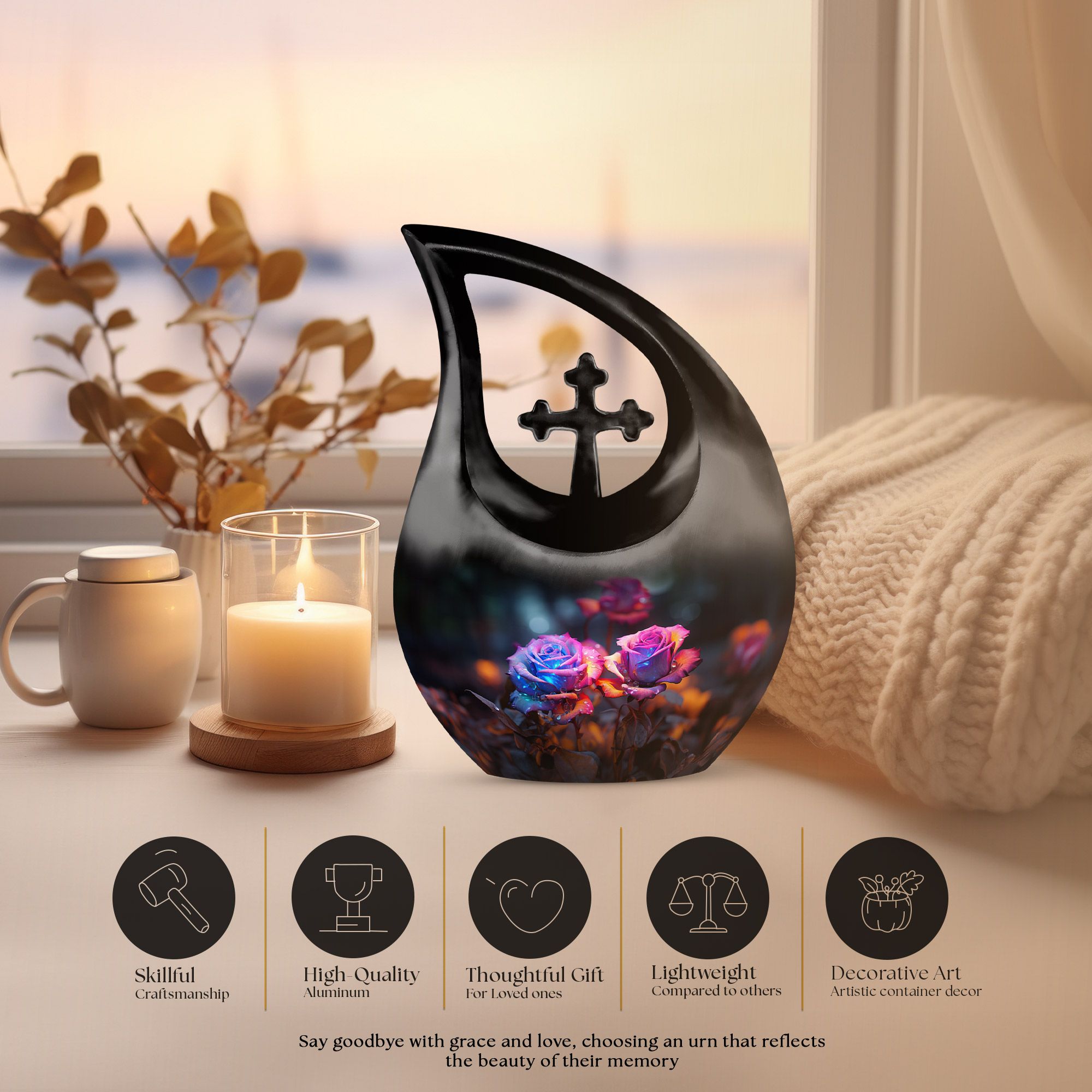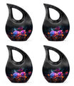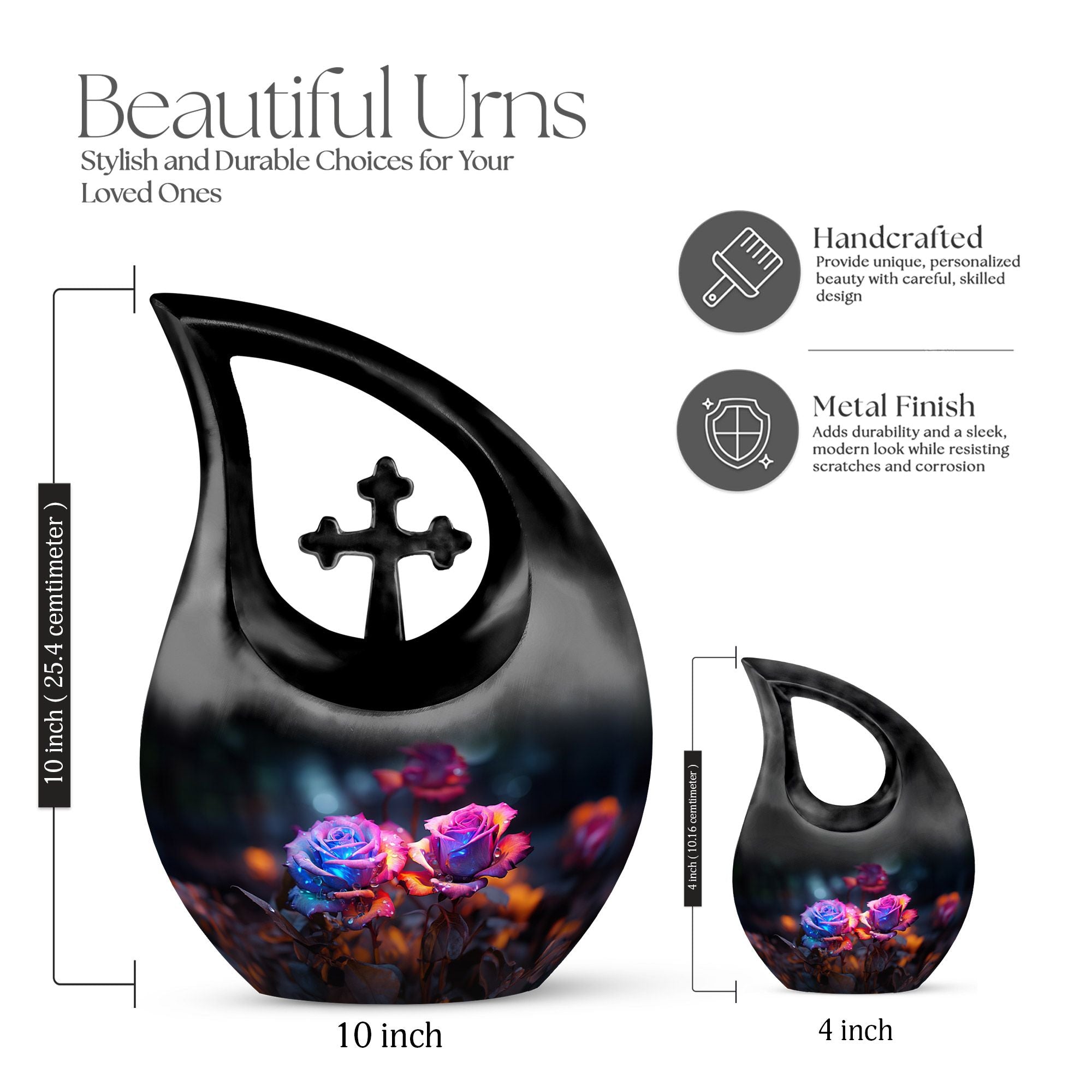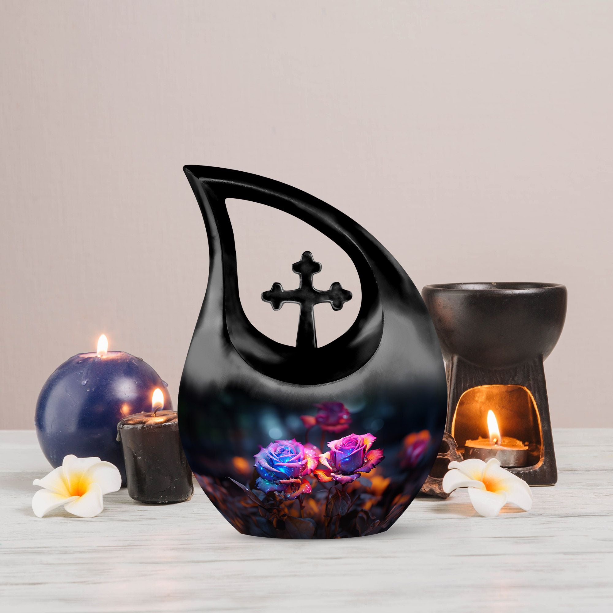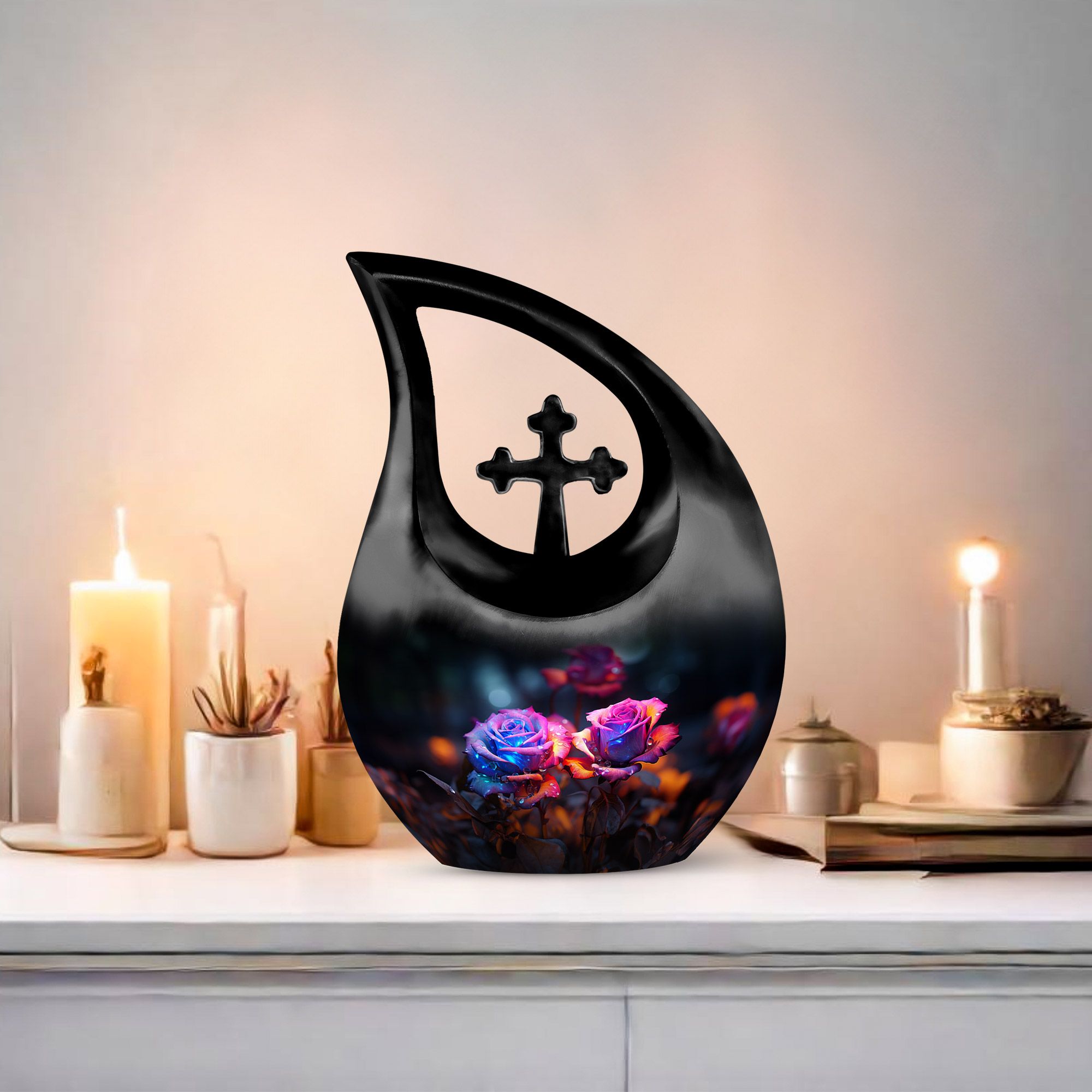 Crafted from high-quality aluminum, this funeral urn combines durability and artistry in one timeless piece. The sleek black finish is adorned with a striking neon pink and blue rose motif — symbolizing beauty, strength, and everlasting connection. Designed for both large and small needs, this urn can be part of cremation urns large & small combo sets or used individually as a funeral urn ashes keepsake. The secure screw-top lid ensures ashes remain safely sealed, providing peace of mind and dignity in remembrance.