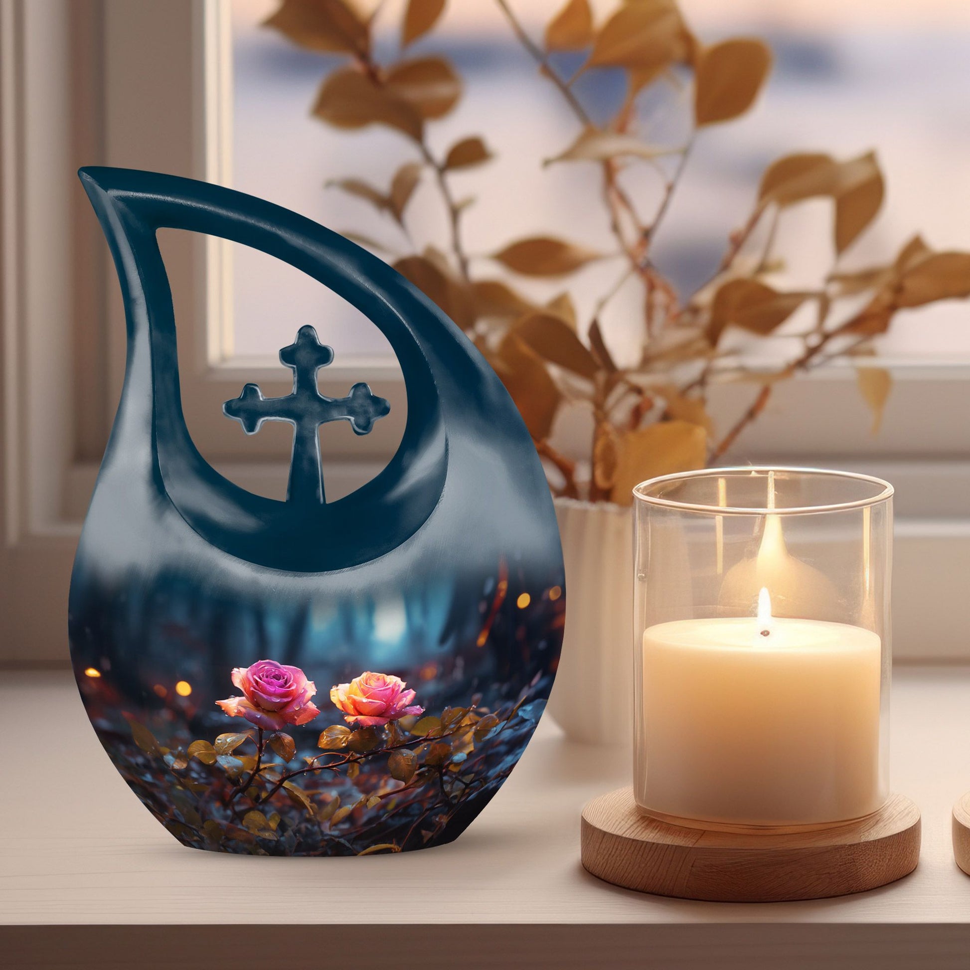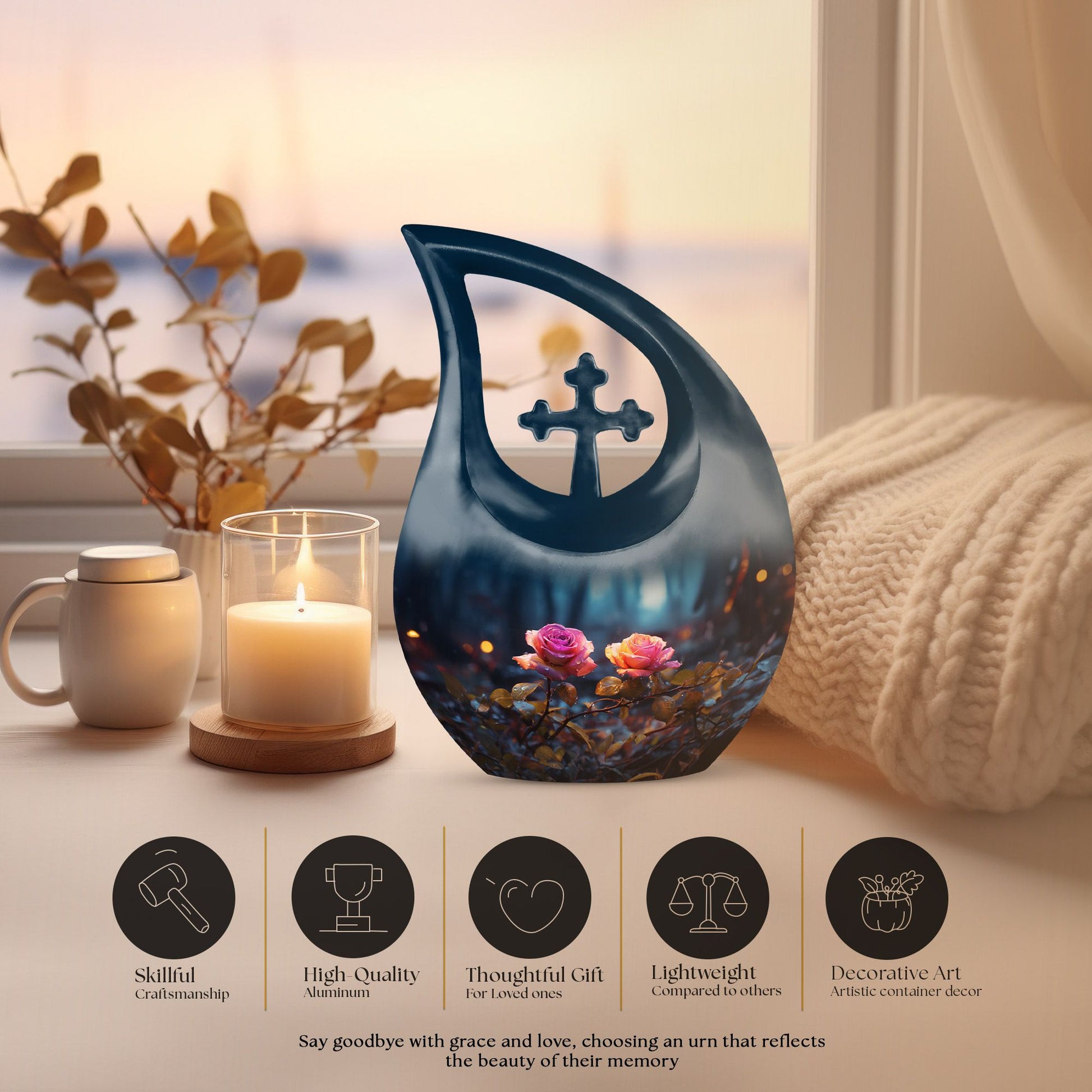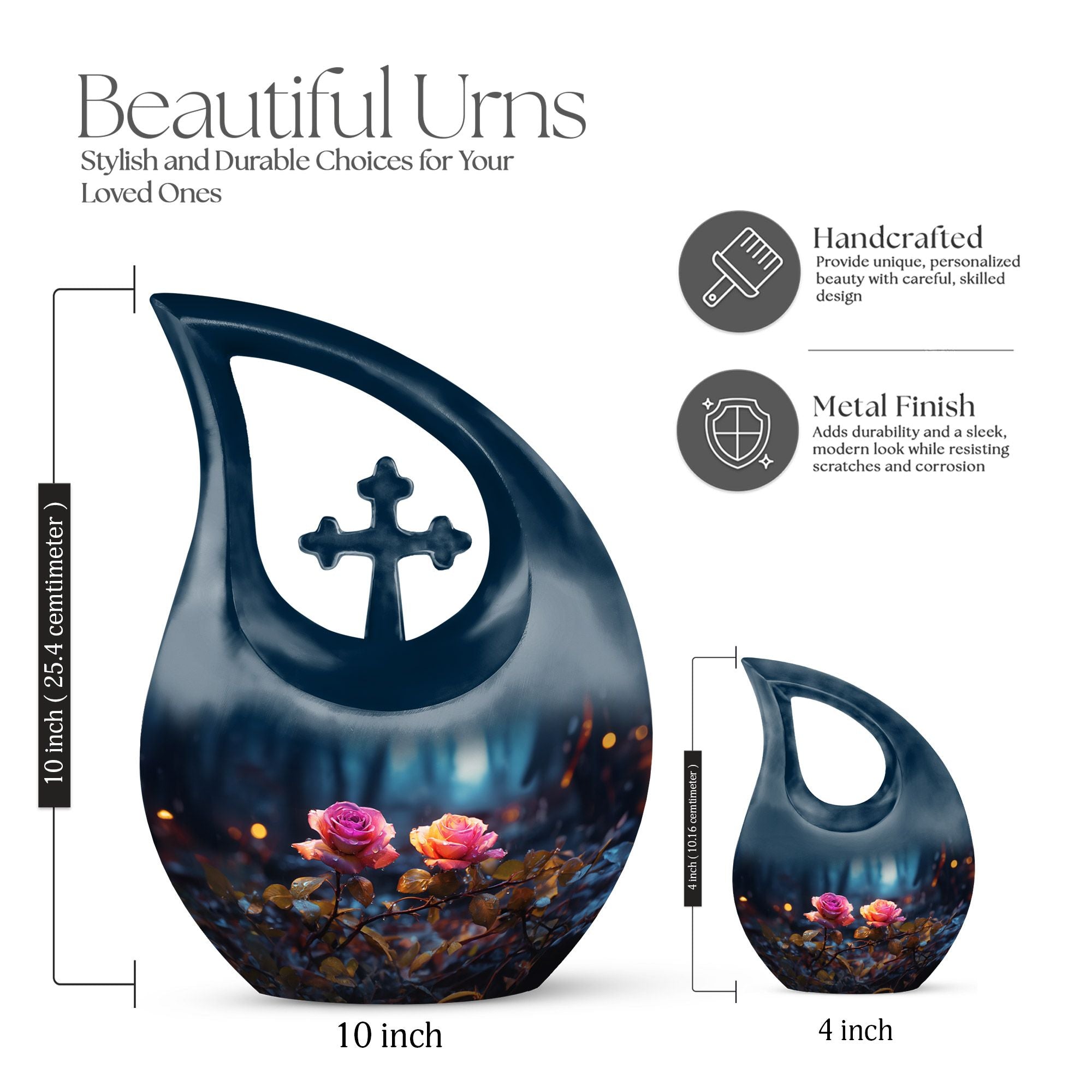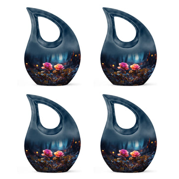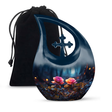 Expertly handcrafted from premium aluminum, this urn showcases a radiant blue finish accented by a delicately engraved dual rose and cross motif — representing purity, eternal rest, and devotion. Its compact yet spacious design makes it ideal for those seeking urns for ashes adult male or small urns for human ashes adult female. The secure screw-top lid ensures ashes remain safely sealed, while the luminous sheen adds beauty and grace to any memorial display or resting place.