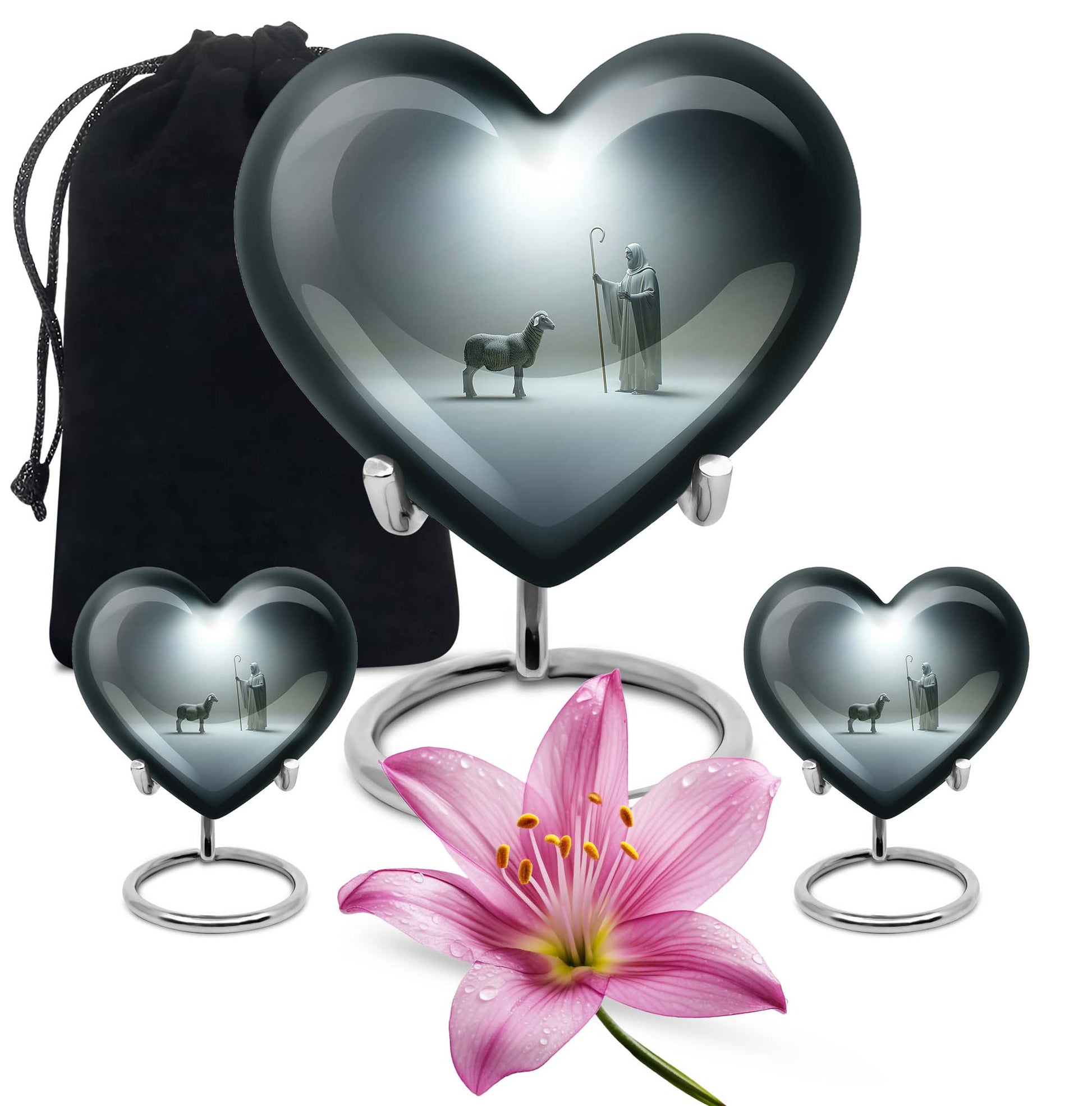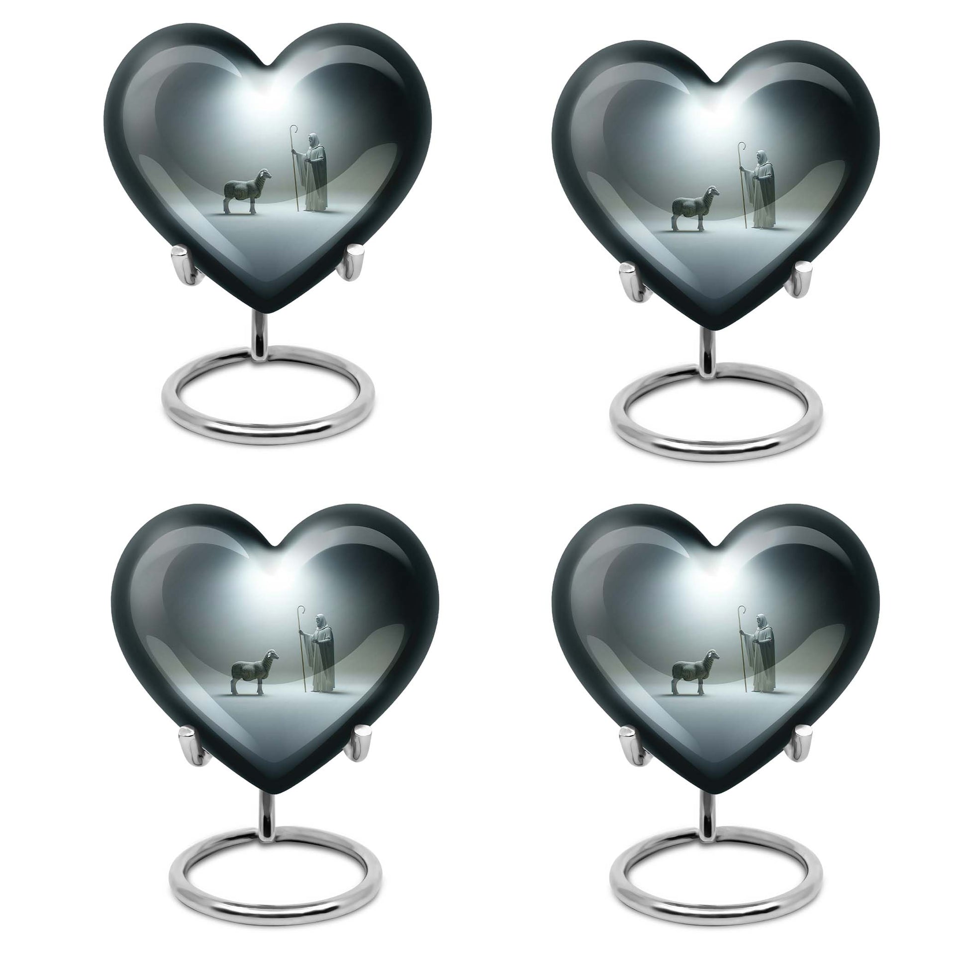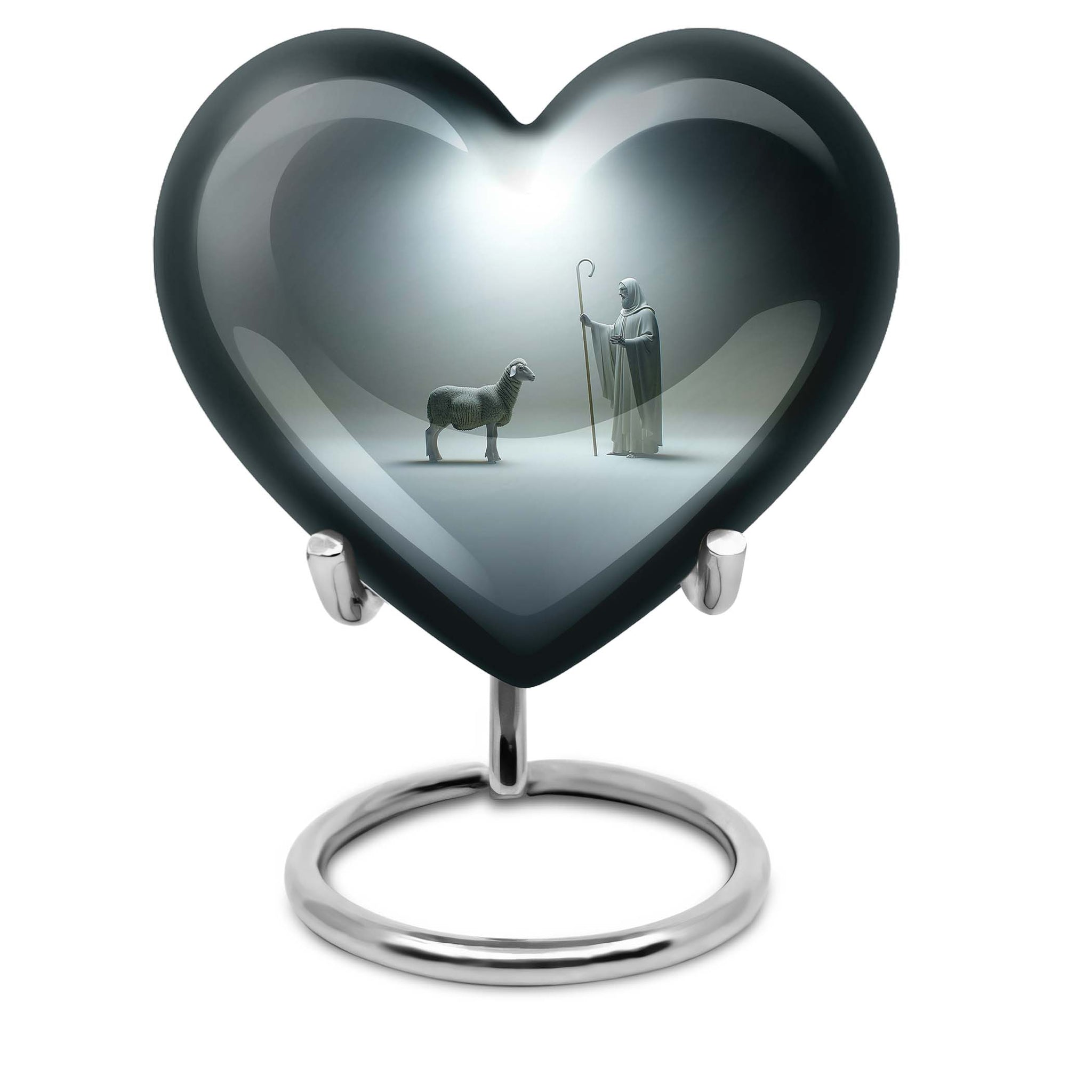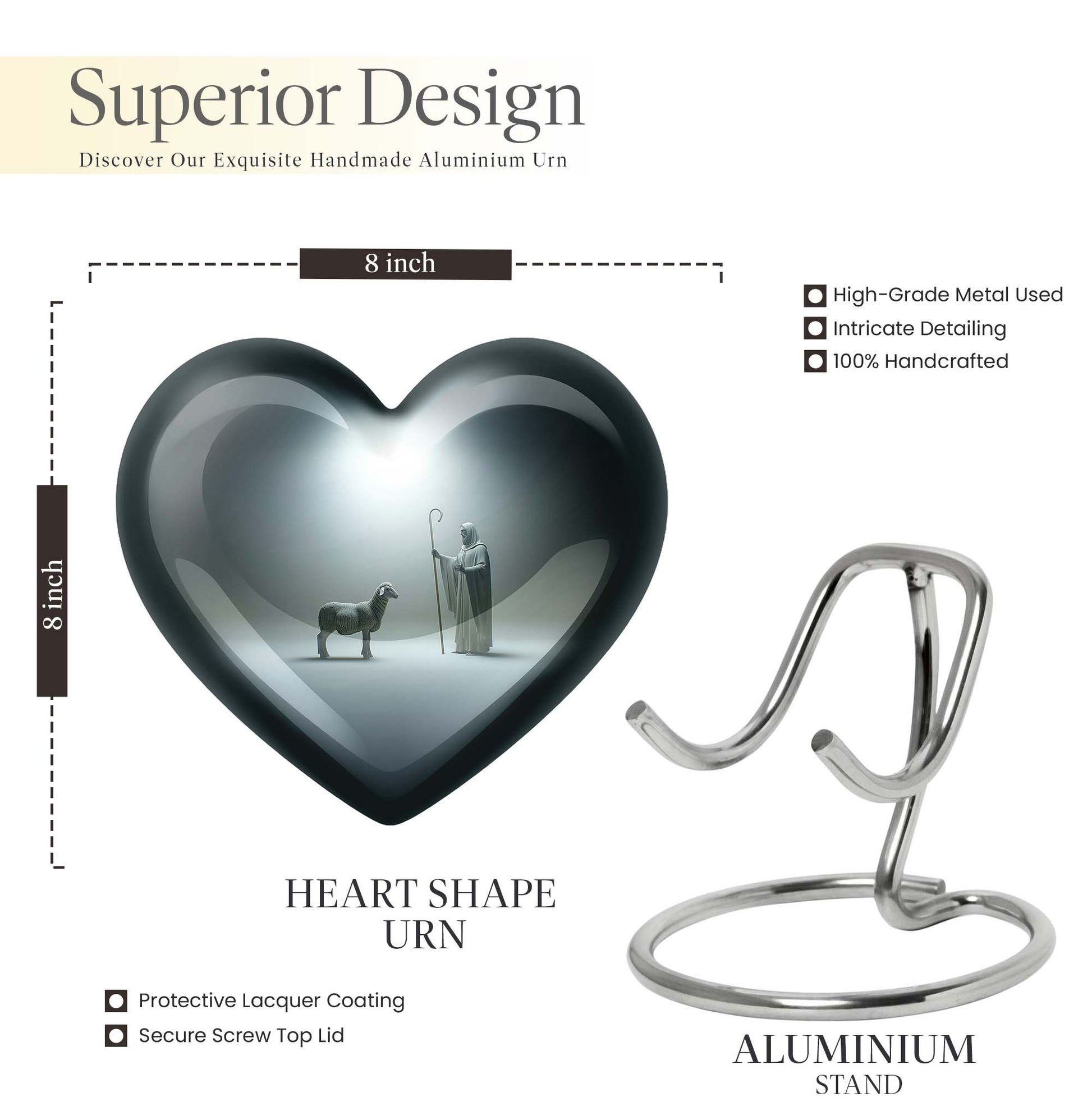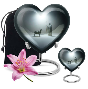 Discover our enchanting Shepherd Urn - an emblem of spirituality and serenity. This large urn is crafted from resilient aluminium, making it fitting for both burial and keepsake purpose. With specifications of 10 inches in height and a weight of 3.3 pounds, this majestic memorial urn can hold up to 200 cubic inches of ashes. Impeccably versatile, it comes with a velvet pouch for secure containment of the precious ashes. This personalized urn, celebrating the abstract theme, comes with the option of engraving names on it, further adding a personal touch to your lasting tributes. Key searches like 'funeral metal urn', 'urns for burial', or 'shaped ashes urn' mirror our 10 Inch Heart Urn’s unique appeal in the marketplace. Commemorate your loved ones' memories with grace and dignity with our Shepherd Urn - a significant symbol in memorial urns for ashes.