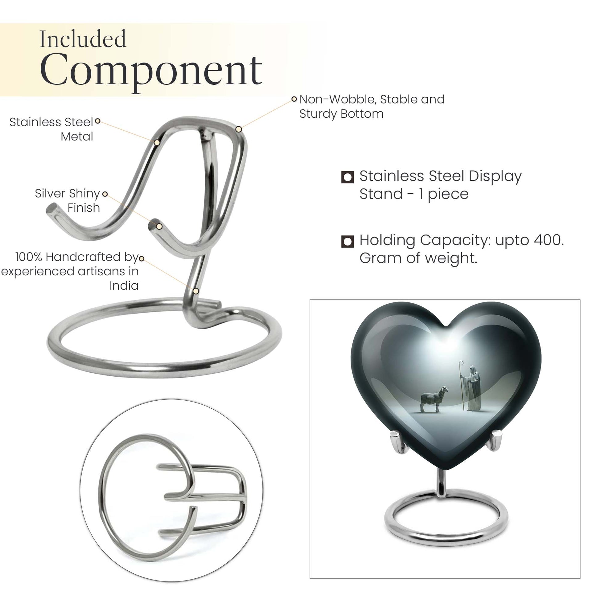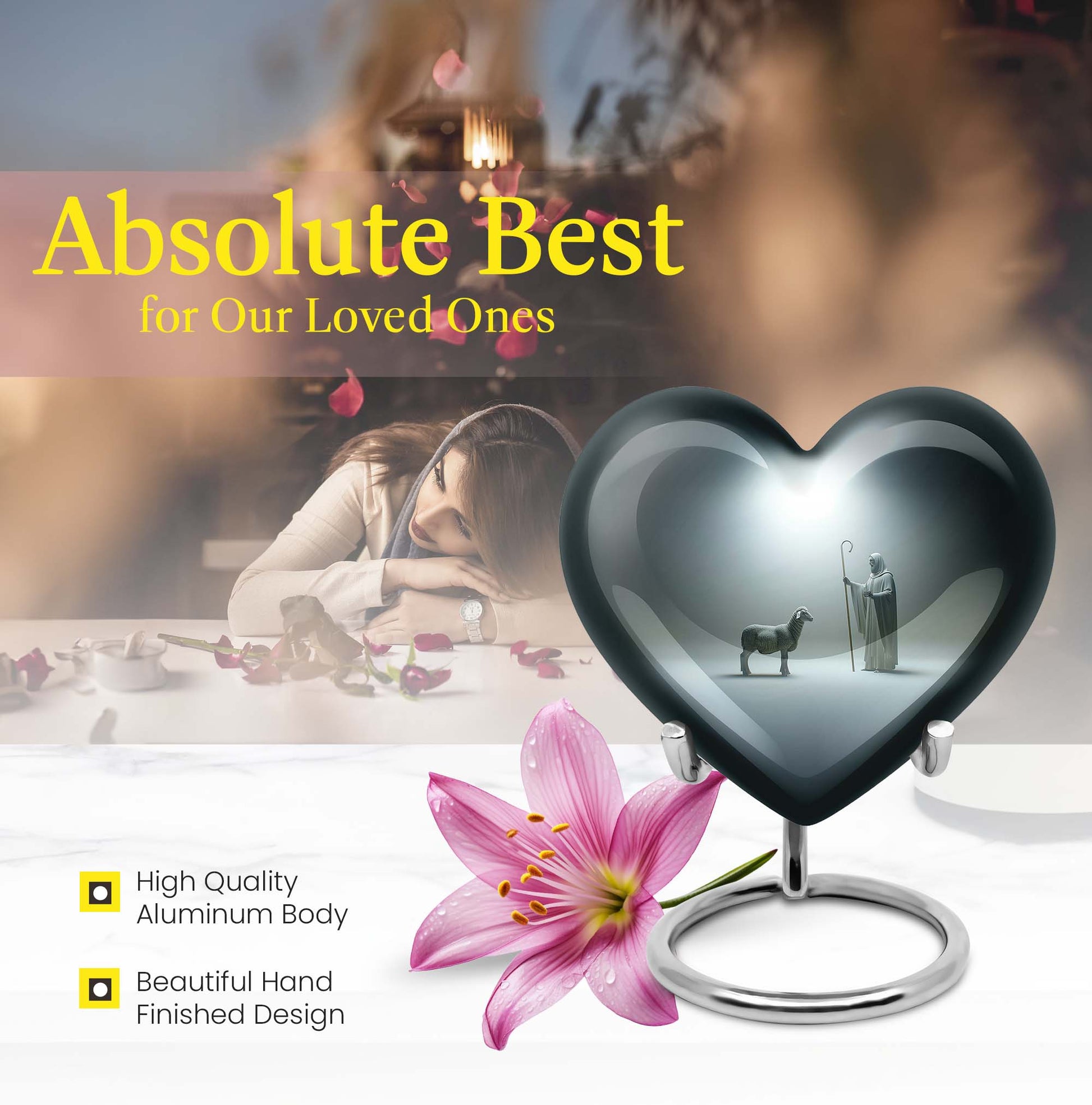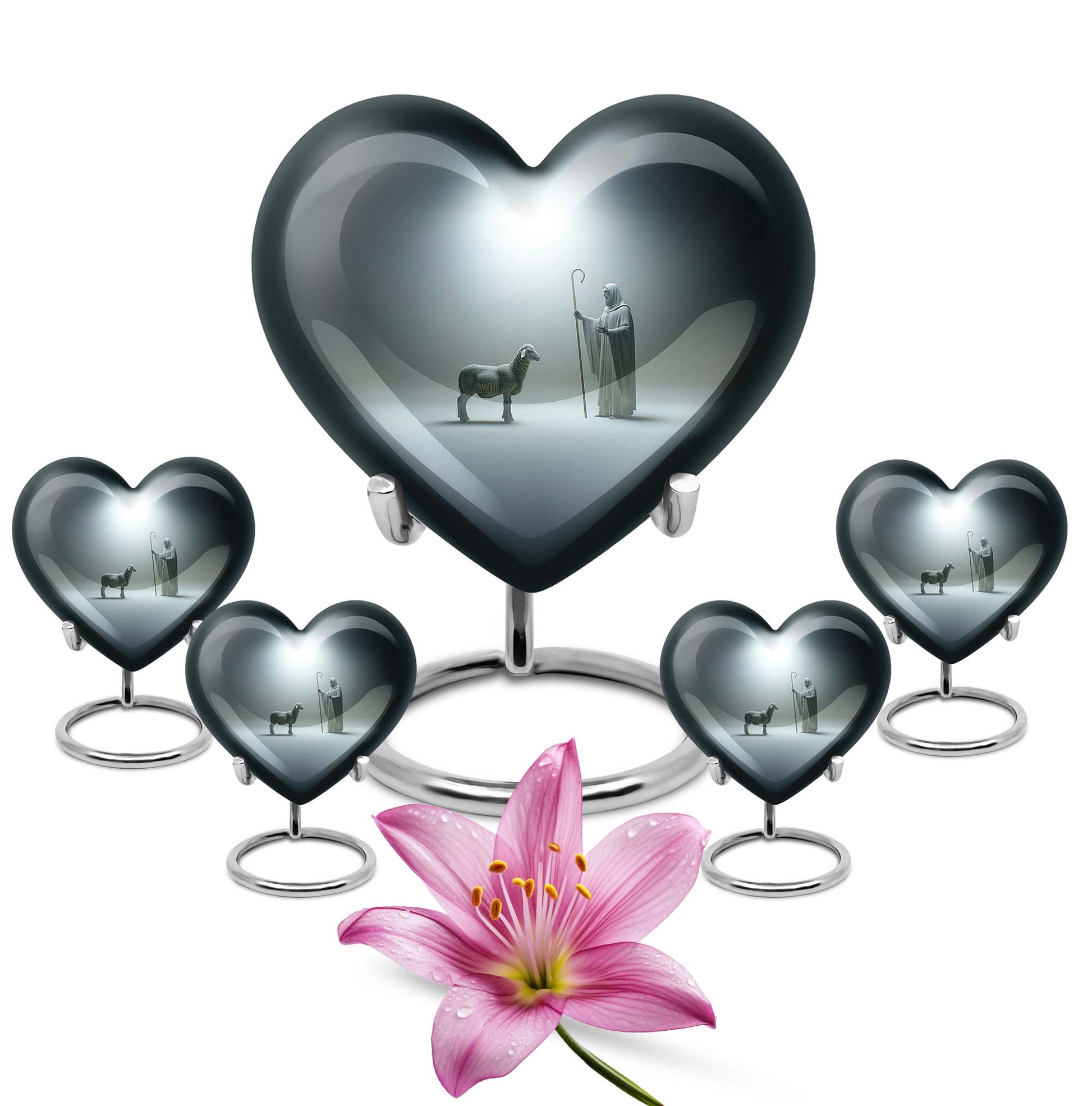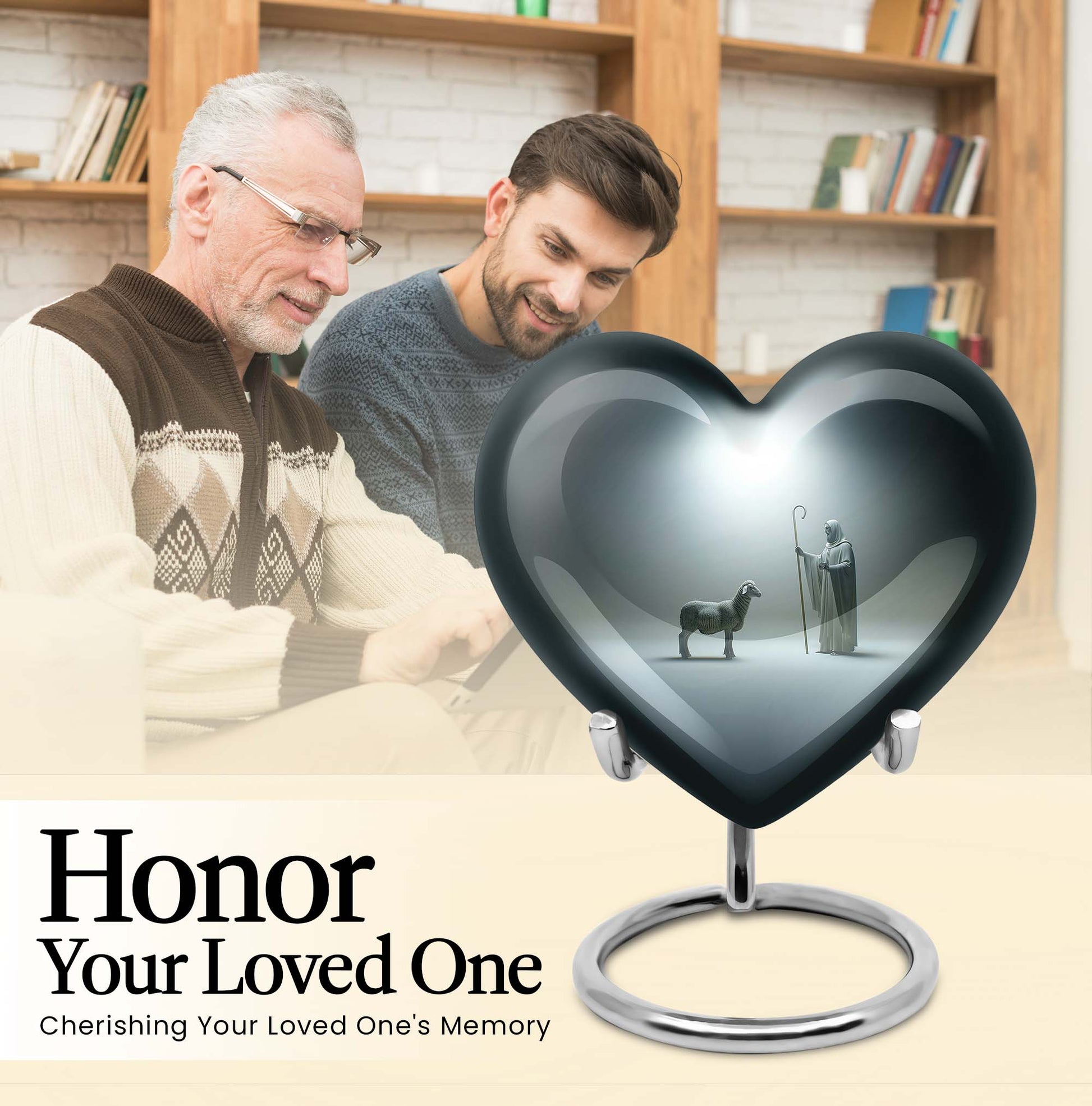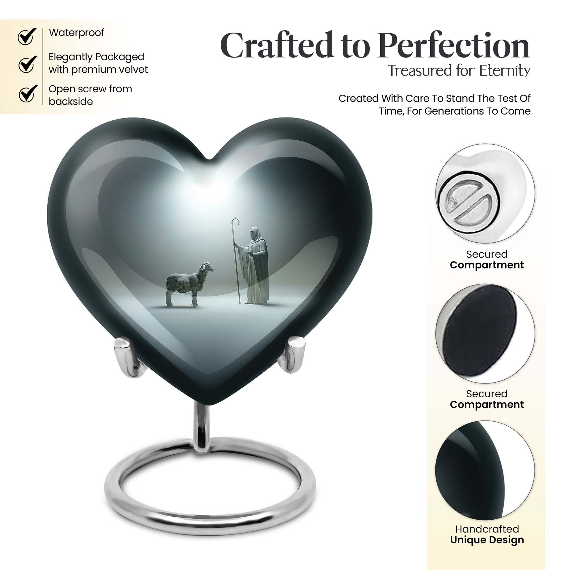 Discover our enchanting Shepherd Urn - an emblem of spirituality and serenity. This large urn is crafted from resilient aluminium, making it fitting for both burial and keepsake purpose. With specifications of 10 inches in height and a weight of 3.3 pounds, this majestic memorial urn can hold up to 200 cubic inches of ashes. Impeccably versatile, it comes with a velvet pouch for secure containment of the precious ashes. This personalized urn, celebrating the abstract theme, comes with the option of engraving names on it, further adding a personal touch to your lasting tributes. Key searches like 'funeral metal urn', 'urns for burial', or 'shaped ashes urn' mirror our 10 Inch Heart Urn’s unique appeal in the marketplace. Commemorate your loved ones' memories with grace and dignity with our Shepherd Urn - a significant symbol in memorial urns for ashes.