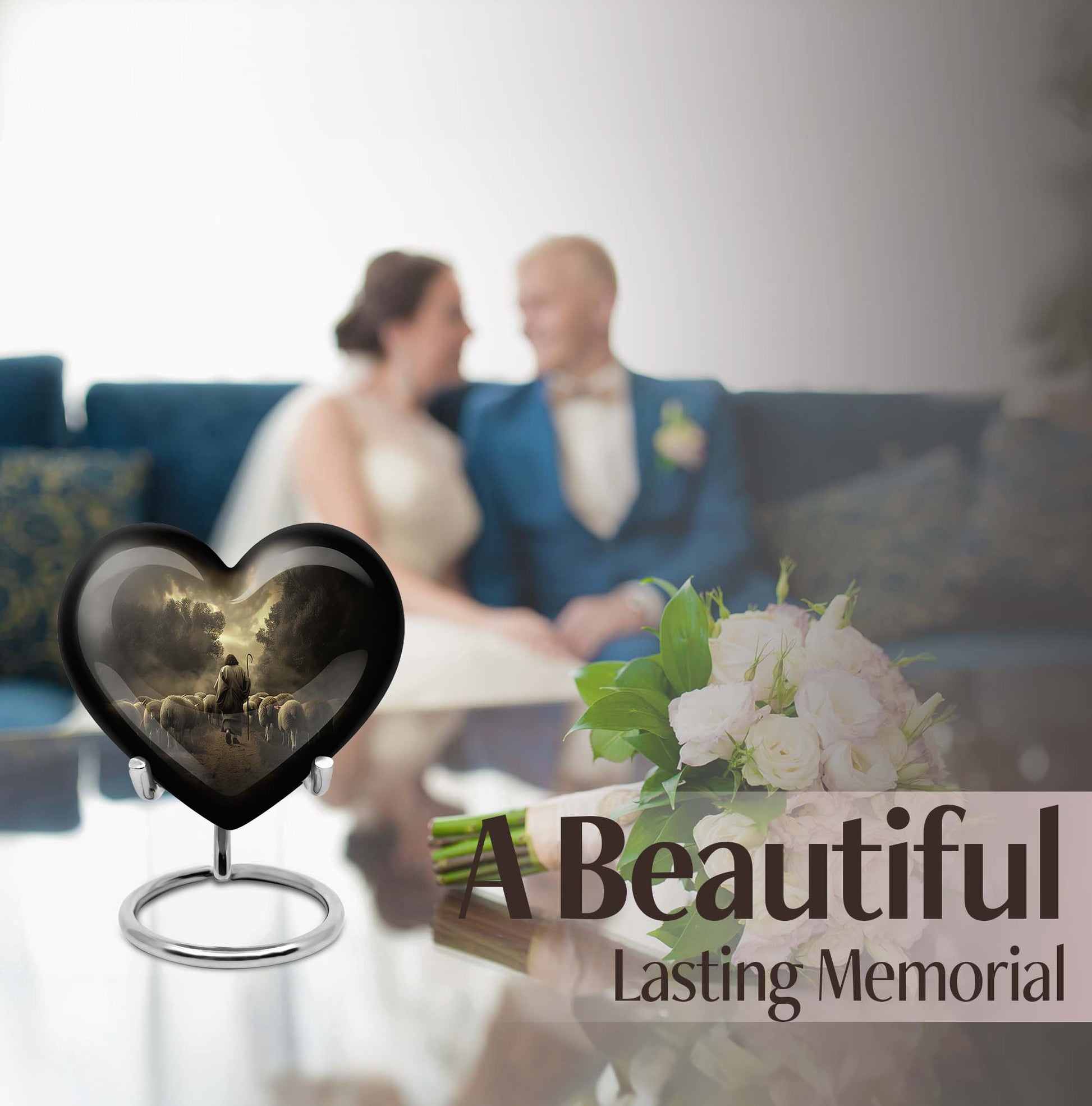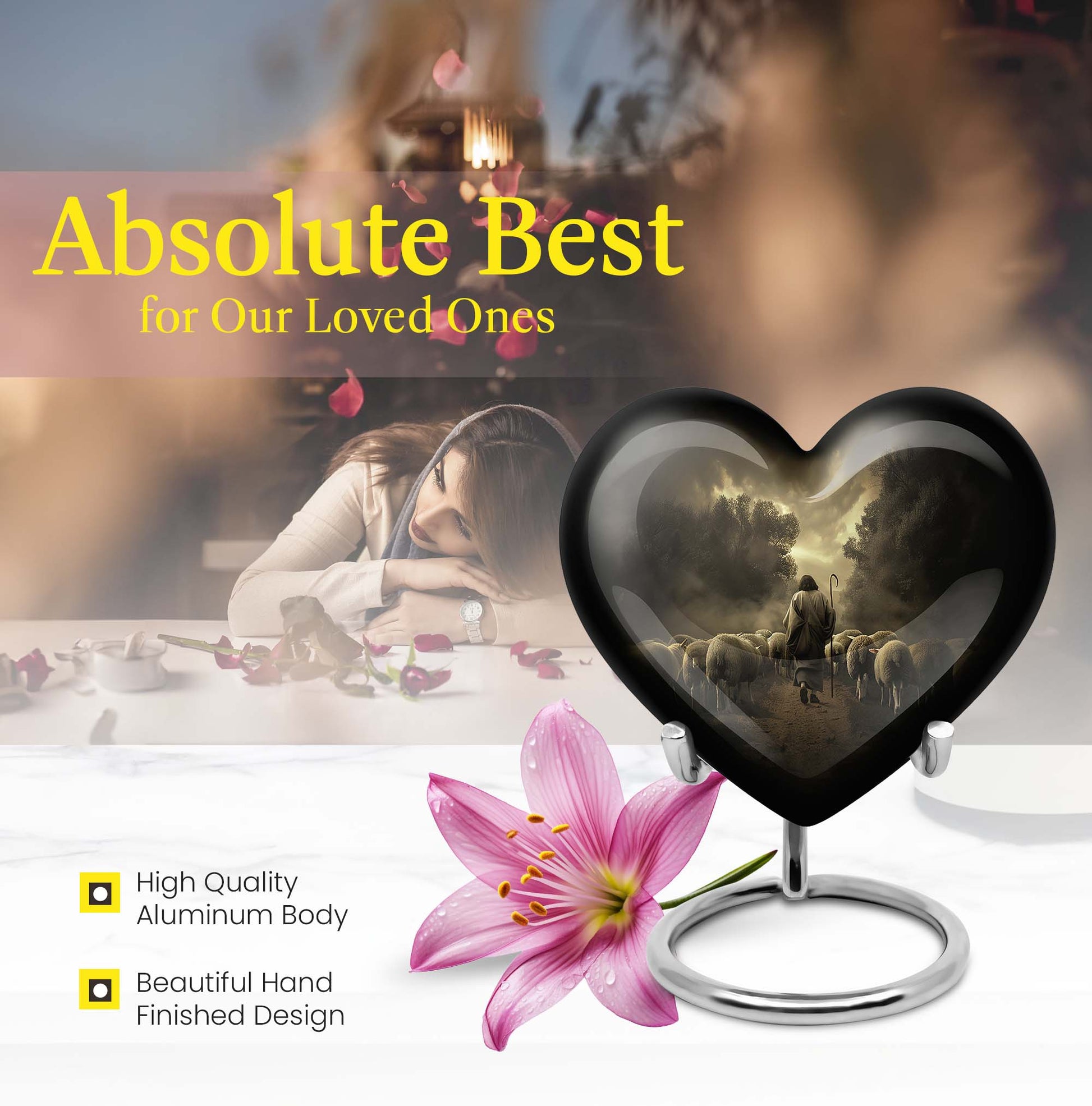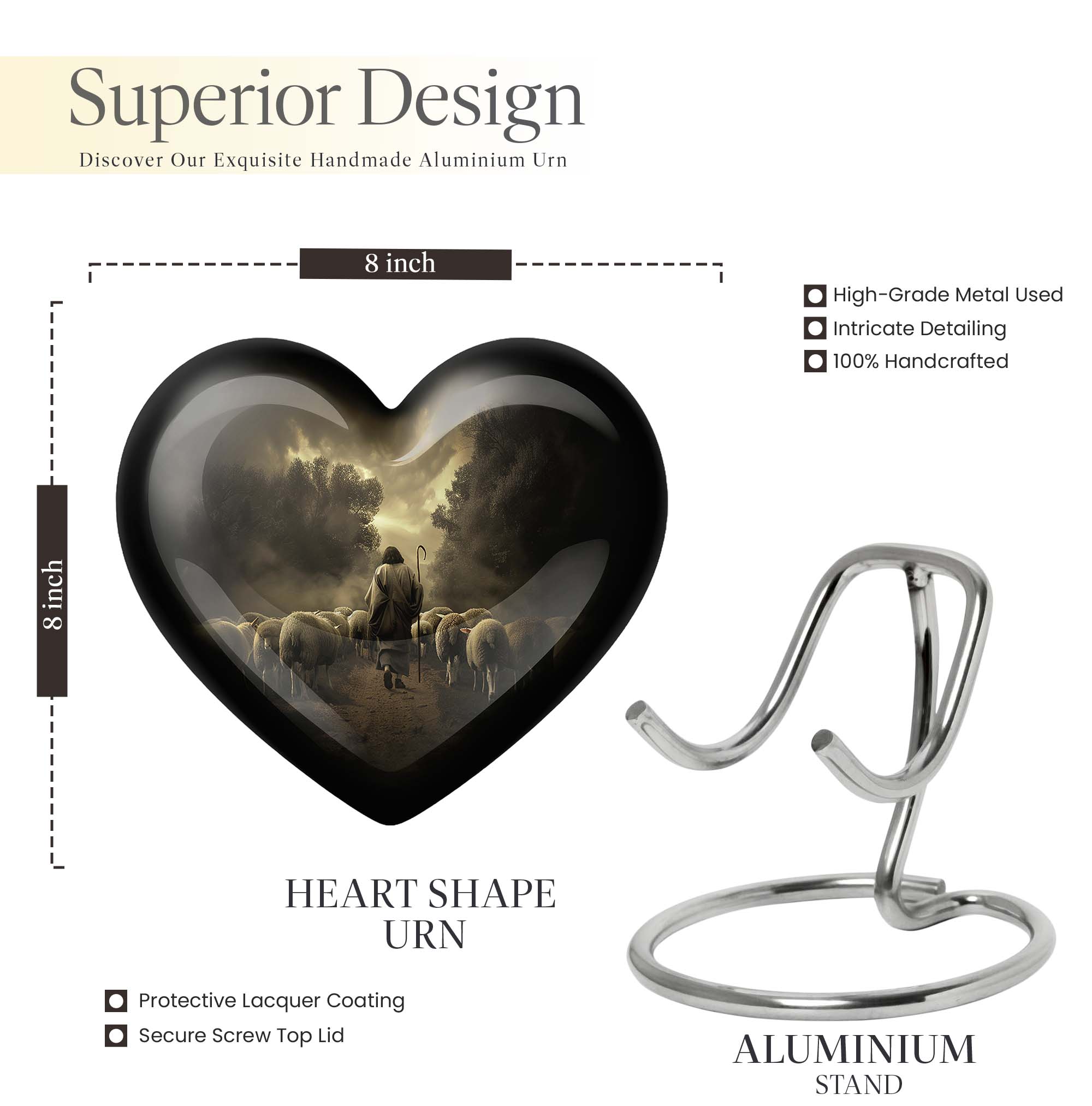 Emanate pure love even in absence with this exquisite 10-inch Shepherd Urn, a unique tribute to those loved but unseen, unheard, but always near. Crafted with the meticulous detail, this urn’s large size constitutes a capacity of 200 cubic inches. Constructed from durable aluminium, its enduring quality safeguards the ashes of your loved ones from the elements of time. The urn comes alongside a velvet pouch, enabling secure containment of ashes, and preserving the sanctity of remembrances. This large, heart-shaped urn, while abstract in theme, bears a weight of 3.3 pounds and offers the possibility of further customization. Personalize it with engraved names, infusing a part of your heart in its creation. This 'cremation urn' caters to keywords such as 'burial urns for cremation', 'ashes mother', 'urn ash funeral urn', 'shaped urn box' and 'funeral cremation urns'. This heart urn is more than a mere vessel; it’s a timeless keepsake, a beacon of undying love and a heartfelt solace in times of remembrance. An extraordinary choice for men, it mirrors strength in vulnerability and grace amidst loss.