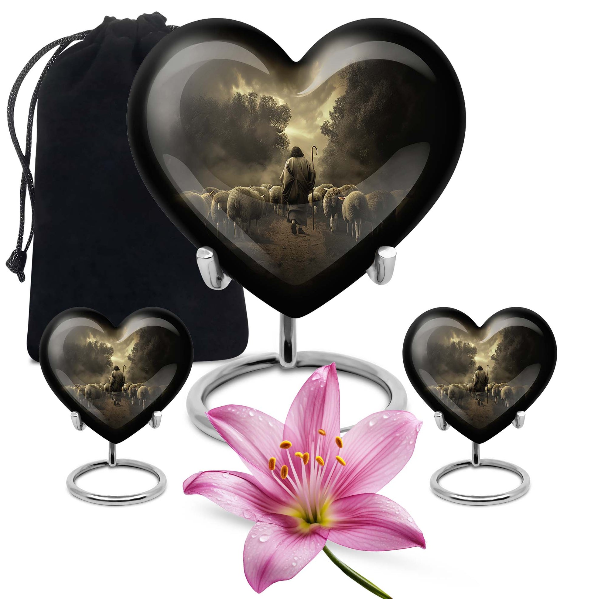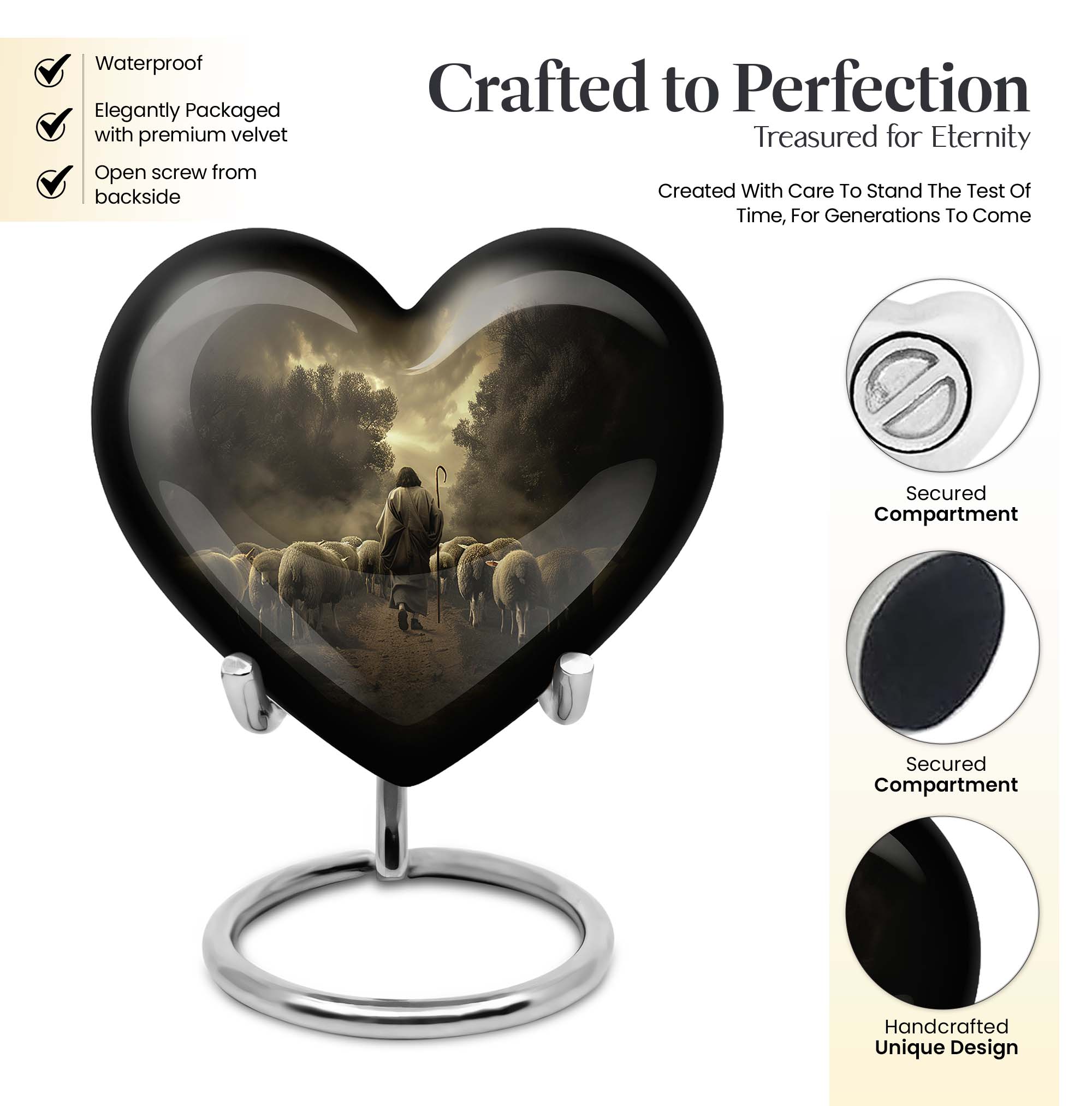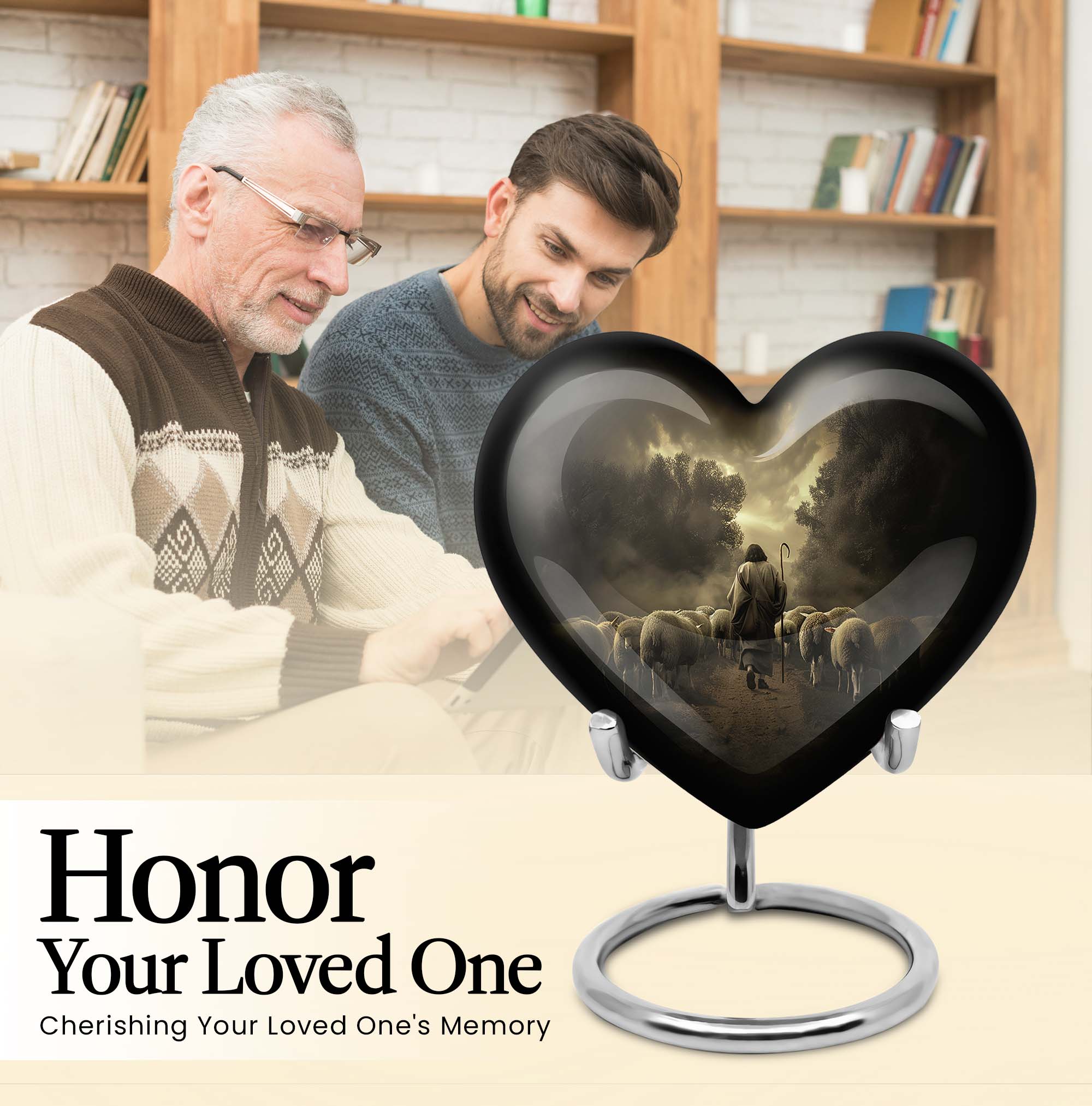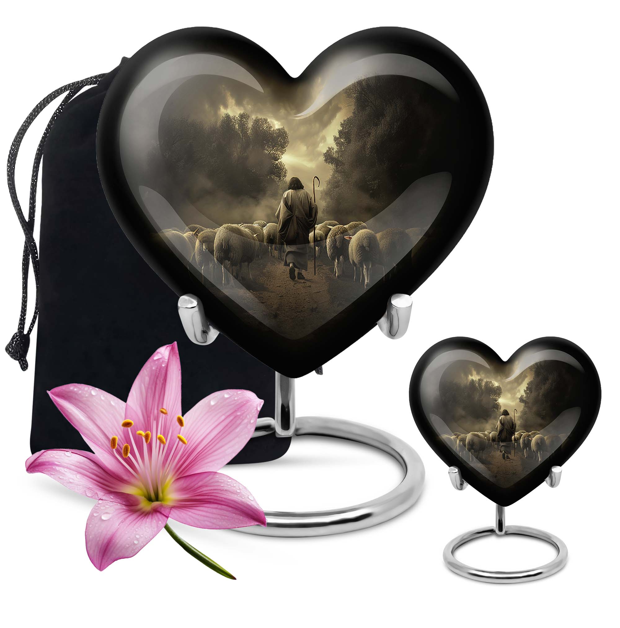 Emanate pure love even in absence with this exquisite 10-inch Shepherd Urn, a unique tribute to those loved but unseen, unheard, but always near. Crafted with the meticulous detail, this urn’s large size constitutes a capacity of 200 cubic inches. Constructed from durable aluminium, its enduring quality safeguards the ashes of your loved ones from the elements of time. The urn comes alongside a velvet pouch, enabling secure containment of ashes, and preserving the sanctity of remembrances. This large, heart-shaped urn, while abstract in theme, bears a weight of 3.3 pounds and offers the possibility of further customization. Personalize it with engraved names, infusing a part of your heart in its creation. This 'cremation urn' caters to keywords such as 'burial urns for cremation', 'ashes mother', 'urn ash funeral urn', 'shaped urn box' and 'funeral cremation urns'. This heart urn is more than a mere vessel; it’s a timeless keepsake, a beacon of undying love and a heartfelt solace in times of remembrance. An extraordinary choice for men, it mirrors strength in vulnerability and grace amidst loss.