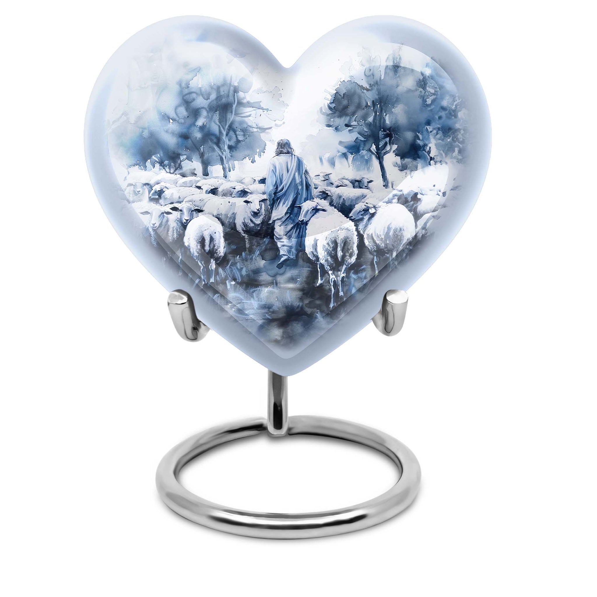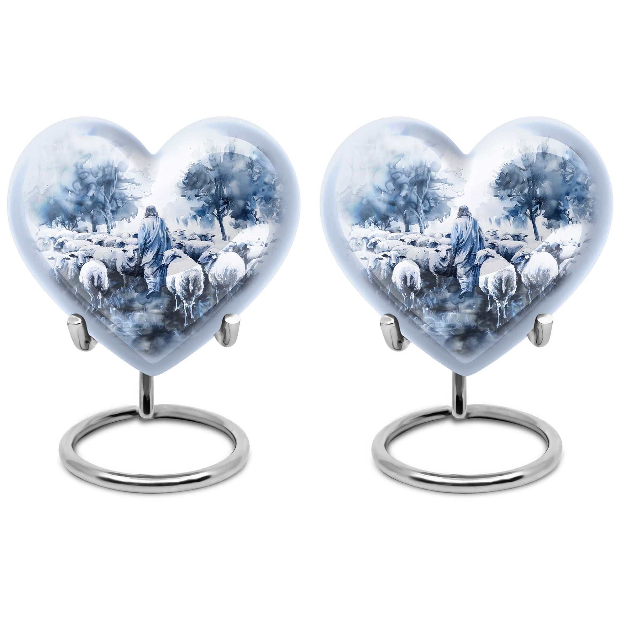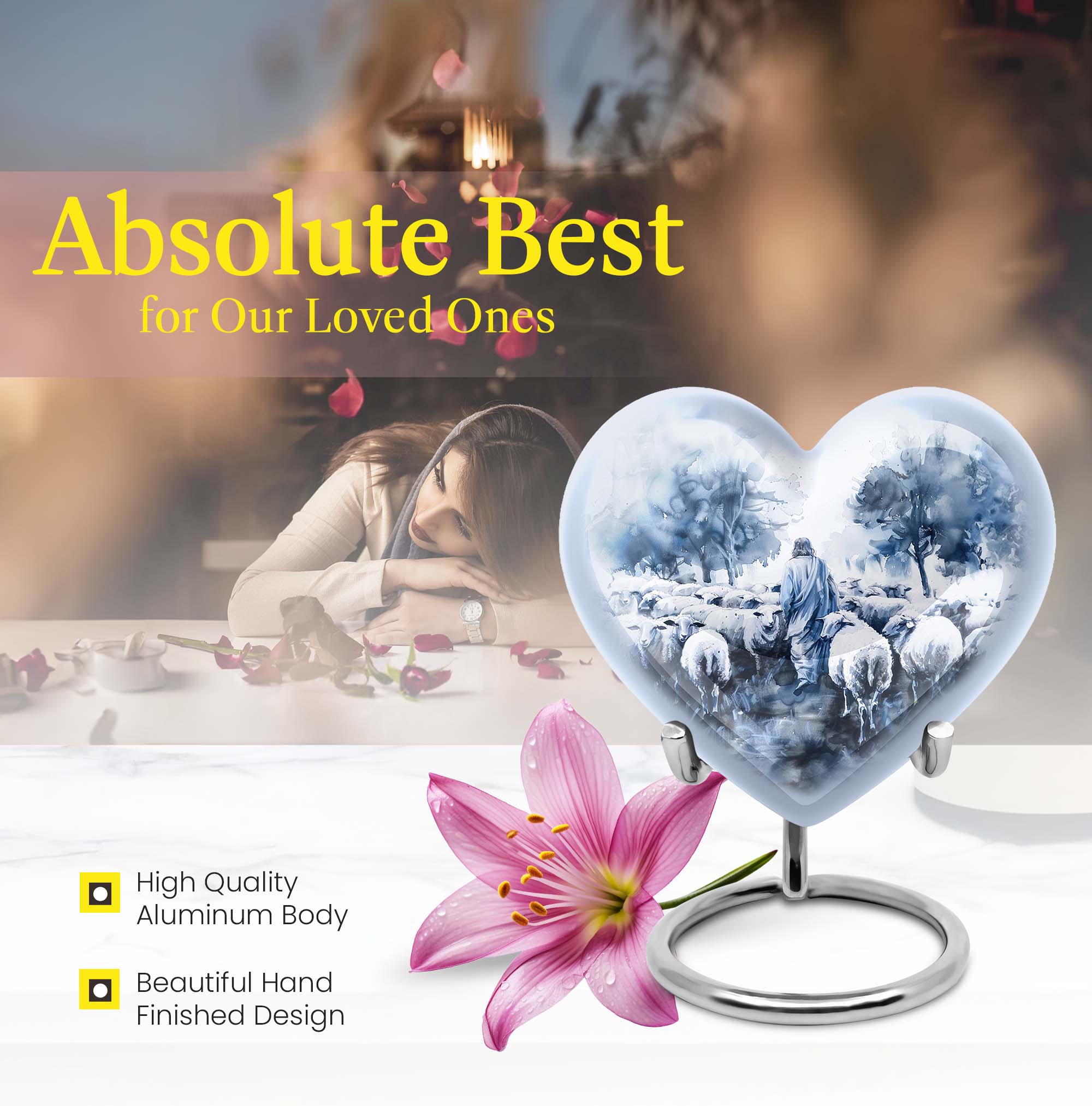 Cherish the memory of your loved ones with this exquisite Shepherd Urn. Crafted from premium 'Aluminium', the Heart Urn is sturdy, weighing 3.3 pounds and standing at a height of 10 inches, it is an ideally large urn for cremation ashes. The urn offers an impressive capacity of 200 cubic inches, ensuring a secure space for your loved one's ashes. Adding to our commitment to honoring your cherished memories, this item comes with a soft, velvet pouch for dignified containment of the ashes. Engage with the unique abstract theme of the urn, which sets it apart from conventional designs. Personalize this cremation urn with engraved names to create a meaningful tribute to those missed. Perfect for adults and seniors interested in religious and ceremonial burial large urns, this ash adult funeral urn will serve as a resonant reminder of a life well-lived. Note, in terms of size, it measures 10 inches, making its presence a memorable one.