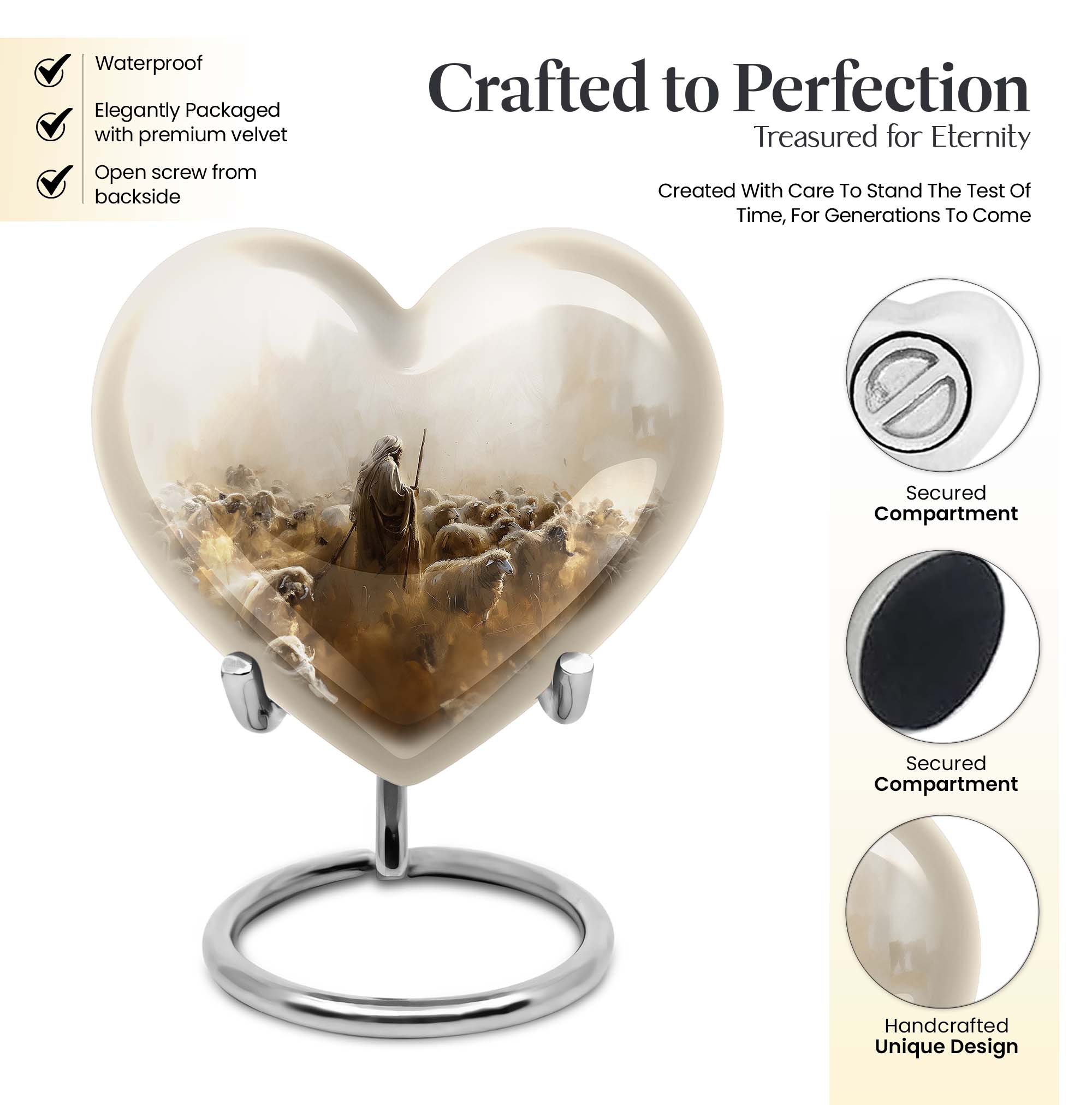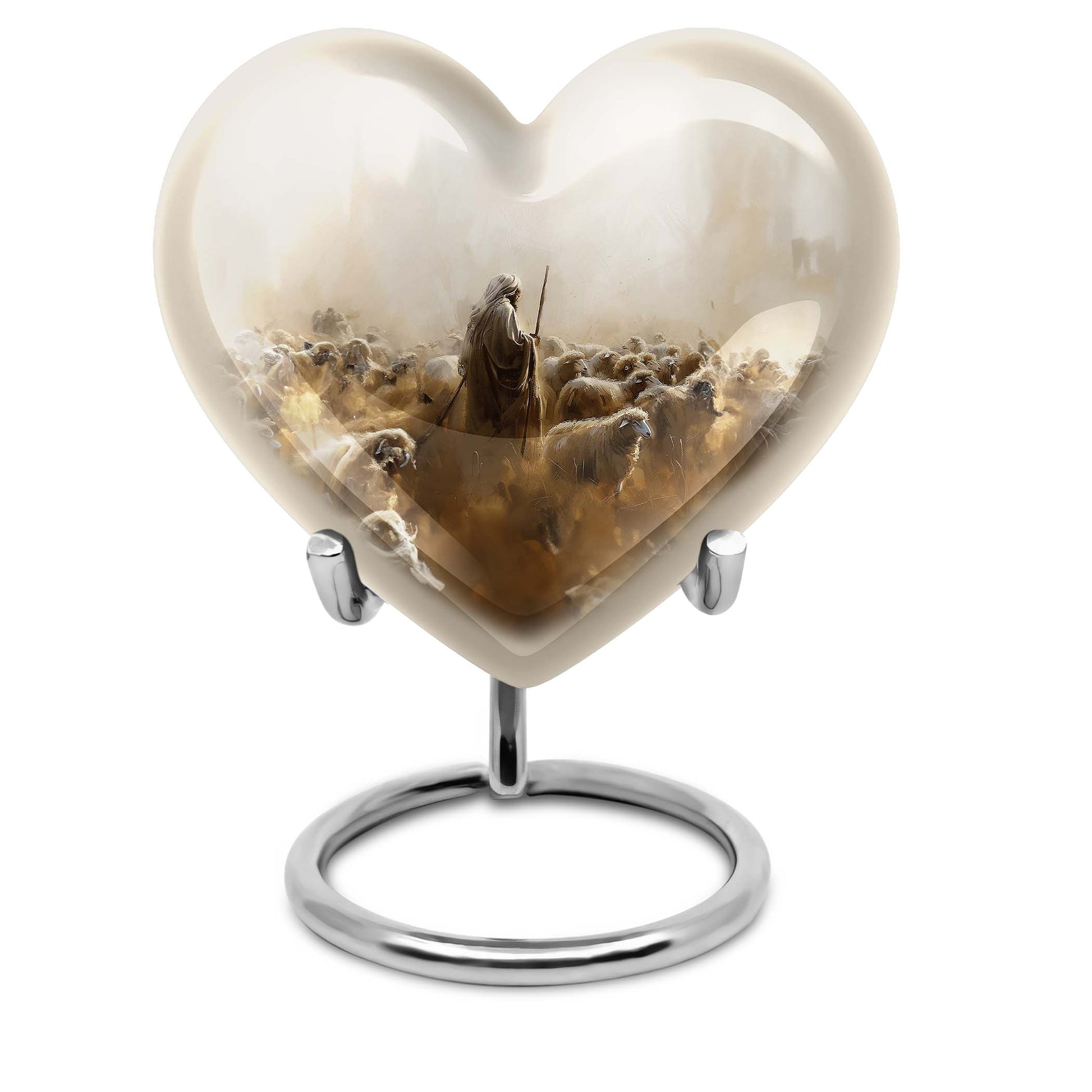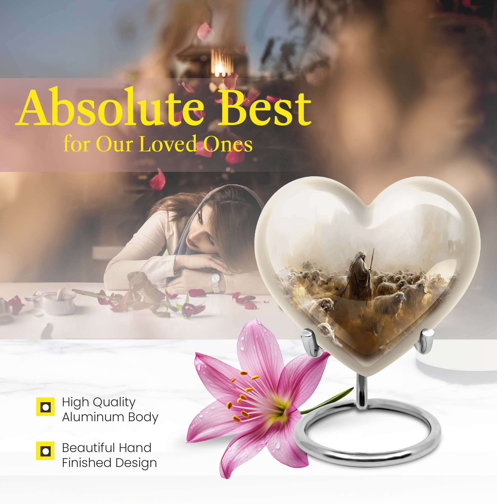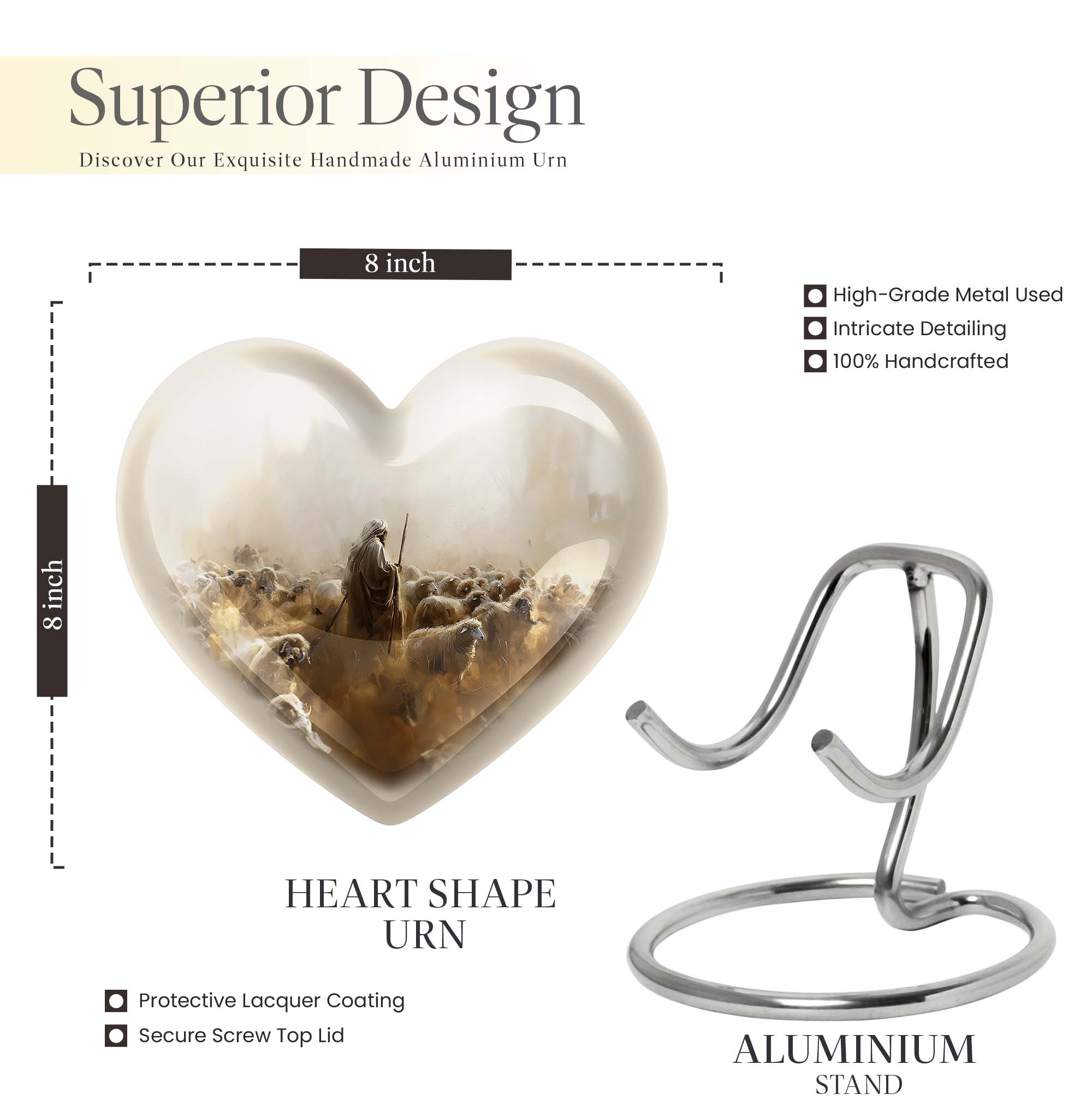 Invest in a meaningful memorial with the Shepherd Urn, a fitting tribute for human ashes. This large, 10-inch urn is crafted from durable aluminium, ensuring longevity. Thanks to its 200 cubic inches capacity, it accommodates the ashes of an adult man. The heart urn theme presents an abstract design, combining the emotional and the artistic in a singular piece. Whether you're looking for memorial urns or urns for cremation ashes, this urn showcases a blend of honor, love, and remembrance. Not only is it aesthetically pleasing, but it also delivers practicality by including a velvet pouch for containment of ashes, facilitating careful preservation and respect. Weighing 3.3 pounds, its composition is as sturdy as it is visually appealing. For a truly meaningful gesture, personalize this urn with engraved names - an innovative modern urn catering to your needs. Please note that its design does not include the common 'Heart Urn.' Looking for metal urns for adult human ashes or specifically a female urn? The Shepherd Urn caters to all, emphasizing emotion, quality, and memory.