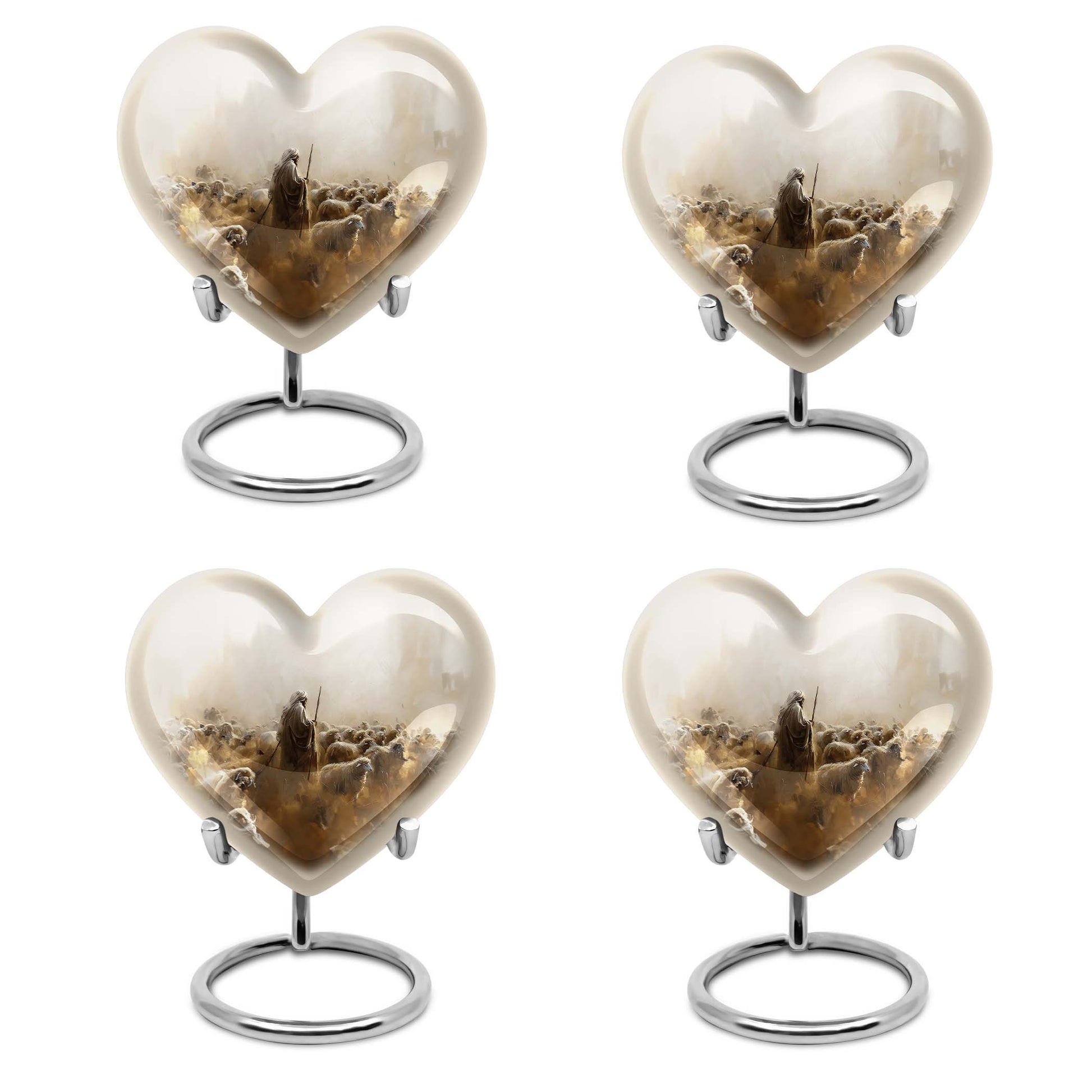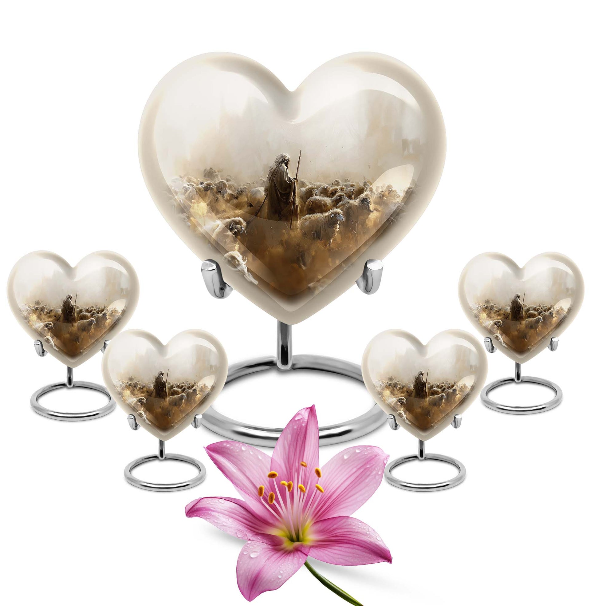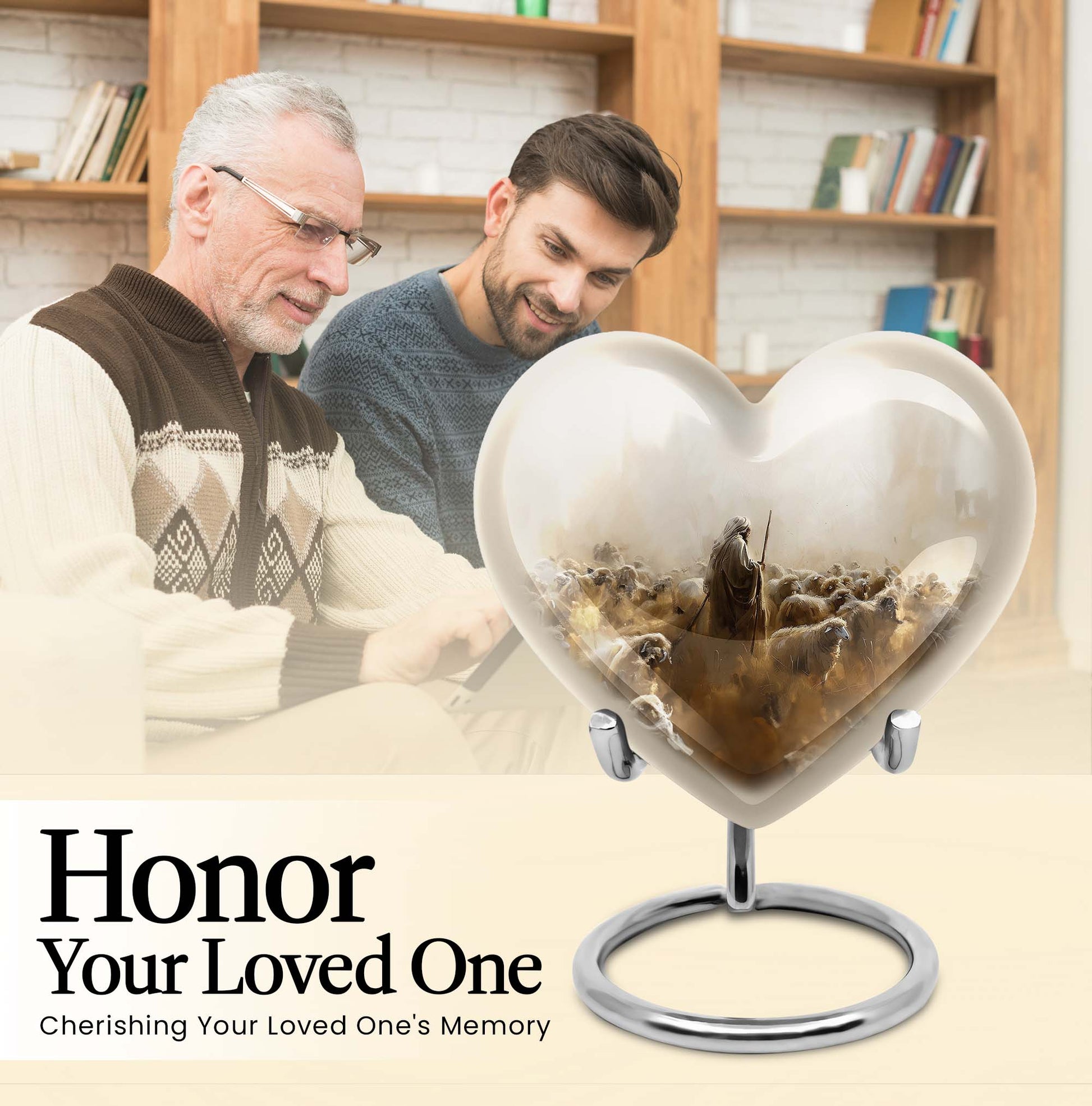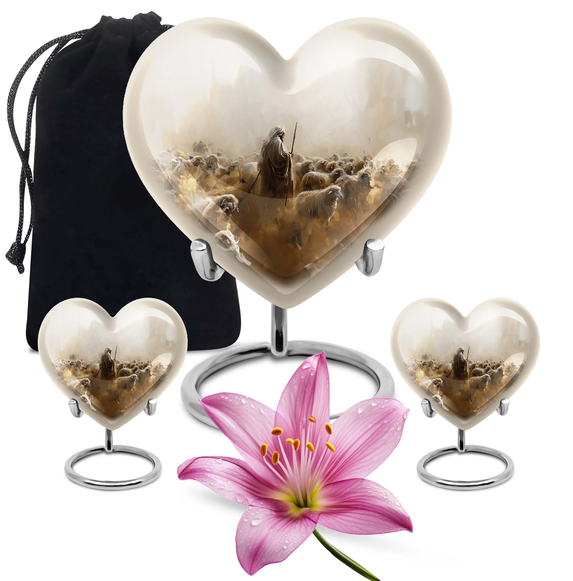 Invest in a meaningful memorial with the Shepherd Urn, a fitting tribute for human ashes. This large, 10-inch urn is crafted from durable aluminium, ensuring longevity. Thanks to its 200 cubic inches capacity, it accommodates the ashes of an adult man. The heart urn theme presents an abstract design, combining the emotional and the artistic in a singular piece. Whether you're looking for memorial urns or urns for cremation ashes, this urn showcases a blend of honor, love, and remembrance. Not only is it aesthetically pleasing, but it also delivers practicality by including a velvet pouch for containment of ashes, facilitating careful preservation and respect. Weighing 3.3 pounds, its composition is as sturdy as it is visually appealing. For a truly meaningful gesture, personalize this urn with engraved names - an innovative modern urn catering to your needs. Please note that its design does not include the common 'Heart Urn.' Looking for metal urns for adult human ashes or specifically a female urn? The Shepherd Urn caters to all, emphasizing emotion, quality, and memory.