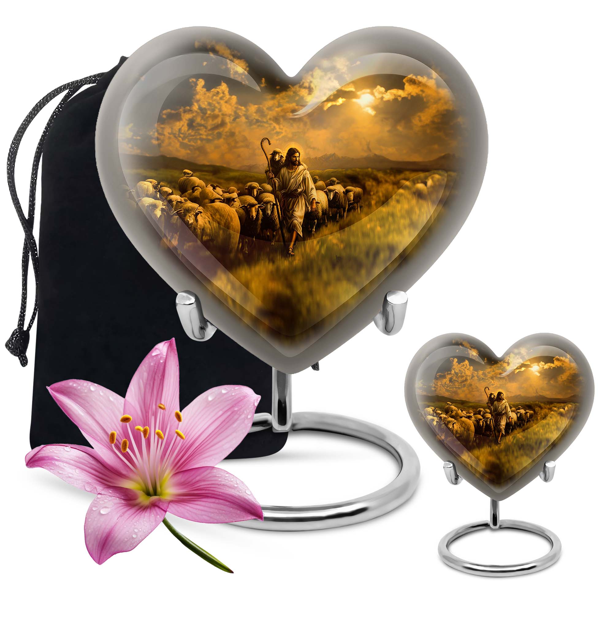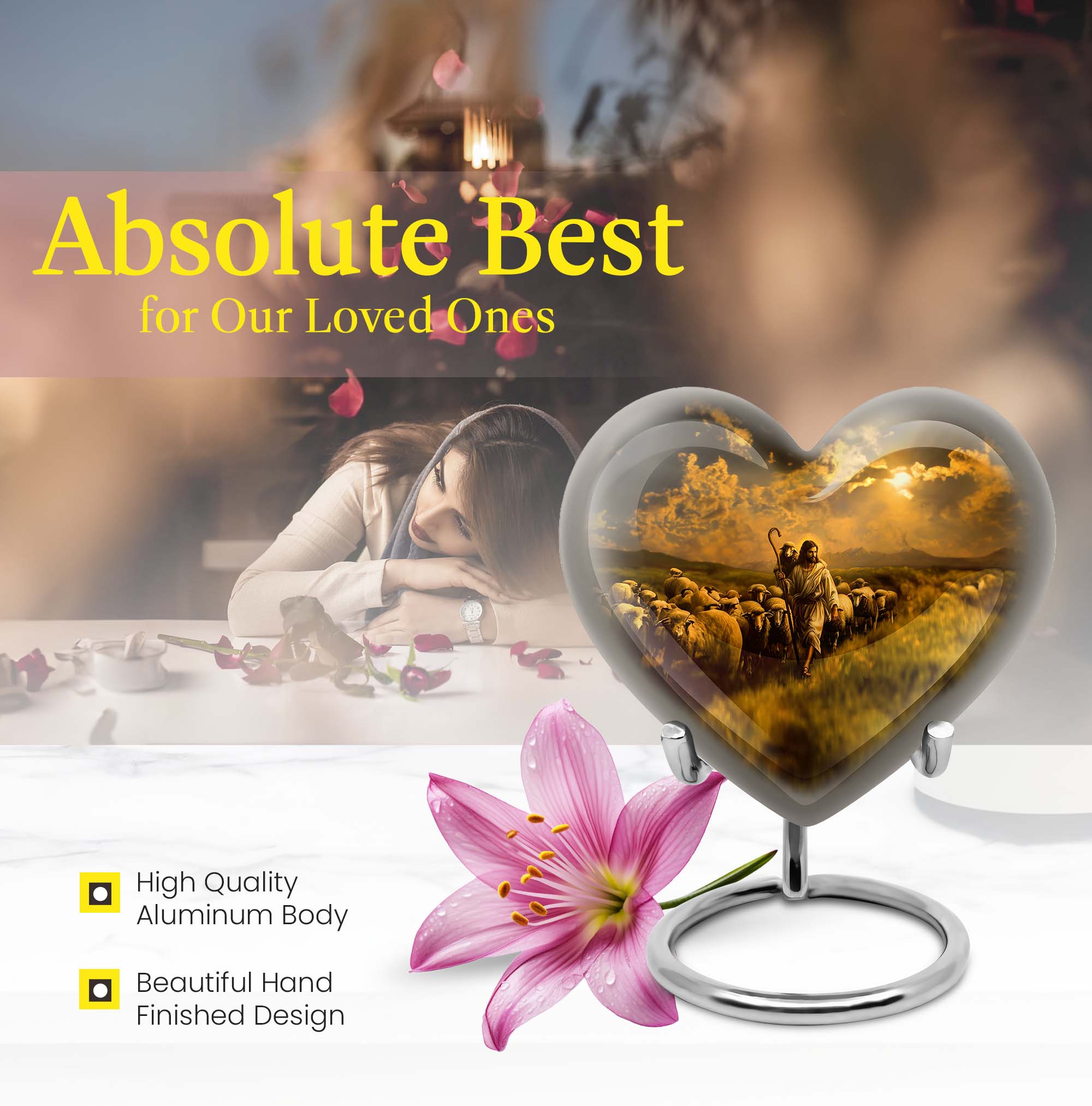An elegant memorial to your loved ones, this Shepherd Urn provides comfort and remembrance in a unique manner. Designed for memorias of a lifetime, this 10-inch cremation urn for ashes is a prime example of supreme craftsmanship and extraordinary aesthetics. Weighing 3.3 pounds and designed innovatively, it's made of robust aluminum ensuring durability. It integrates an abstract theme which imbues a thoughtful design without being overly lavish. This large urn gracefully houses up to 200 cubic inches of ashes, ensuring a respectful and honorable resting place for your cherished one. Accompanied by an elegant velvet pouch, not only does it keep your loved one’s memory alive but also adds a heightened level of distinction to your memorial display. With the personalization option, you can engrave names on it, making the urn even more meaningful. The product does not limit itself to being just a funeral urn for adult ashes but also doubles as a multipurpose urn with a photo frame. The word 'shape urn' acquires a new definition with this offering. Remember and celebrate the memories of the departed with this unique Shepherd Urn.