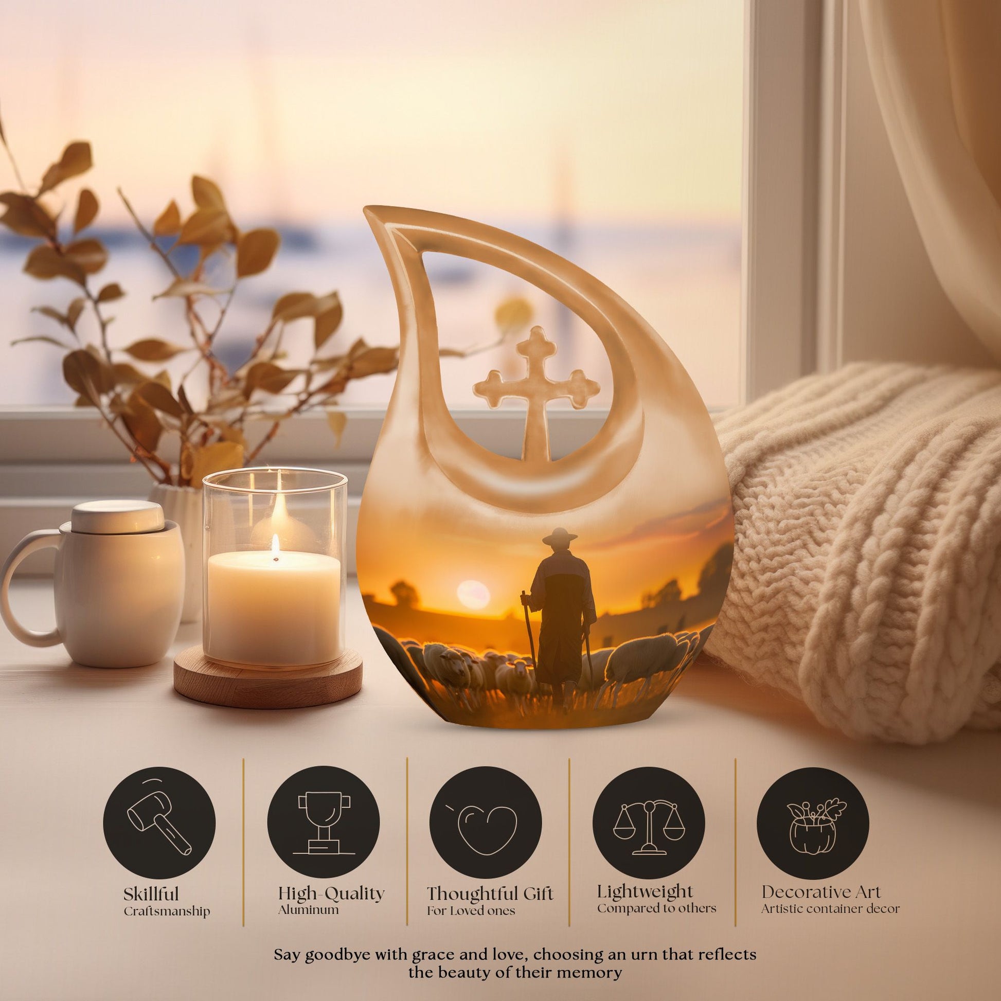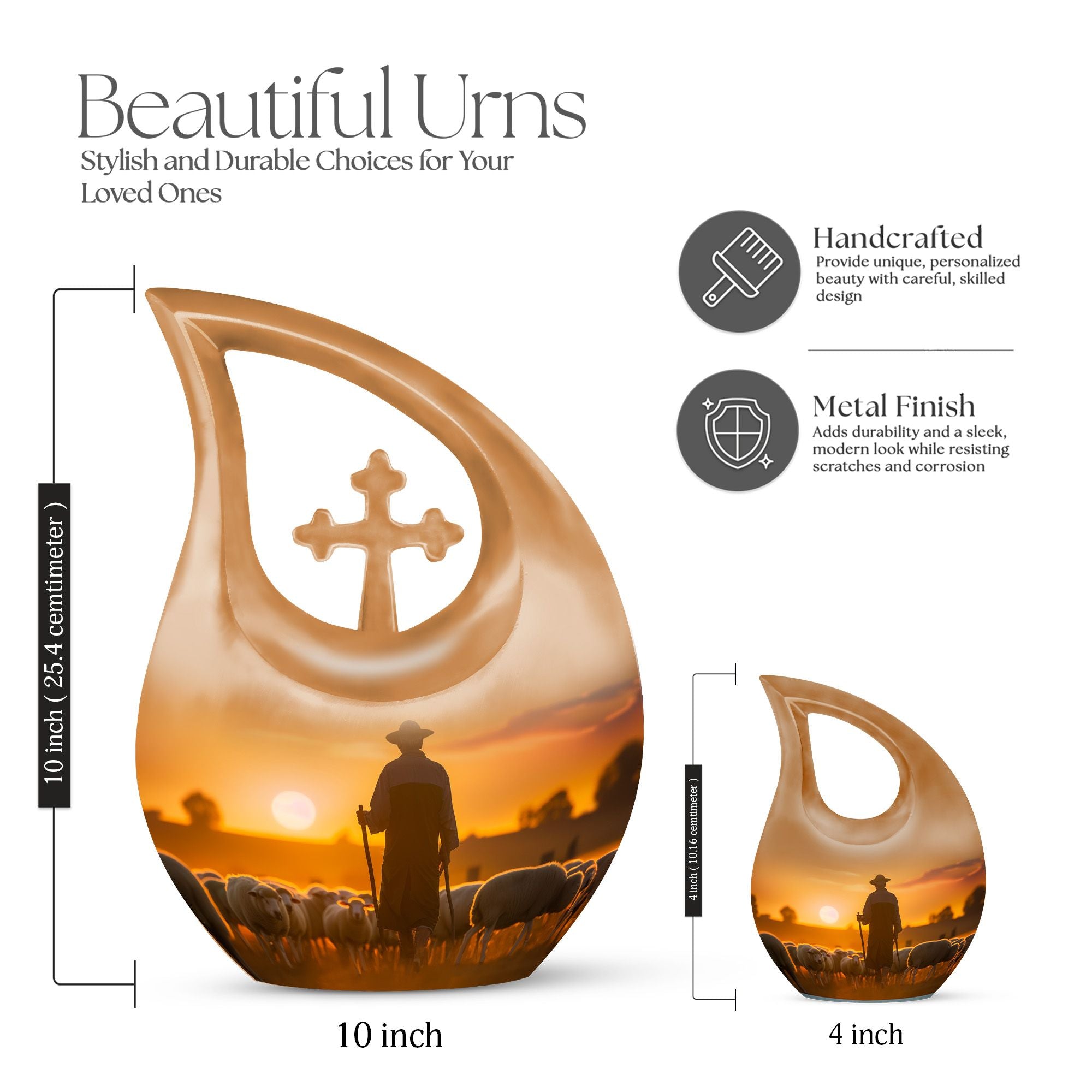 Crafted with care from durable aluminium, this 10 inch urn blends elegant design with dependable functionality. Whether you need urns for ashes small keepsake, small keepsake urns for ashes, or a beautifully made small decorative urn, it offers both emotional comfort and lasting quality. The secure screw-top lid ensures the ashes remain safe, while the serene shepherd-themed artwork creates a calming memorial presence. Families looking for small urns for human ashes keepsake Dad, small keepsake urns, or a gentle small urn for ashes keepsake Mom will find this piece especially meaningful.