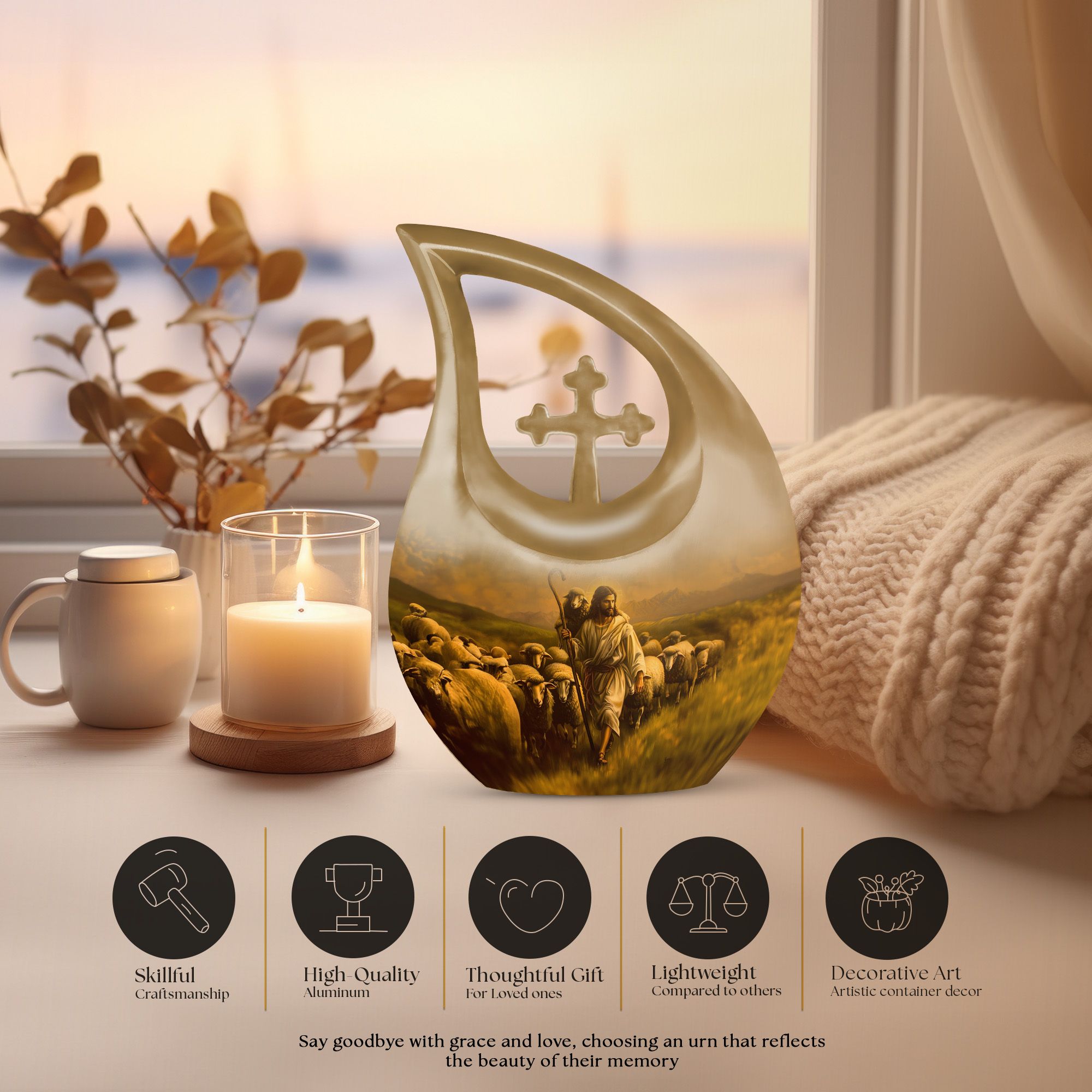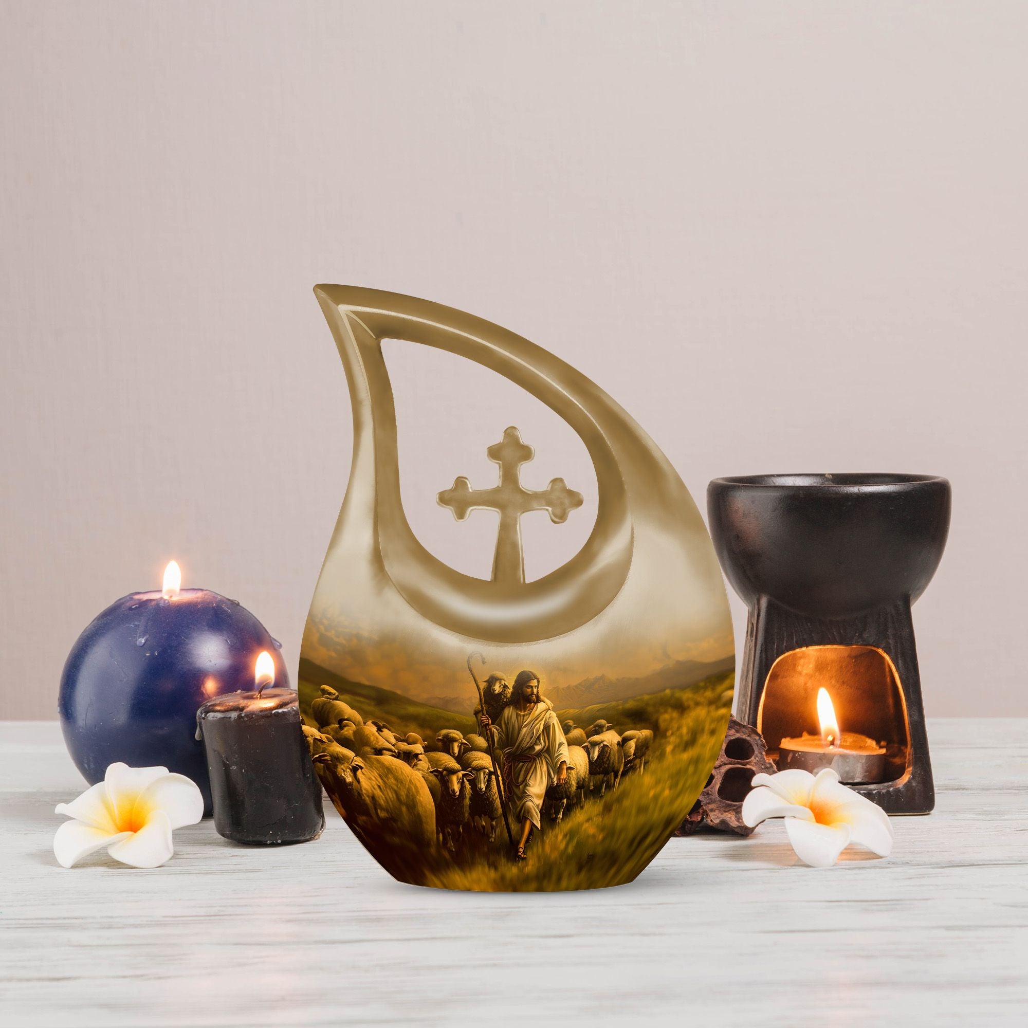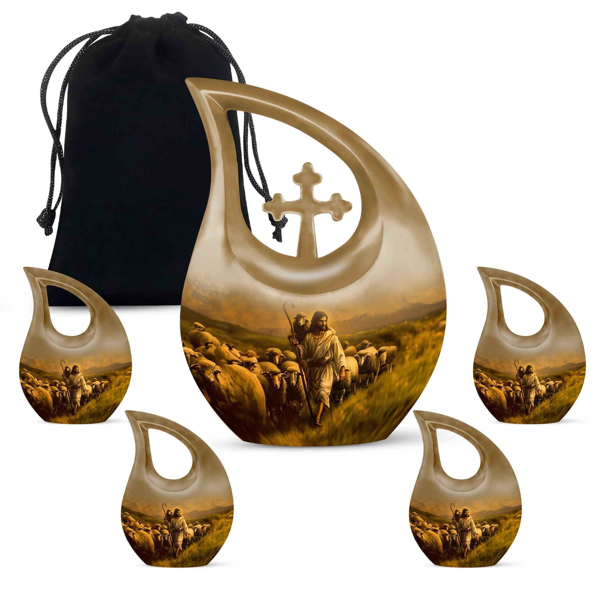 The Shepherd Memorial Urn is a heartfelt tribute crafted to honor the memory of someone deeply cherished. Designed with comforting pastoral artwork, this small memorial piece offers families a peaceful way to preserve ashes, whether they need an urn for human ashes for men or an urn for adult female ashes with timeless elegance.