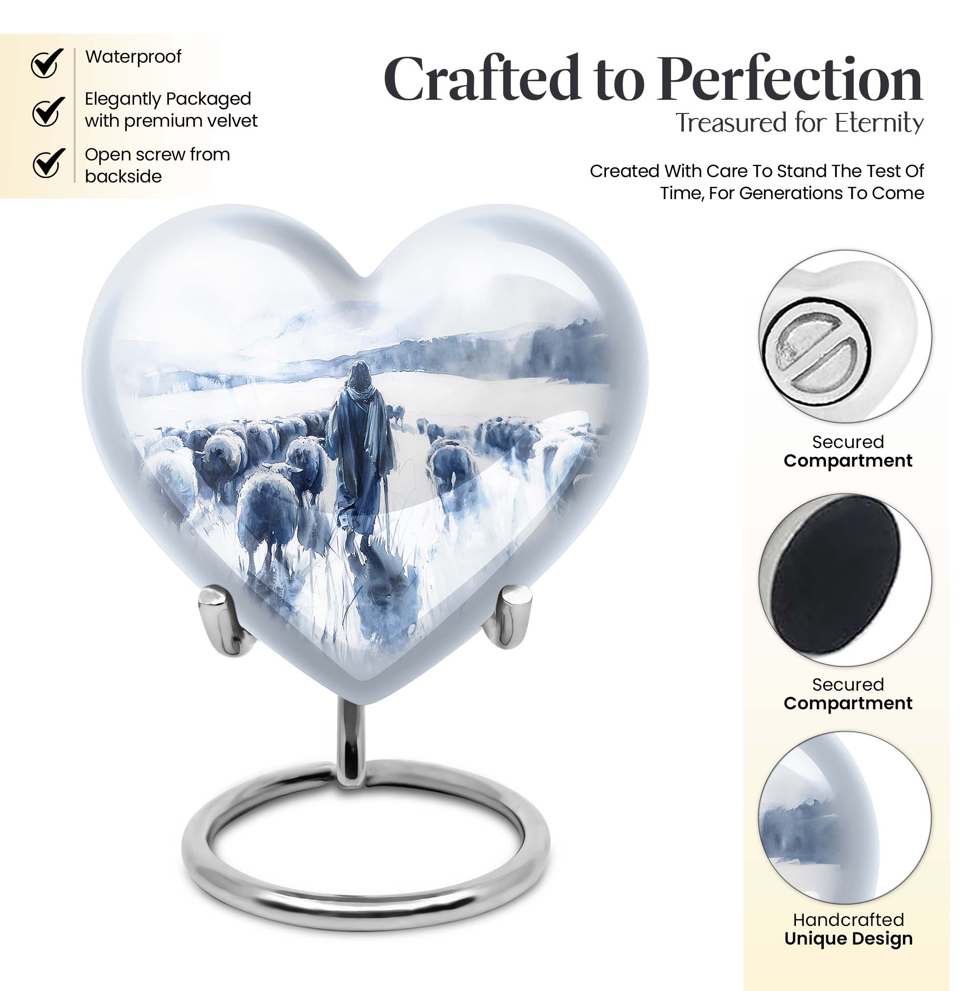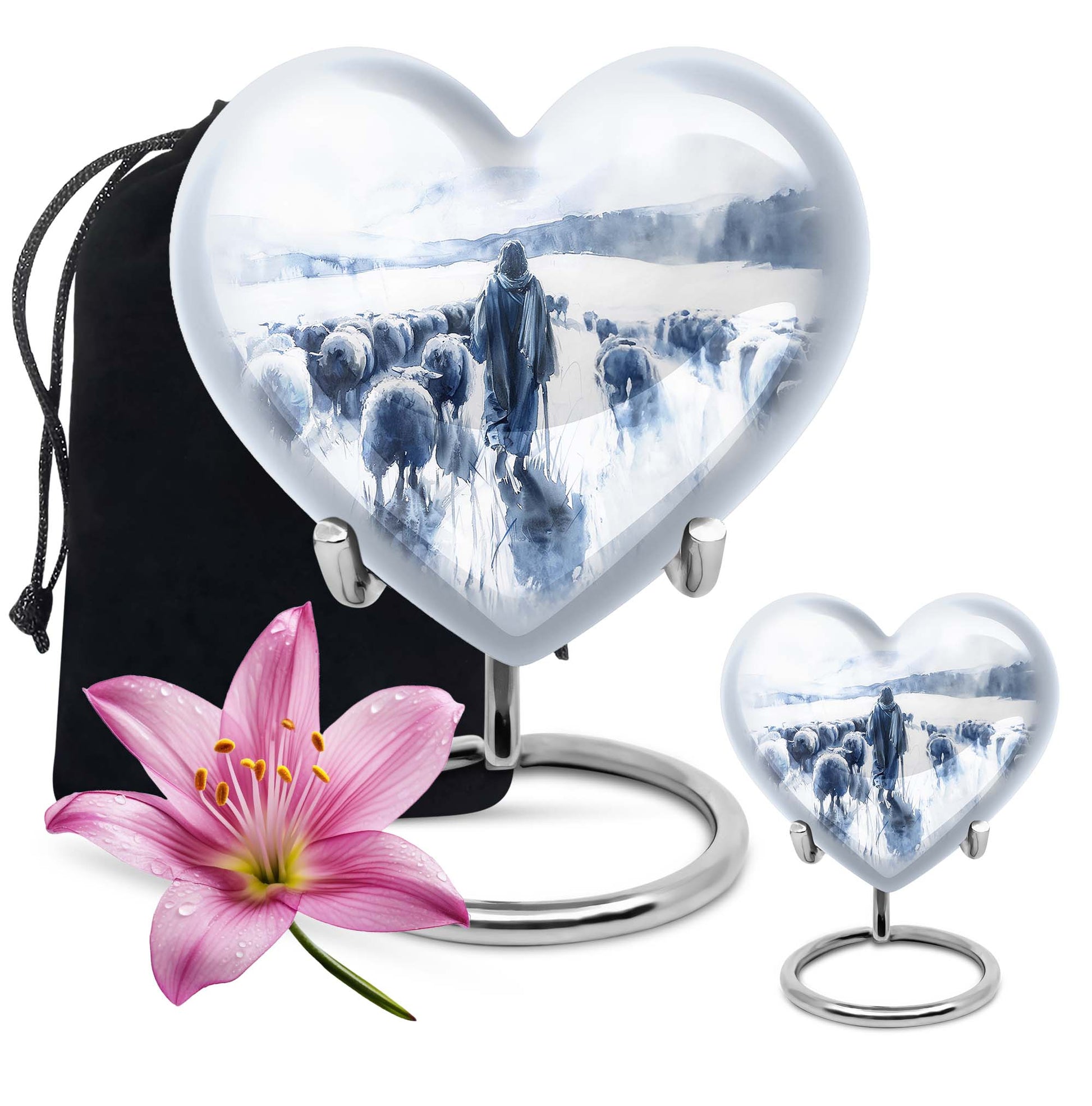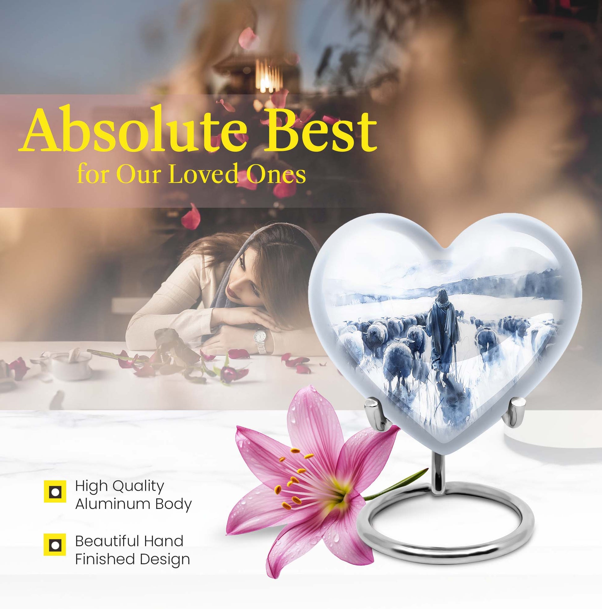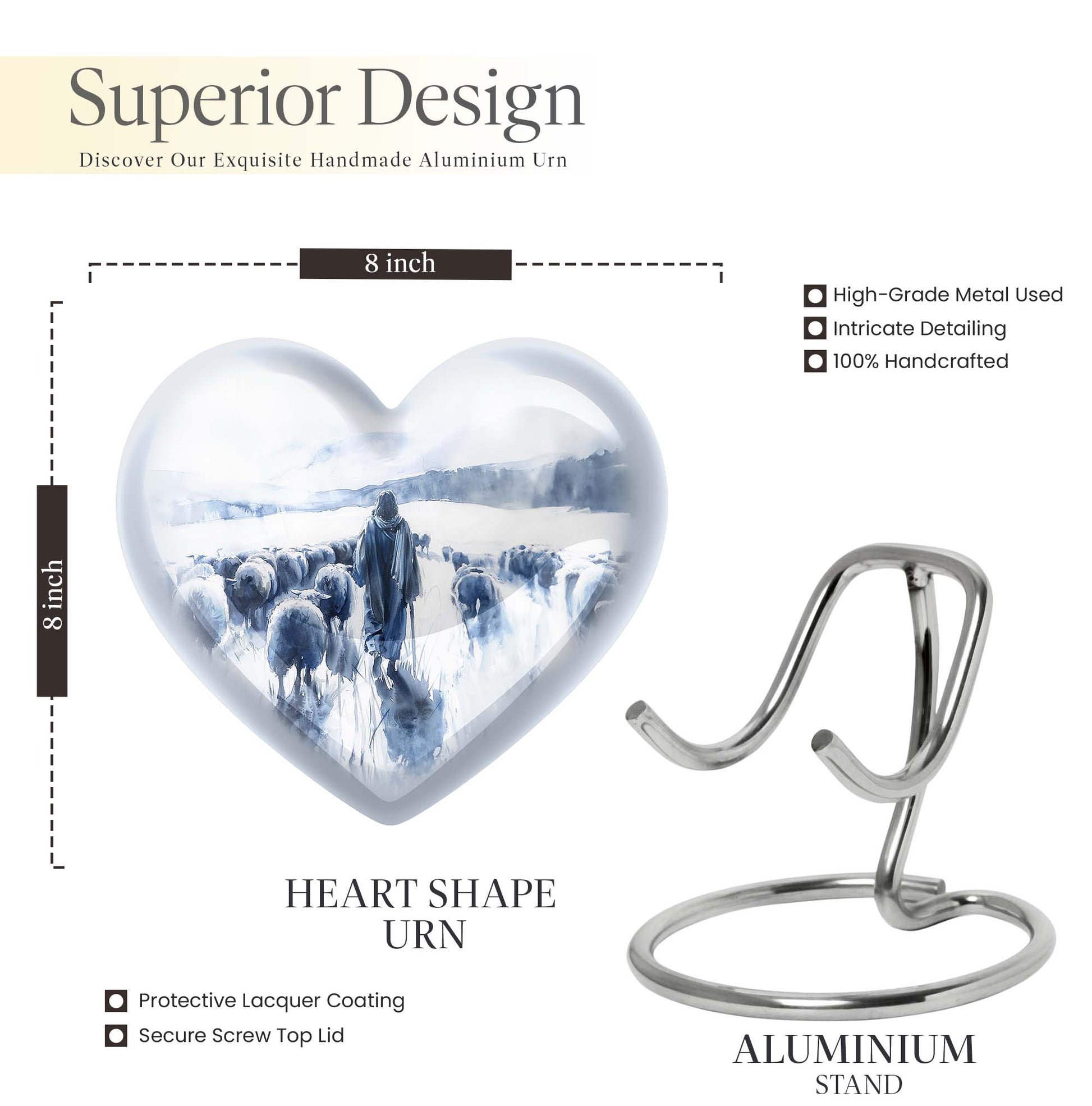 Discover the exquisite range of Shepherd Urn, a heartwarming tribute to your departed loved ones. This large size 'Heart Urn', standing 10 inches tall, is an ideal sacred place for remembering your beloved. Crafted meticulously with superior quality aluminium, the urn weighs 3.3 pounds. The urn's abstract theme presents an eloquent expression of love and memories, giving a touch of sophistication to your memorial ceremony. Its capacity of holding up to 200 cubic inches of ashes ensures a substantial part of your loved one's remains can be preserved. This funeral cremation urn comes with a velvet pouch for the containment of ashes, safeguarding the ashes with utmost dignity. Further enhance its meaningfulness by personalizing it with engraved names, making it a truly unique memorial to a distinctive life lived. This cremation urn marries functionality and artistry perfectly, striking the balance between the solemnity of occasion and serene beauty. Browse our collection for other ash urn or funeral urns for adult ashes.