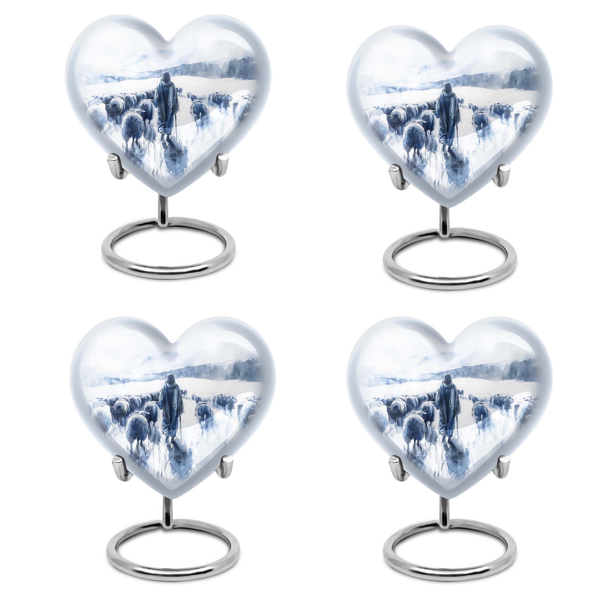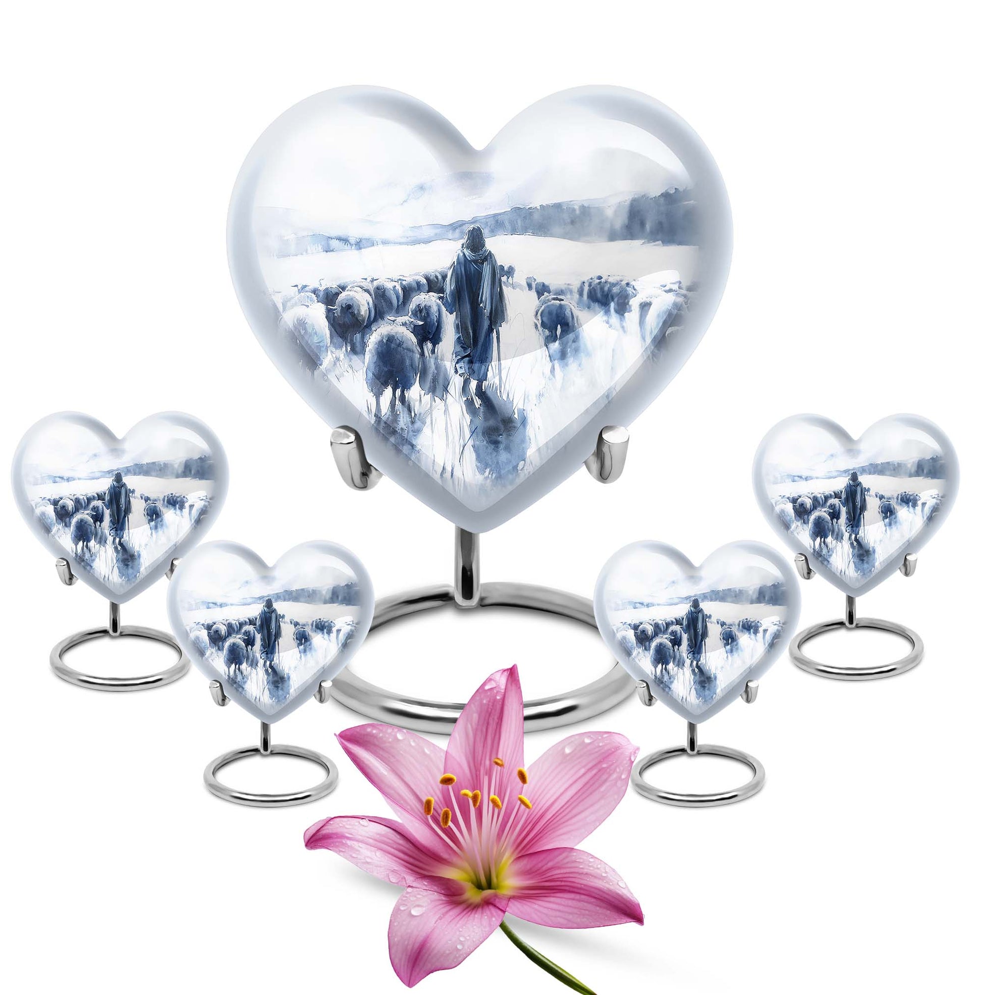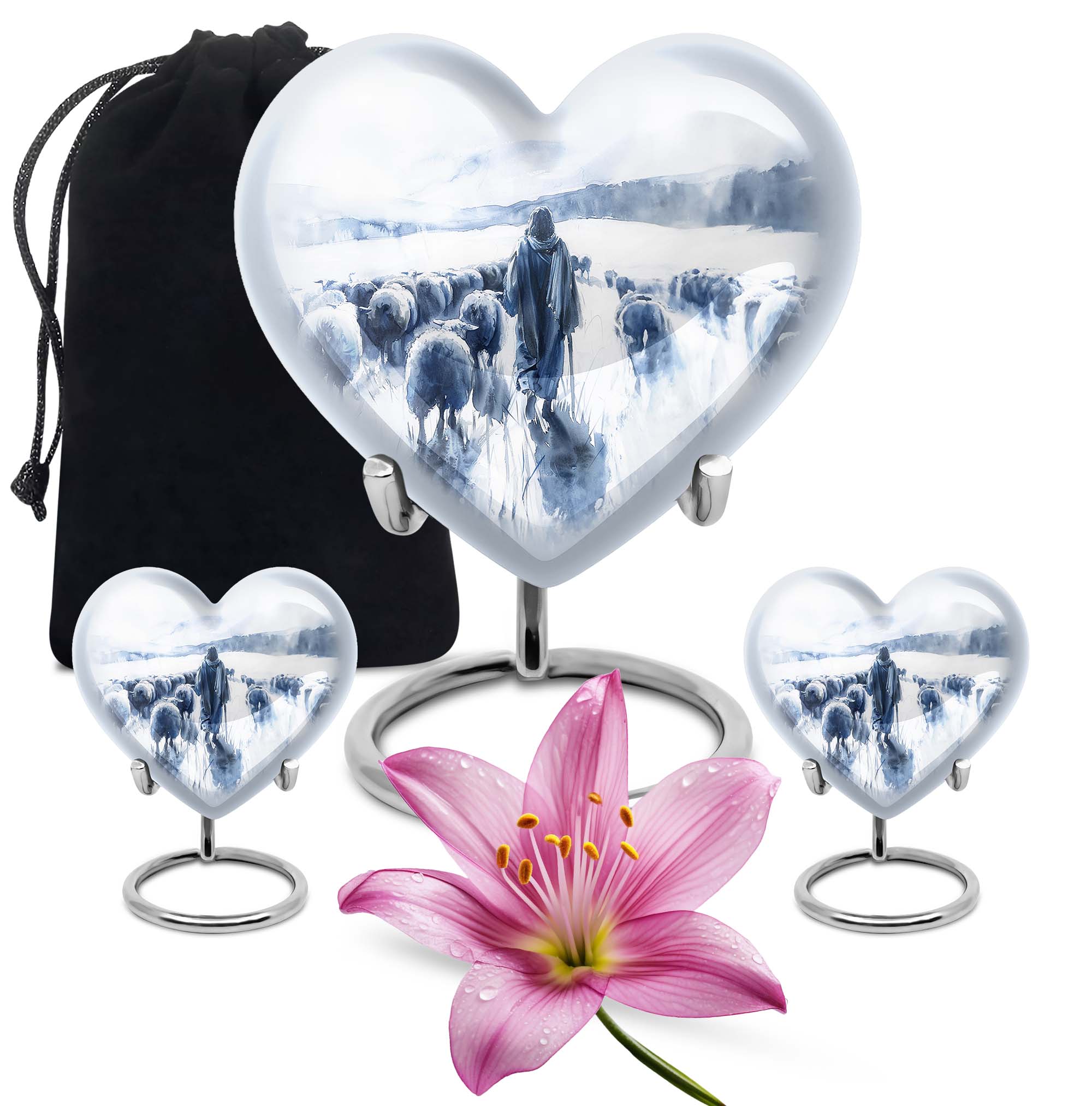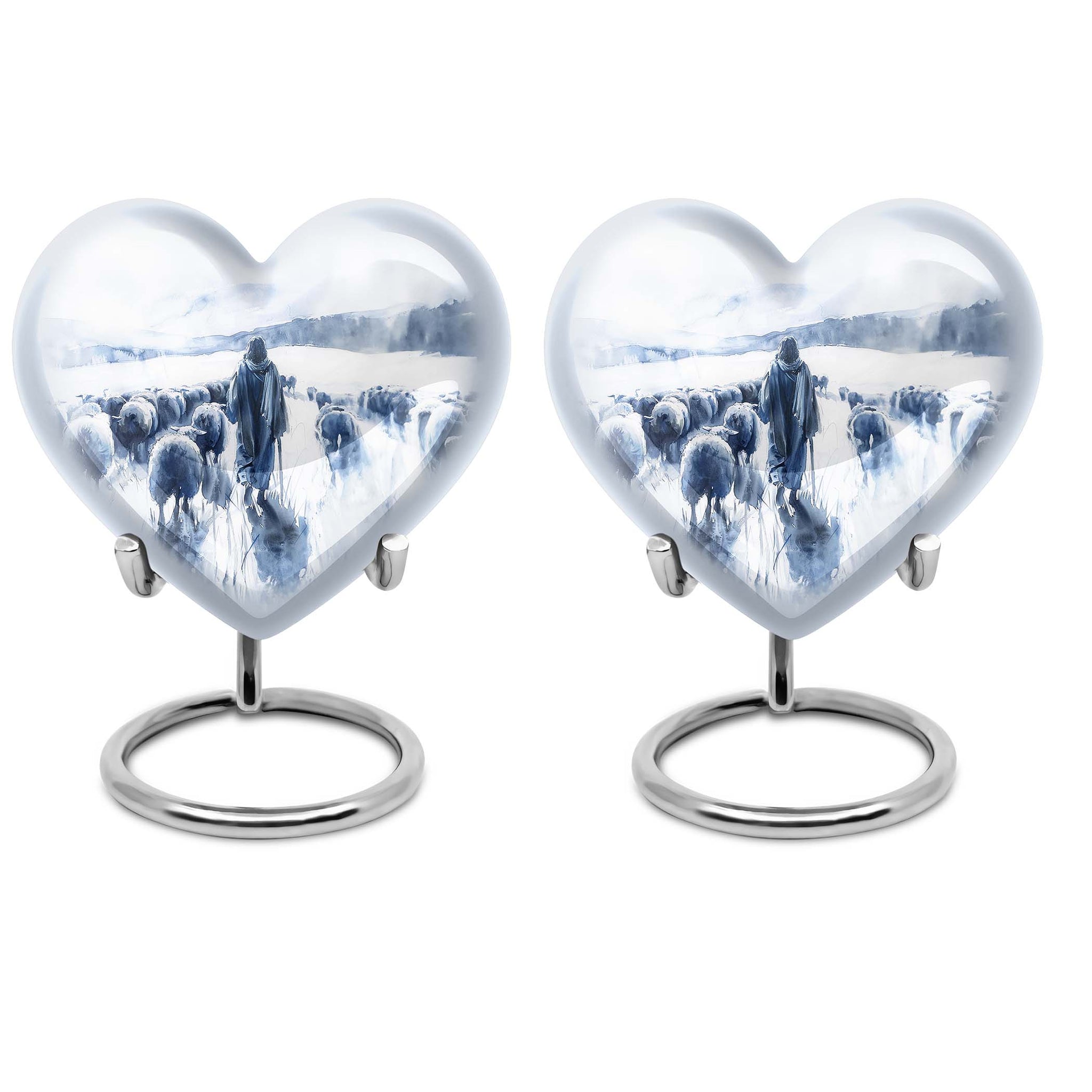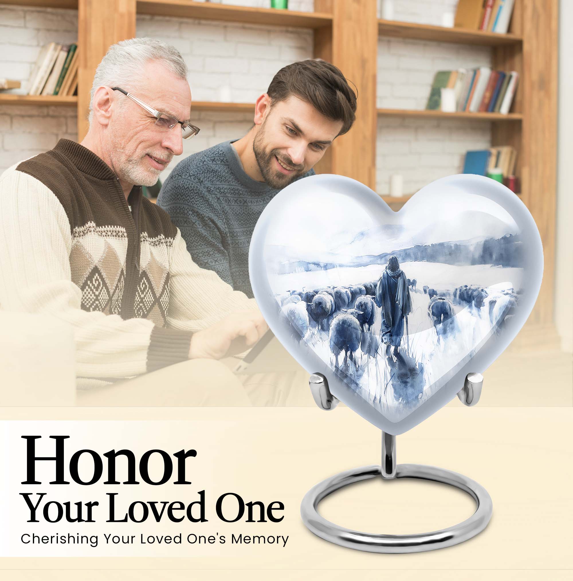 Discover the exquisite range of Shepherd Urn, a heartwarming tribute to your departed loved ones. This large size 'Heart Urn', standing 10 inches tall, is an ideal sacred place for remembering your beloved. Crafted meticulously with superior quality aluminium, the urn weighs 3.3 pounds. The urn's abstract theme presents an eloquent expression of love and memories, giving a touch of sophistication to your memorial ceremony. Its capacity of holding up to 200 cubic inches of ashes ensures a substantial part of your loved one's remains can be preserved. This funeral cremation urn comes with a velvet pouch for the containment of ashes, safeguarding the ashes with utmost dignity. Further enhance its meaningfulness by personalizing it with engraved names, making it a truly unique memorial to a distinctive life lived. This cremation urn marries functionality and artistry perfectly, striking the balance between the solemnity of occasion and serene beauty. Browse our collection for other ash urn or funeral urns for adult ashes.