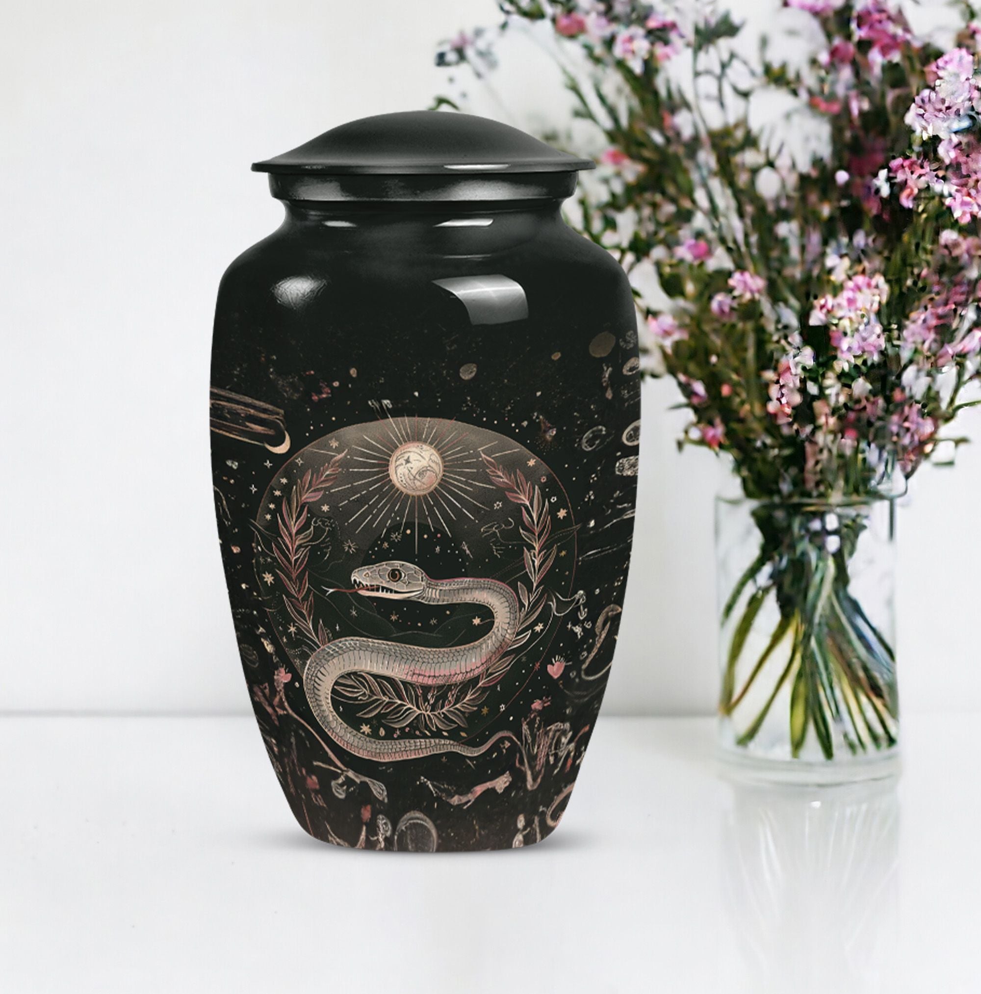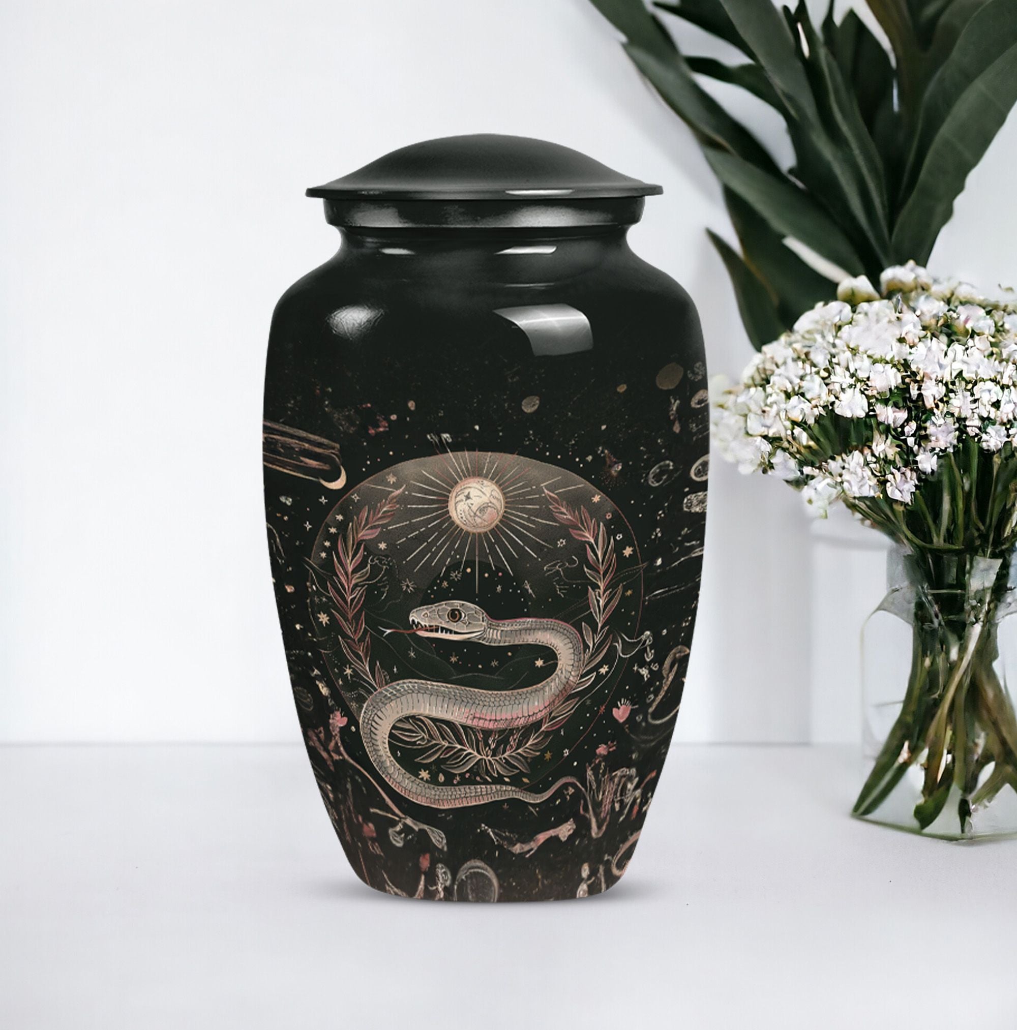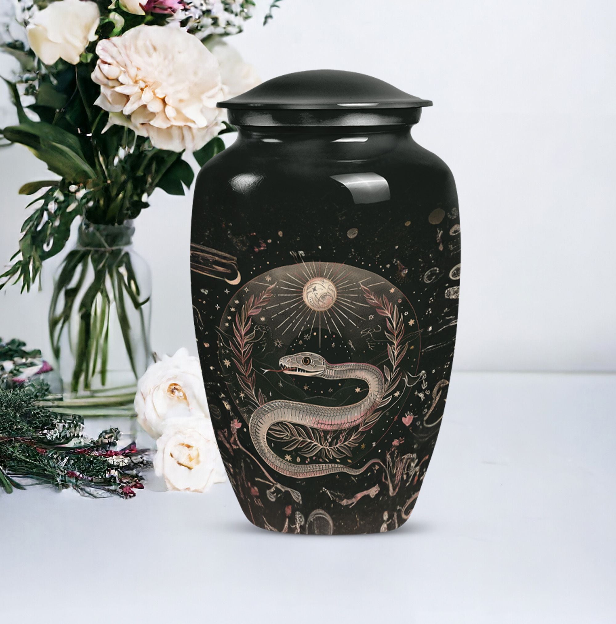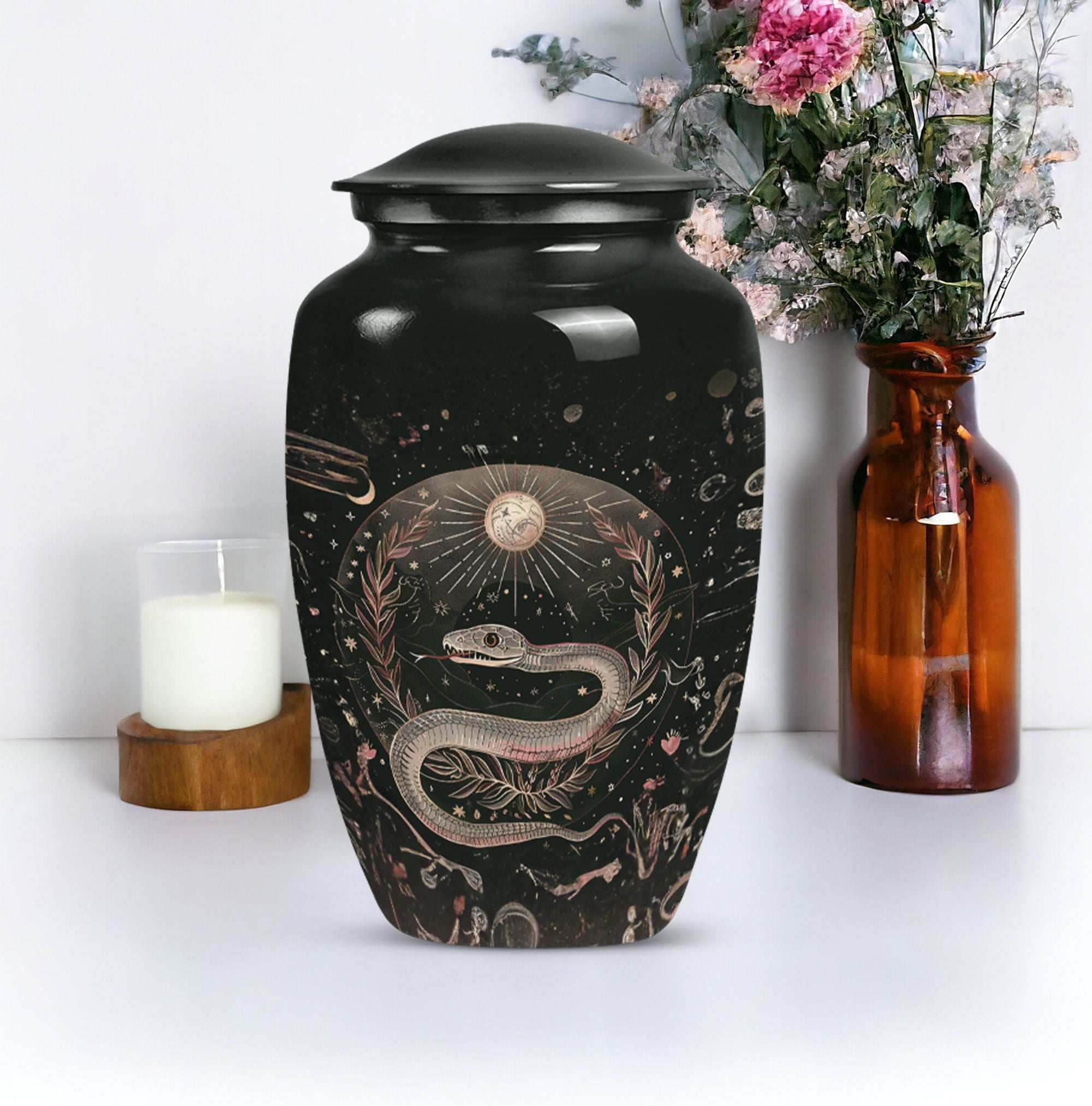 Unveiling our Snake Urn, an abstract-themed memorial piece that expertly combines sentimentality with classic elegance. This Large Urn, standing proud at 10 inches and weighing 3.3 pounds, is glistening with its beautiful aluminum material. The urn has a substantial capacity of 200 cubic inches, managing to be both lightweight yet robust. Moreover, with comprehensive size dimensions, it provides ample space for commemorating loved ones. This urn doesn't stop at being functionally exemplary; indeed, it offers users the chance to personalize it with engraved names, making it an entirely bespoke piece. Accompanied by a luxurious velvet pouch for secure containment of ashes, this urn is profoundly personal, yet tastefully sophisticated. Using an amalgamation of keywords such as 'Cremation personalized urns for human ashes adult,' 'ash adult urn human ash adult,' 'burial cremation urn,' and 'cremation urns medium size,' this urn has been tailored to meet your unique memorial needs to offer solace and comfort at this sensitive time.