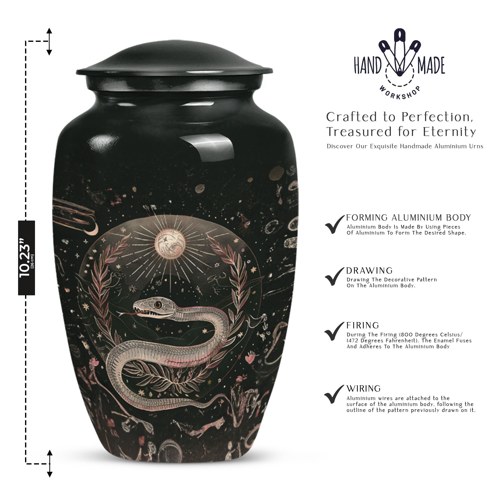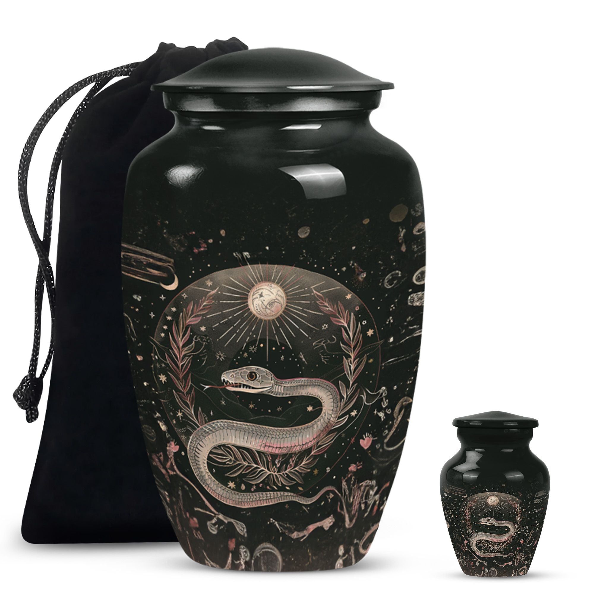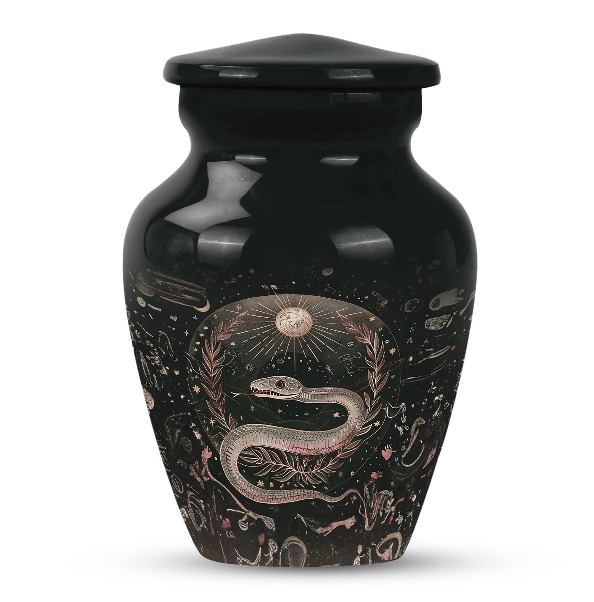 Unveiling our Snake Urn, an abstract-themed memorial piece that expertly combines sentimentality with classic elegance. This Large Urn, standing proud at 10 inches and weighing 3.3 pounds, is glistening with its beautiful aluminum material. The urn has a substantial capacity of 200 cubic inches, managing to be both lightweight yet robust. Moreover, with comprehensive size dimensions, it provides ample space for commemorating loved ones. This urn doesn't stop at being functionally exemplary; indeed, it offers users the chance to personalize it with engraved names, making it an entirely bespoke piece. Accompanied by a luxurious velvet pouch for secure containment of ashes, this urn is profoundly personal, yet tastefully sophisticated. Using an amalgamation of keywords such as 'Cremation personalized urns for human ashes adult,' 'ash adult urn human ash adult,' 'burial cremation urn,' and 'cremation urns medium size,' this urn has been tailored to meet your unique memorial needs to offer solace and comfort at this sensitive time.