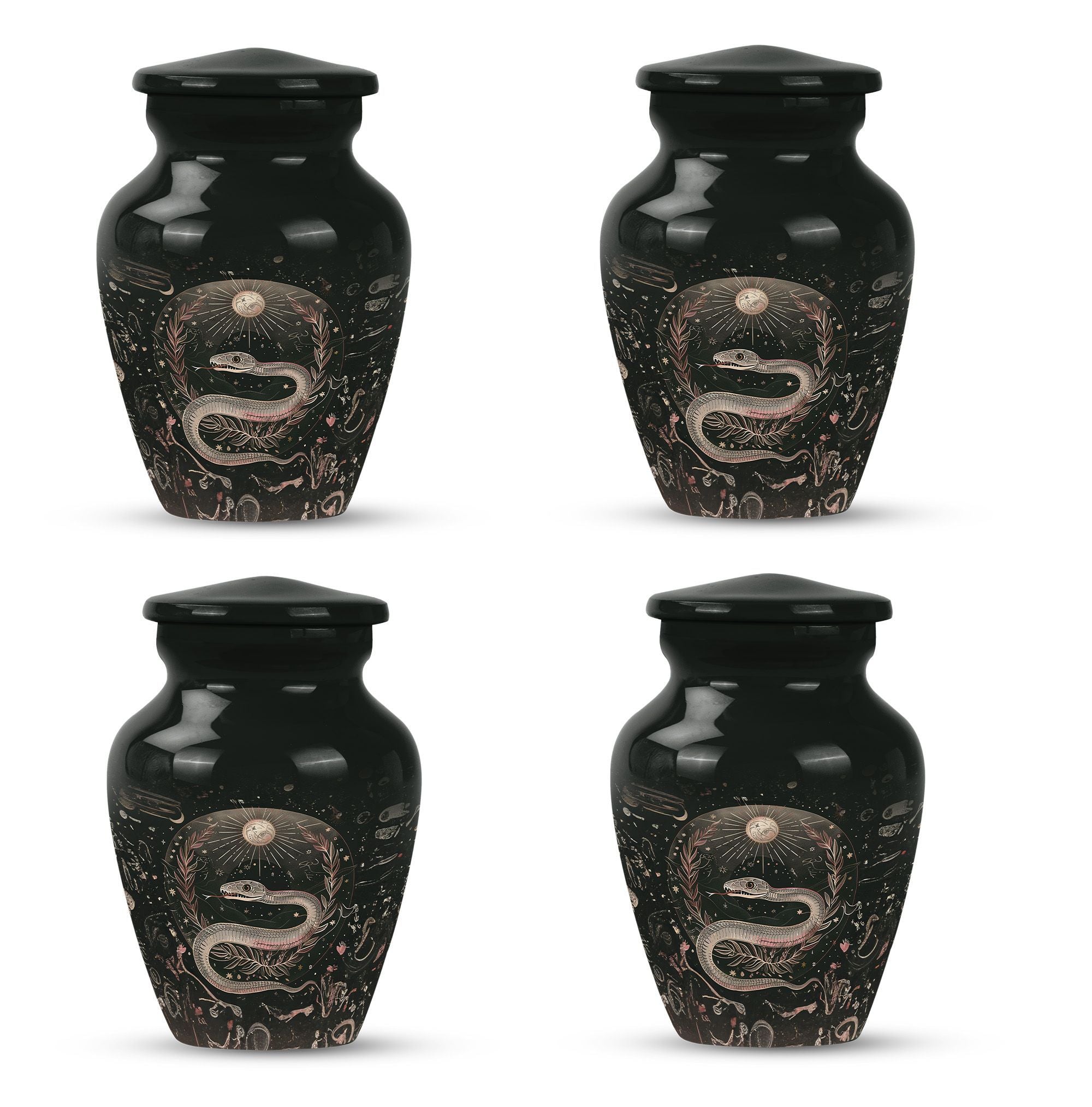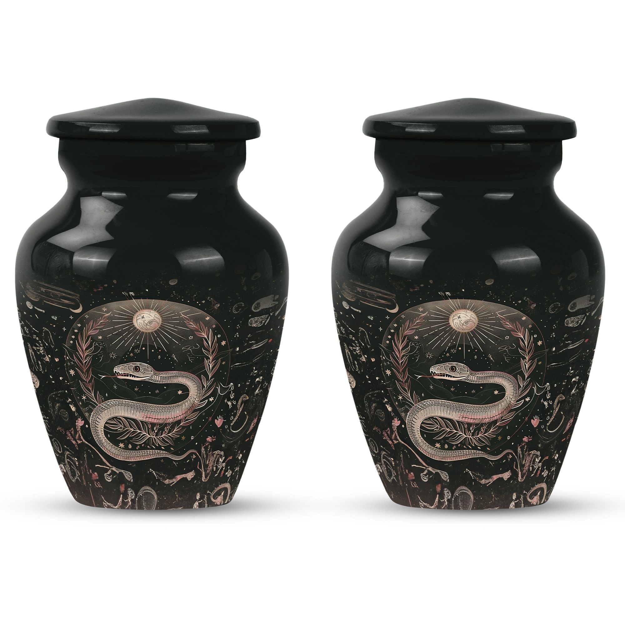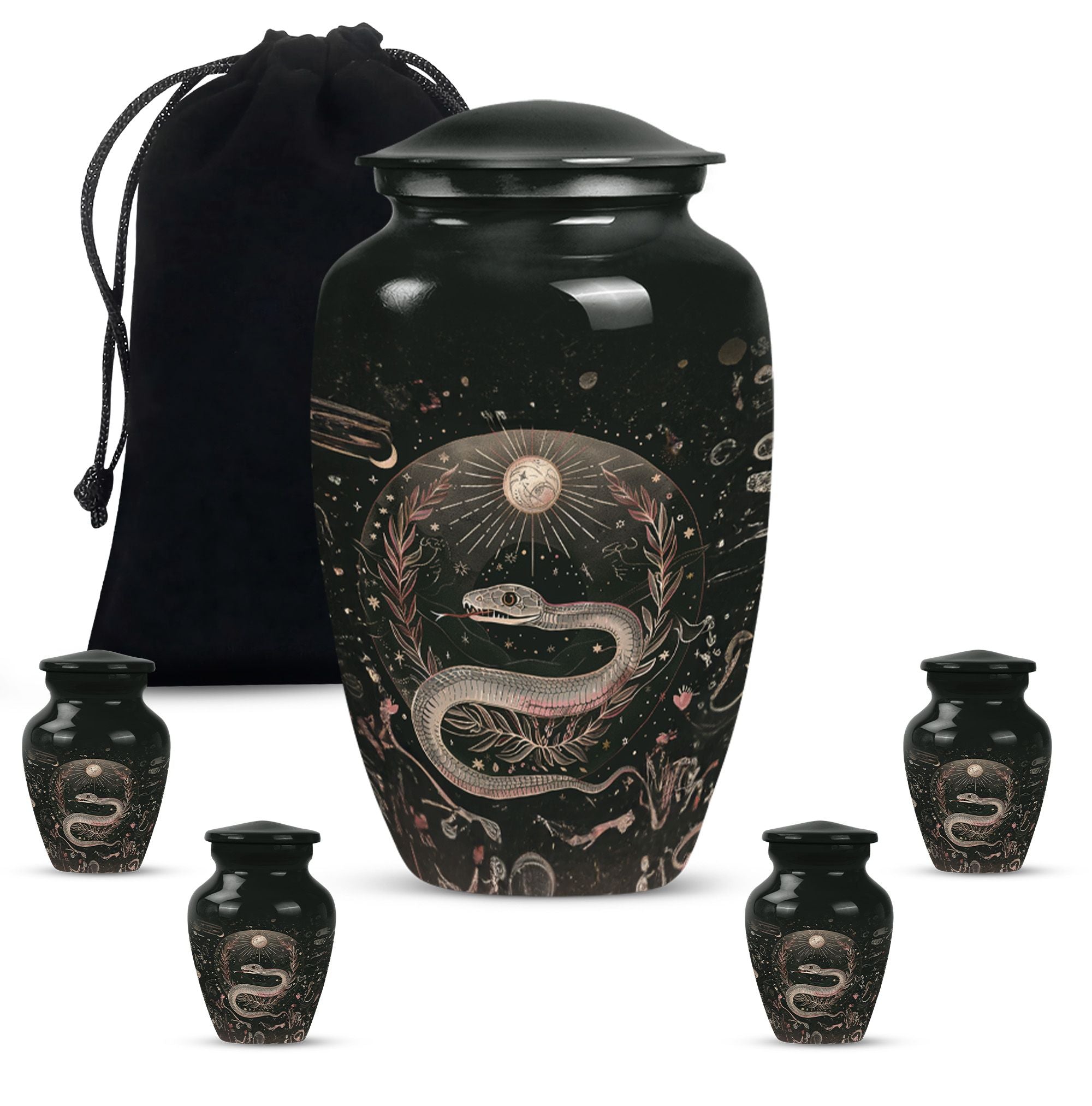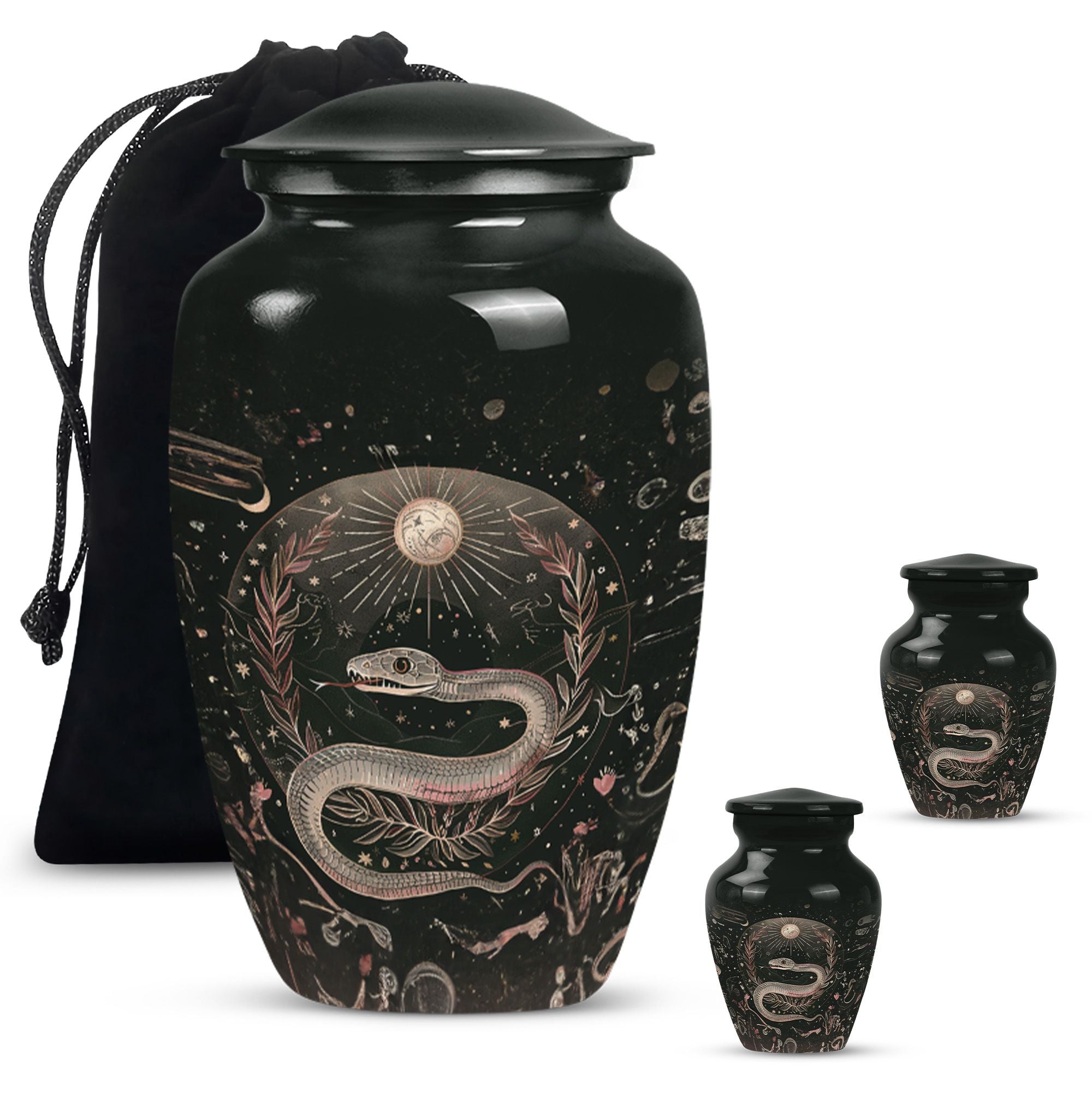 Unveiling our Snake Urn, an abstract-themed memorial piece that expertly combines sentimentality with classic elegance. This Large Urn, standing proud at 10 inches and weighing 3.3 pounds, is glistening with its beautiful aluminum material. The urn has a substantial capacity of 200 cubic inches, managing to be both lightweight yet robust. Moreover, with comprehensive size dimensions, it provides ample space for commemorating loved ones. This urn doesn't stop at being functionally exemplary; indeed, it offers users the chance to personalize it with engraved names, making it an entirely bespoke piece. Accompanied by a luxurious velvet pouch for secure containment of ashes, this urn is profoundly personal, yet tastefully sophisticated. Using an amalgamation of keywords such as 'Cremation personalized urns for human ashes adult,' 'ash adult urn human ash adult,' 'burial cremation urn,' and 'cremation urns medium size,' this urn has been tailored to meet your unique memorial needs to offer solace and comfort at this sensitive time.