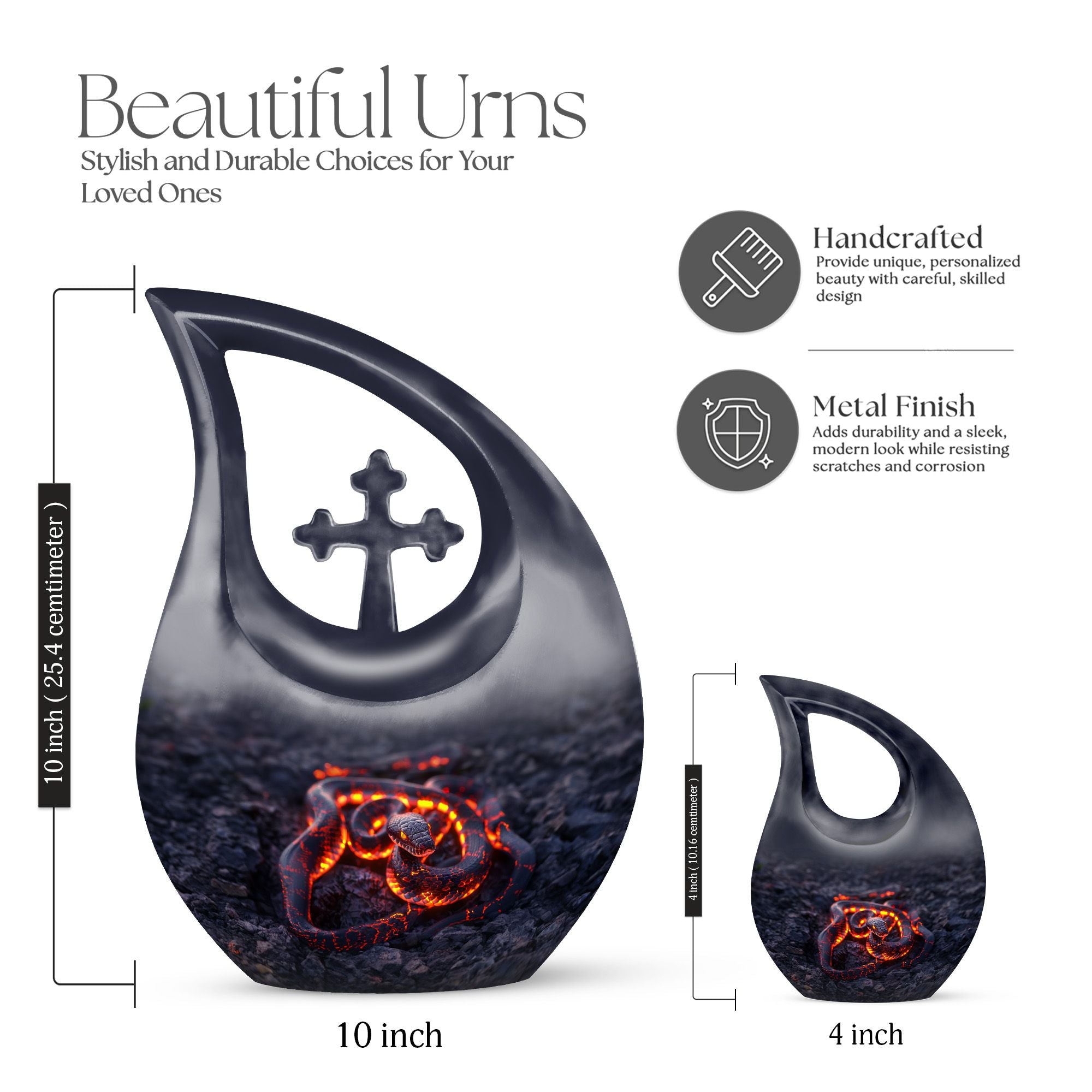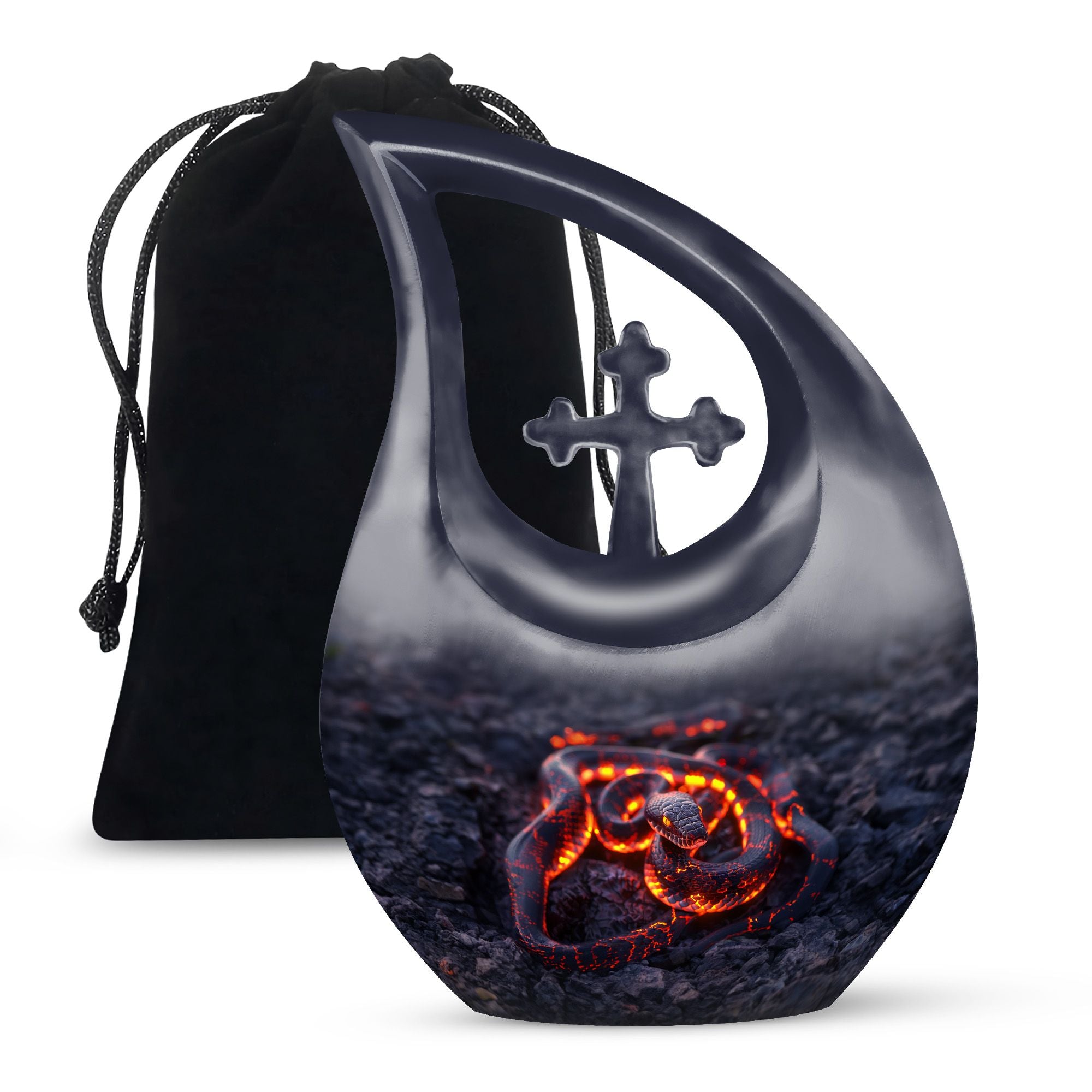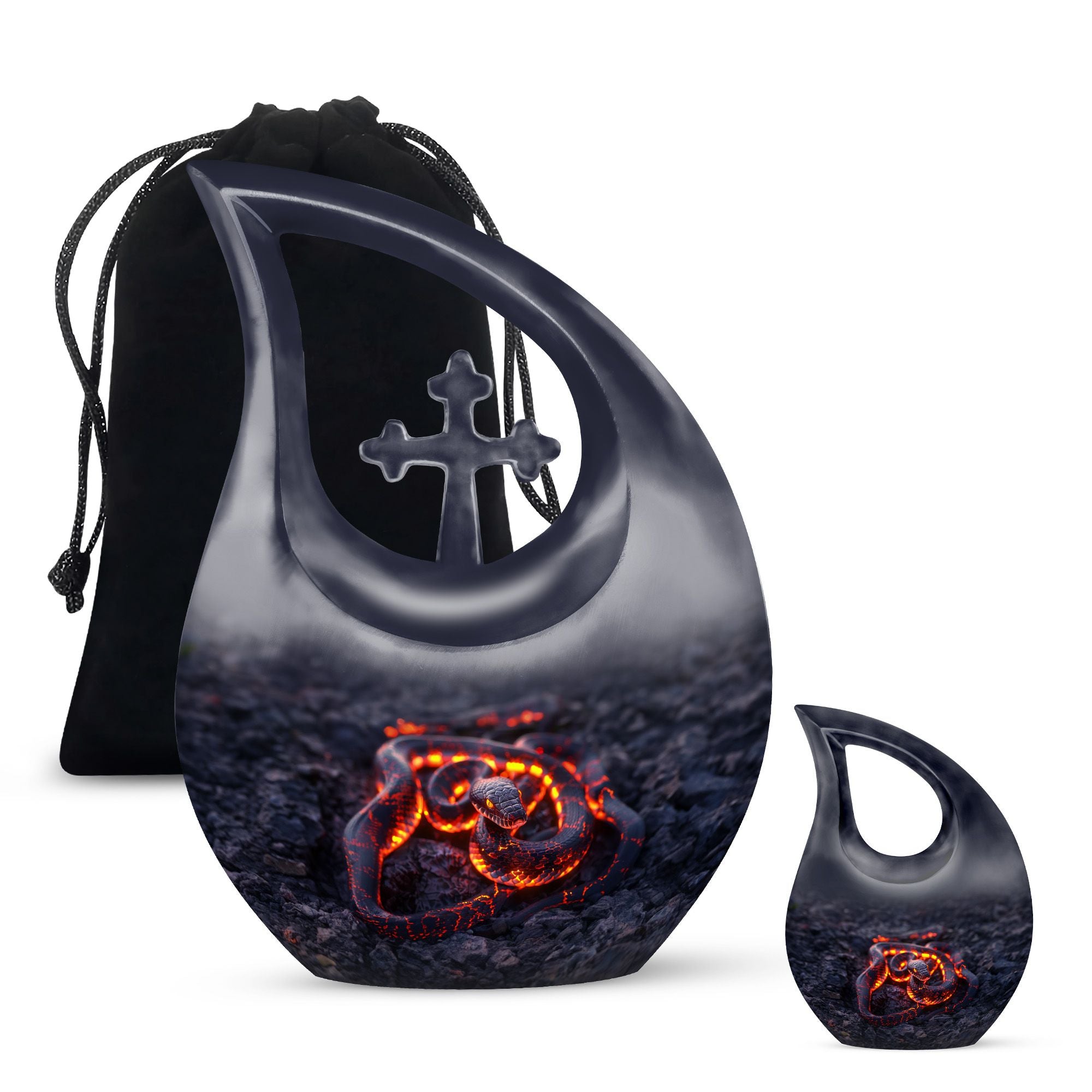 Embrace a dignified and respectful tribute to your departed loved ones with this exquisite Snake Urn, a standout in our collection of Urns for Cremated Remains. At a generous 10 inches in height, this large urn has an impressively prodigious capacity of 200 cubic inches. The elegant cross drop motif adds a spiritual nod to its meticulously crafted form, and the thematic snake, a timeless symbol of renewal and transformation, echoes the sacred cycle of life and death. It's crafted from a robust aluminium material that ensures its longevity. With its significant weight of 3.3 pounds, this memorial urn is solid, reassuring and perfectly mobile both for indoor memorials and as an outdoor urn. It offers the additional benefit of customization; you can personalize it with engraved names, creating a precious memento of eternal love. The urn is securely packaged with a silky velvet pouch for safe containment of ashes. Tranquil and affordable, this cremation urn helps in holding on to memories and letting go of pain.