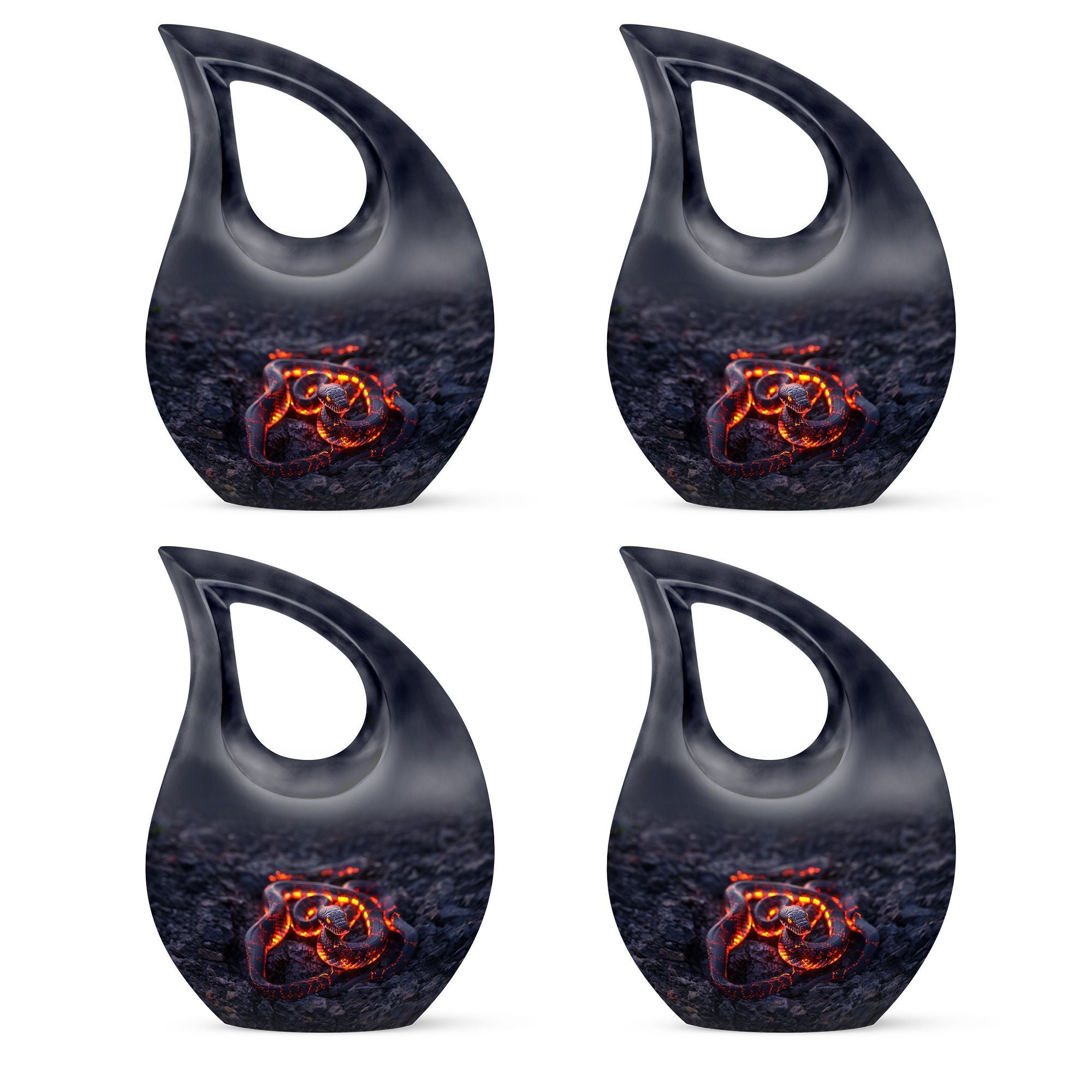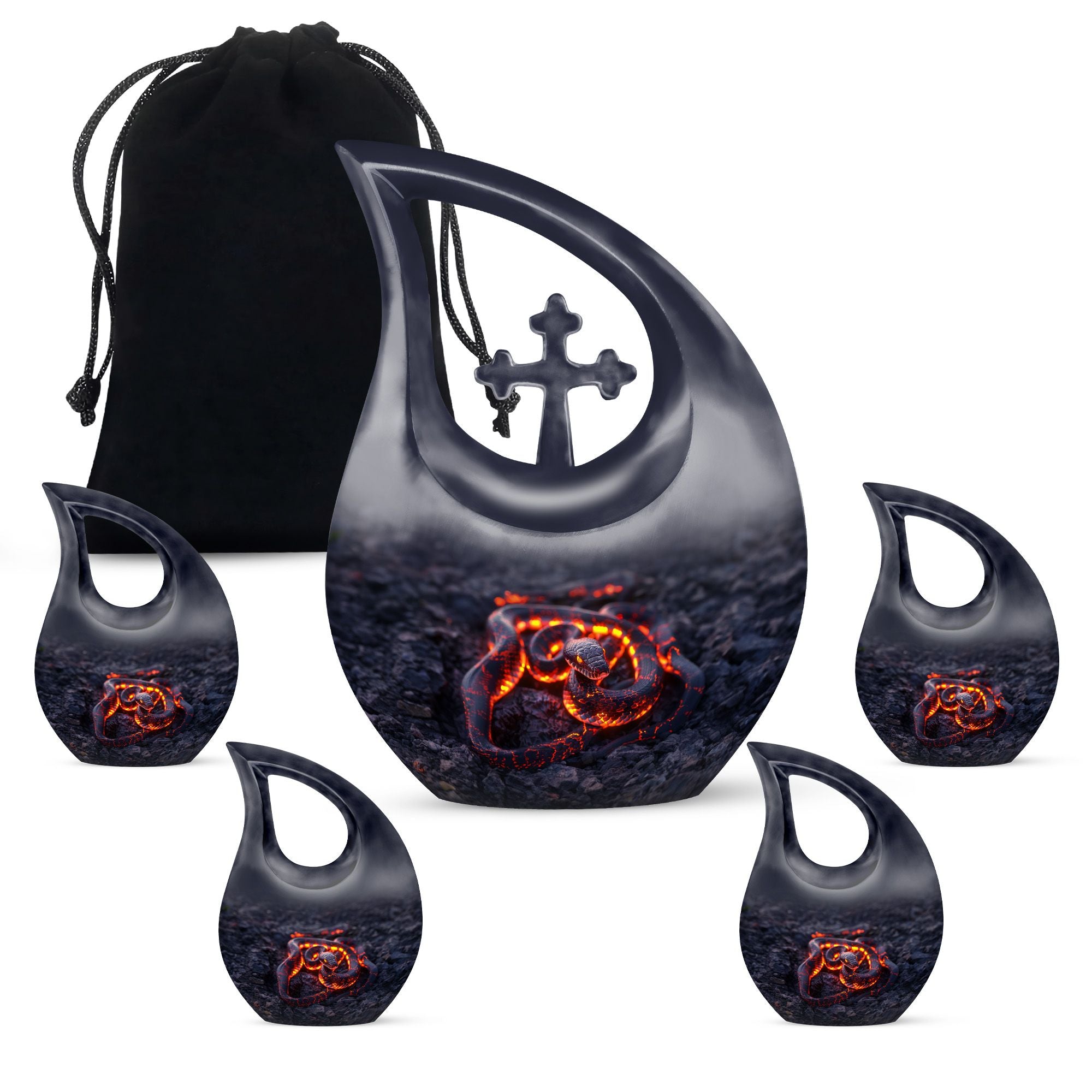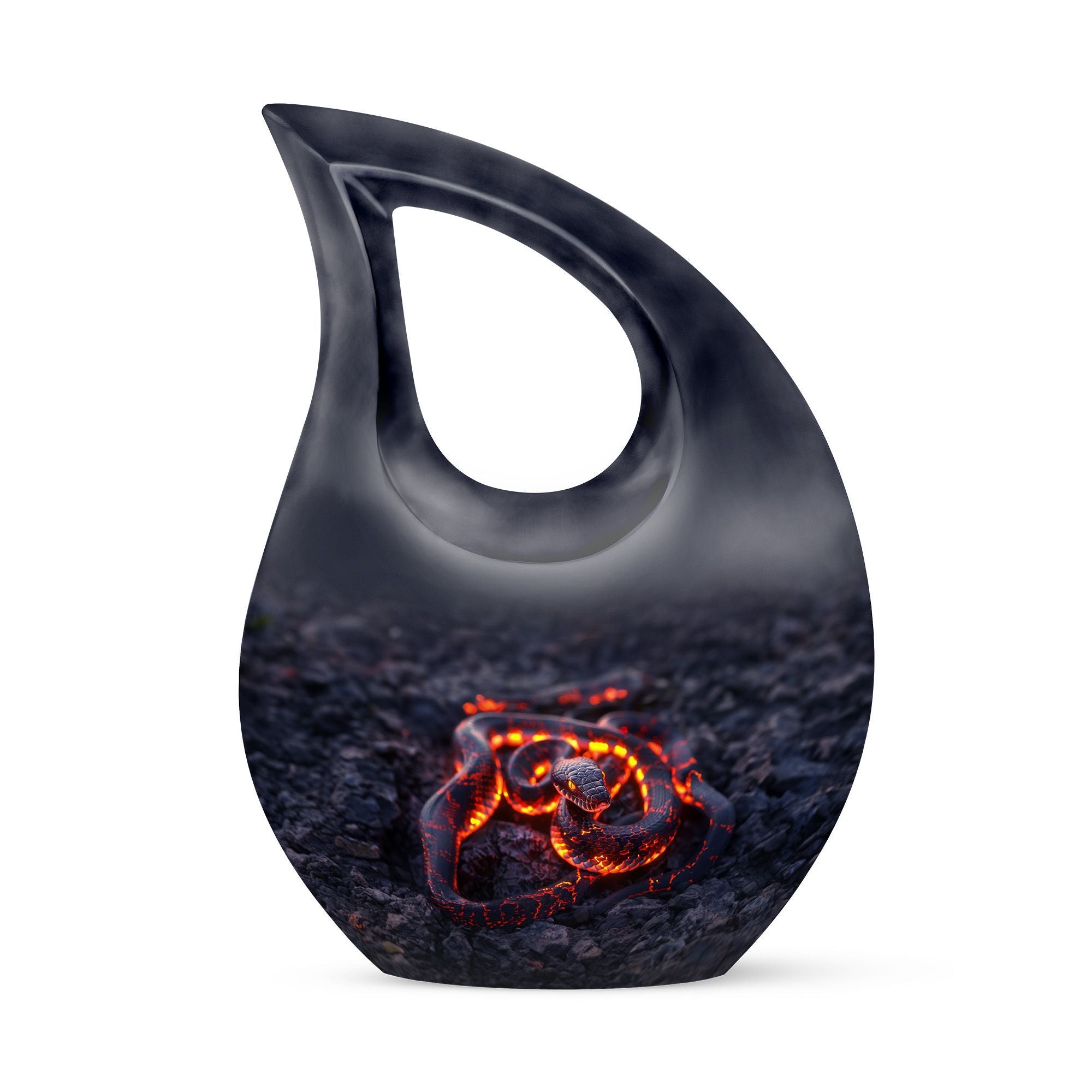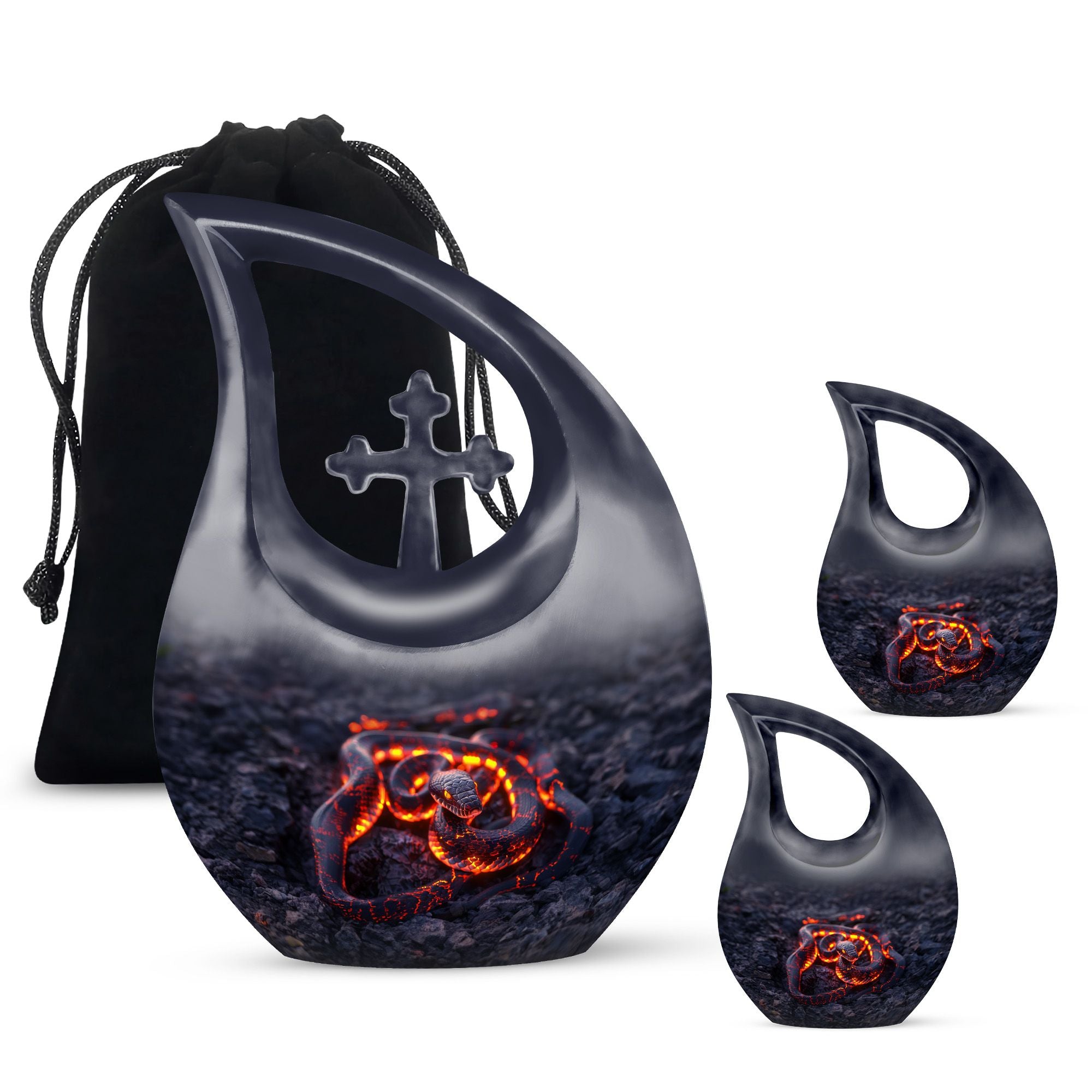 Embrace a dignified and respectful tribute to your departed loved ones with this exquisite Snake Urn, a standout in our collection of Urns for Cremated Remains. At a generous 10 inches in height, this large urn has an impressively prodigious capacity of 200 cubic inches. The elegant cross drop motif adds a spiritual nod to its meticulously crafted form, and the thematic snake, a timeless symbol of renewal and transformation, echoes the sacred cycle of life and death. It's crafted from a robust aluminium material that ensures its longevity. With its significant weight of 3.3 pounds, this memorial urn is solid, reassuring and perfectly mobile both for indoor memorials and as an outdoor urn. It offers the additional benefit of customization; you can personalize it with engraved names, creating a precious memento of eternal love. The urn is securely packaged with a silky velvet pouch for safe containment of ashes. Tranquil and affordable, this cremation urn helps in holding on to memories and letting go of pain.