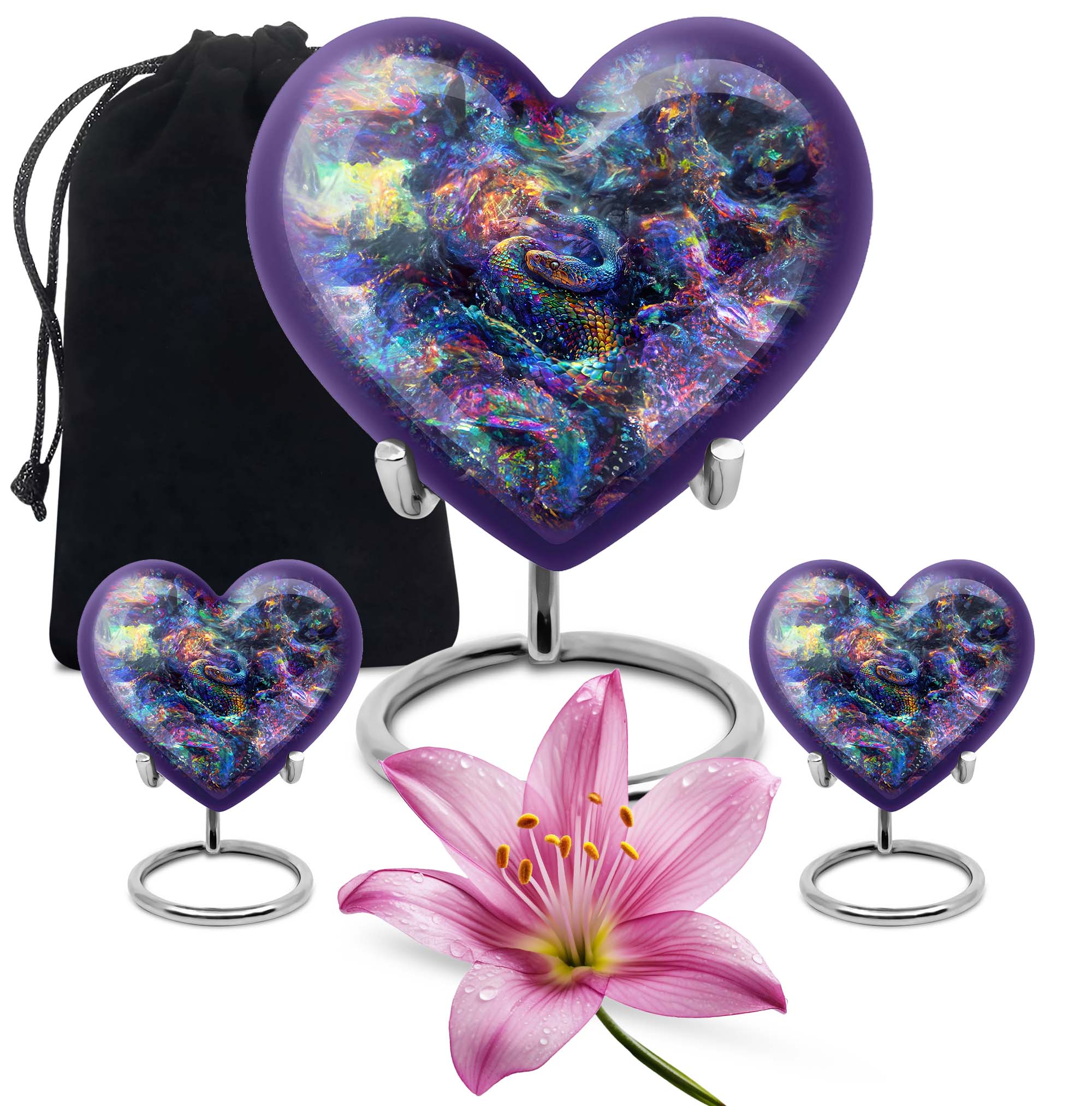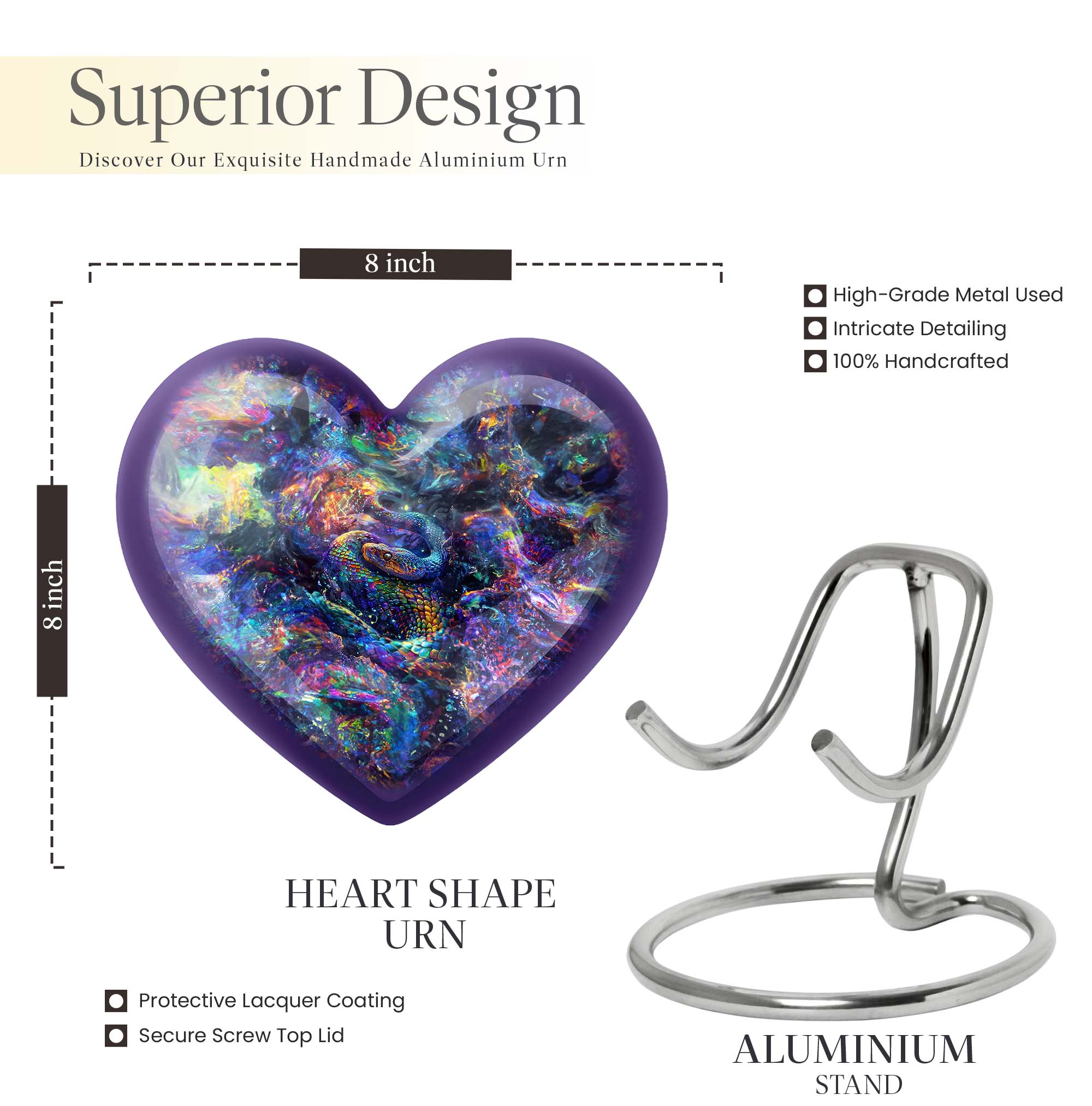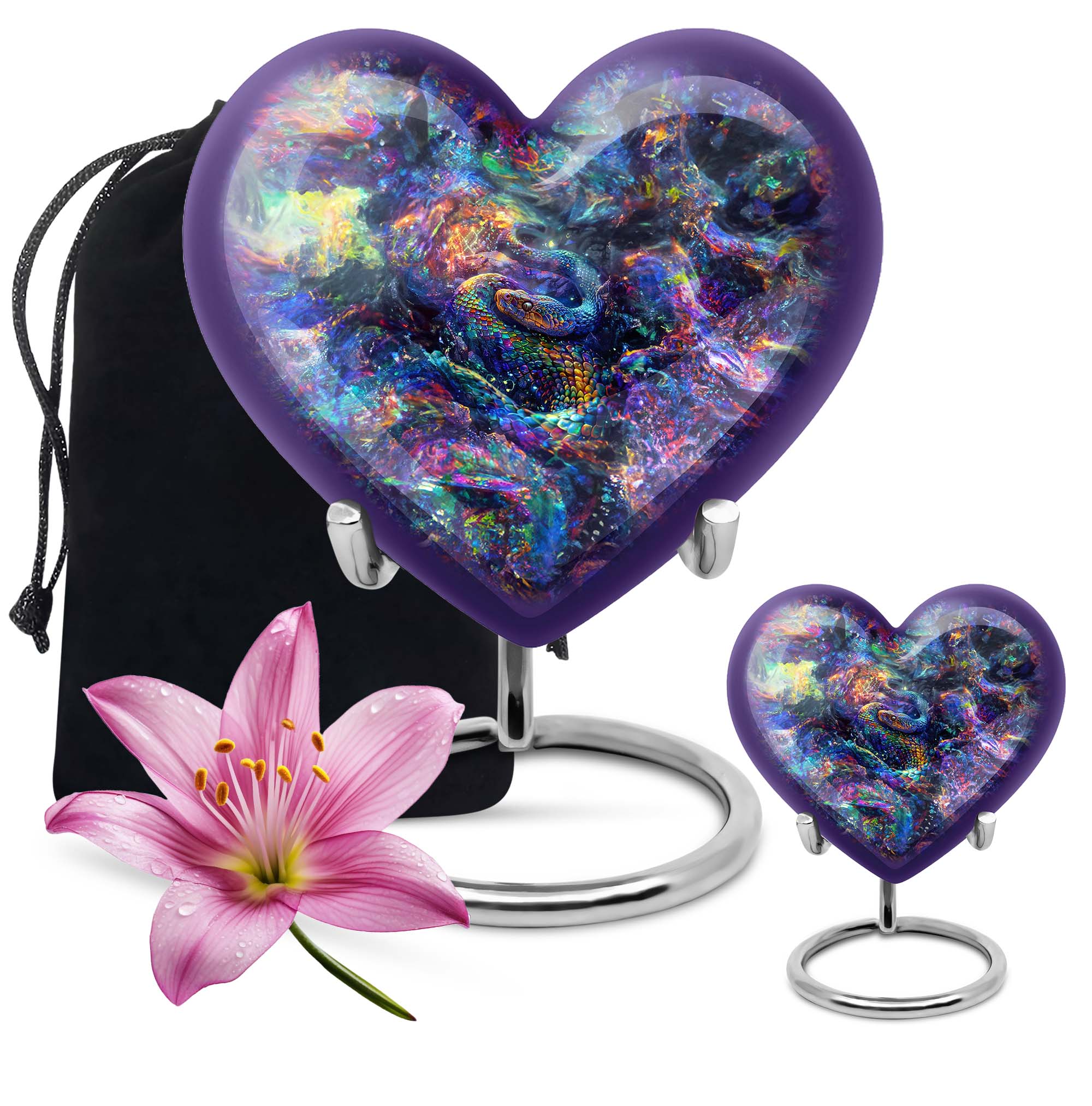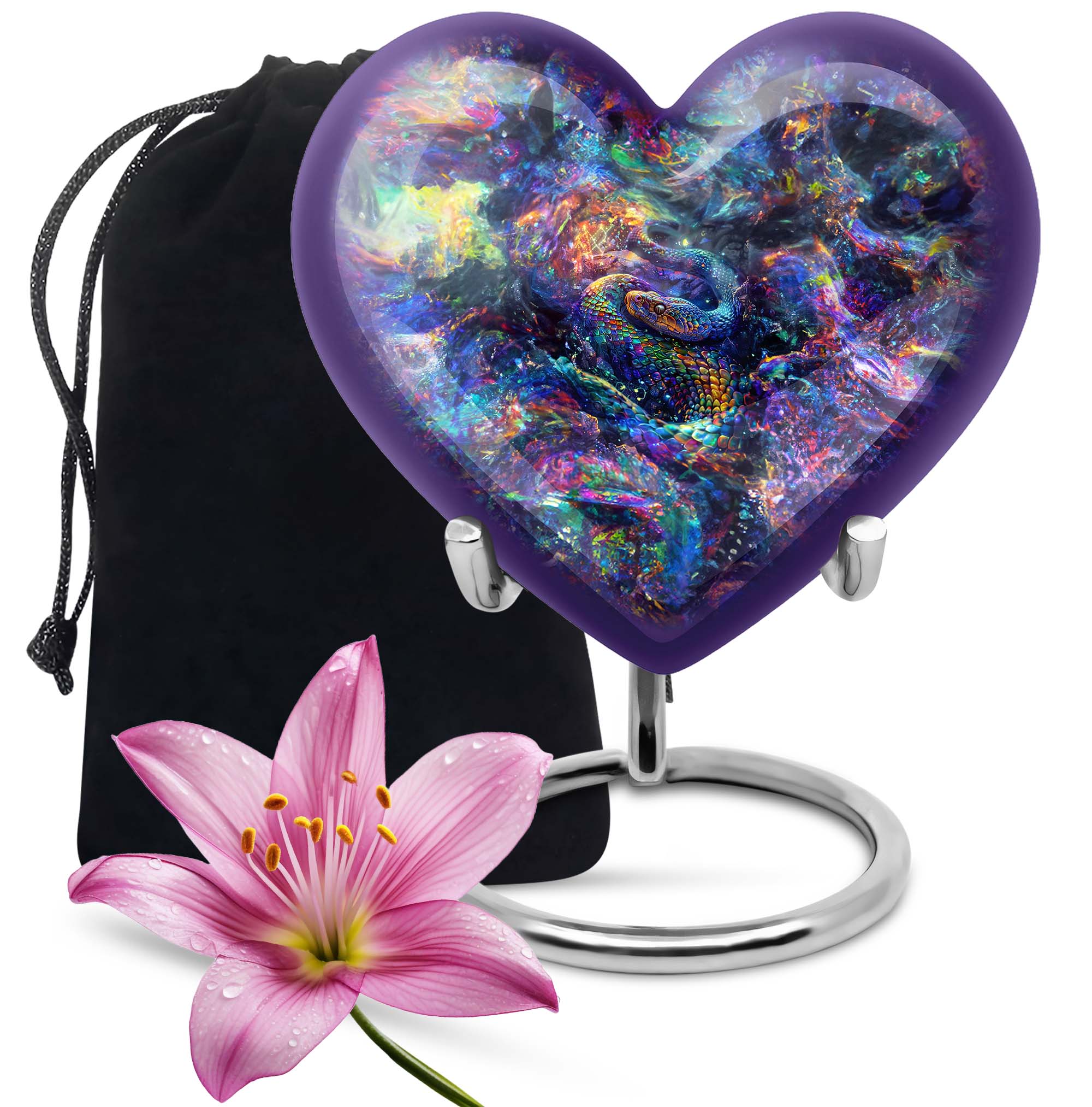Indulge in the austere serenity that this exceptional, heart-shaped snake urn brings. As a symbol of eternal love and remembrance, this large urn, crafted from durable aluminium, serves as the perfect resting place for your departed loved ones. Measuring adequatly at 10 inches in height and weighing 3.3 pounds, it offers a substantial capacity of 200 cubic inches. Perfect for memorial ceremonies for adults, this burial urn for ashes ensures their lasting memory is preserved. The container arrives accompanied by a delicate velvet pouch, meant for secure containment of the ashes. For a unique touch, you have the choice to personalize this urn with engraved names. Its abstract theme adds to its inherent charm. The snake urn serves as a fitting tribute, an echo of our endless love and respect. Allowing for a rich landscape of memories in featuring it, the urn seamlessly blends practicality with sentimentality.
