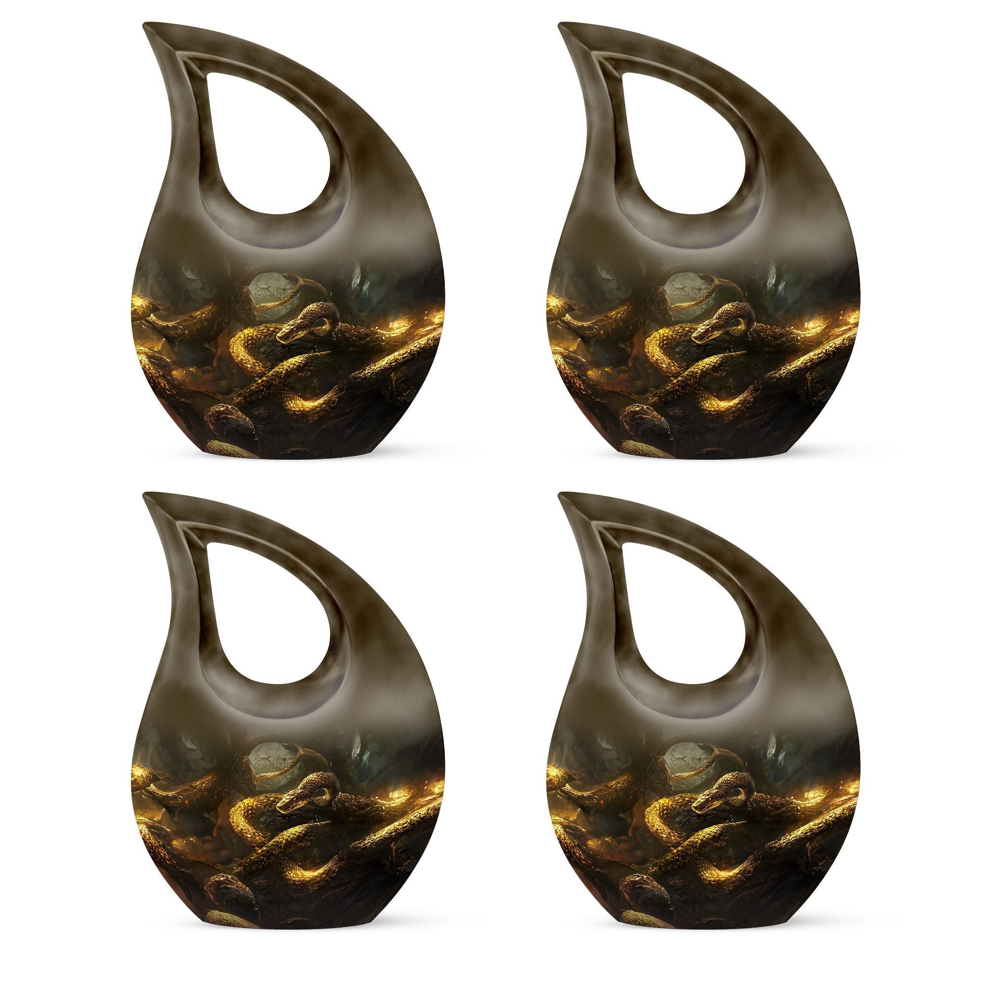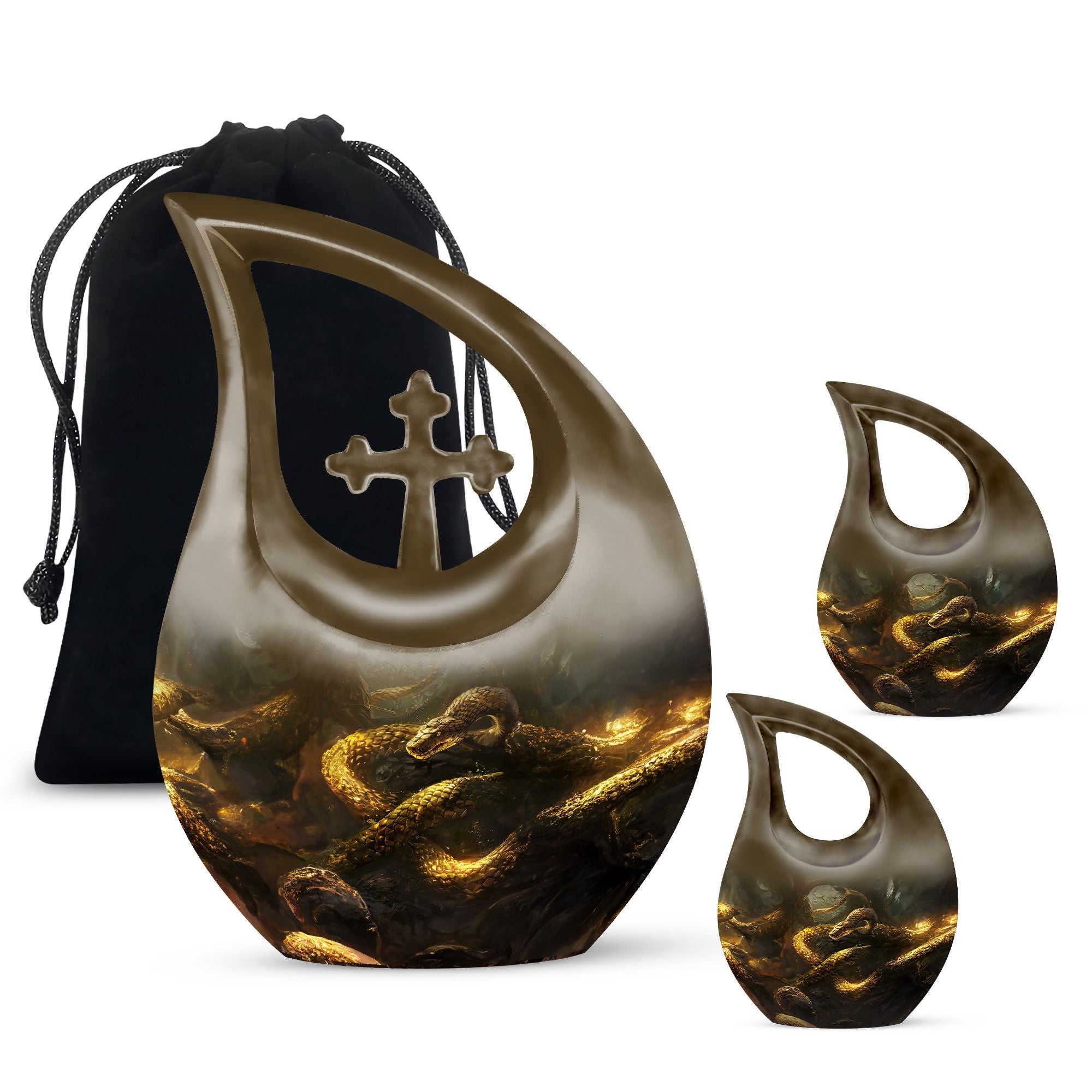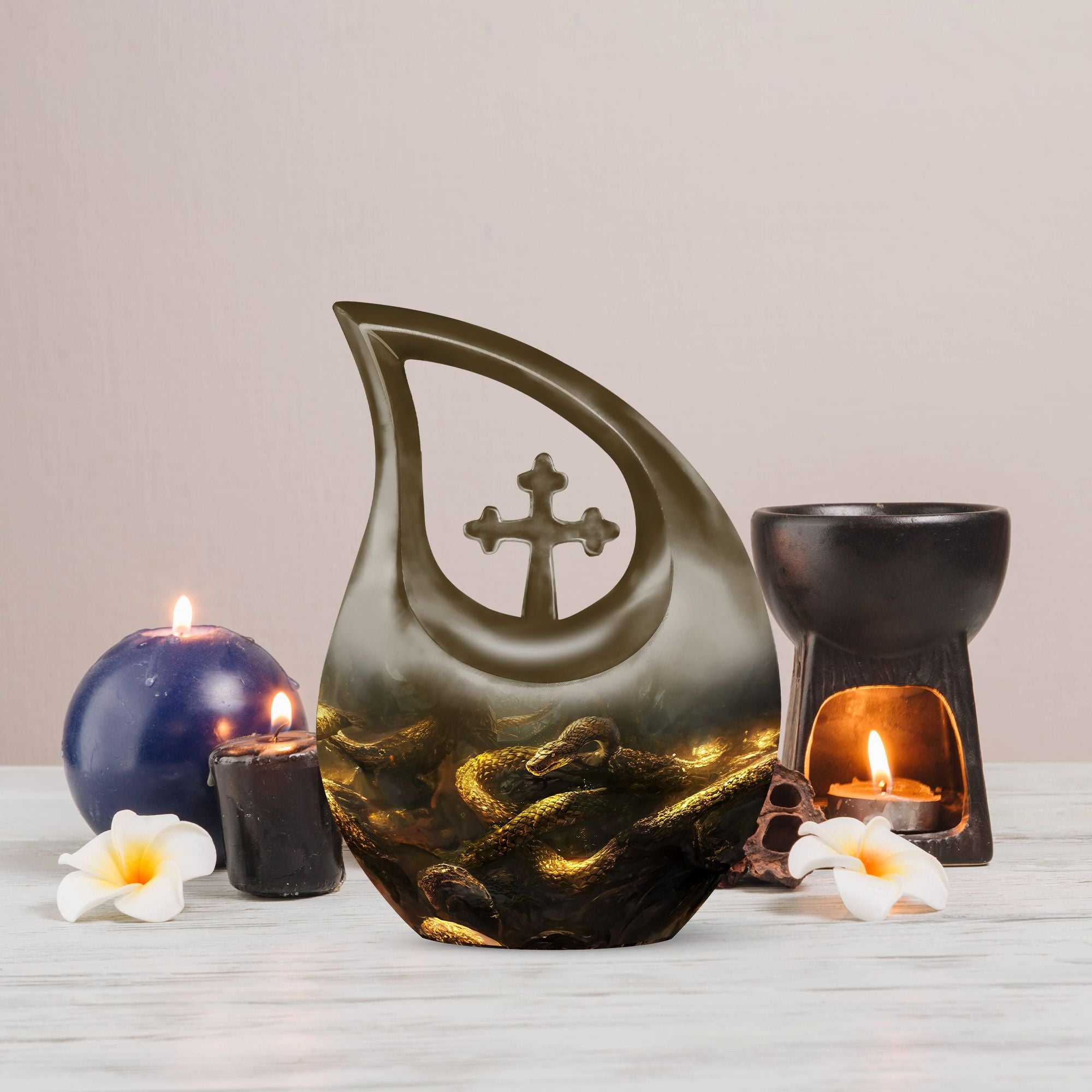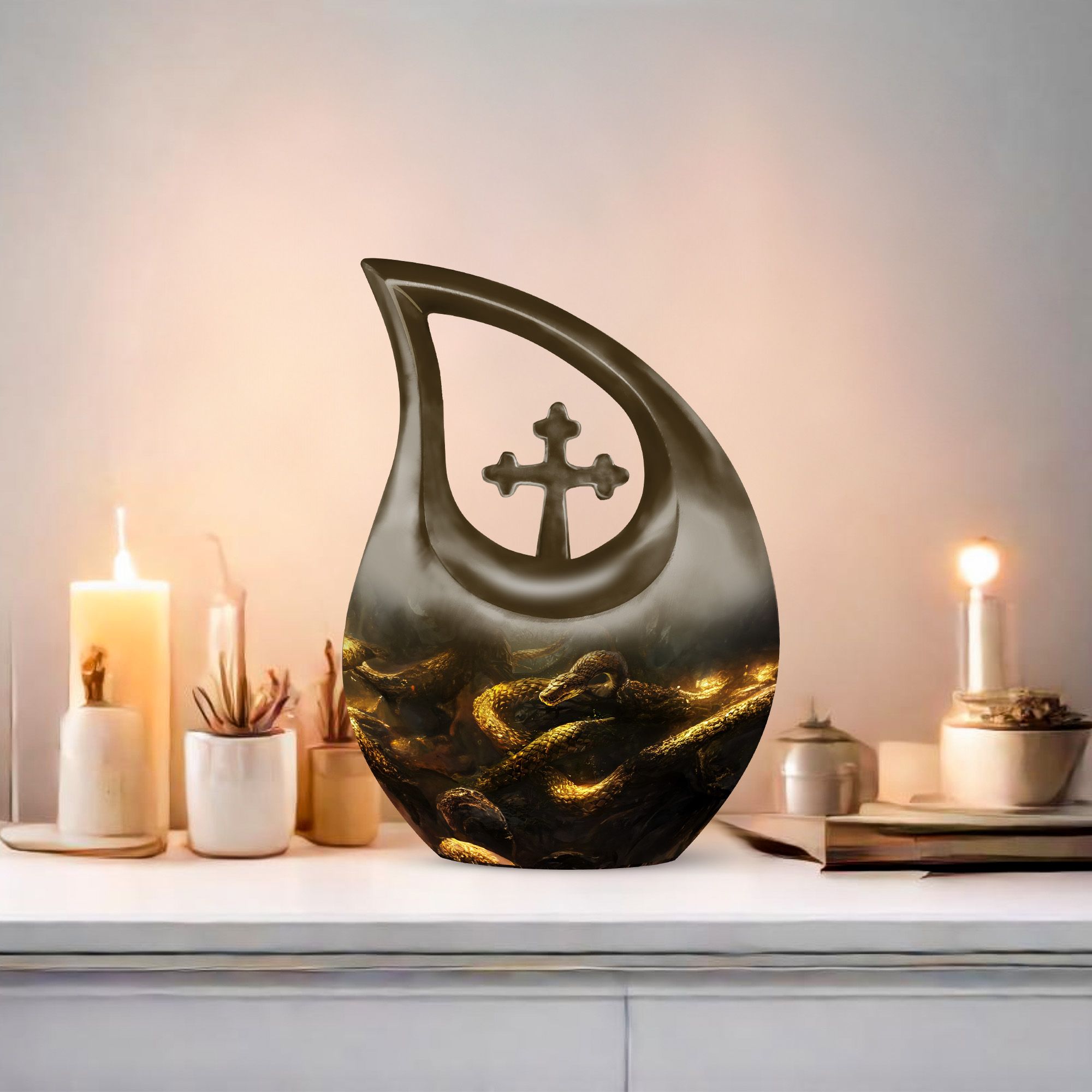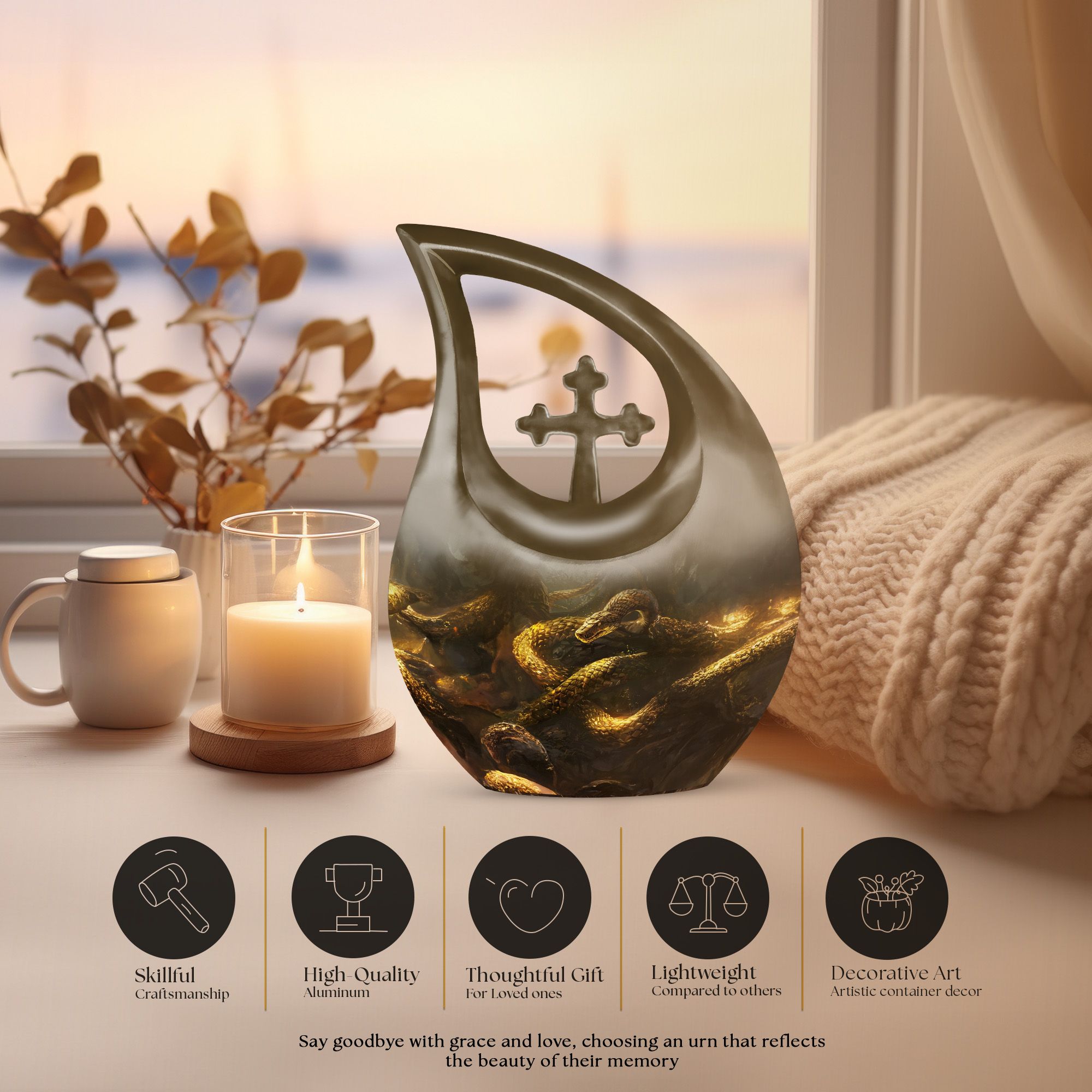 Presenting the enchanting Snake Urn, a stylish tribute to your beloved mom. Standing tall at 10 inches and weighing 3.3 pounds, this memorial urn is distinctive in both design and charm. Elevating the theme of 'snake', the urn carries a 'cross-drop' design that adds an emotional touch to its look. Handcrafted with the finest aluminium, it ensures long-lasting preservation and a heartfelt honoring of your loved one. The urn also has a generous capacity of 200 cubic inches, making it ideal for most adults. The package also comes with a luxurious velvet pouch, keeping the ashes safely contained, adding an extra level of respect to your departed loved one. The urn also provides the opportunity for personalization; you can engrave names to make the memory eternal. Deemed as a touching alternative to traditional cremation vaults, this urn showers love and respects the sentiments attached to it. Ideal for the gentle soul your mom was, the virtue and beauty of this ashes container are truly unmatched. Note, this product falls under the category of 'Large Urns' for an enhanced preservation experience.