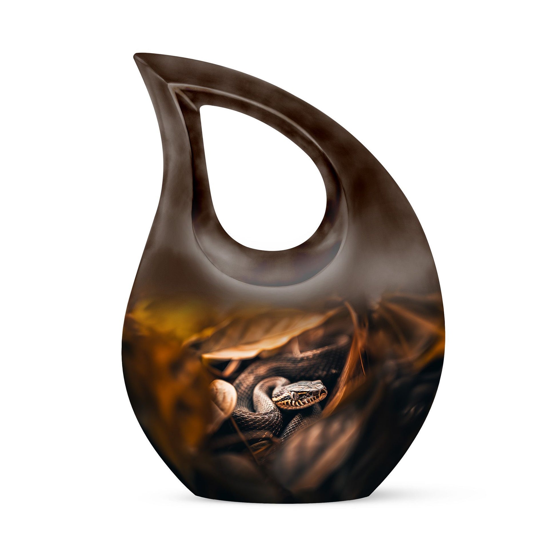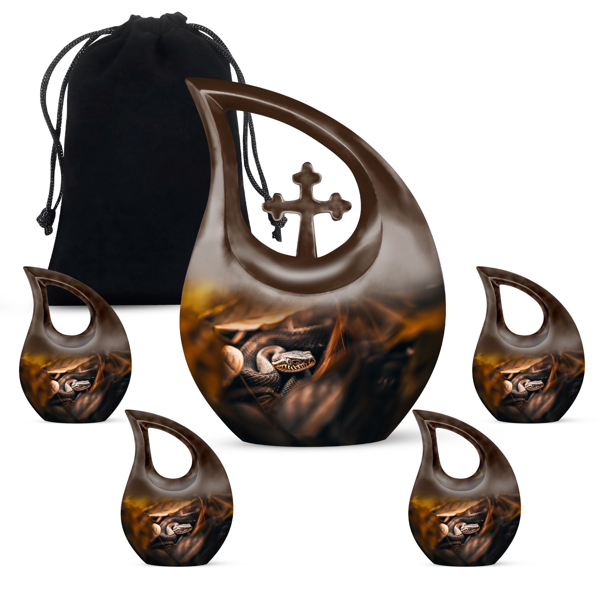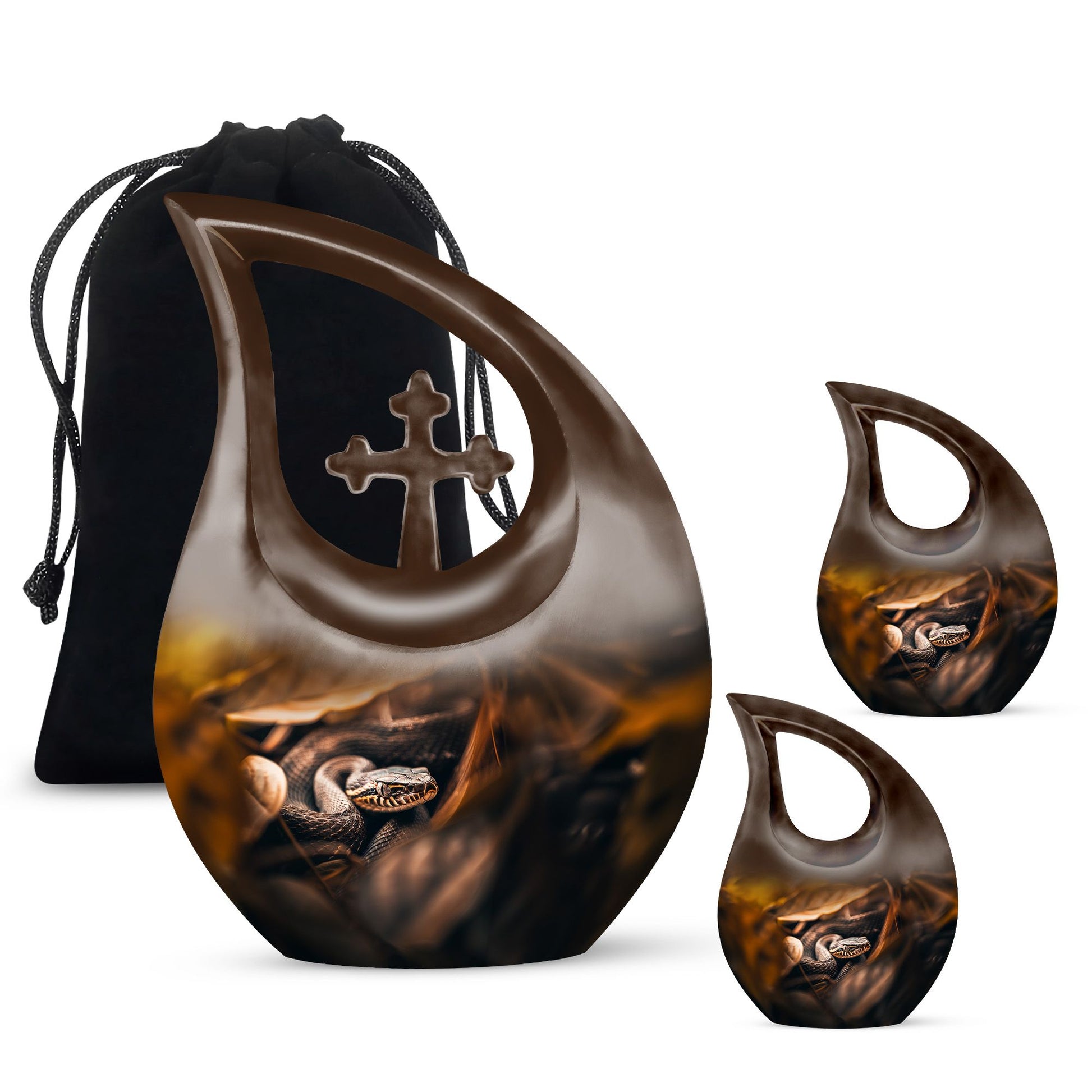 The Snake Urn is a striking embodiment of serenity and solemnity, crafted for those seeking meaningful memorial urns. Our 10-inch urn provides plenty of space, holding up to 200 cubic inches, capable of containing the ashes of an adult. Weighing a sturdy 3.3 pounds, this aluminium-built urn exhibits the resilience and nobility of a snake, signifying the relentless spirit of the one it represents. The distinctive Cross Drop design adds an element of reverence, fostering a profound sense of respect and remembrance. This comes in a velvet pouch, providing secure containment for the ashes of your loved ones. Our urn embraces customization - personalize it with engraved names to create a unique remembrance. This Snake urn is an example of Large Urns, designed with the ease of usage for adults and seniors. Suitable for Urns for Angels, Urn for Mom, Remembrance Urns for Ashes, Modern Urns for Ashes, or Burial Urns for Human Ashes. An excellent tribute to the unforgettable souls that have graced your life.
