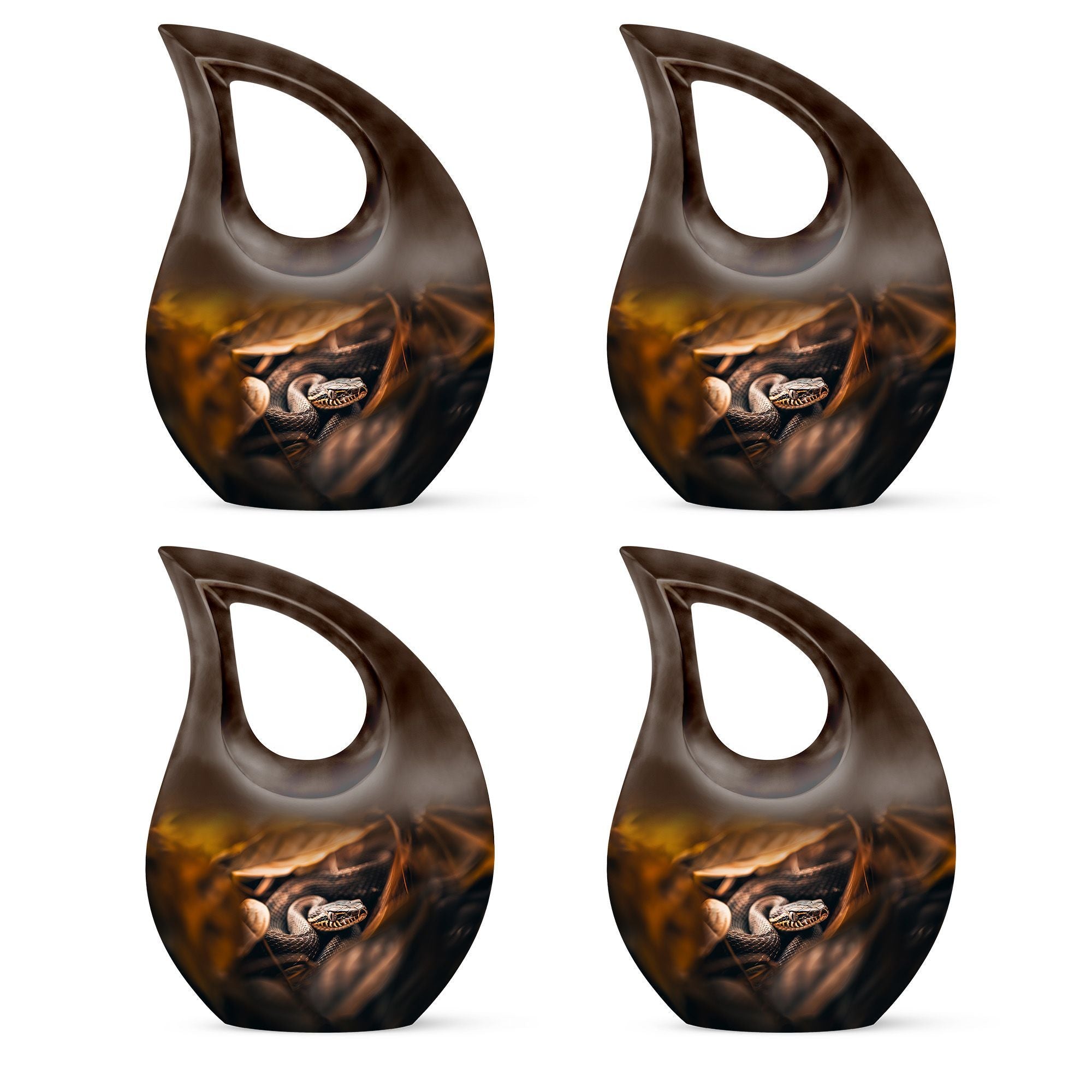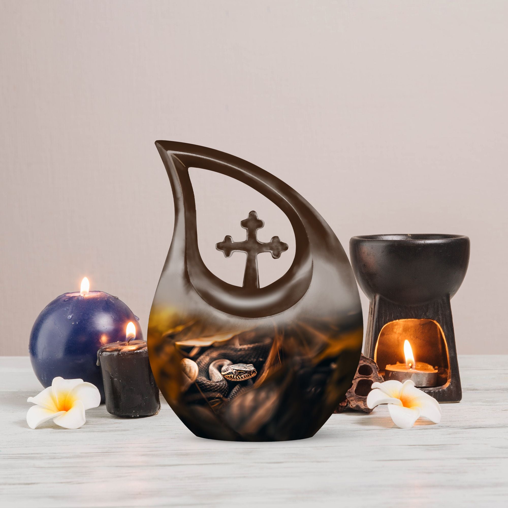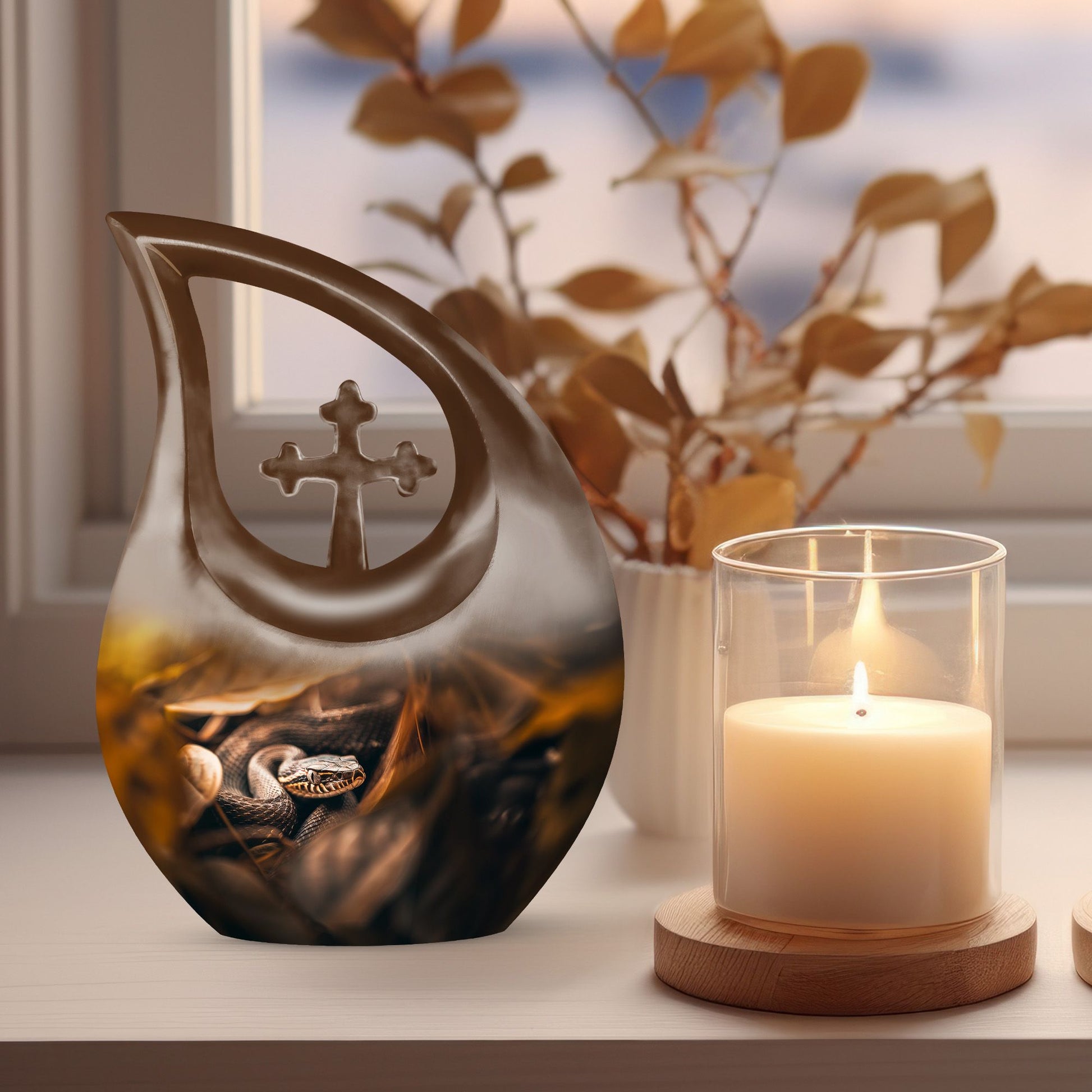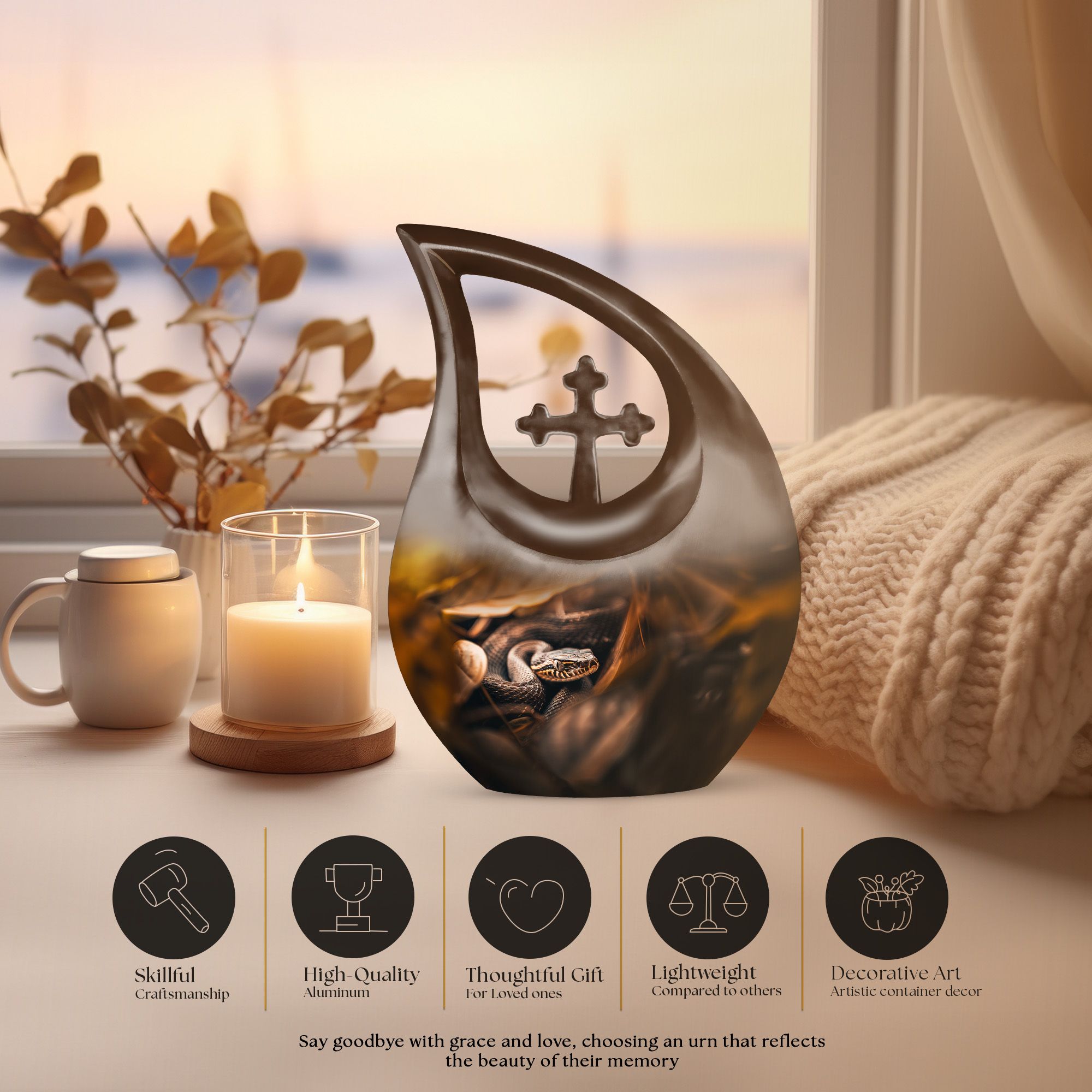 The Snake Urn is a striking embodiment of serenity and solemnity, crafted for those seeking meaningful memorial urns. Our 10-inch urn provides plenty of space, holding up to 200 cubic inches, capable of containing the ashes of an adult. Weighing a sturdy 3.3 pounds, this aluminium-built urn exhibits the resilience and nobility of a snake, signifying the relentless spirit of the one it represents. The distinctive Cross Drop design adds an element of reverence, fostering a profound sense of respect and remembrance. This comes in a velvet pouch, providing secure containment for the ashes of your loved ones. Our urn embraces customization - personalize it with engraved names to create a unique remembrance. This Snake urn is an example of Large Urns, designed with the ease of usage for adults and seniors. Suitable for Urns for Angels, Urn for Mom, Remembrance Urns for Ashes, Modern Urns for Ashes, or Burial Urns for Human Ashes. An excellent tribute to the unforgettable souls that have graced your life.