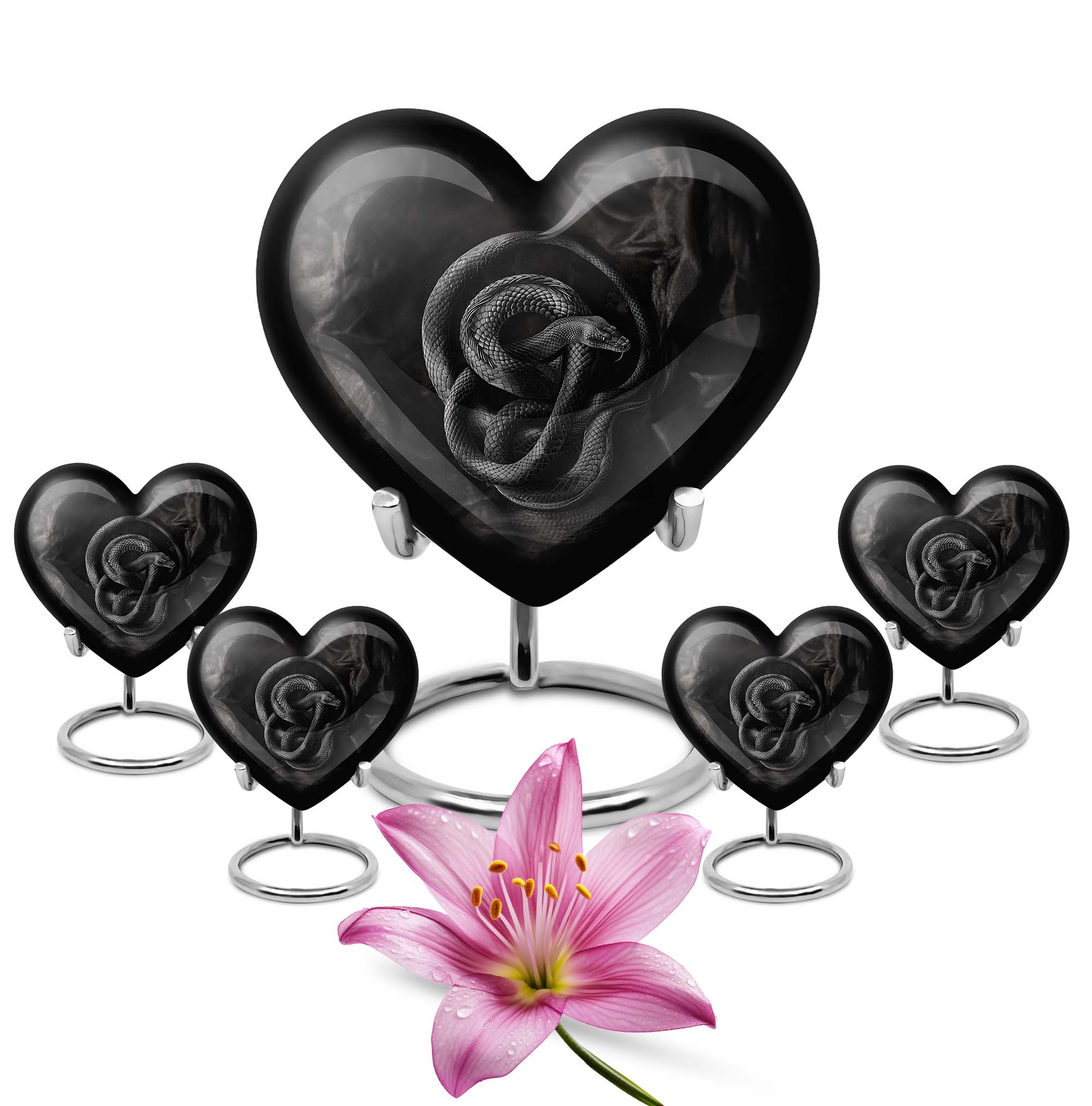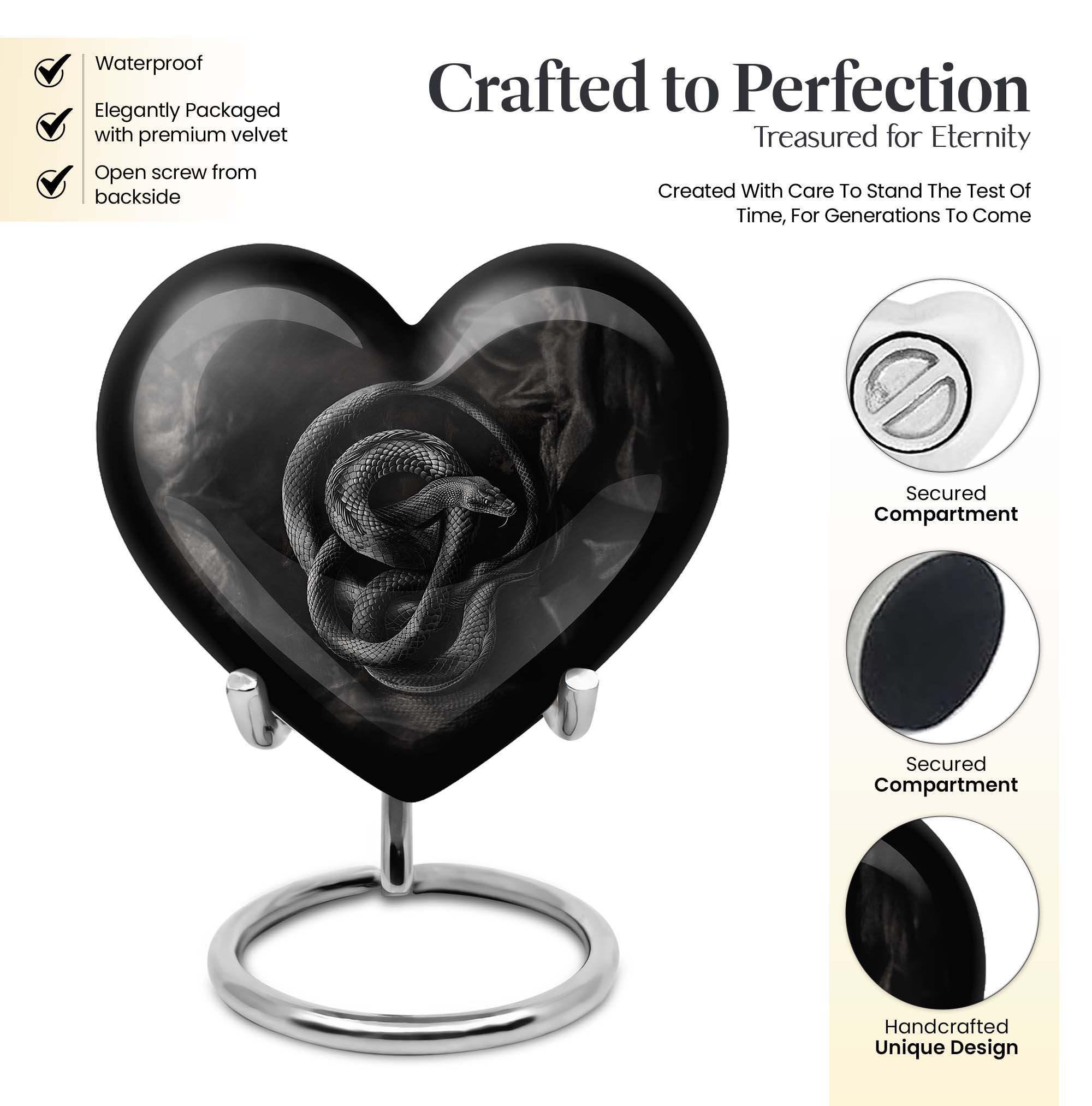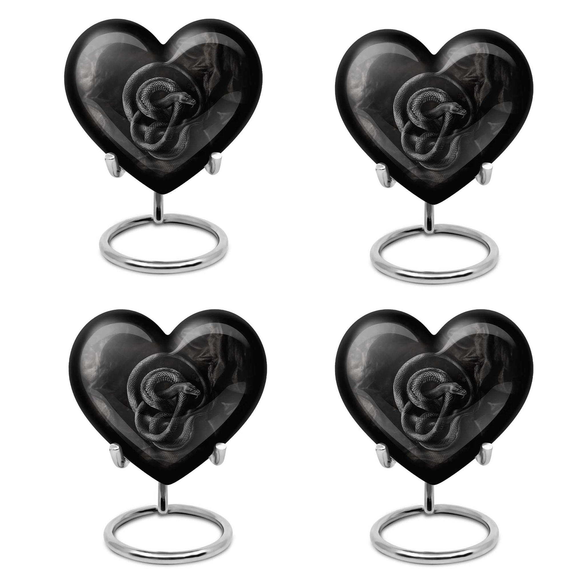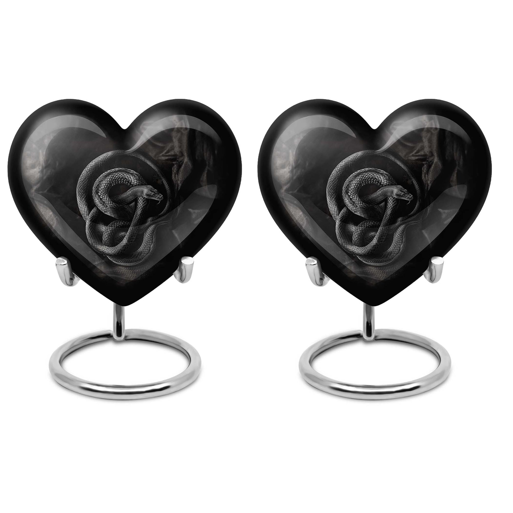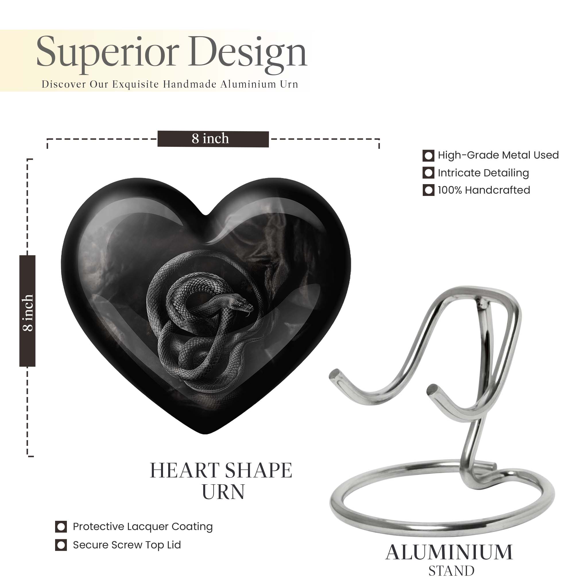 Cherish the memory of a loved one with this universally profound, Abstract-theme Large Urn, delicately crafted from robust Aluminium to stand the test of time. Its unique heart design exudes boundless affection and captures the essence of eternal love. Sized at 10-inches with an impressive capacity of 200 cubic inches, it ensures the safe containment of the ashes of the departed. Weighing only 3.3 pounds, this cremation urn is highly portable and a constant reminder of the unbroken bond with the departed. Exceptional attention has been paid to its packaging, offering a distinct velvet pouch for the thoughtful containment and protection of ashes. Adding a personal touch, this urn can be customized with engraved names, making each piece profoundly personal and unique. Indulge in the timeless emotion carried within these snake urns, a perfect choice for those seeking contemporary burial urns for adult female ashes or modern metal urns. An equally thoughtful gift for those seeking ways to sustain their connection with the dearly departed.