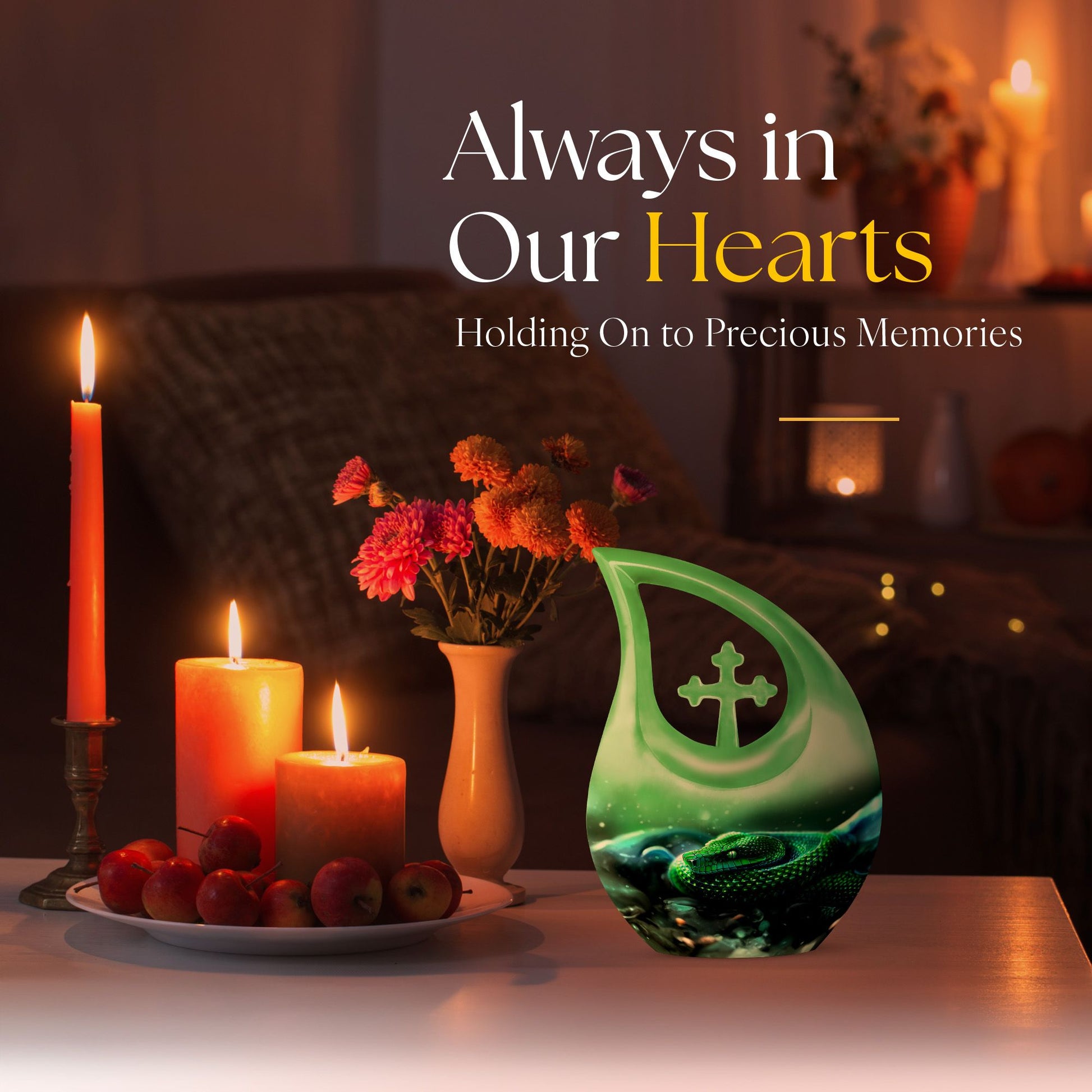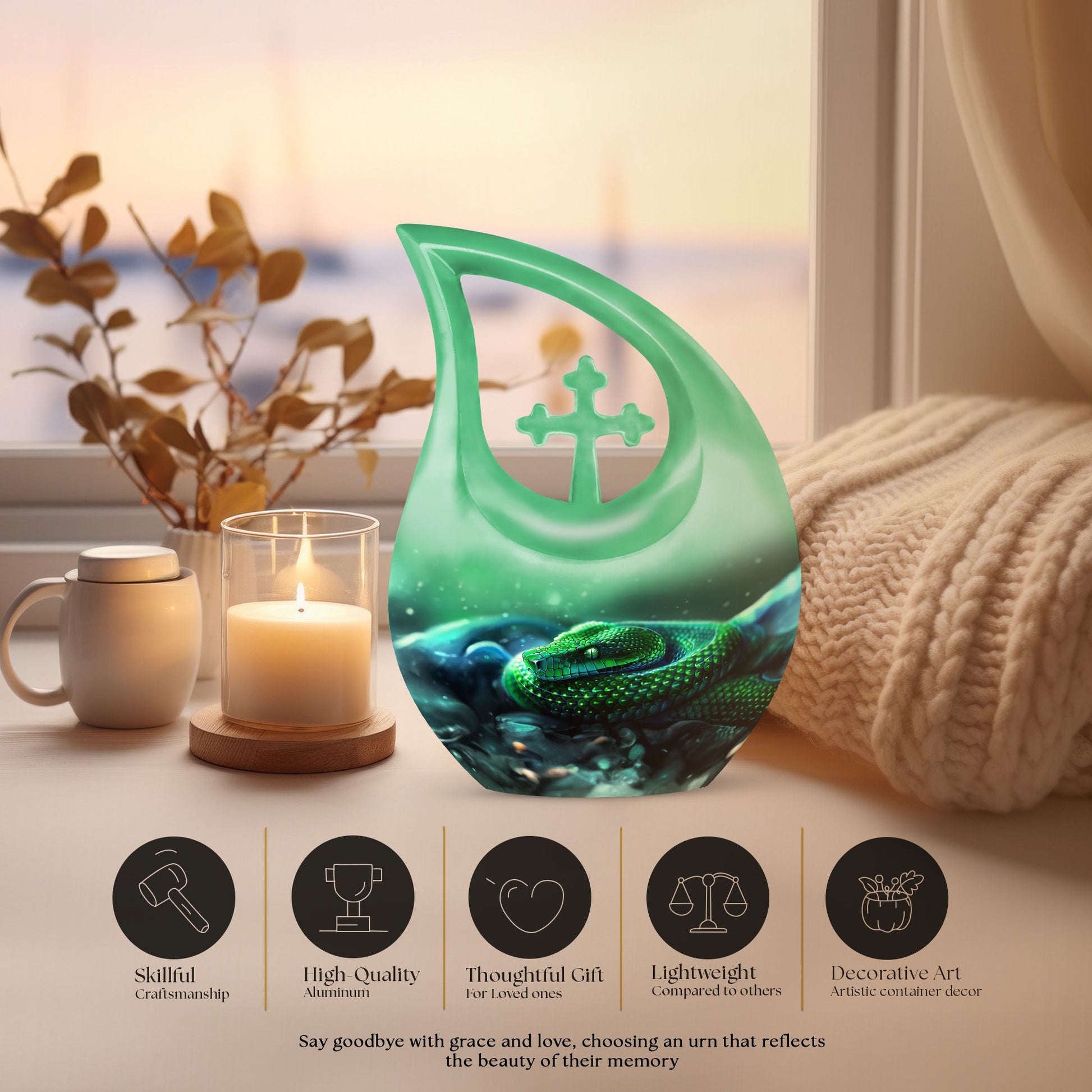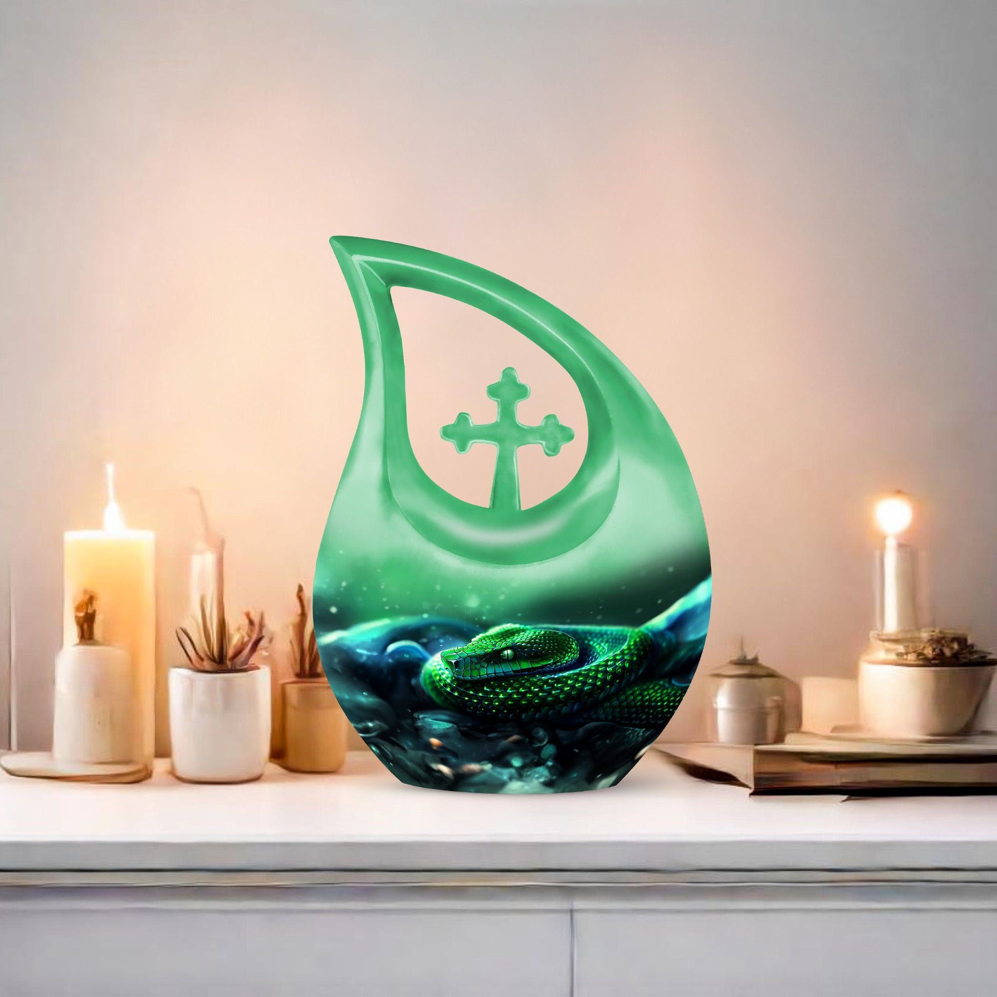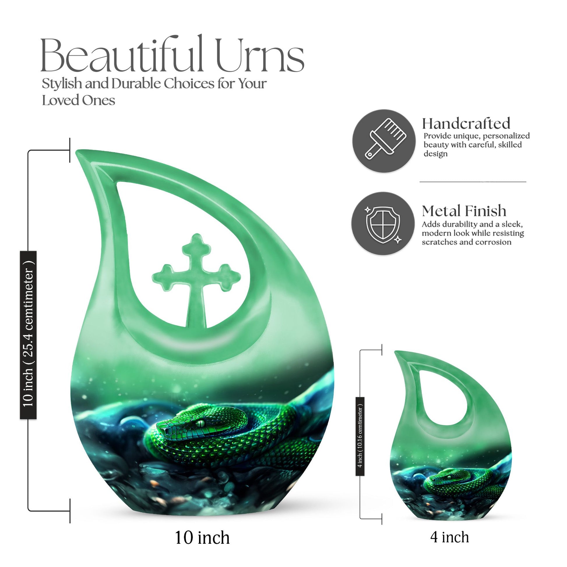 Honor the memory of your loved one with our high-quality Snake Urn. This large 10-inch urn is made of enduring aluminium and weighs a sturdy 3.3 pounds, ensuring it remains a lasting tribute. It uniquely combines the 'Cross Drop' and 'Snake' themes, creating a modern yet respectful remembrance item that stands out from typical memorial urns. The urn has a significant capacity of 200 cubic inches, accommodating a substantial amount of ashes. Included with your purchase is a plush velvet pouch, providing a dignified containment for the remains. Furthermore, our Custom Mom Urn offers personalization options, allowing you to engrave names and keep memories alive. This feature makes the item an ideal choice for those seeking memorial items such as Remembrance Urns For Ashes, Urns for Angels, or modern urns for ashes. Let artifacts honor your loved one.