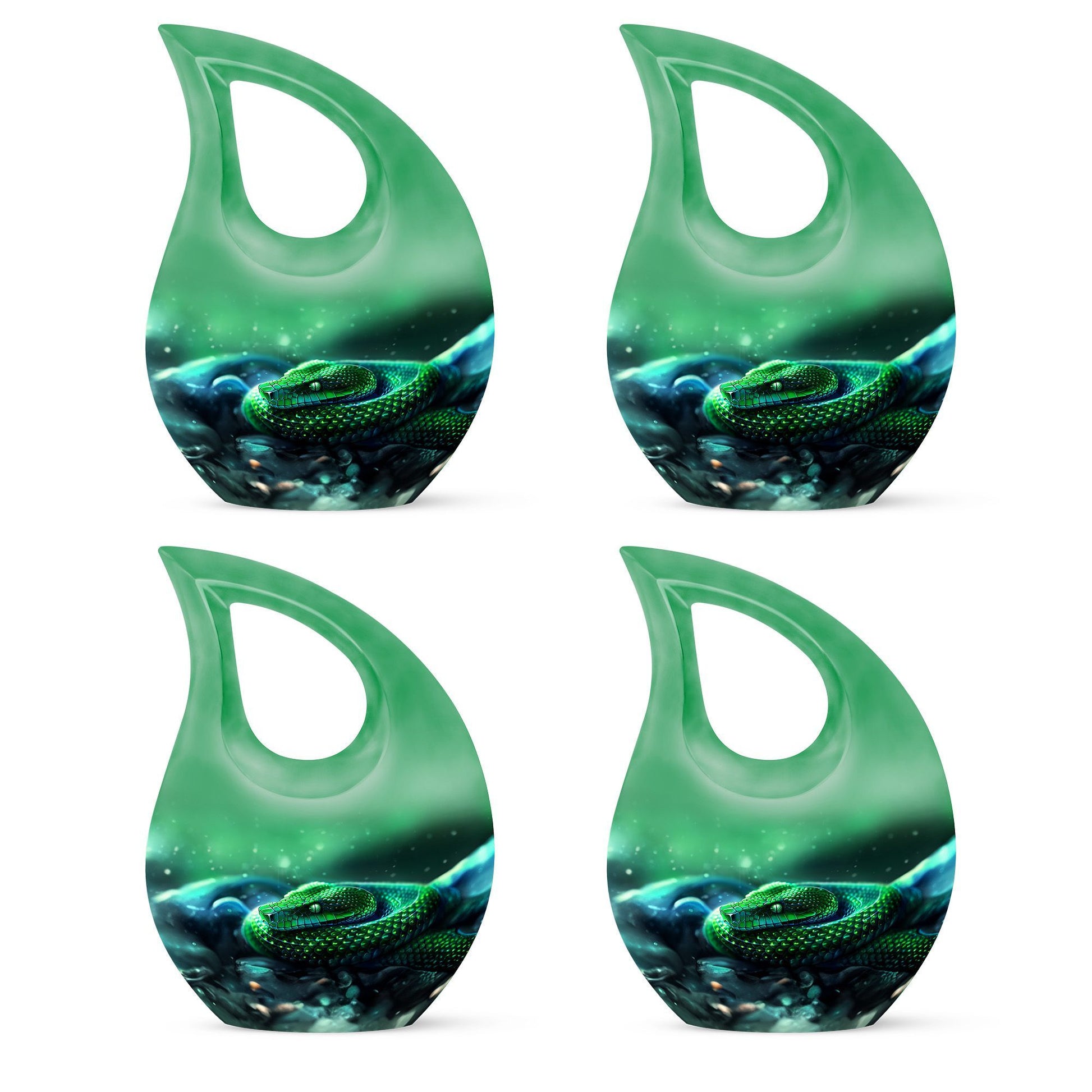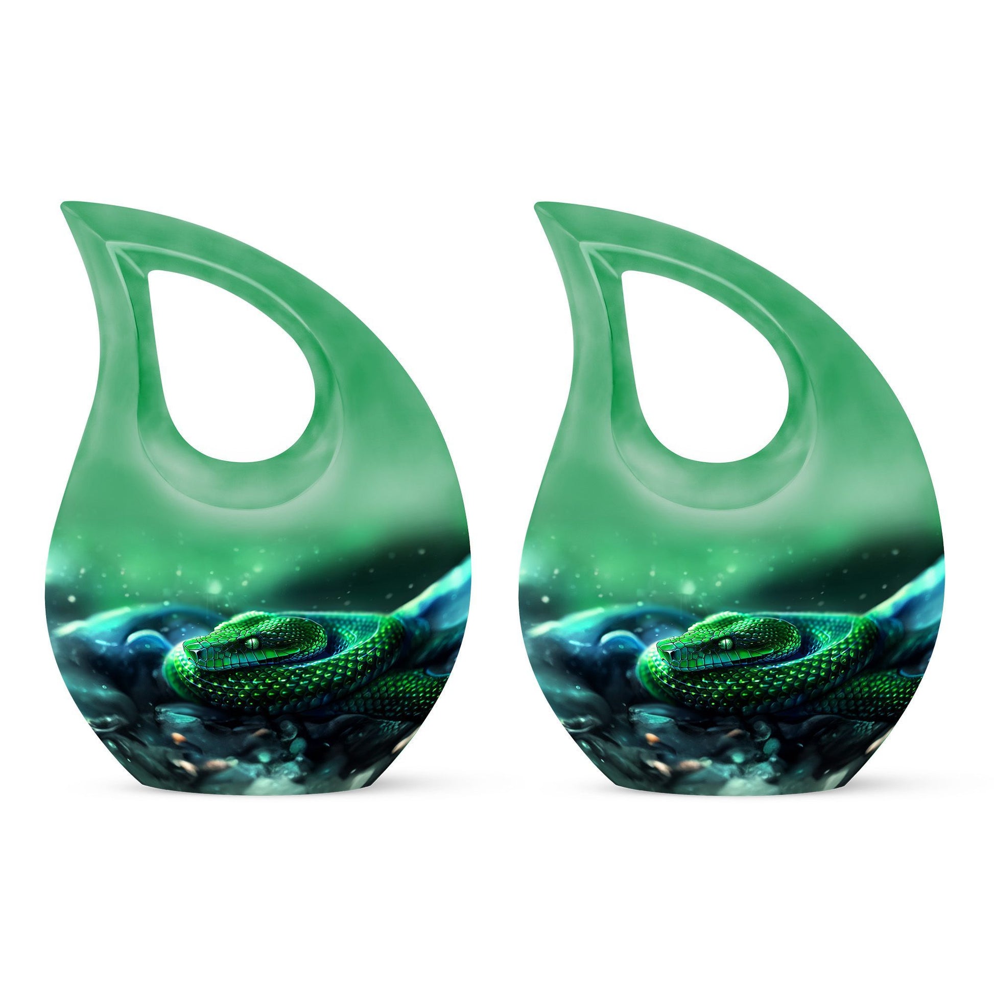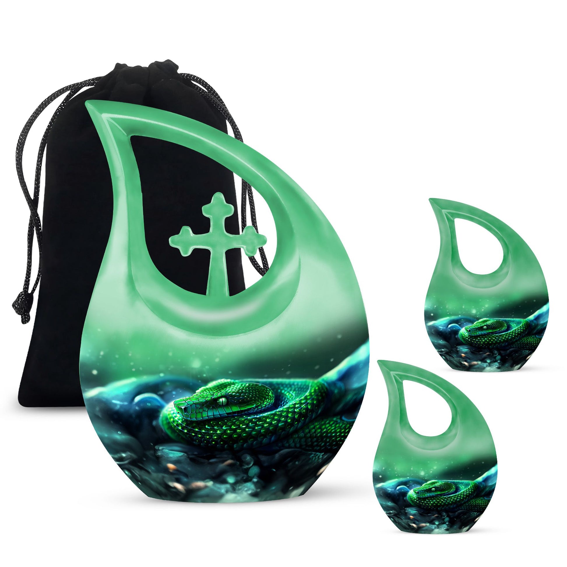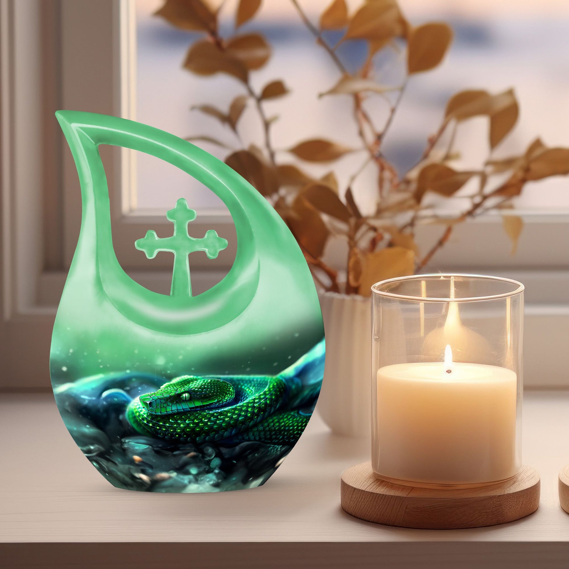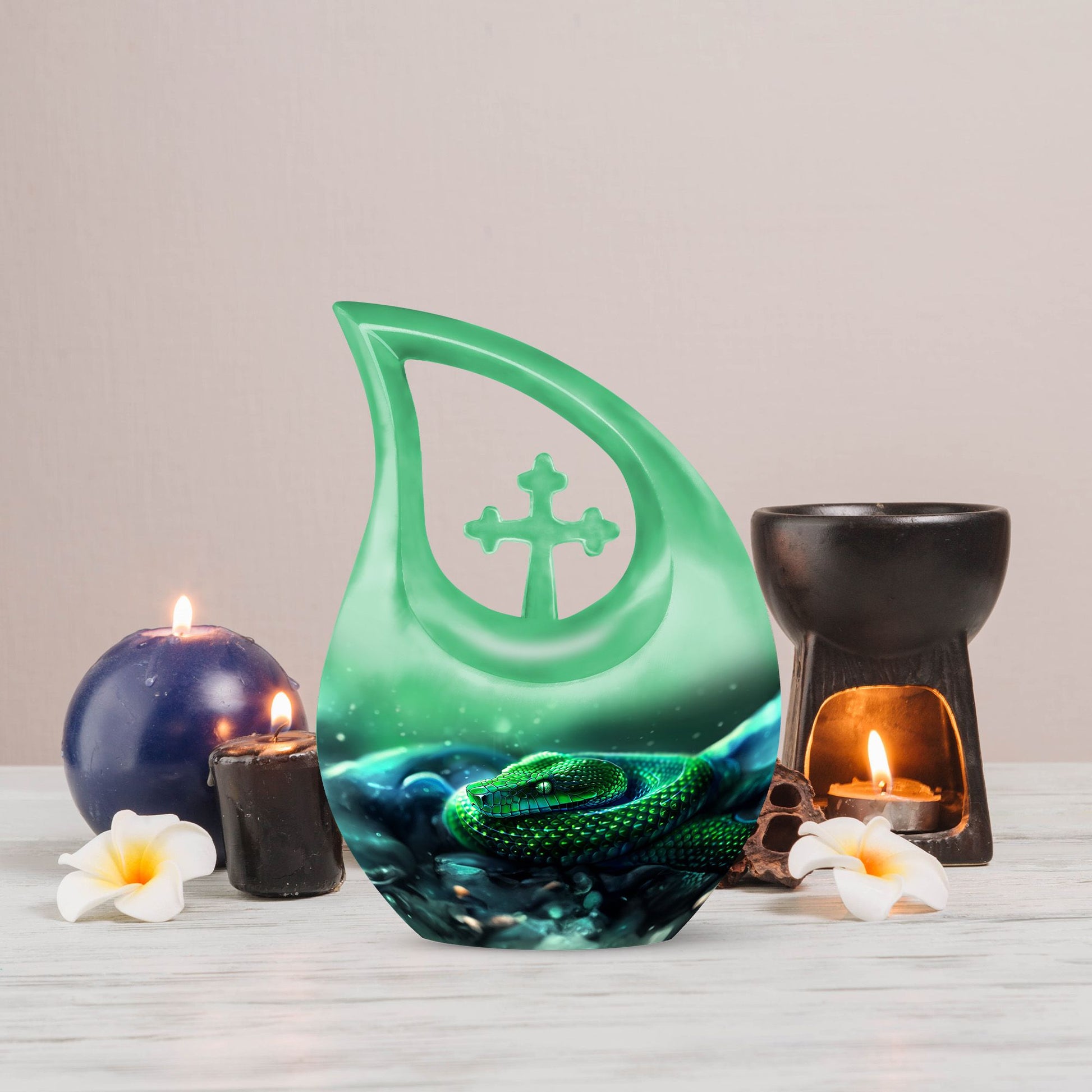 Honor the memory of your loved one with our high-quality Snake Urn. This large 10-inch urn is made of enduring aluminium and weighs a sturdy 3.3 pounds, ensuring it remains a lasting tribute. It uniquely combines the 'Cross Drop' and 'Snake' themes, creating a modern yet respectful remembrance item that stands out from typical memorial urns. The urn has a significant capacity of 200 cubic inches, accommodating a substantial amount of ashes. Included with your purchase is a plush velvet pouch, providing a dignified containment for the remains. Furthermore, our Custom Mom Urn offers personalization options, allowing you to engrave names and keep memories alive. This feature makes the item an ideal choice for those seeking memorial items such as Remembrance Urns For Ashes, Urns for Angels, or modern urns for ashes. Let artifacts honor your loved one.
