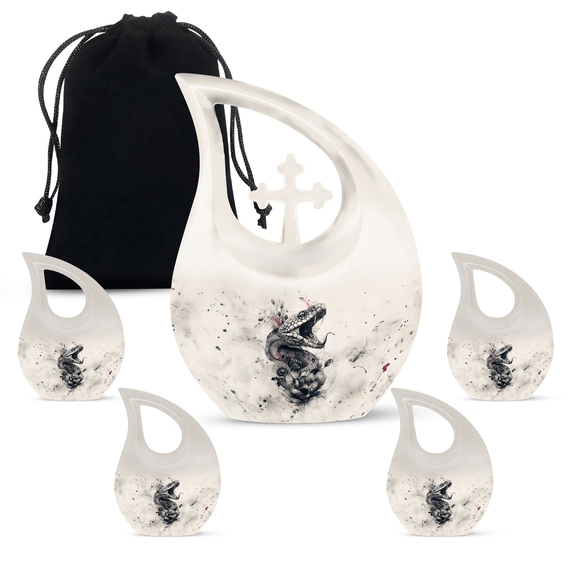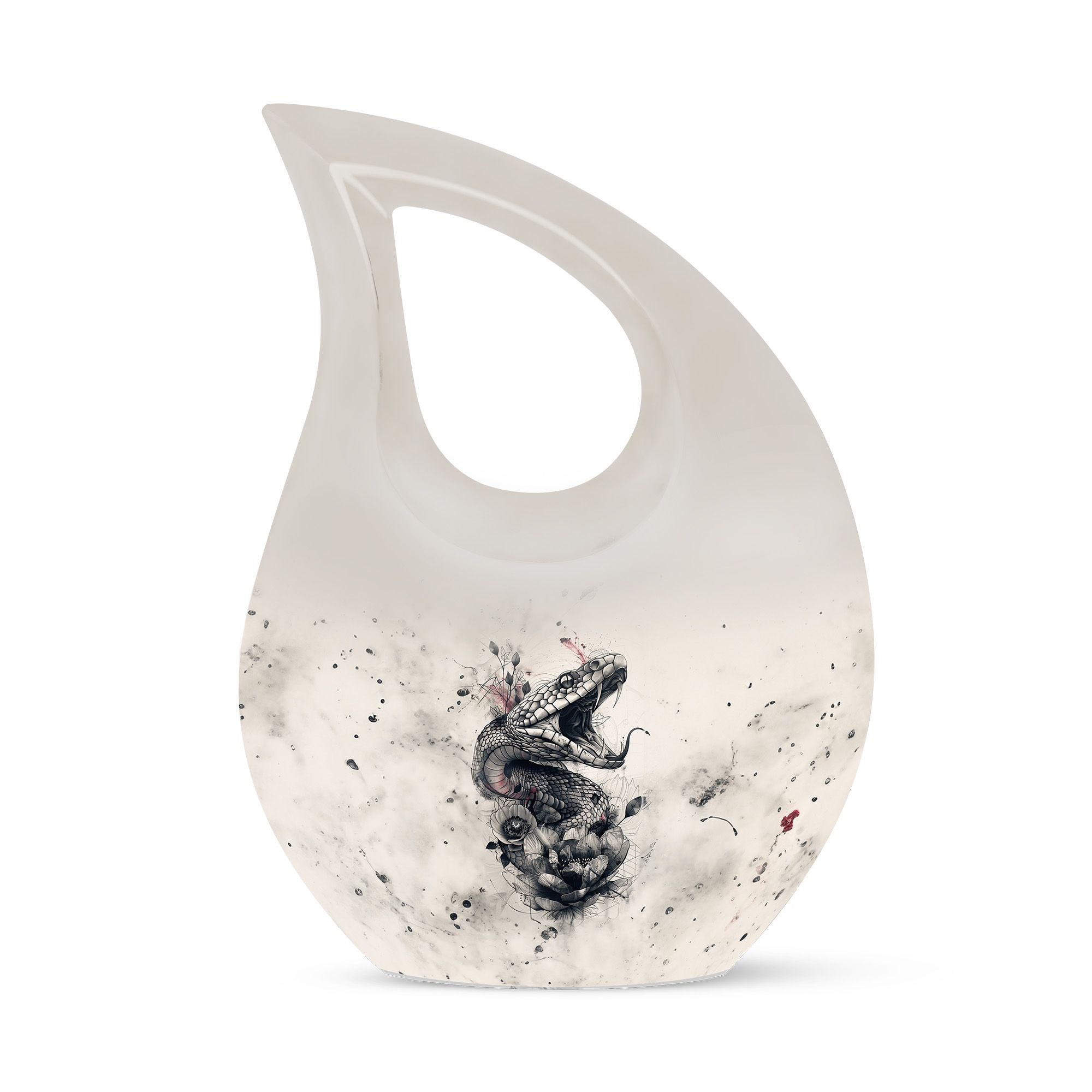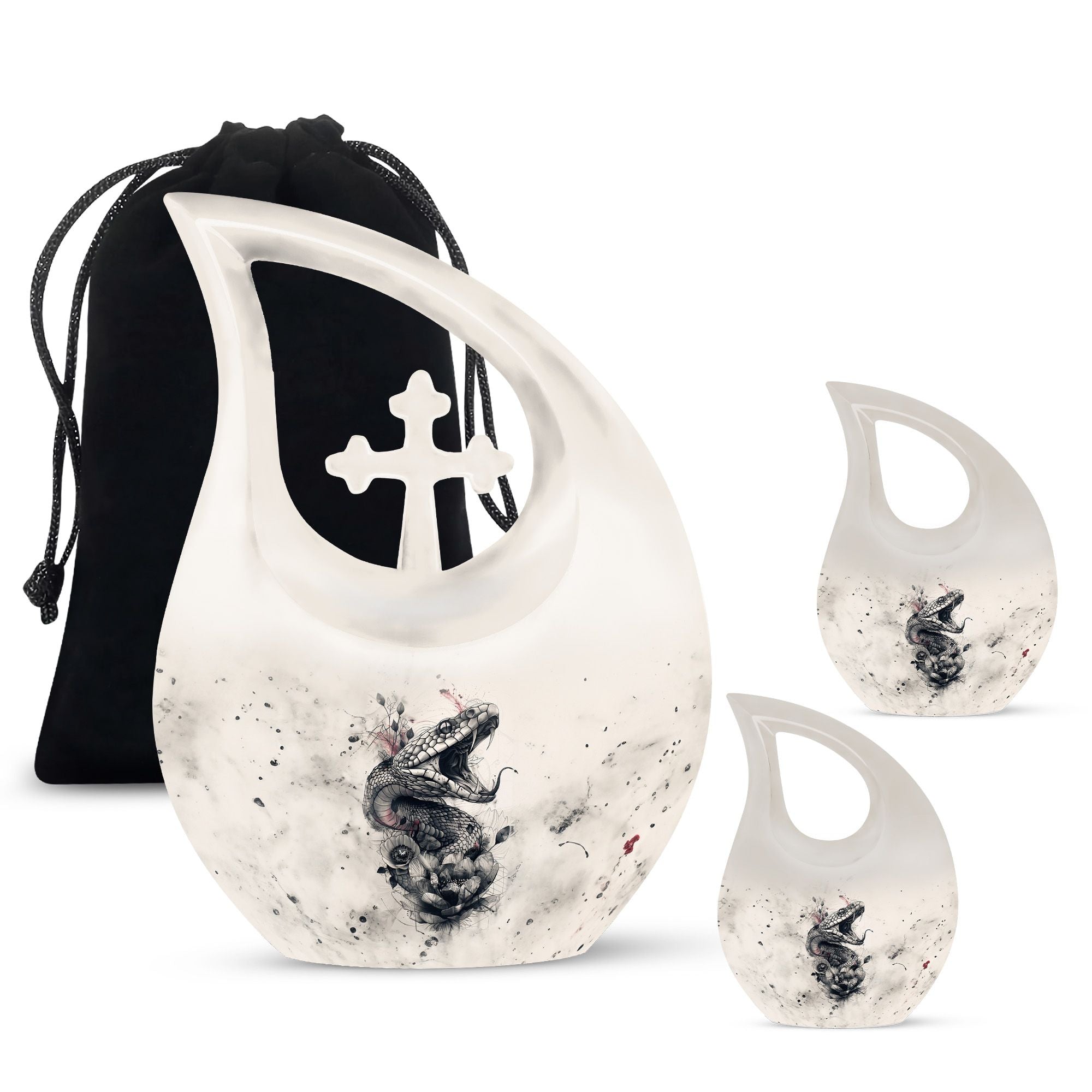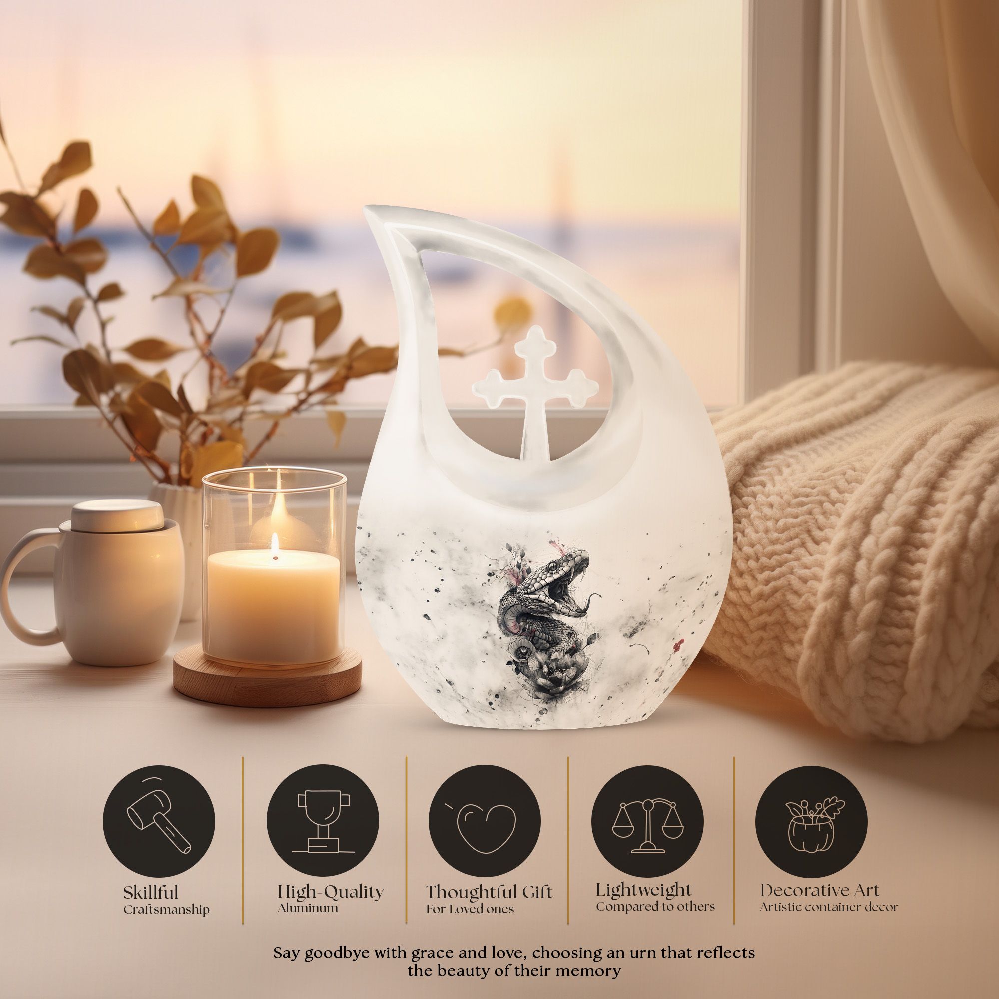 Immerse yourself in memories and honour those you hold dear with our 10-inch Snake Urn, a substantial yet soothing adornment for your commemoration or reflection space. With an intricate Cross Drop motif, this large urn delivers an emotional depth as profound as its 200 cubic inch capacity. Carefully crafted from durable Aluminium, it weighs a comforting 3.3 pounds, embodying gravitas and longevity. Each urn arrives with a soft velvet pouch, lending an added layer of protection and reverence when it comes to containment of ashes. As a unique touch, we offer the option of personalizing your urn with engraved names; turning a remembrance into a distinct memento. An integral part of Memorial Ceremony Supplies, these custom urns are ideal for adults and seniors, rekindling precious moments with every glance. Dive into a sacred journey of remembrance with our snake urn, a symbol of healing, rebirth and eternal love. Forget the ordinary, embrace the extraordinary.