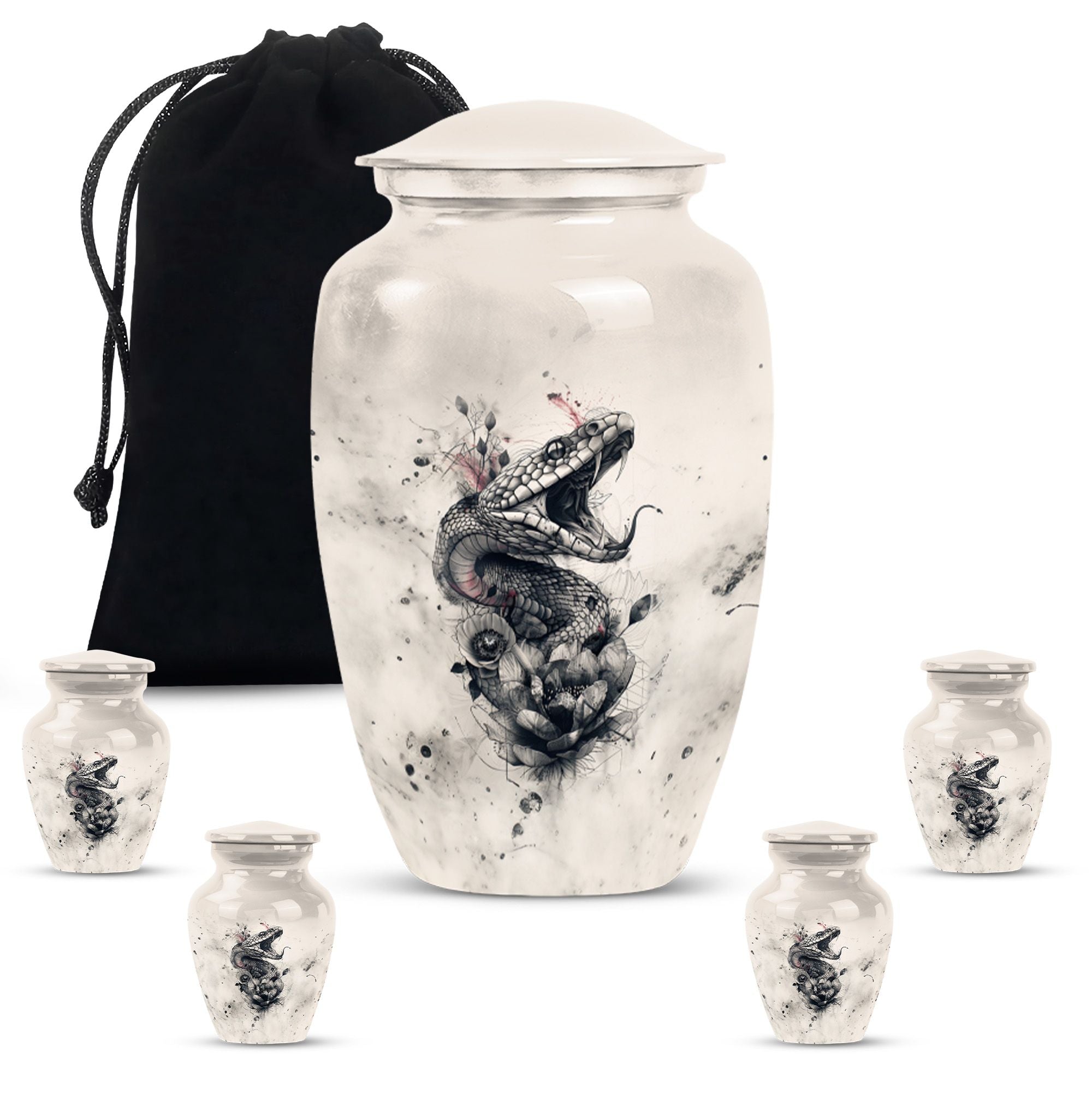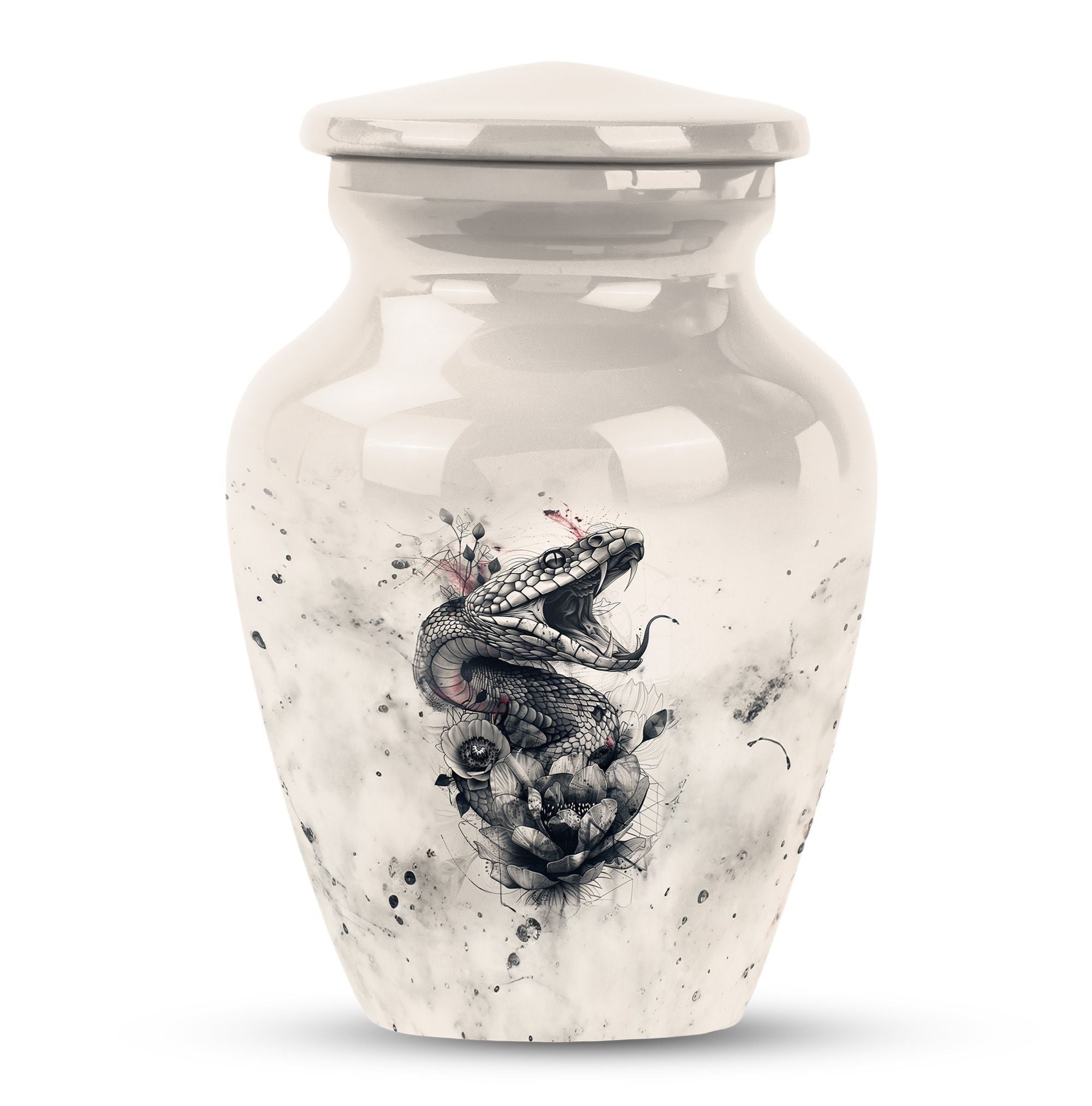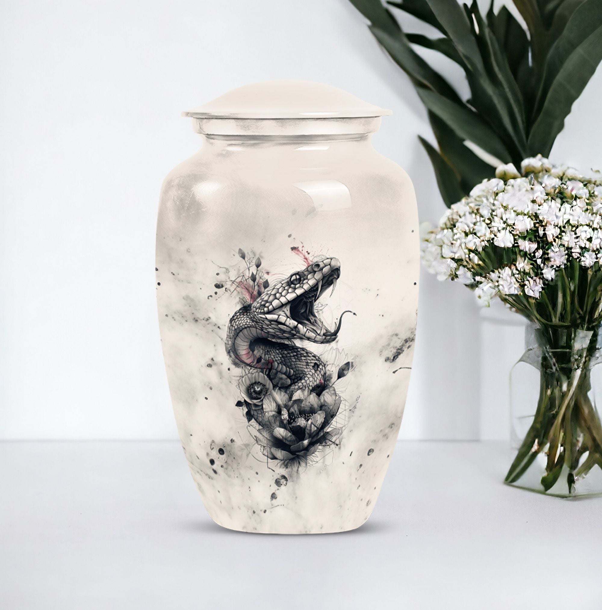 The 'snake urn' elegantly combines style and functionality to honor your dearly departed. This 10-inch cremation urn, handcrafted from durable aluminium, brings soothing abstract expressions to your thoughts to ease your heartbreak. Weighing only 3.3 pounds, it offers an impressive capacity of 200 cubic inches, ideal for providing the rightful resting place for adult ashes. The package includes a velvet pouch to secure the ashes discreetly. Beyond being a 'funeral urn for ashes adult,' this 'large urn' comfortably grazes the sophisticated tastes of 'urn ash men.' With options to 'Personalize with engraved names,' you can bring an intimate touch to your memorial. This 'funeral urn for adult male dad' is a beautiful tribute balancing the heavy emotions and tender memories perfectly. High in strength and lustrous in appearance, this metal urn adds a touch of timeless charm to your memorial space.