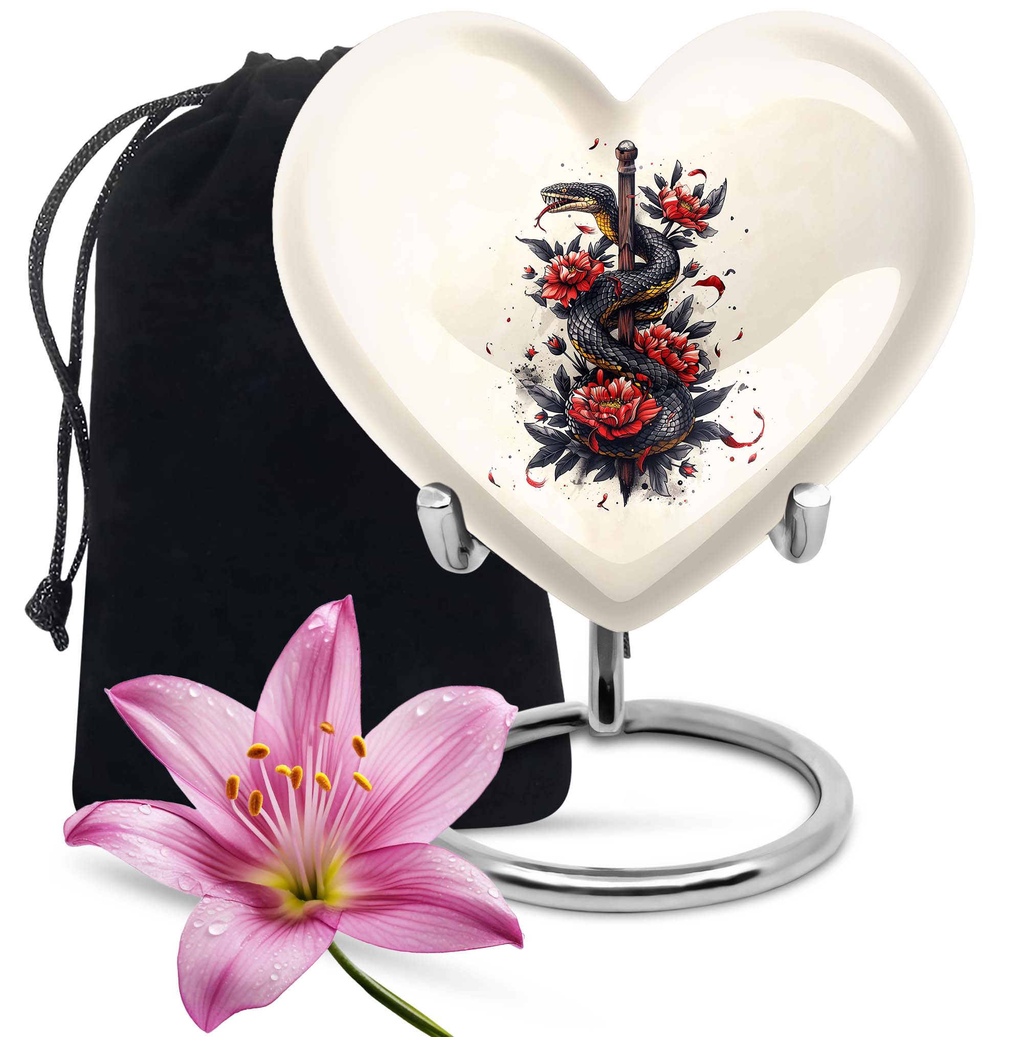 Cherish the memories of a loved one with this unique and abstract large sized cremation urn. Standing 10 inches tall and weighing a substantial 3.3 pounds, our 'snake urn' blends tasteful design with user-friendly functionality. Manufactured from enduring aluminum, this memorial funeral urn possesses a substantial capacity of 200 cubic inches, ample space to safeguard the ashes of your beloved mother or father. Personal touches can be added by engraving names for a more intimate memorial experience. This urn for cremation ashes arrives with a complementary velvet pouch, offering additional containment for the ashes while enhancing the urn's overall aesthetic. Thoughtful keywords such as 'funeral unique urns for human ashes', 'human ash', and 'decorative urns' are introduced with a strategy for driving SEO, making it easier for adults and seniors to connect with products that resonate with their needs and expectations. Beyond design, the abstract theme brings an added layer of uniqueness to the urn, eliciting a sense of contemplation and individuality. Ideal for memorial ceremonies, this urn stands as a distinguished yet gentle reminder of those we hold dear. This indeed is a heartwarming and respectful tribute to commemorate the life of a loved one.