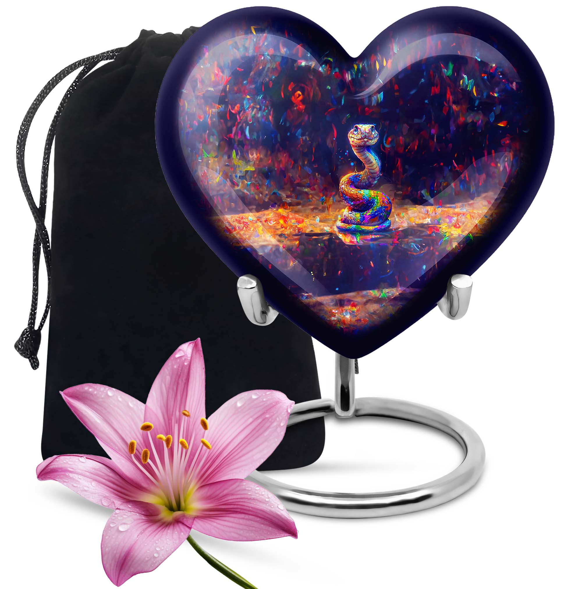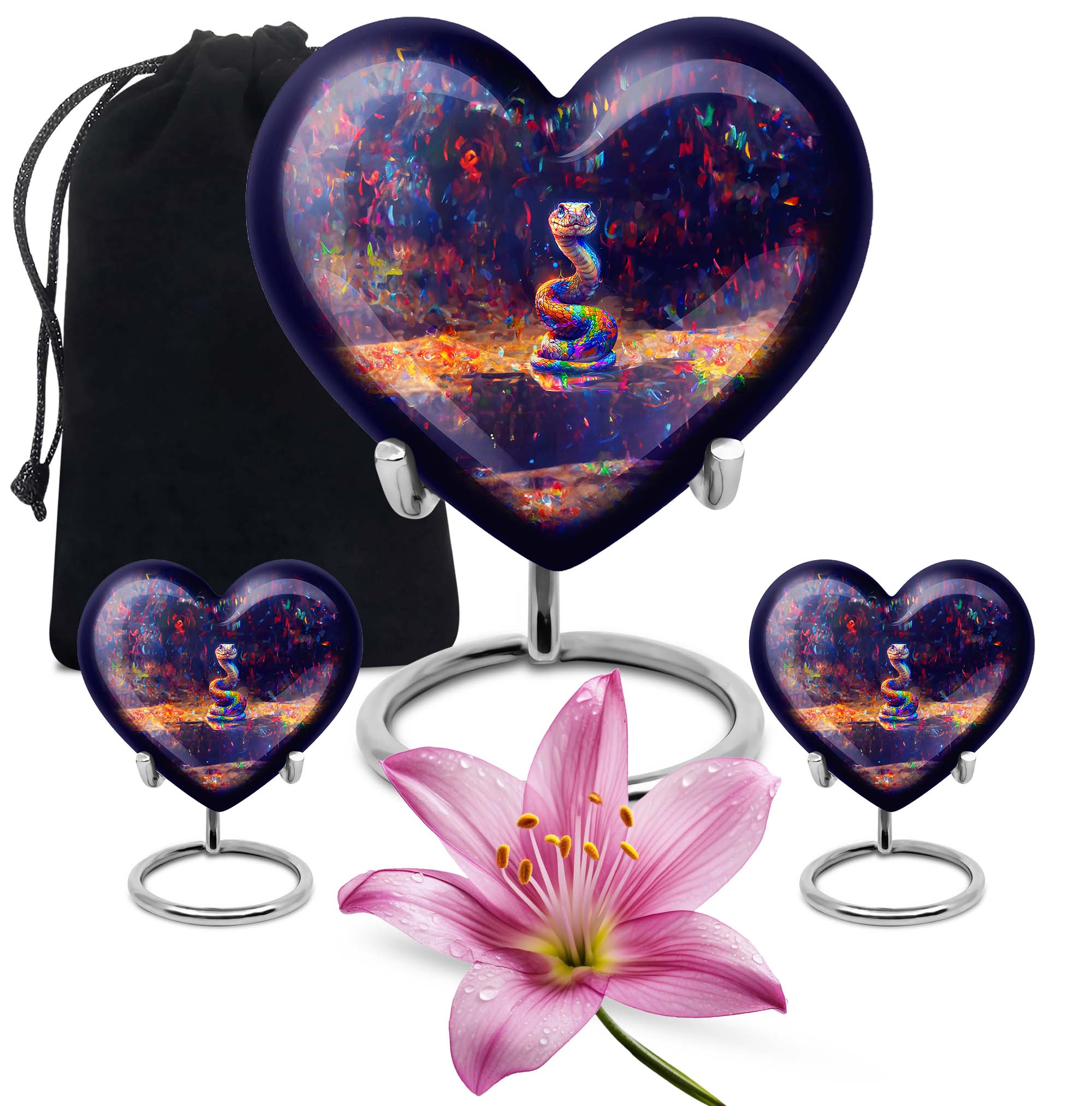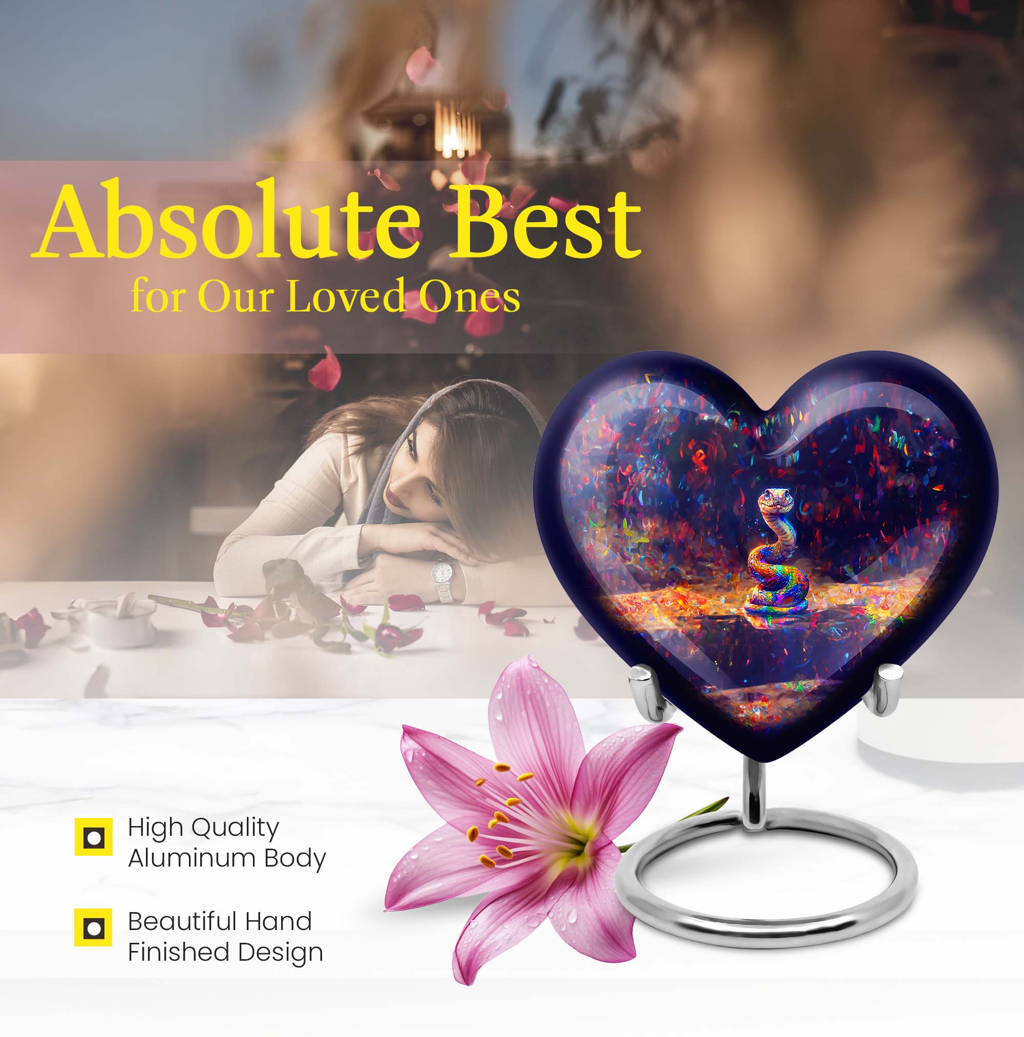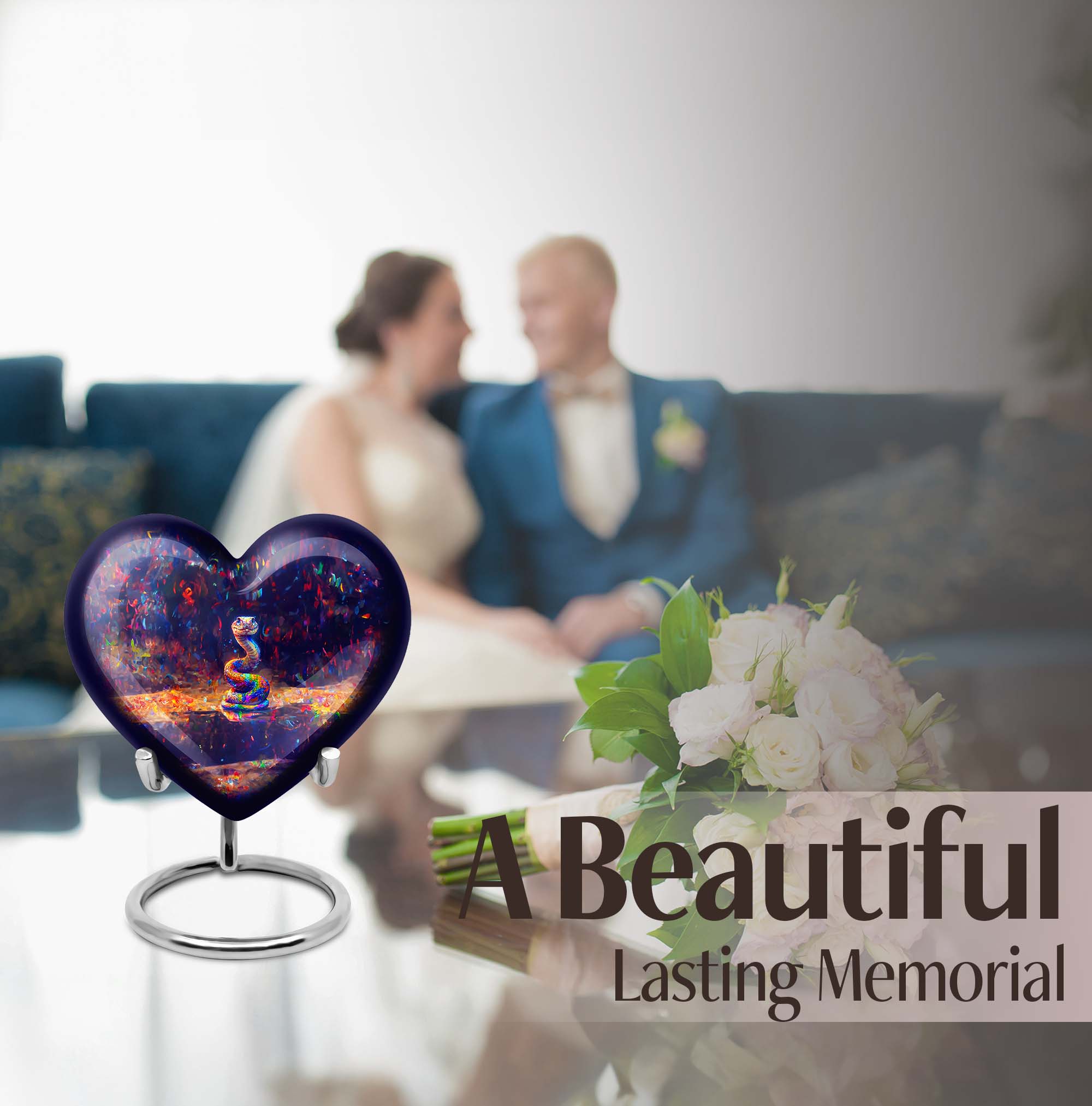Crafted with utmost thoughtfulness and respect for your loved one, this 10-Inch Heart Urn offers a dignified and comforting final resting place. Made of premium aluminium, our urn assures longevity and durability keeping your cherished memories intact. The abstract theme of the urn deeply resonates with the intricate maze of life and afterlife. This large urn with a capacity of 200 cubic inches, can securely hold the human ashes weighing up to 3.3 pounds. Encased in a velvet pouch that comes with this memorial urn, it ensures safe containment of ashes. Customization option is available to engrave names, making it truly unique. Emphasizing the keywords - 'snake urn', 'funeral unique urns for human ashes', 'memorial medium urns for ashes', 'cremation urn burial', 'funeral cremation urn', this urn can be easily found during your search for suitable memorial urns. Perfect in size and design, it is a beautiful way to remember and honour your loved one.