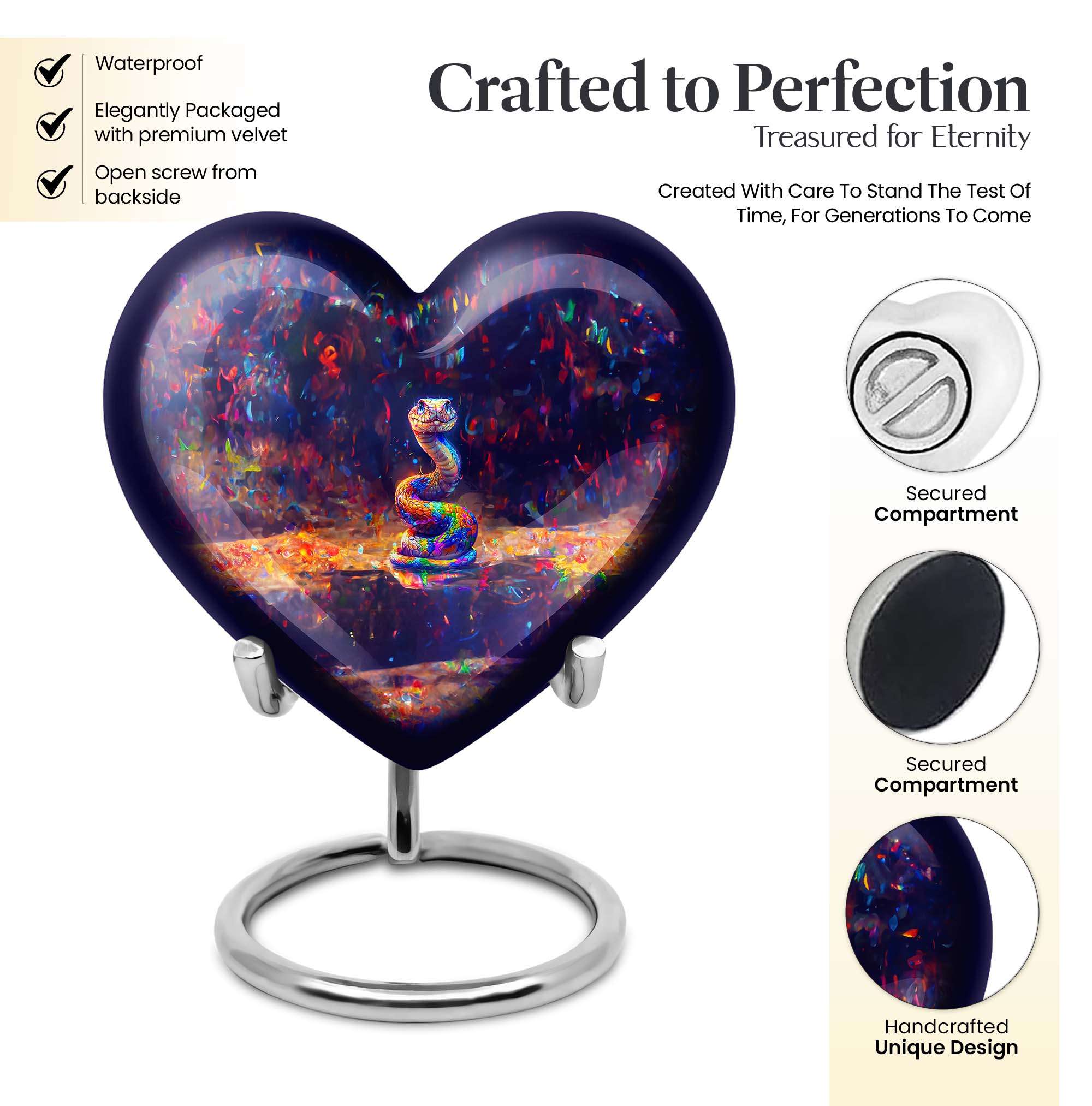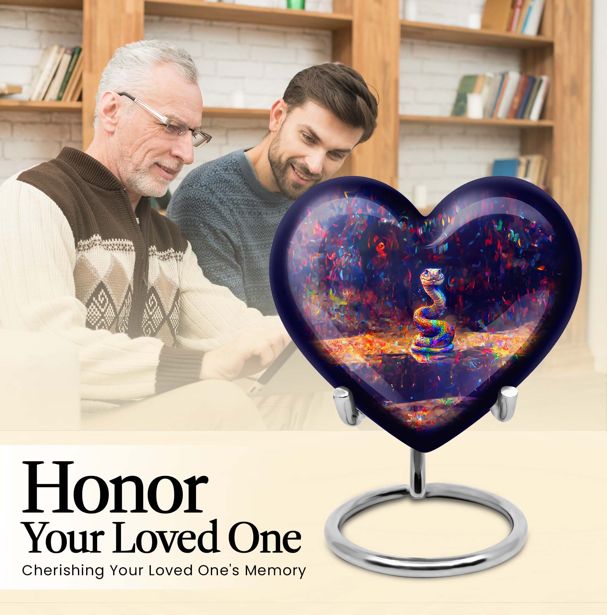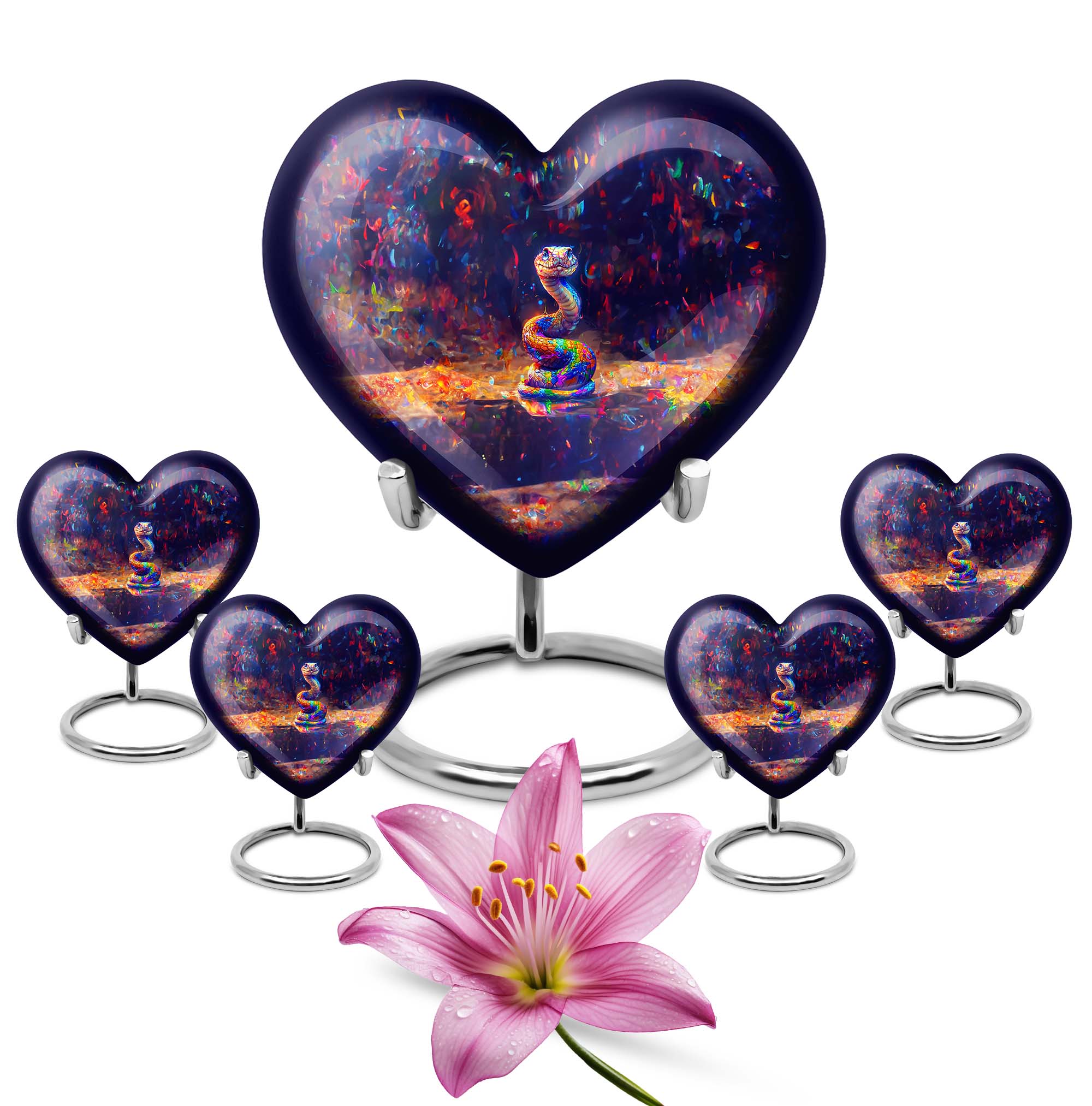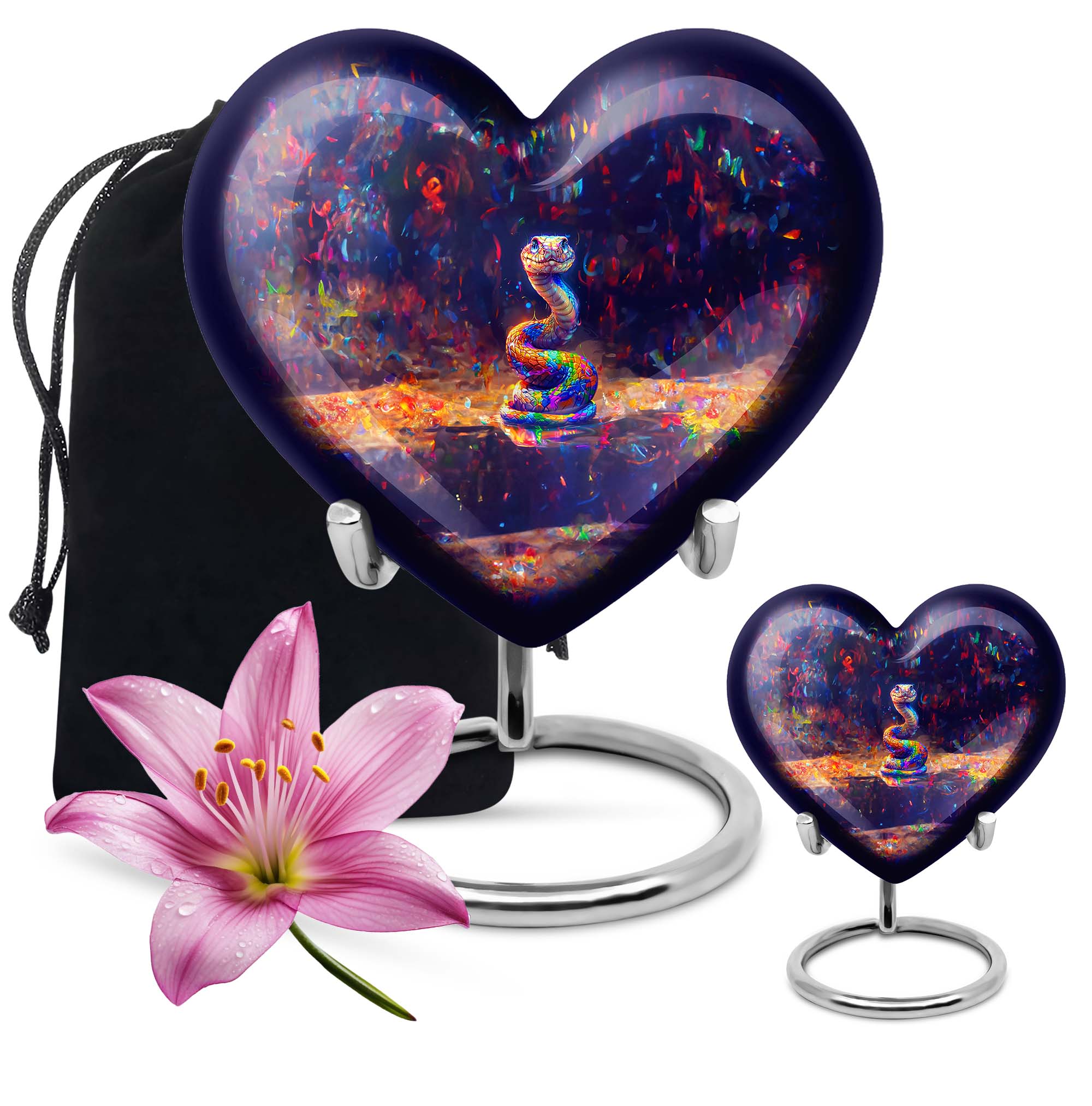 Crafted with utmost thoughtfulness and respect for your loved one, this 10-Inch Heart Urn offers a dignified and comforting final resting place. Made of premium aluminium, our urn assures longevity and durability keeping your cherished memories intact. The abstract theme of the urn deeply resonates with the intricate maze of life and afterlife. This large urn with a capacity of 200 cubic inches, can securely hold the human ashes weighing up to 3.3 pounds. Encased in a velvet pouch that comes with this memorial urn, it ensures safe containment of ashes. Customization option is available to engrave names, making it truly unique. Emphasizing the keywords - 'snake urn', 'funeral unique urns for human ashes', 'memorial medium urns for ashes', 'cremation urn burial', 'funeral cremation urn', this urn can be easily found during your search for suitable memorial urns. Perfect in size and design, it is a beautiful way to remember and honour your loved one.