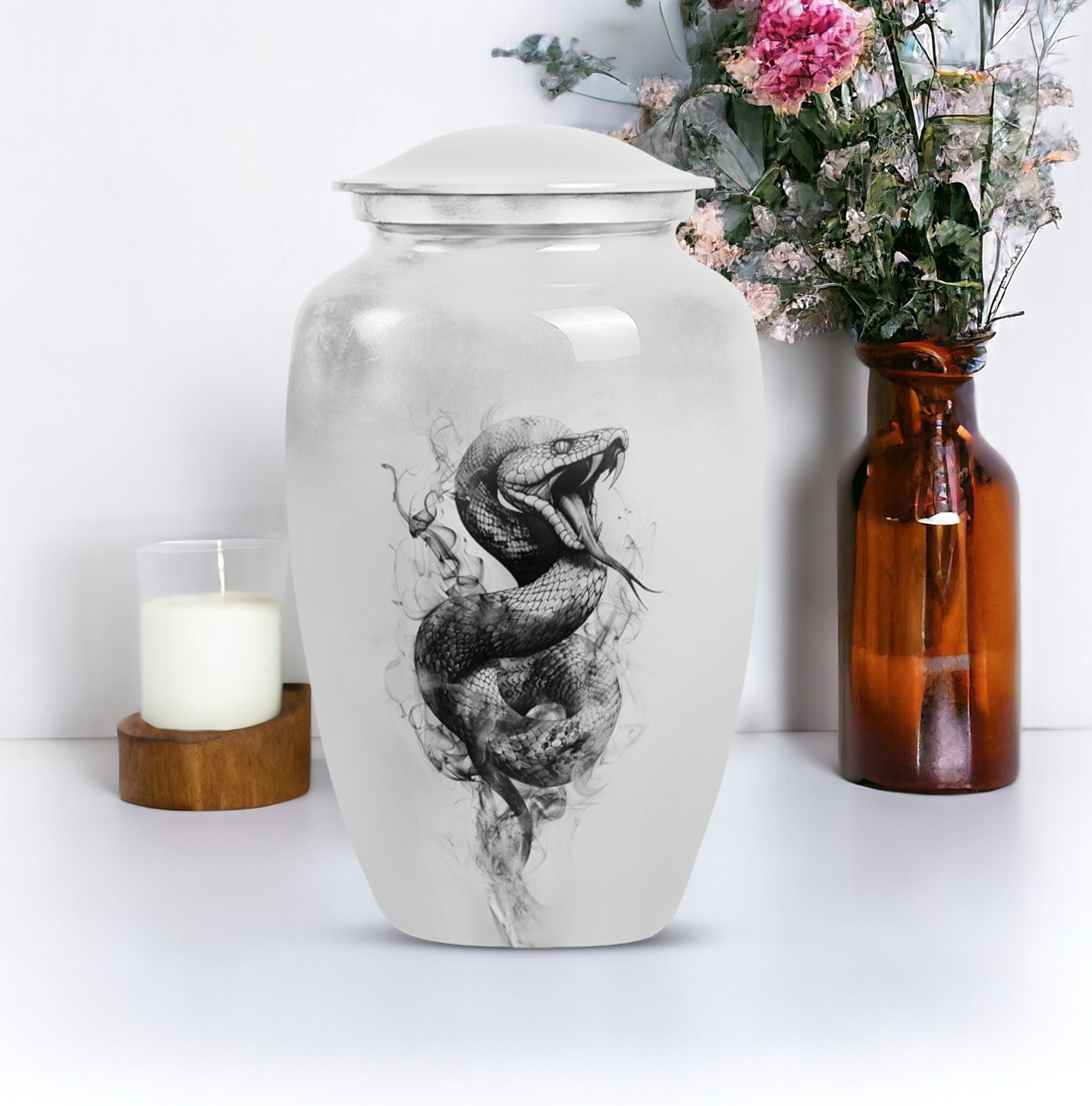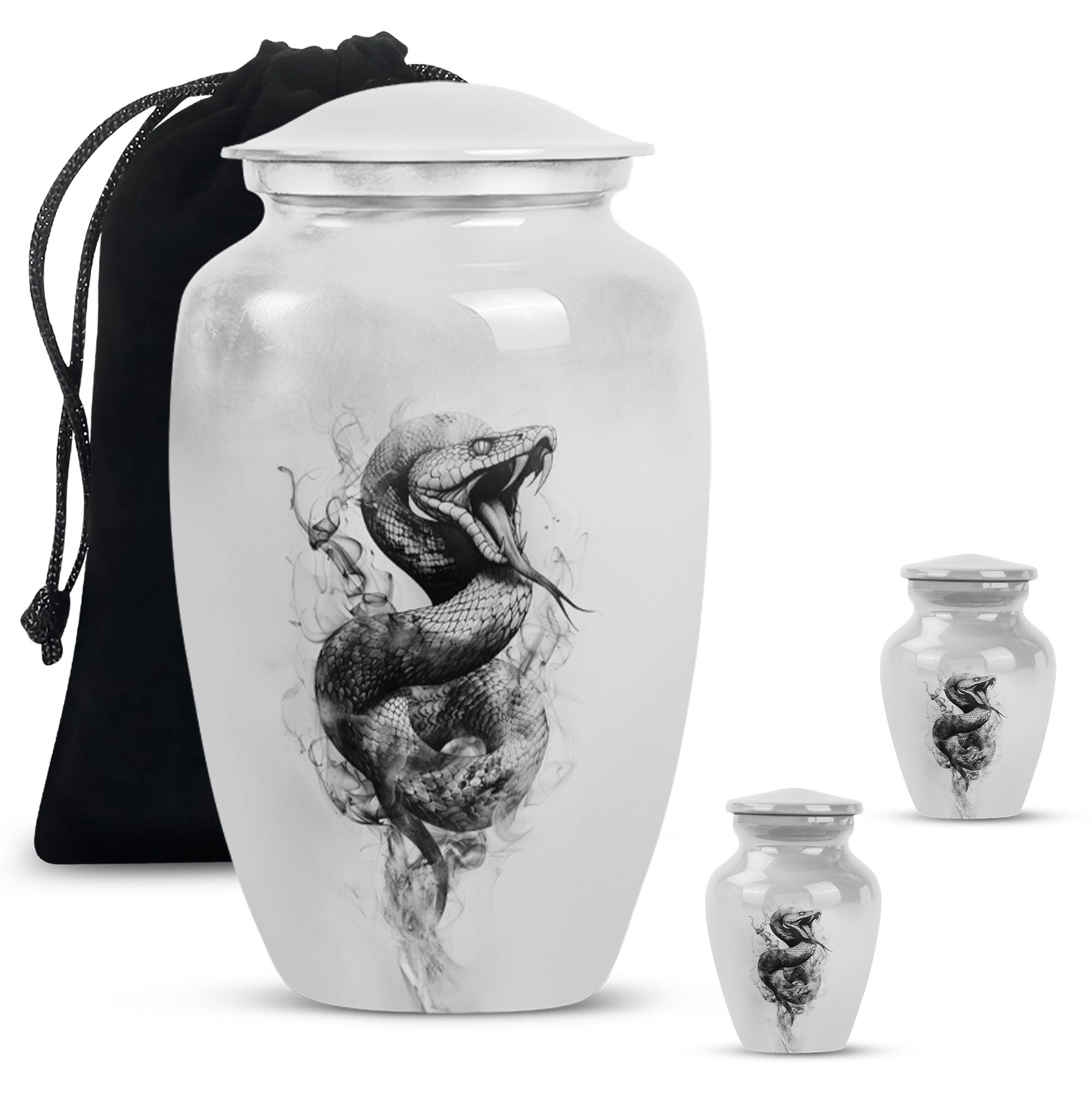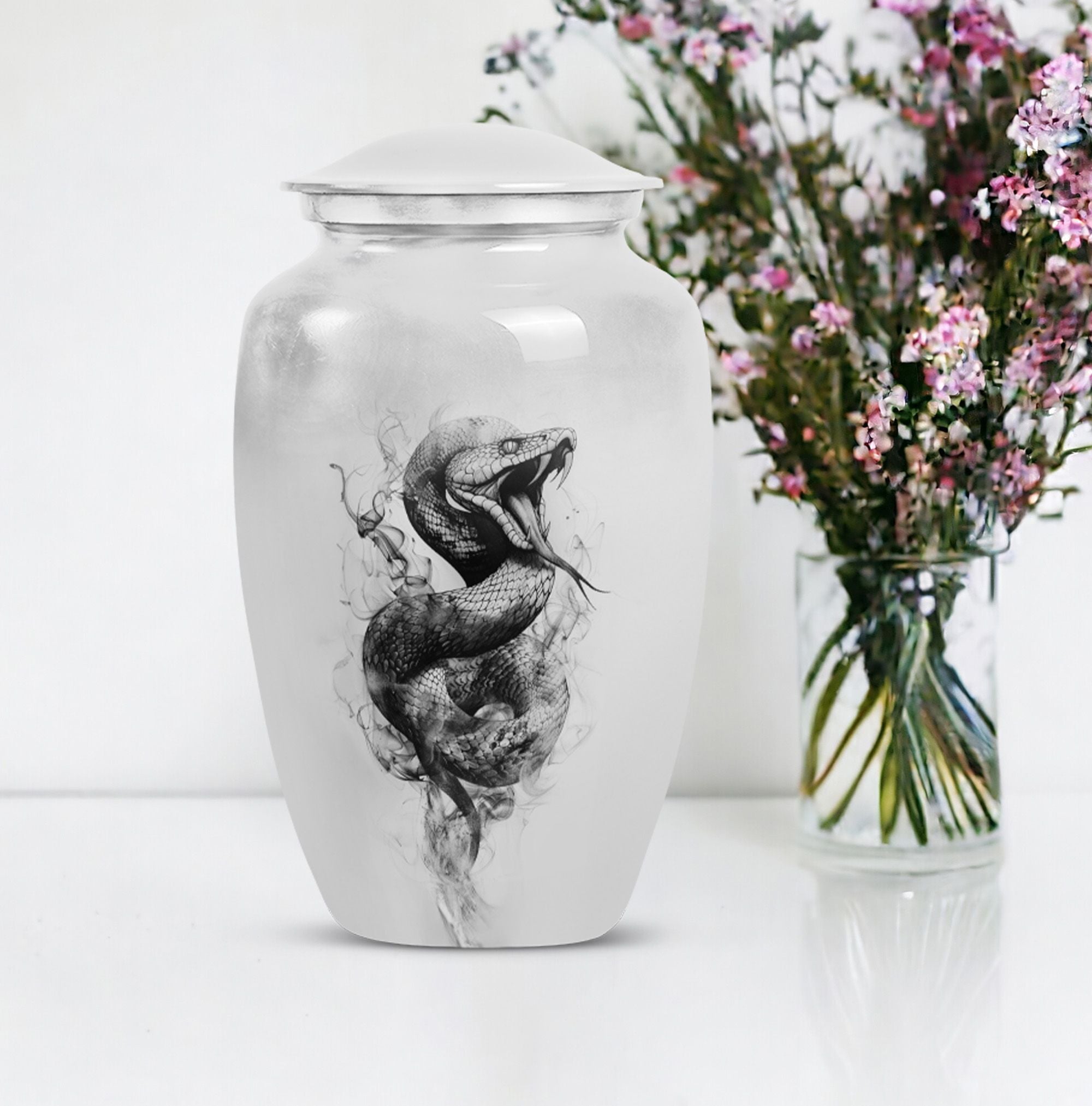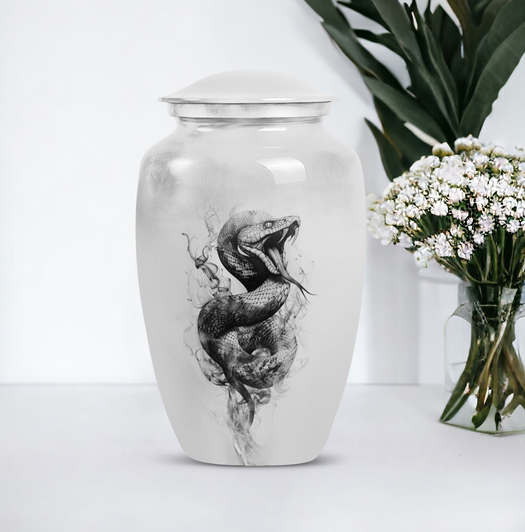 Unveiling an elegant, timeless Large Urn, tailored for those in search of distinct funeral gifts or cremation memorials. This 'Snake Urn' stands tall at 10 inches, with a weight of 3.3 pounds, and a considerable capacity of 200 cubic inches making it a suitable cremation large urn for ashes. Expertly crafted from high-quality aluminum, it bears an abstract theme that radiates a serene, respectful ambiance. Also, unlike cremation medium urns, this cremation urn is highly sizable allowing it to comfortably hold human ashes. Plus, it comes with a velvet pouch for convenient and respectful containment of ashes. Even more, you can personalize this metal urn for human ashes with engraved names, adding a unique touch to this already remarkable piece. Add a sense of everlasting love and remembrance to your memorial ceremony with this beautiful and unique, snake urn.