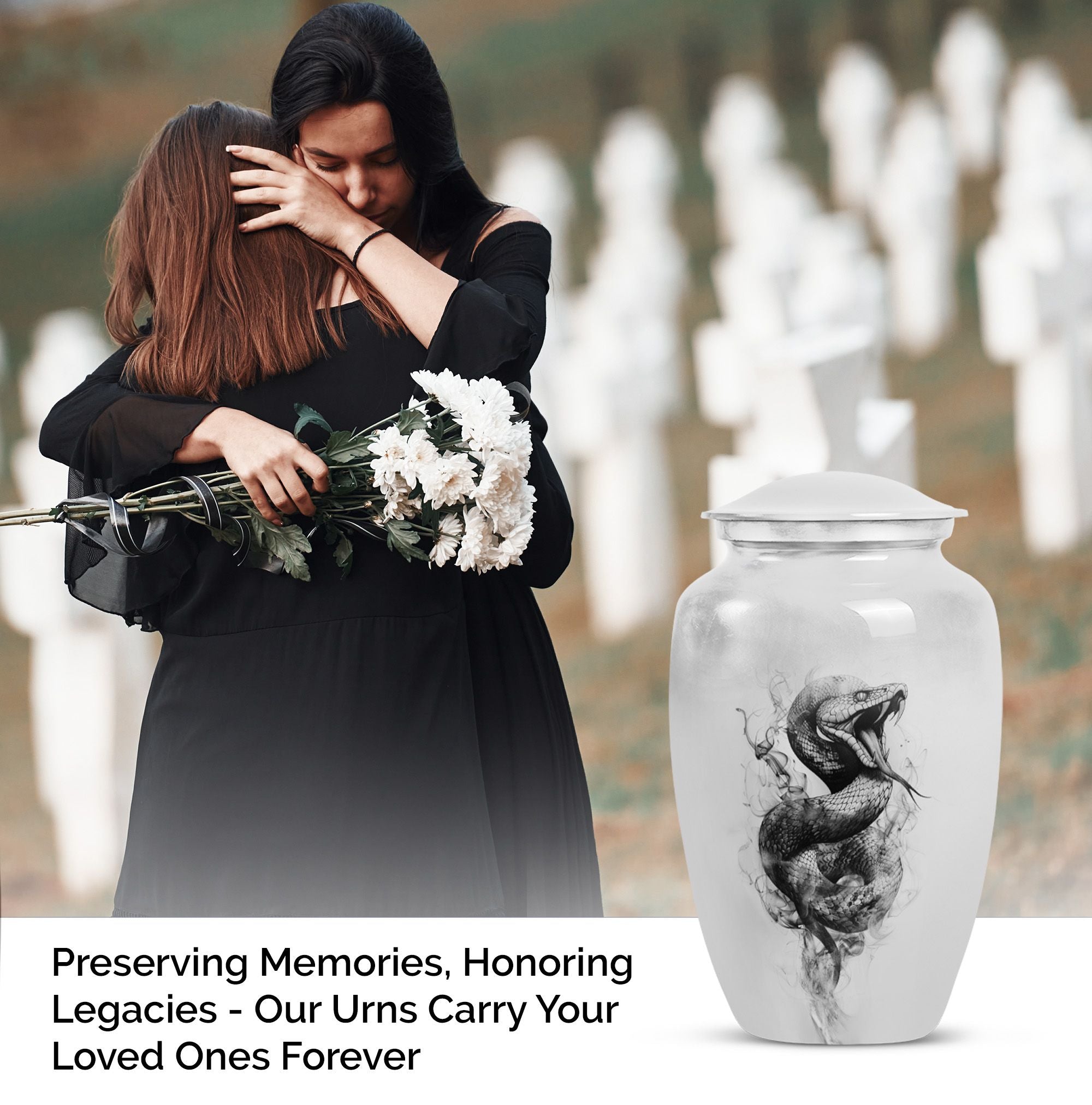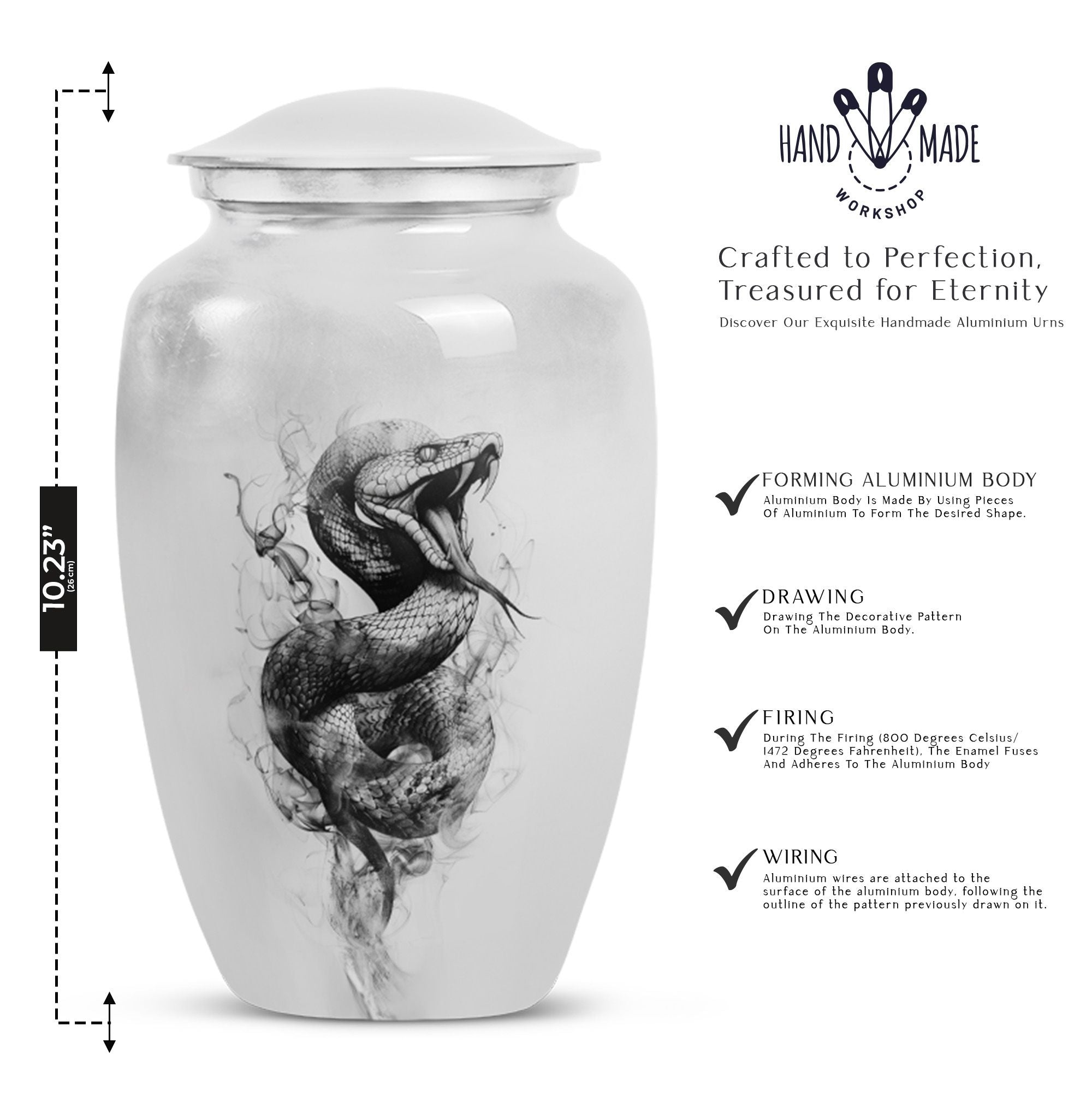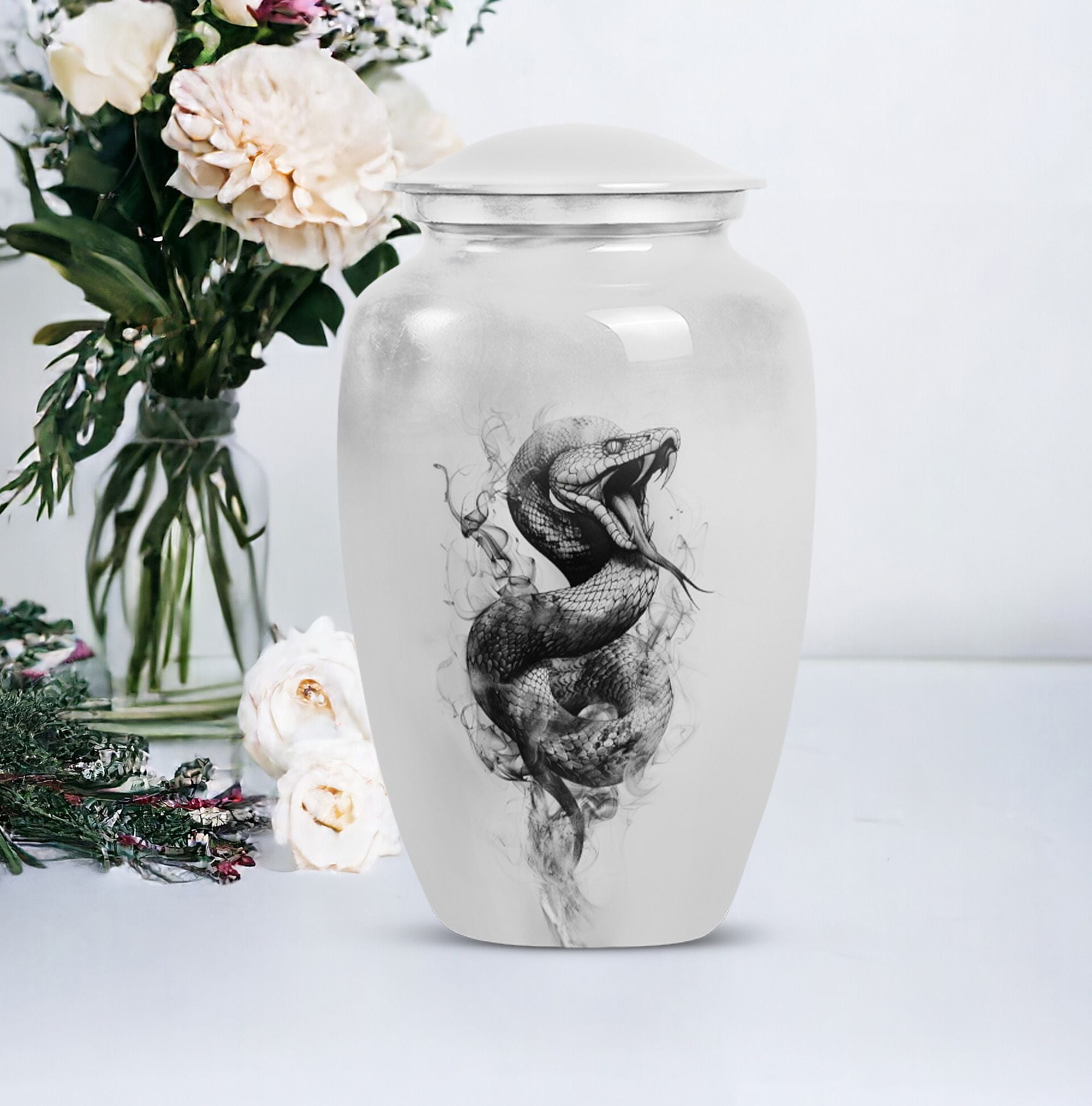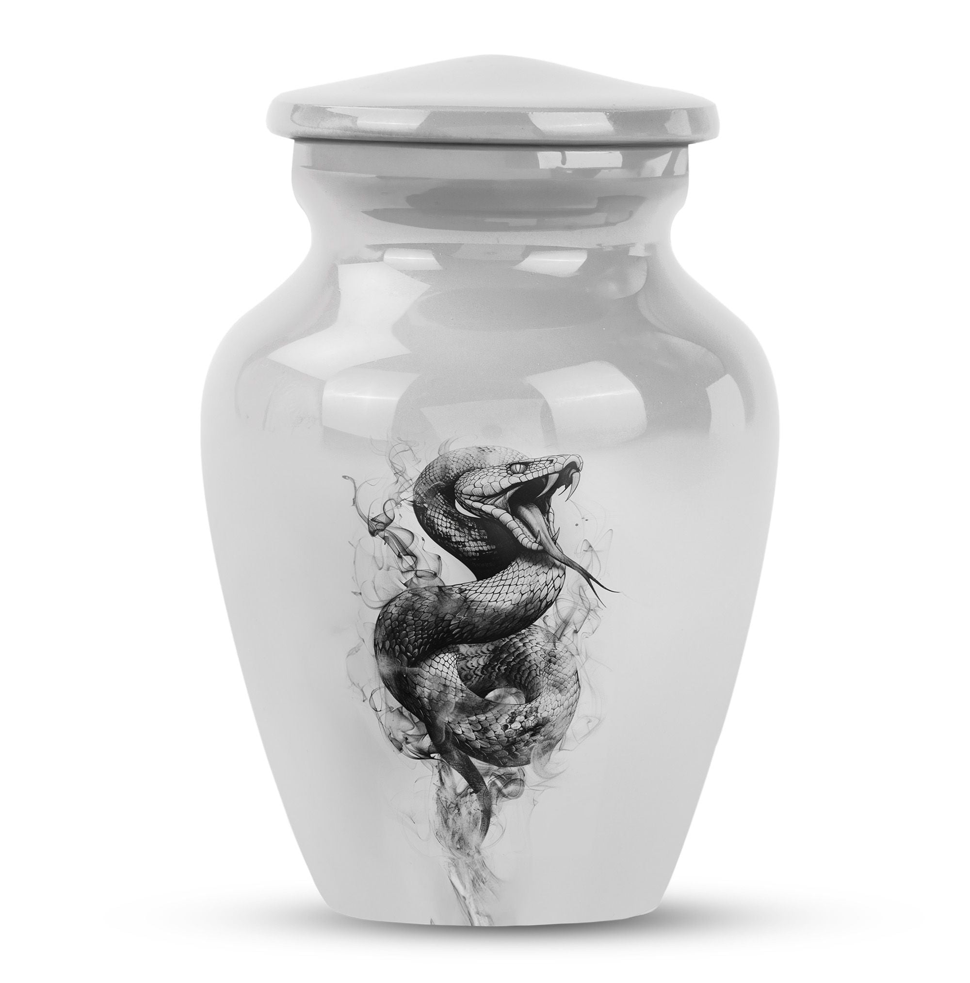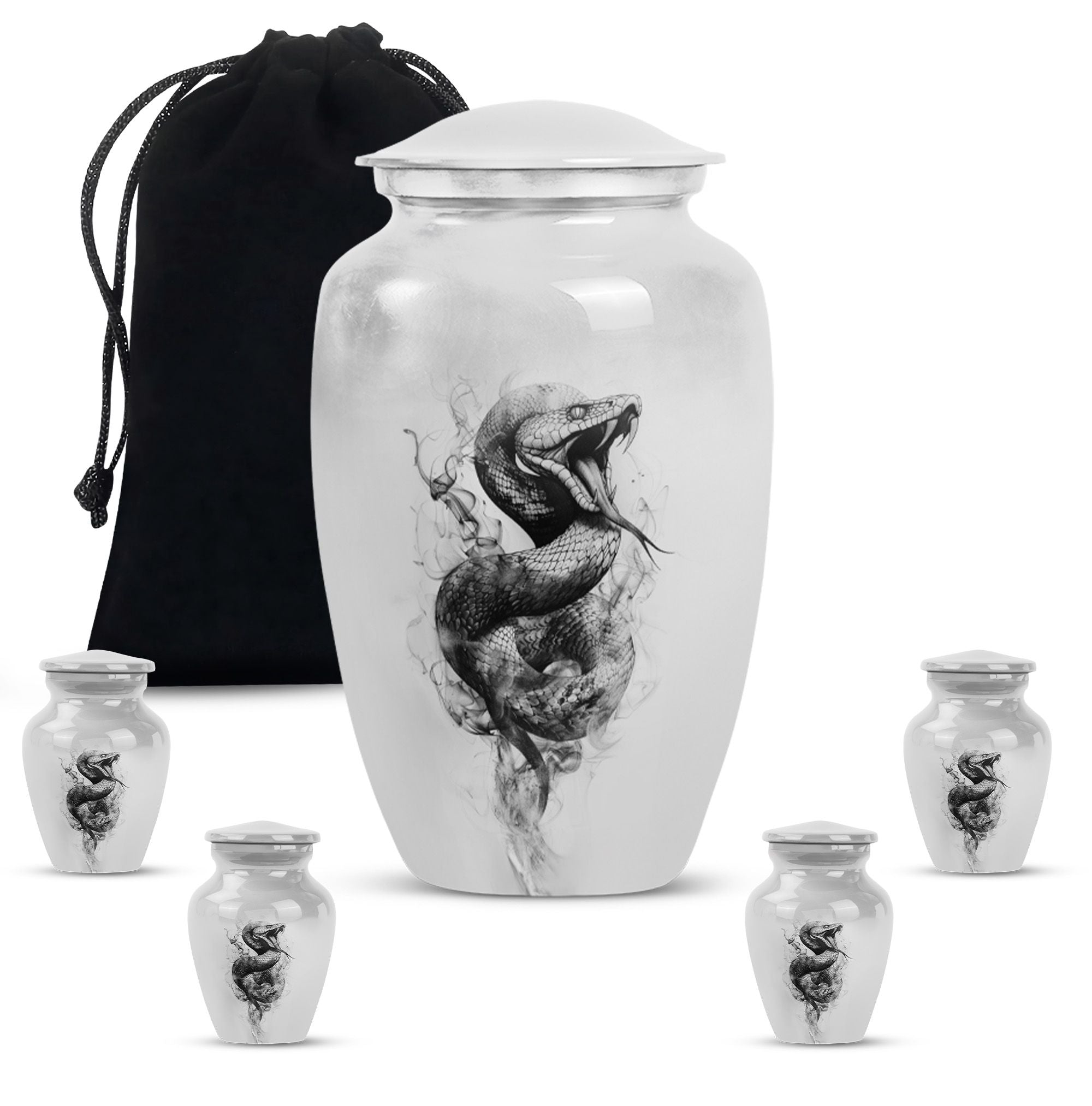Unveiling an elegant, timeless Large Urn, tailored for those in search of distinct funeral gifts or cremation memorials. This 'Snake Urn' stands tall at 10 inches, with a weight of 3.3 pounds, and a considerable capacity of 200 cubic inches making it a suitable cremation large urn for ashes. Expertly crafted from high-quality aluminum, it bears an abstract theme that radiates a serene, respectful ambiance. Also, unlike cremation medium urns, this cremation urn is highly sizable allowing it to comfortably hold human ashes. Plus, it comes with a velvet pouch for convenient and respectful containment of ashes. Even more, you can personalize this metal urn for human ashes with engraved names, adding a unique touch to this already remarkable piece. Add a sense of everlasting love and remembrance to your memorial ceremony with this beautiful and unique, snake urn.