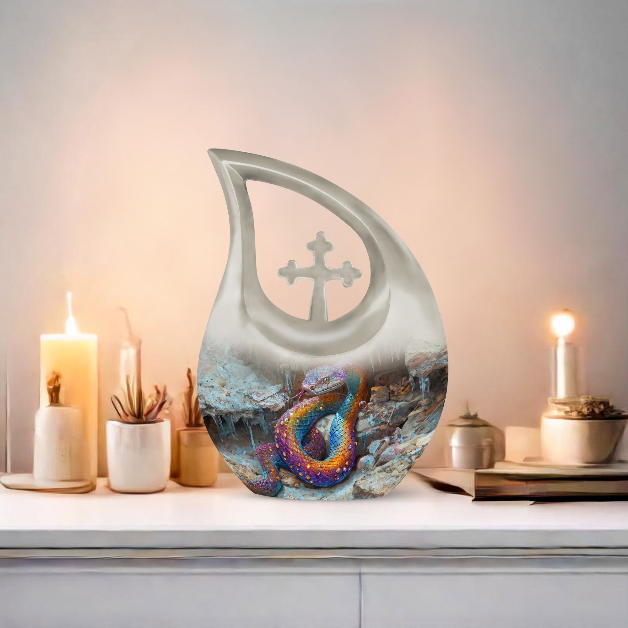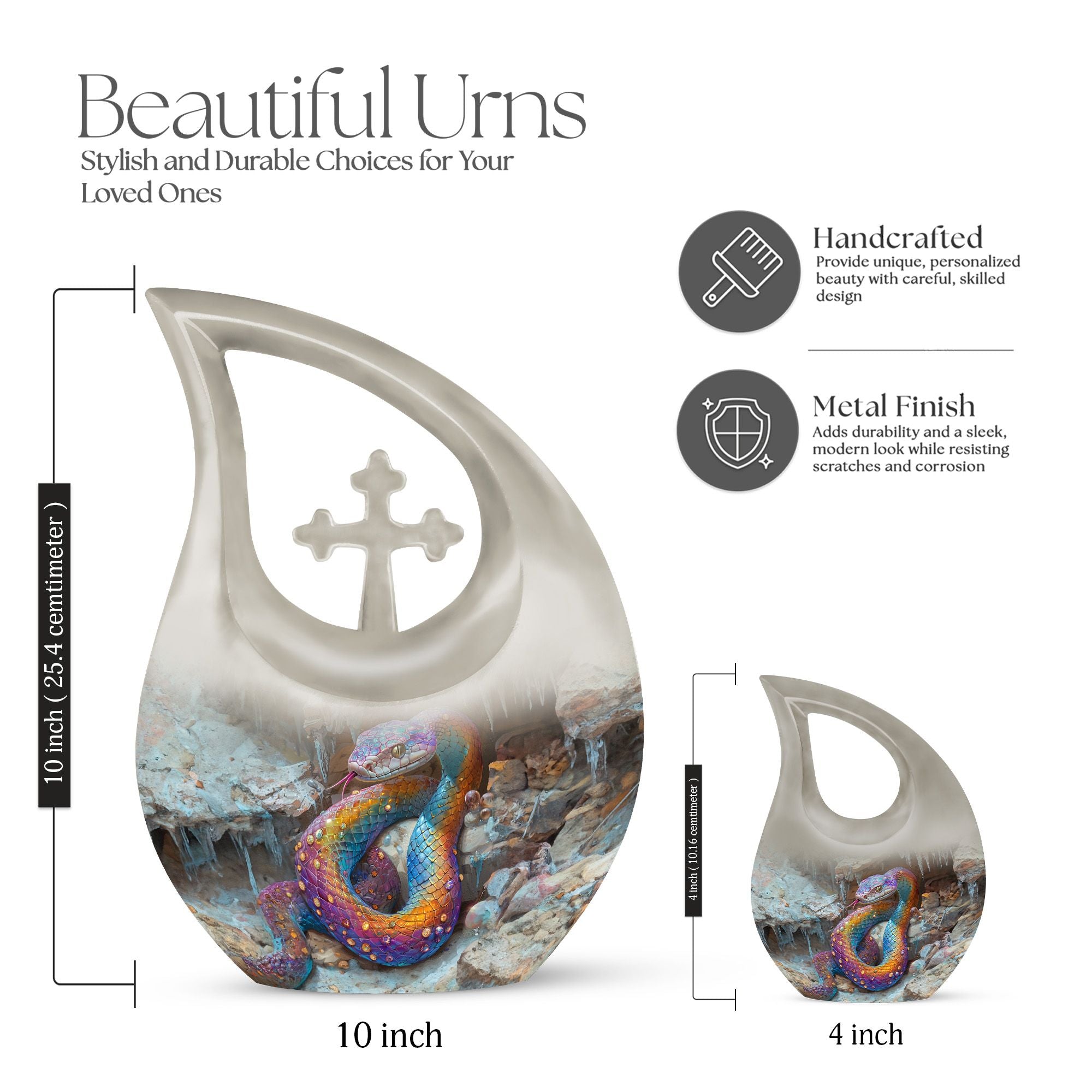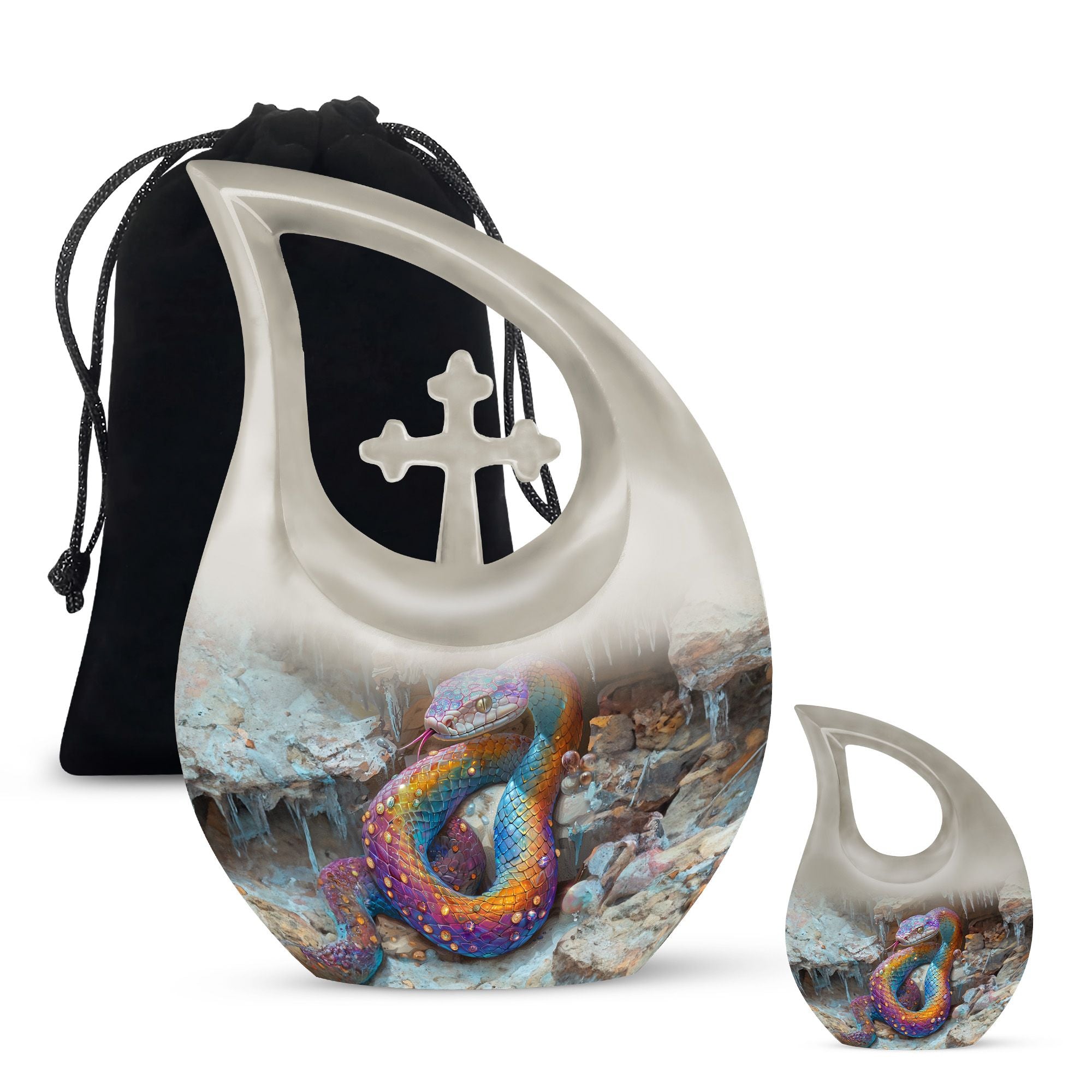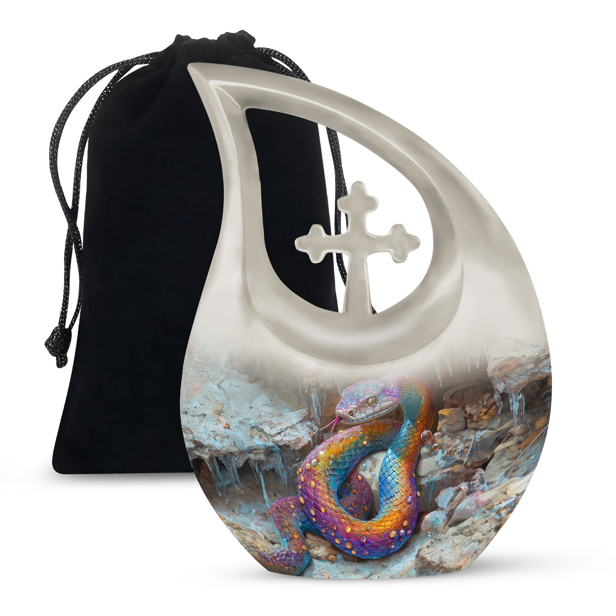 A tribute to the departed deserves to be as unique as their life was. Our Snake Urn series honors this sentiment, offering a distinctive resting place for their cherished ashes. Defined by its Cross Drop design, this sophisticated 10-inch Large Urn is crafted from durable Aluminium, assuring an everlasting memorial. Despite its elegant size standing at 10 inches in height and carrying a weight of 3.3 pounds, it maintains an interior capacity of 200 cubic inches. This Small Cremation Urn is personalized by engraving names, infusing an intimate touch to your memorial tribute. Its thematic interpretation of a snake enriches its unique charm, while the velvet pouch included in the package ensures respectful containment of the ashes. Ideal for those seeking authentic Human Urns or a Custom Made Urn, this piece also suits seekers of unique Butterfly Urns for Ashes. Embrace the elegance of this homage, delicately fusing the love of art and commemoration.