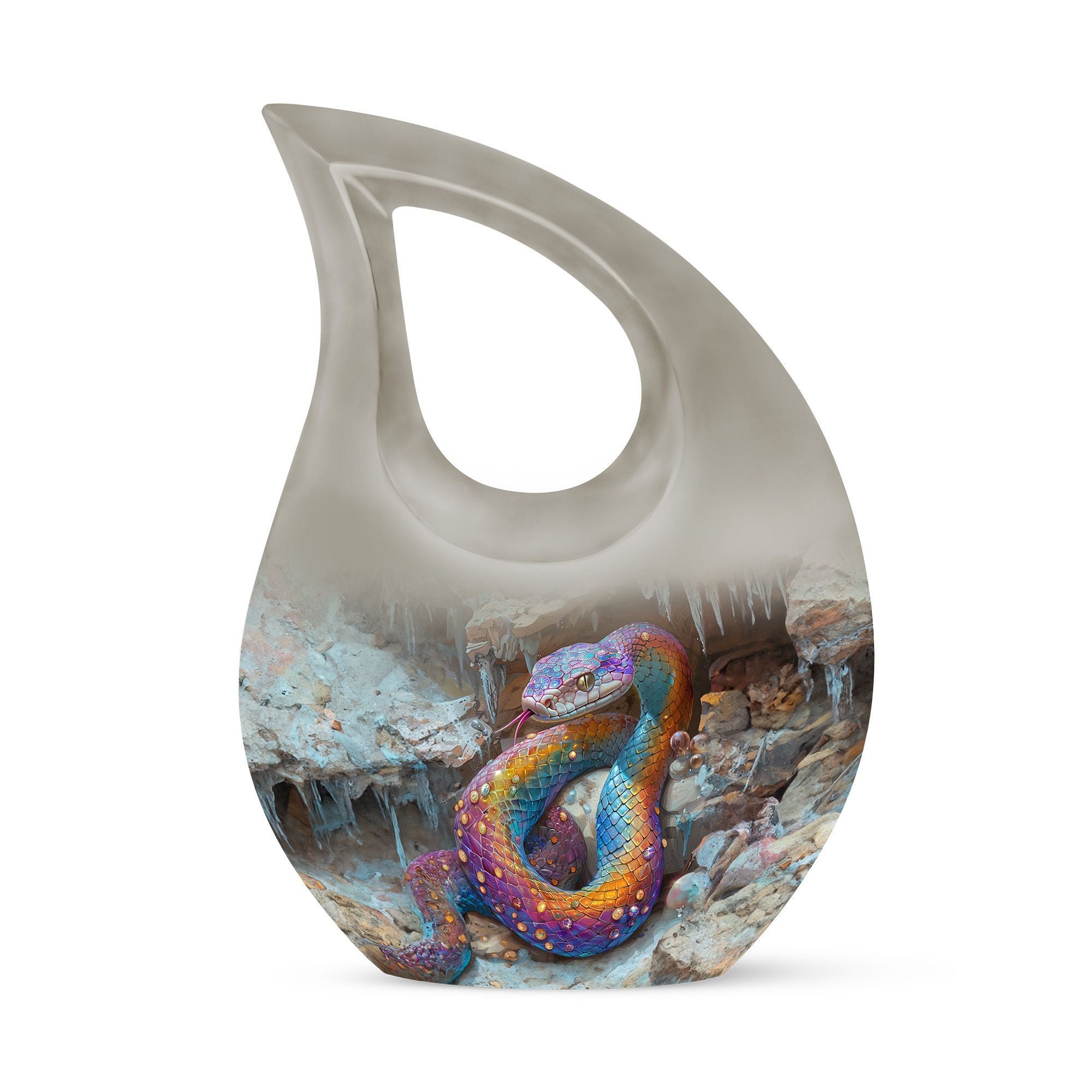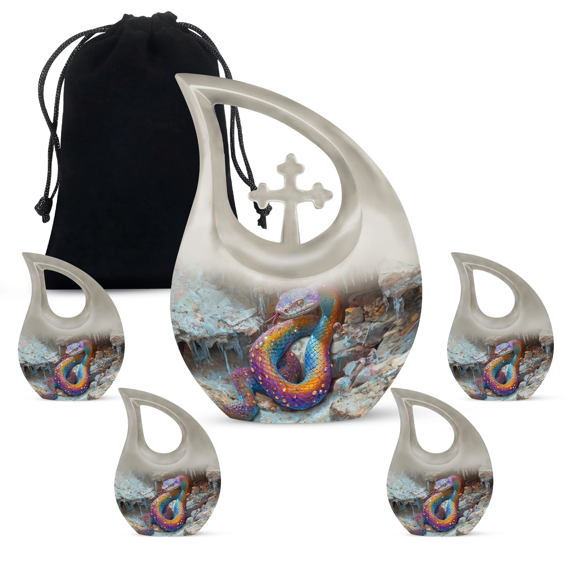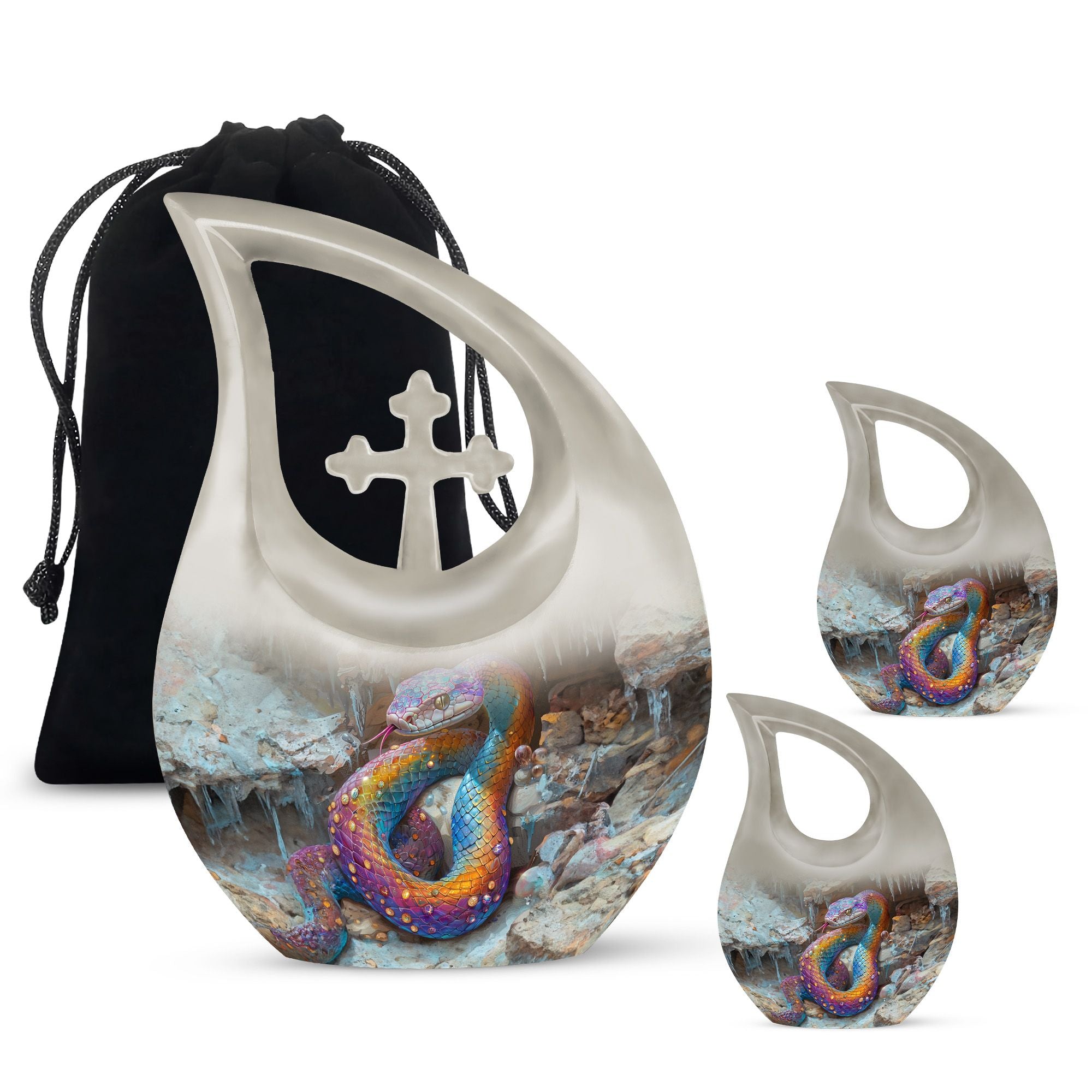 A tribute to the departed deserves to be as unique as their life was. Our Snake Urn series honors this sentiment, offering a distinctive resting place for their cherished ashes. Defined by its Cross Drop design, this sophisticated 10-inch Large Urn is crafted from durable Aluminium, assuring an everlasting memorial. Despite its elegant size standing at 10 inches in height and carrying a weight of 3.3 pounds, it maintains an interior capacity of 200 cubic inches. This Small Cremation Urn is personalized by engraving names, infusing an intimate touch to your memorial tribute. Its thematic interpretation of a snake enriches its unique charm, while the velvet pouch included in the package ensures respectful containment of the ashes. Ideal for those seeking authentic Human Urns or a Custom Made Urn, this piece also suits seekers of unique Butterfly Urns for Ashes. Embrace the elegance of this homage, delicately fusing the love of art and commemoration.