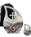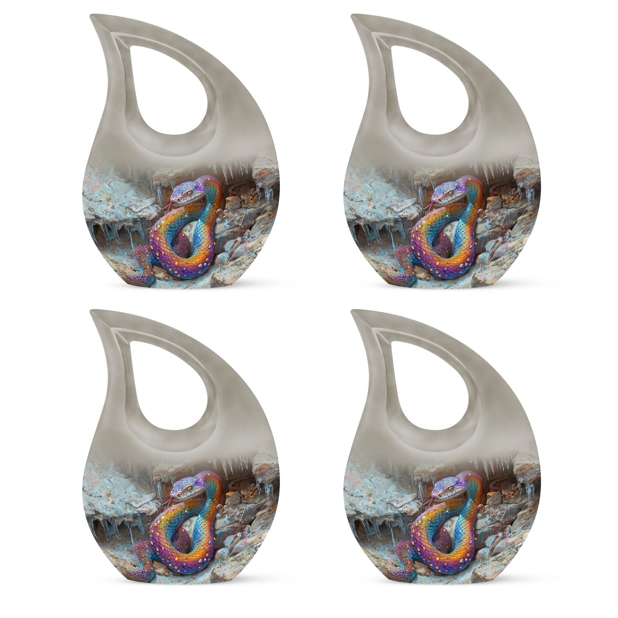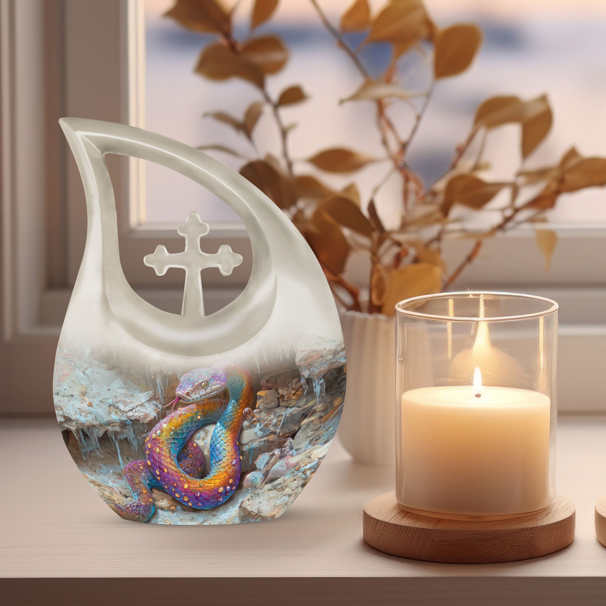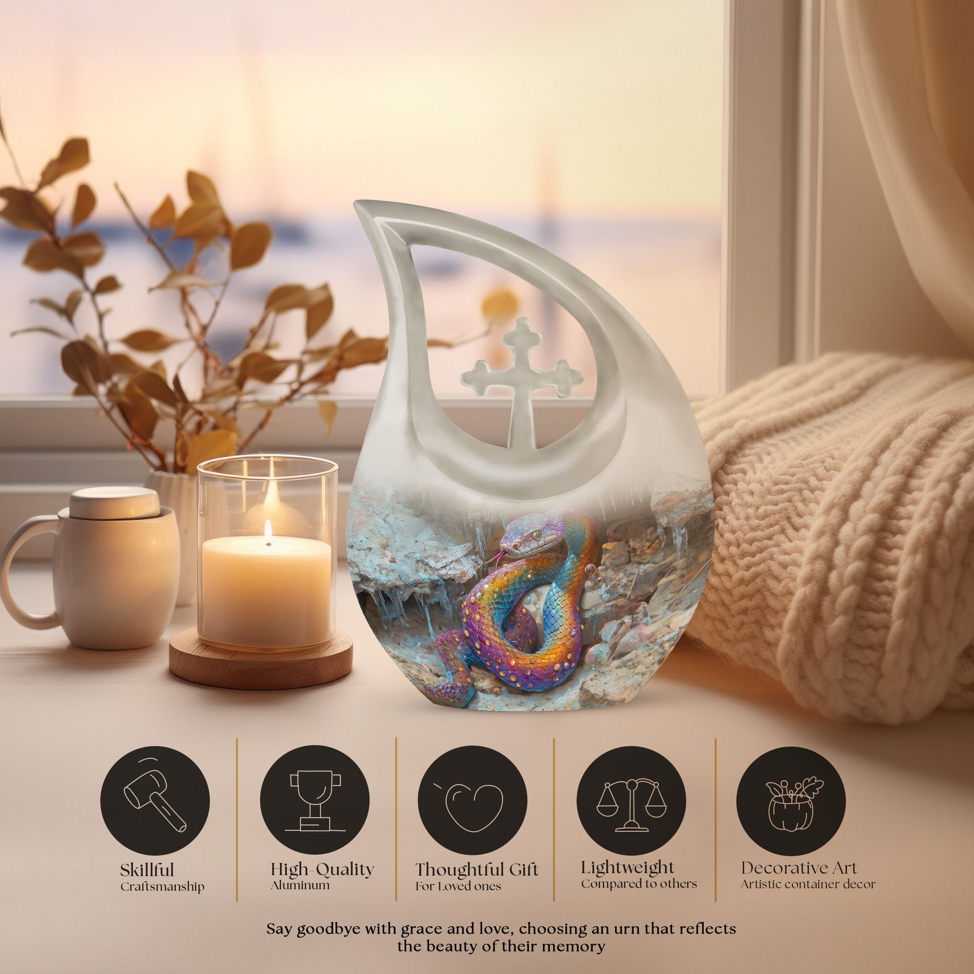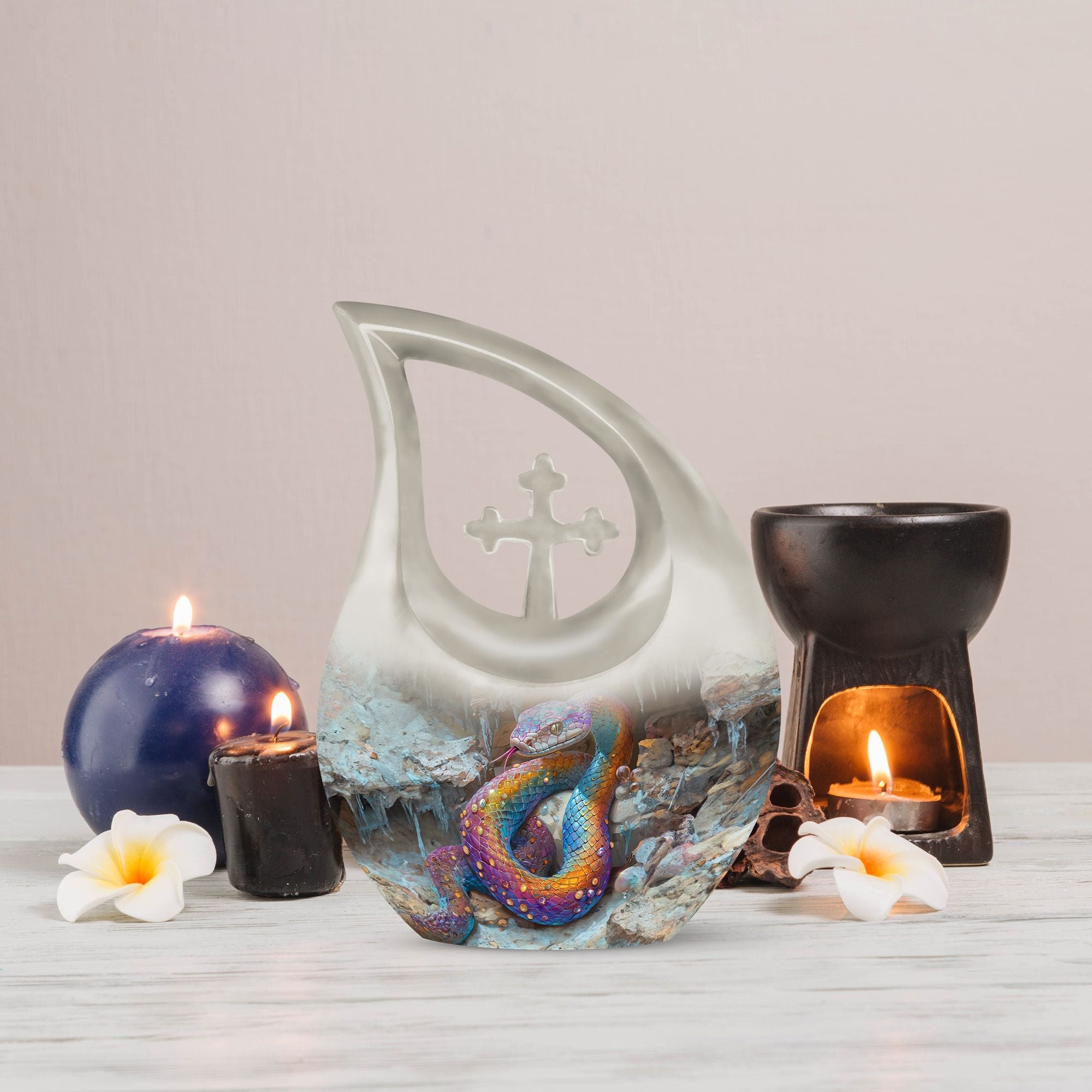 A tribute to the departed deserves to be as unique as their life was. Our Snake Urn series honors this sentiment, offering a distinctive resting place for their cherished ashes. Defined by its Cross Drop design, this sophisticated 10-inch Large Urn is crafted from durable Aluminium, assuring an everlasting memorial. Despite its elegant size standing at 10 inches in height and carrying a weight of 3.3 pounds, it maintains an interior capacity of 200 cubic inches. This Small Cremation Urn is personalized by engraving names, infusing an intimate touch to your memorial tribute. Its thematic interpretation of a snake enriches its unique charm, while the velvet pouch included in the package ensures respectful containment of the ashes. Ideal for those seeking authentic Human Urns or a Custom Made Urn, this piece also suits seekers of unique Butterfly Urns for Ashes. Embrace the elegance of this homage, delicately fusing the love of art and commemoration.