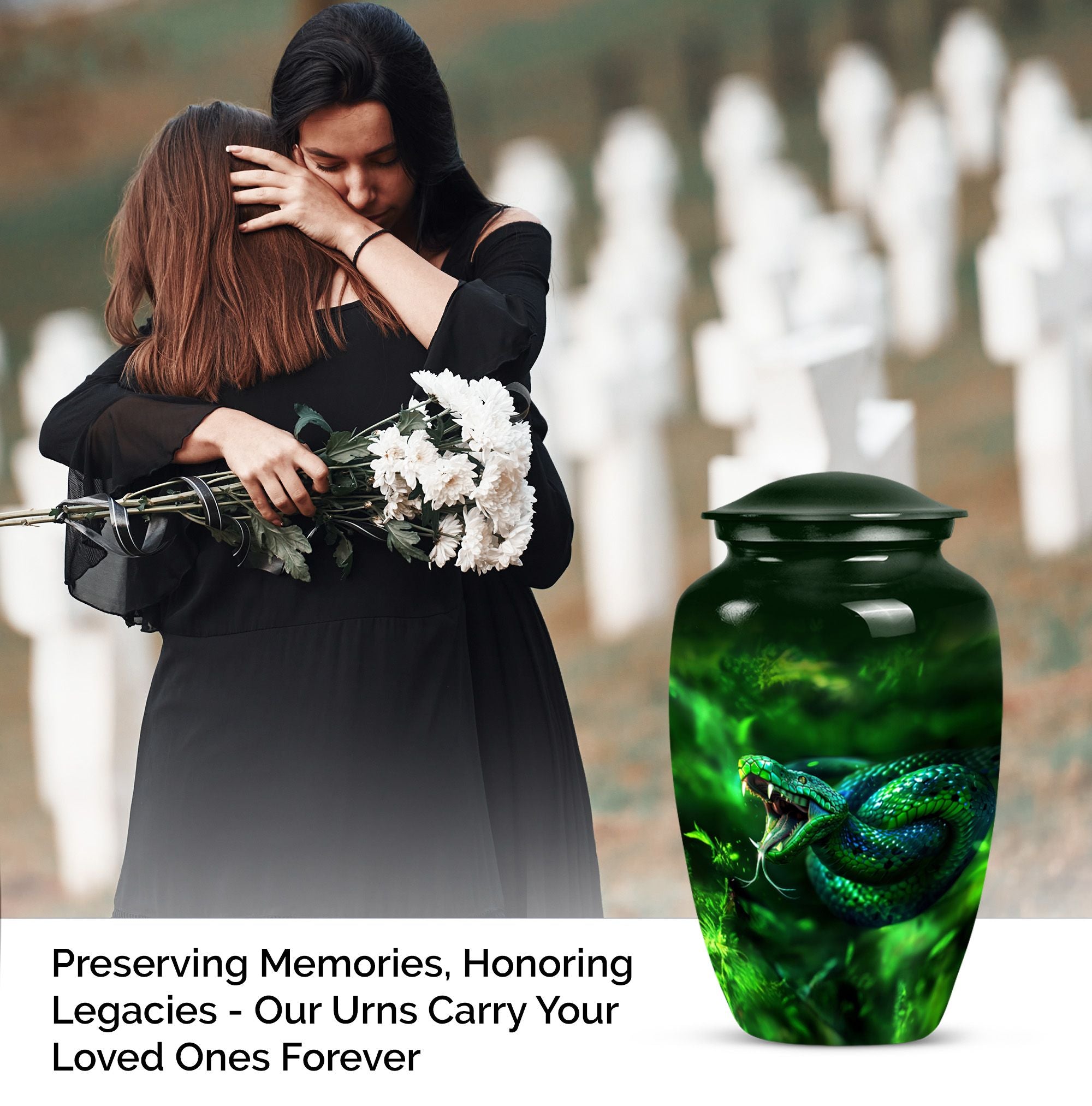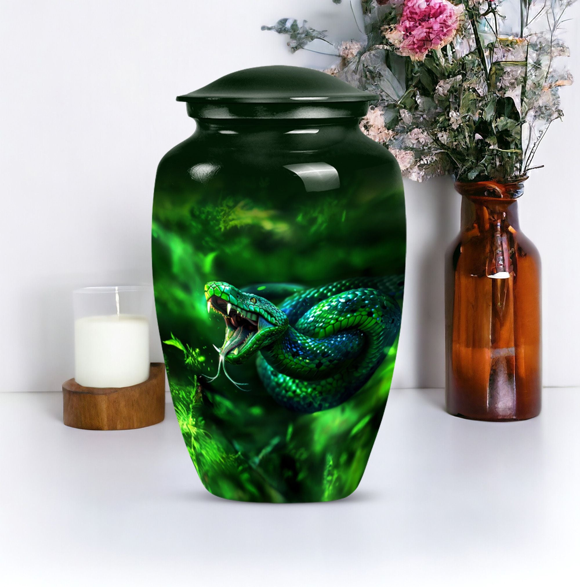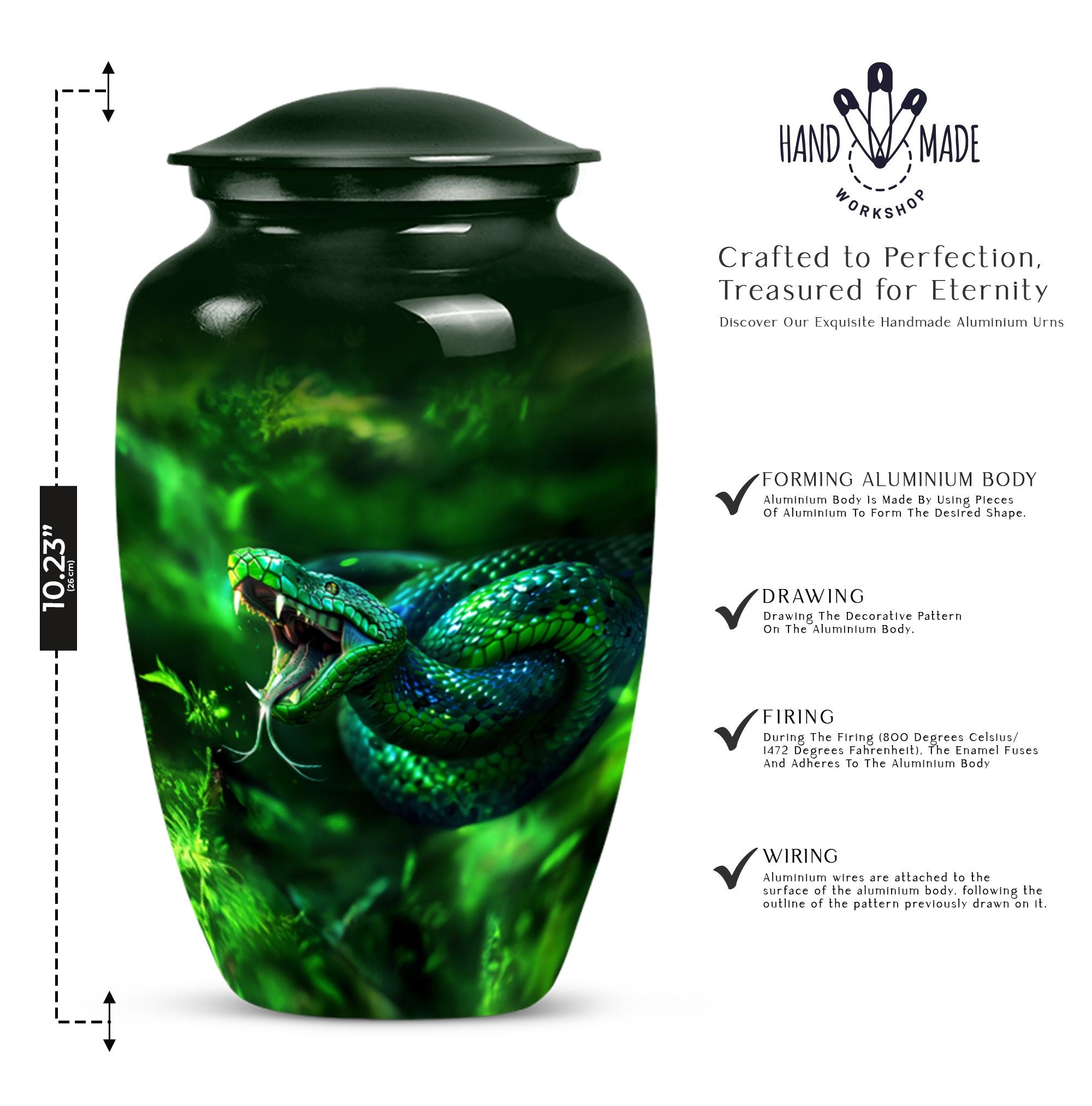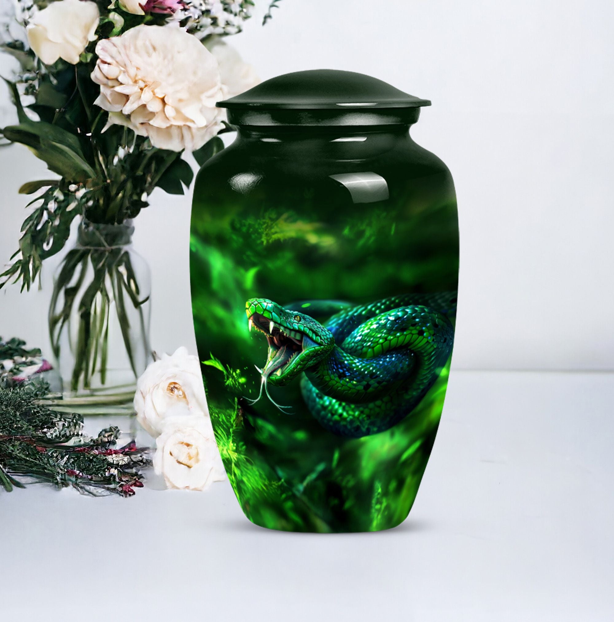 Be at peace knowing your dearly departed is laid to rest in our exceptional, beautifully crafted snake Urn. This 10-inch Aluminium Urn combines the timeless appeal of a classic urn with an abstract theme, presenting a revered symbol of transformation, renewal, and life's continual evolution. Made from high quality aluminium, this large urn is built to safeguard ashes and honor lifetime memories. Its well-proportioned dimensions and sufficient 200 cubic inches capacity offer ample space for the ashes of your loved one, making it suitable to be used as a funeral urn for ashes for men. Adding to its overall appeal is the ability to you to personalize this urn with engraved names, perfect for creating a lasting tribute to your loved one. Each urn is presented with a velvet pouch, simplifying the containment and preservation of the treasured ashes. This product seamlessly blends with traditional and modern types of memorial human urns for ashes, funeral urns, burial urns, and is a dignified selection for those seeking unique metal urns. Comforting in its familiarity and resonating with ageless dignity, this urn lets you say your farewell with grace.