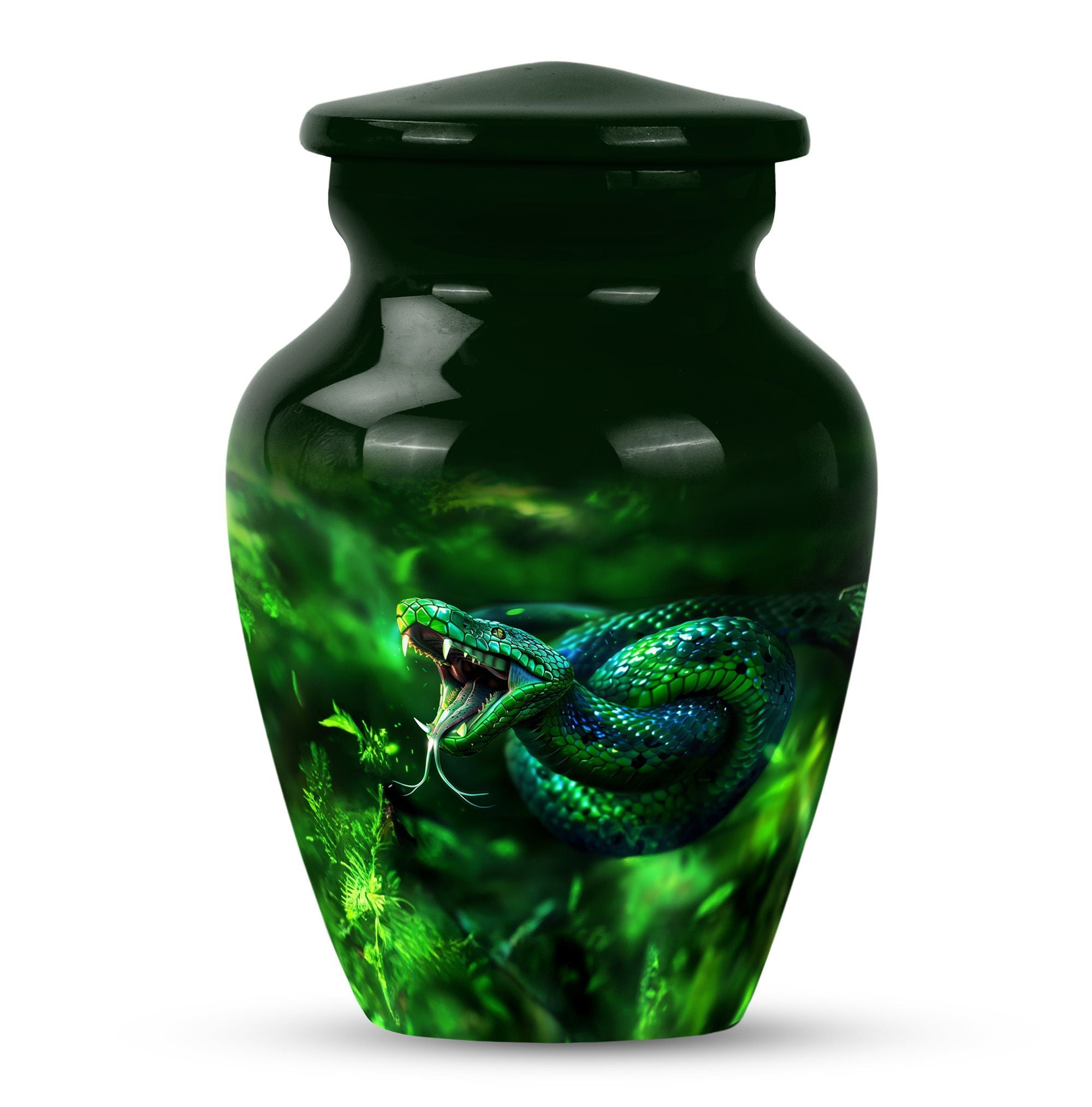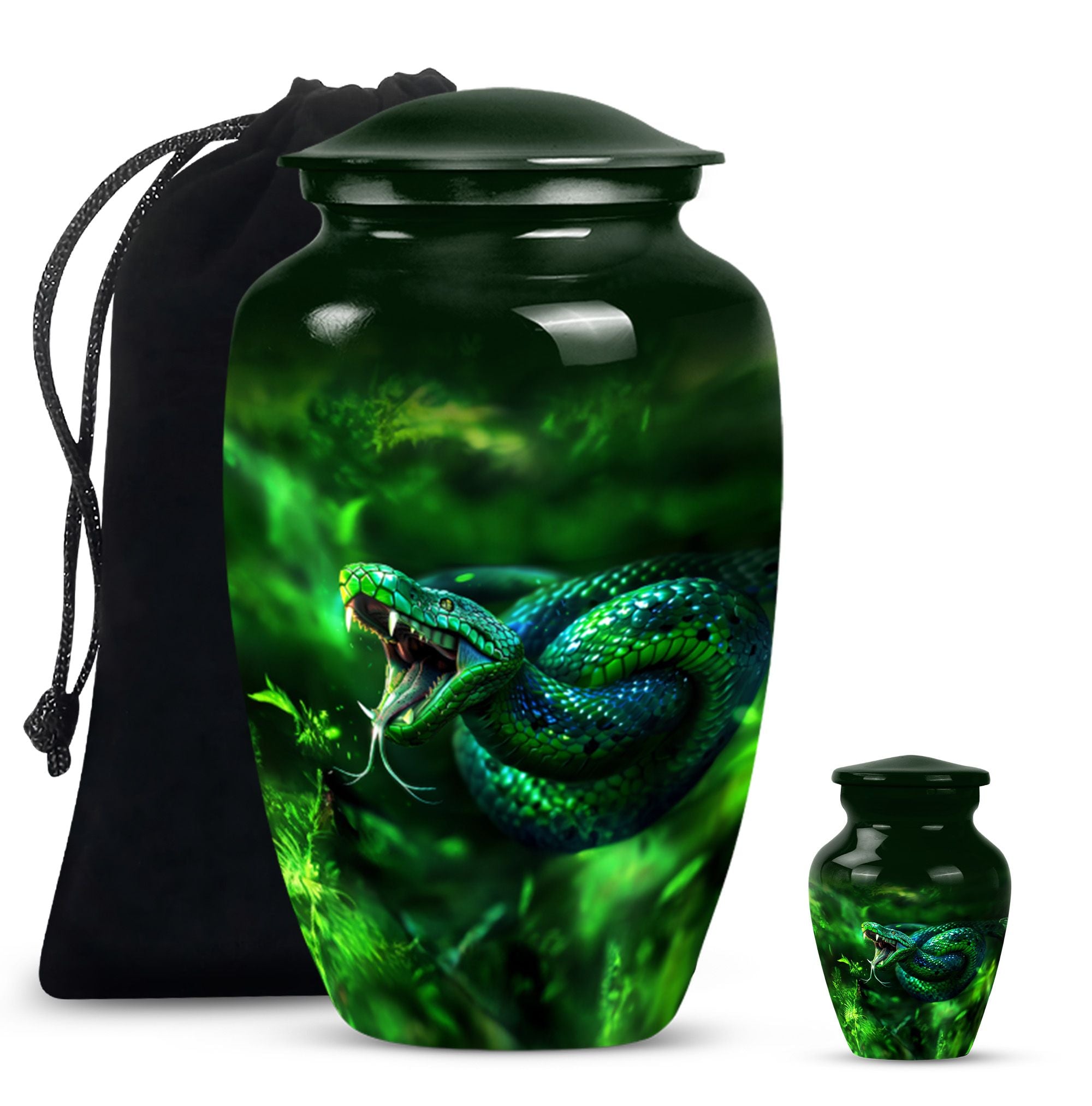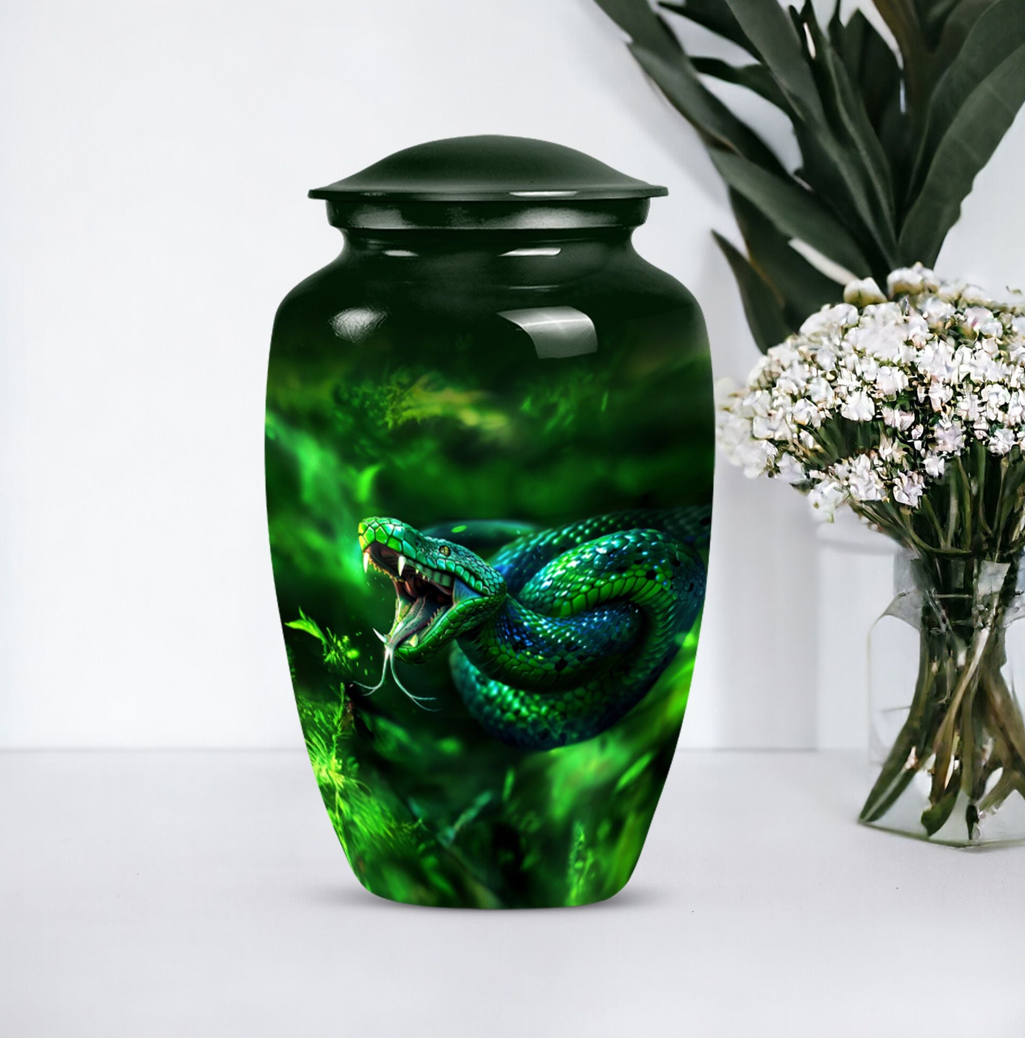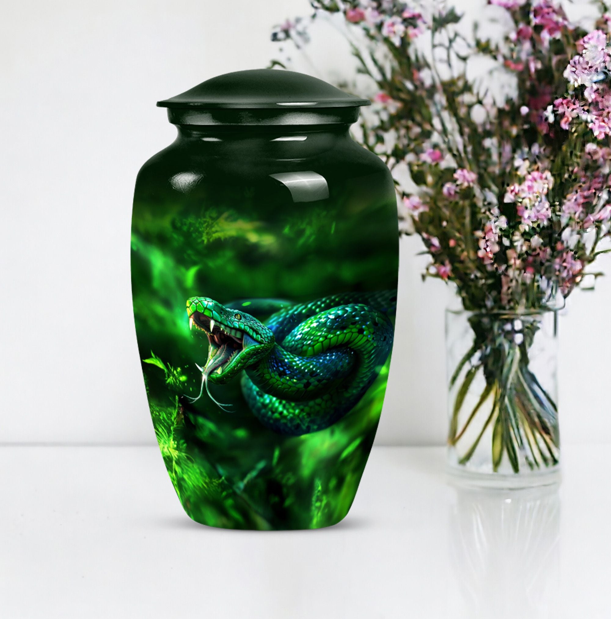 Be at peace knowing your dearly departed is laid to rest in our exceptional, beautifully crafted snake Urn. This 10-inch Aluminium Urn combines the timeless appeal of a classic urn with an abstract theme, presenting a revered symbol of transformation, renewal, and life's continual evolution. Made from high quality aluminium, this large urn is built to safeguard ashes and honor lifetime memories. Its well-proportioned dimensions and sufficient 200 cubic inches capacity offer ample space for the ashes of your loved one, making it suitable to be used as a funeral urn for ashes for men. Adding to its overall appeal is the ability to you to personalize this urn with engraved names, perfect for creating a lasting tribute to your loved one. Each urn is presented with a velvet pouch, simplifying the containment and preservation of the treasured ashes. This product seamlessly blends with traditional and modern types of memorial human urns for ashes, funeral urns, burial urns, and is a dignified selection for those seeking unique metal urns. Comforting in its familiarity and resonating with ageless dignity, this urn lets you say your farewell with grace.