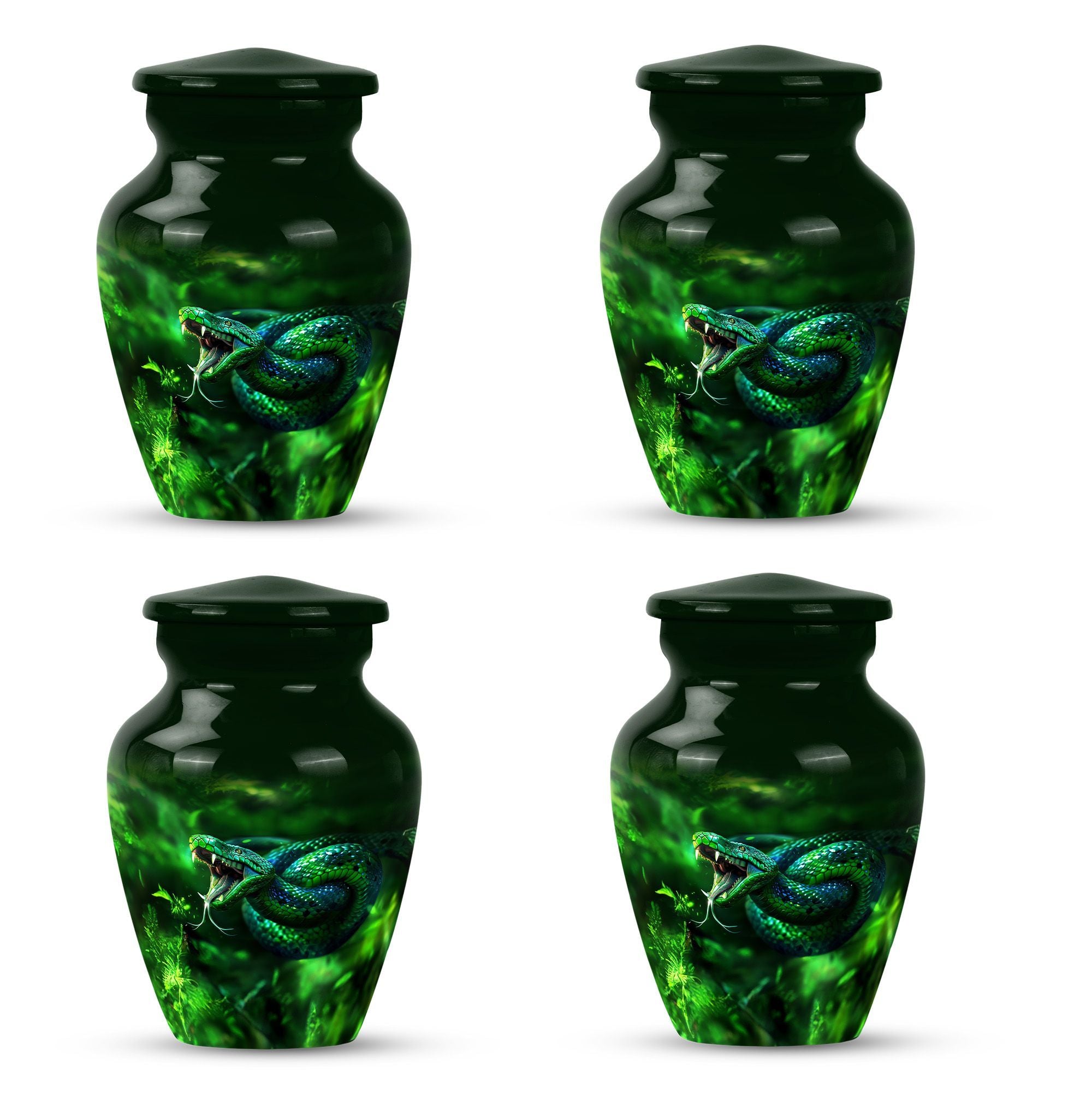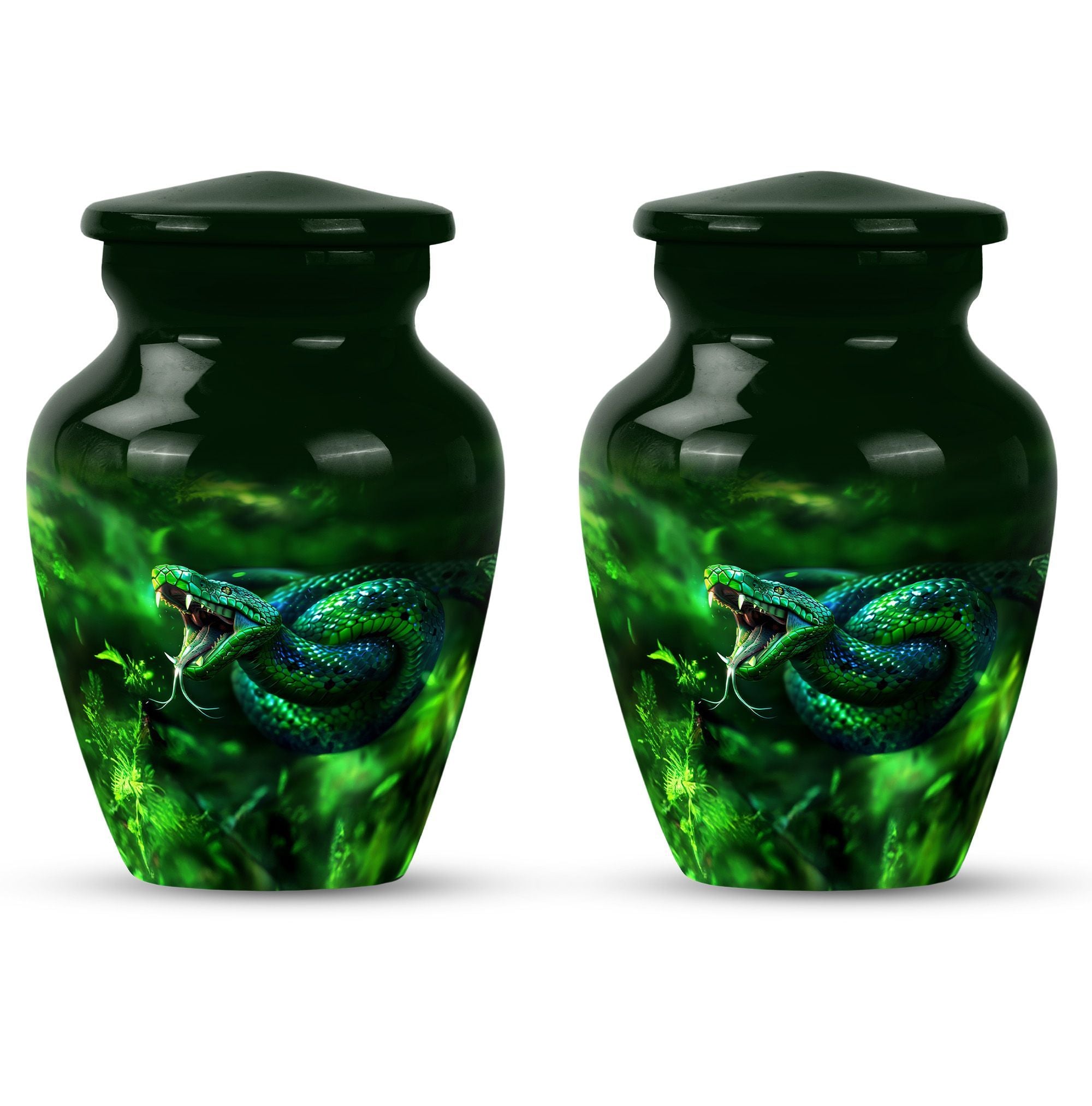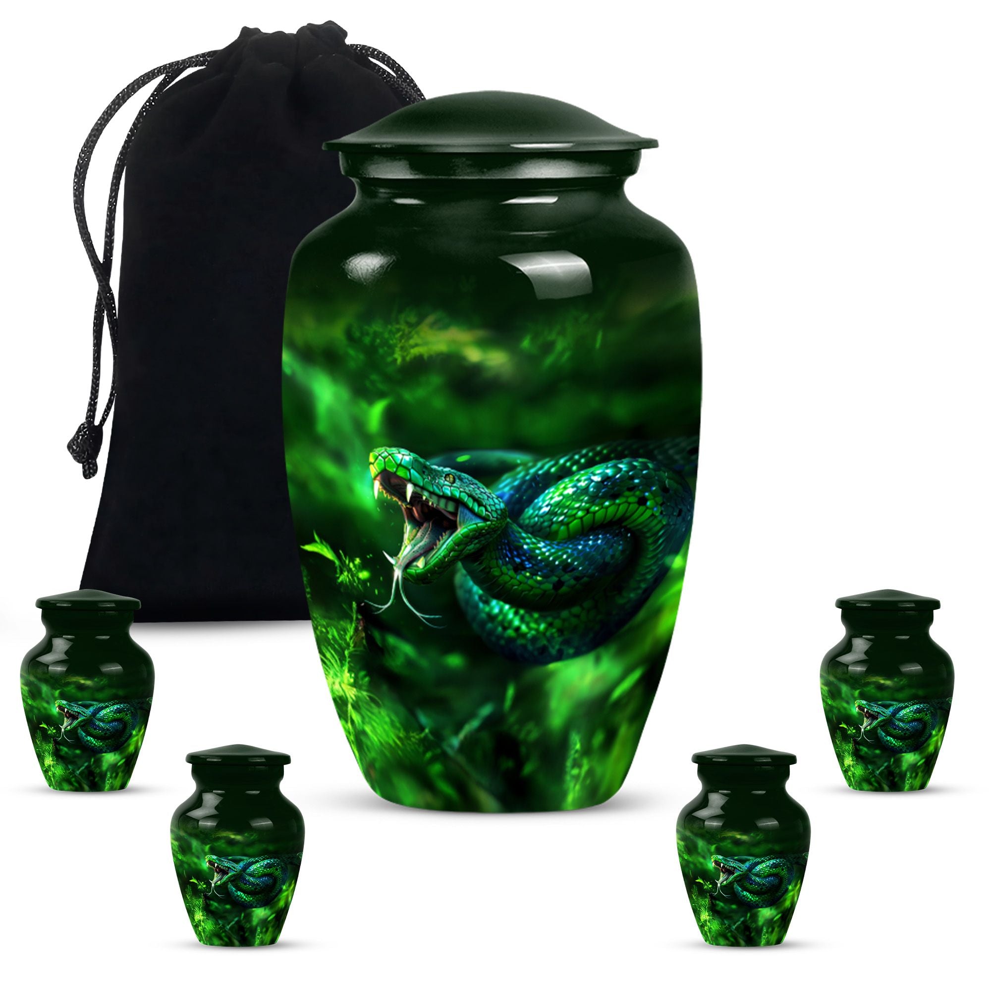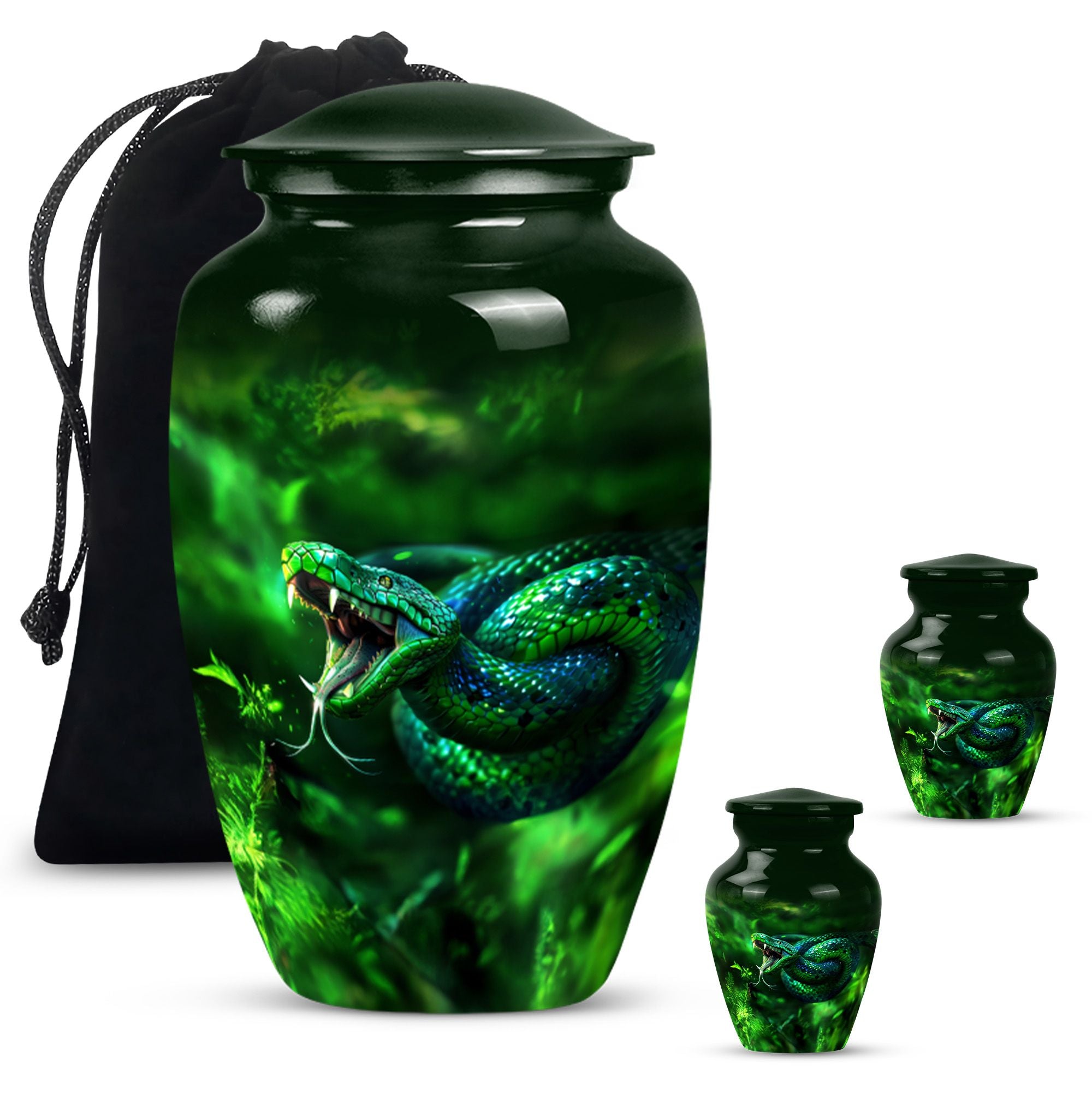 Be at peace knowing your dearly departed is laid to rest in our exceptional, beautifully crafted snake Urn. This 10-inch Aluminium Urn combines the timeless appeal of a classic urn with an abstract theme, presenting a revered symbol of transformation, renewal, and life's continual evolution. Made from high quality aluminium, this large urn is built to safeguard ashes and honor lifetime memories. Its well-proportioned dimensions and sufficient 200 cubic inches capacity offer ample space for the ashes of your loved one, making it suitable to be used as a funeral urn for ashes for men. Adding to its overall appeal is the ability to you to personalize this urn with engraved names, perfect for creating a lasting tribute to your loved one. Each urn is presented with a velvet pouch, simplifying the containment and preservation of the treasured ashes. This product seamlessly blends with traditional and modern types of memorial human urns for ashes, funeral urns, burial urns, and is a dignified selection for those seeking unique metal urns. Comforting in its familiarity and resonating with ageless dignity, this urn lets you say your farewell with grace.