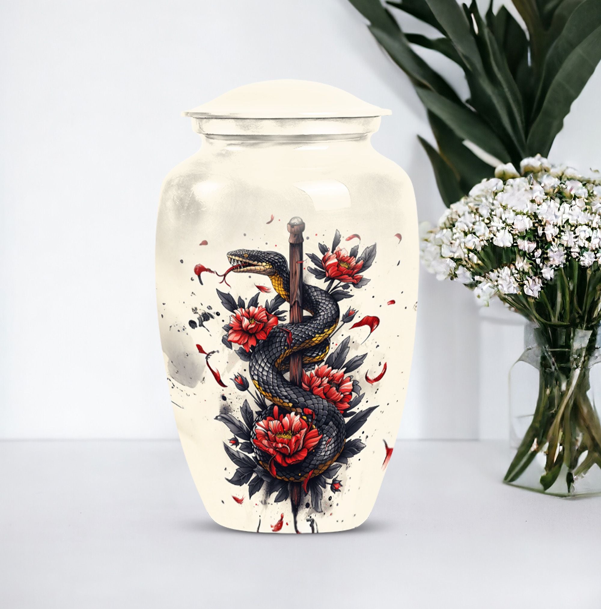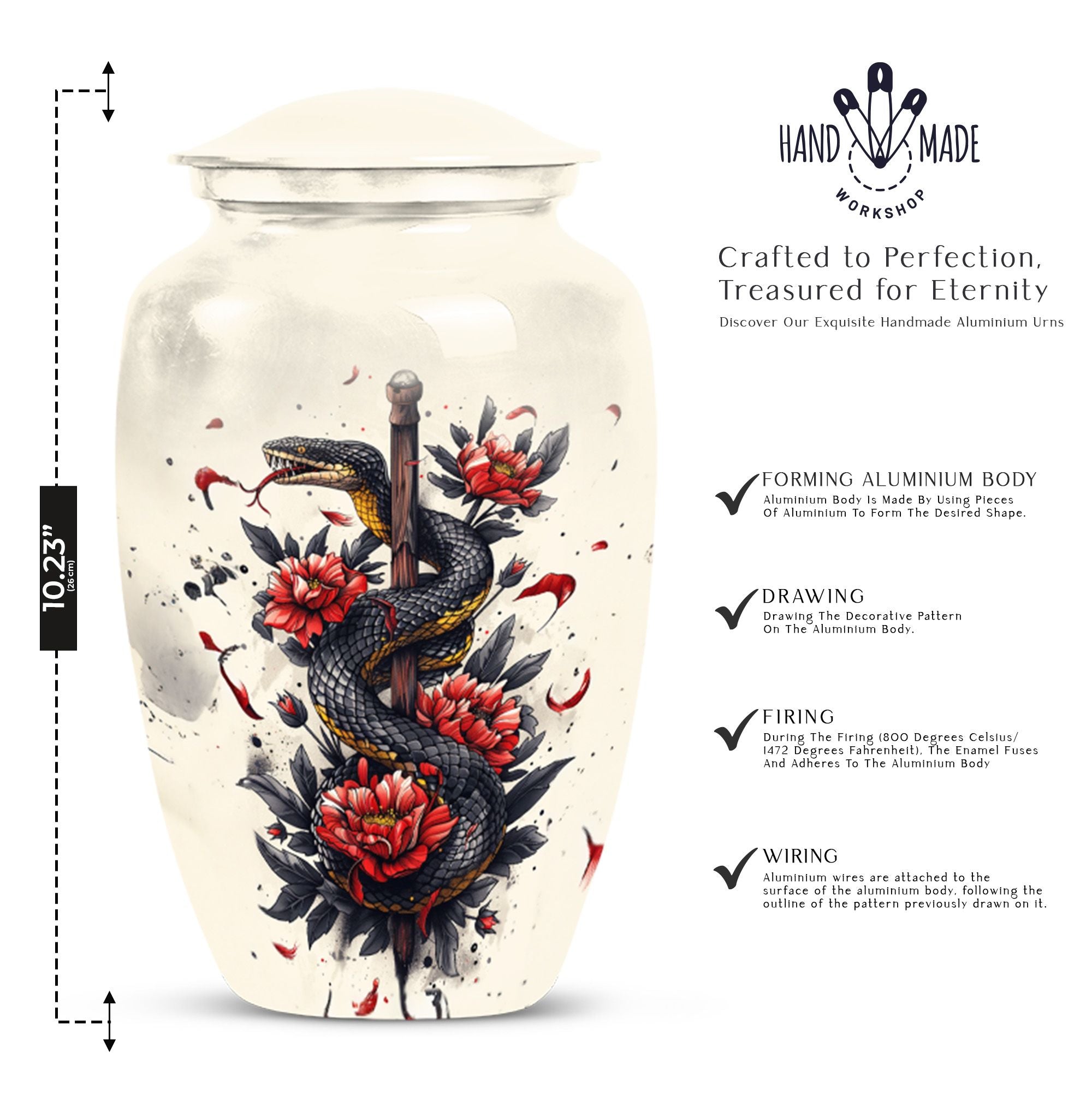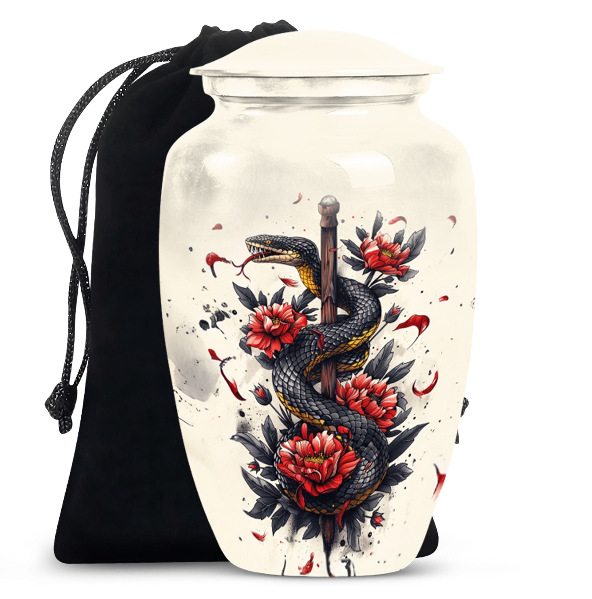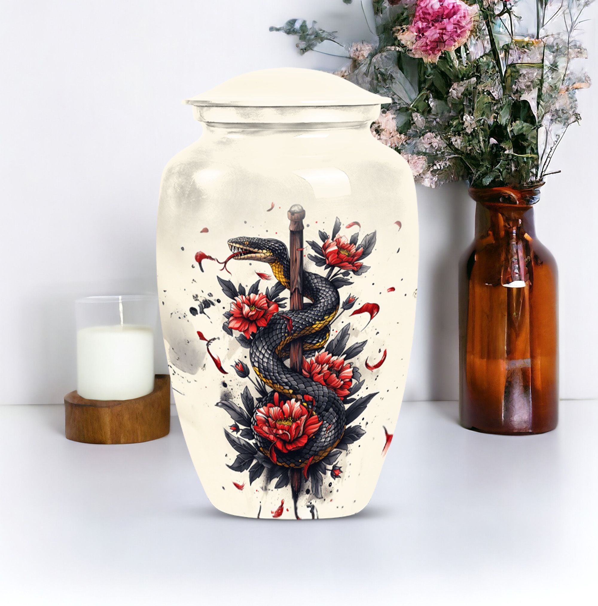 Keep your loved ones close forever with this remarkable 'Snake Urn'. Commemorate and remember the life of a beloved family member or friend with this elegantly designed 10-inch cremation urn. Our classic urn is masterfully crafted, weighs 3.3 pounds, and exhibits an abstract theme that signifies eternal love and devotion. The exceptional large urn is capable of holding 200 cubic inches of ashes and is made from high-quality aluminum, giving it durability and longevity. In addition, the urn package includes a velvet pouch for secure containment of ashes, ensuring utmost respect for the departed soul. Personalize the urn with engraved names, creating a unique memorial unrivaled in design and quality. Perfect for human ashes, it's an ideal choice for those searching for memorable and decorative urns. This urn is not just a resting place for the departed; it's also a work of art, encapsulating the essence of their life. Please note, the design is not a key feature of this item.