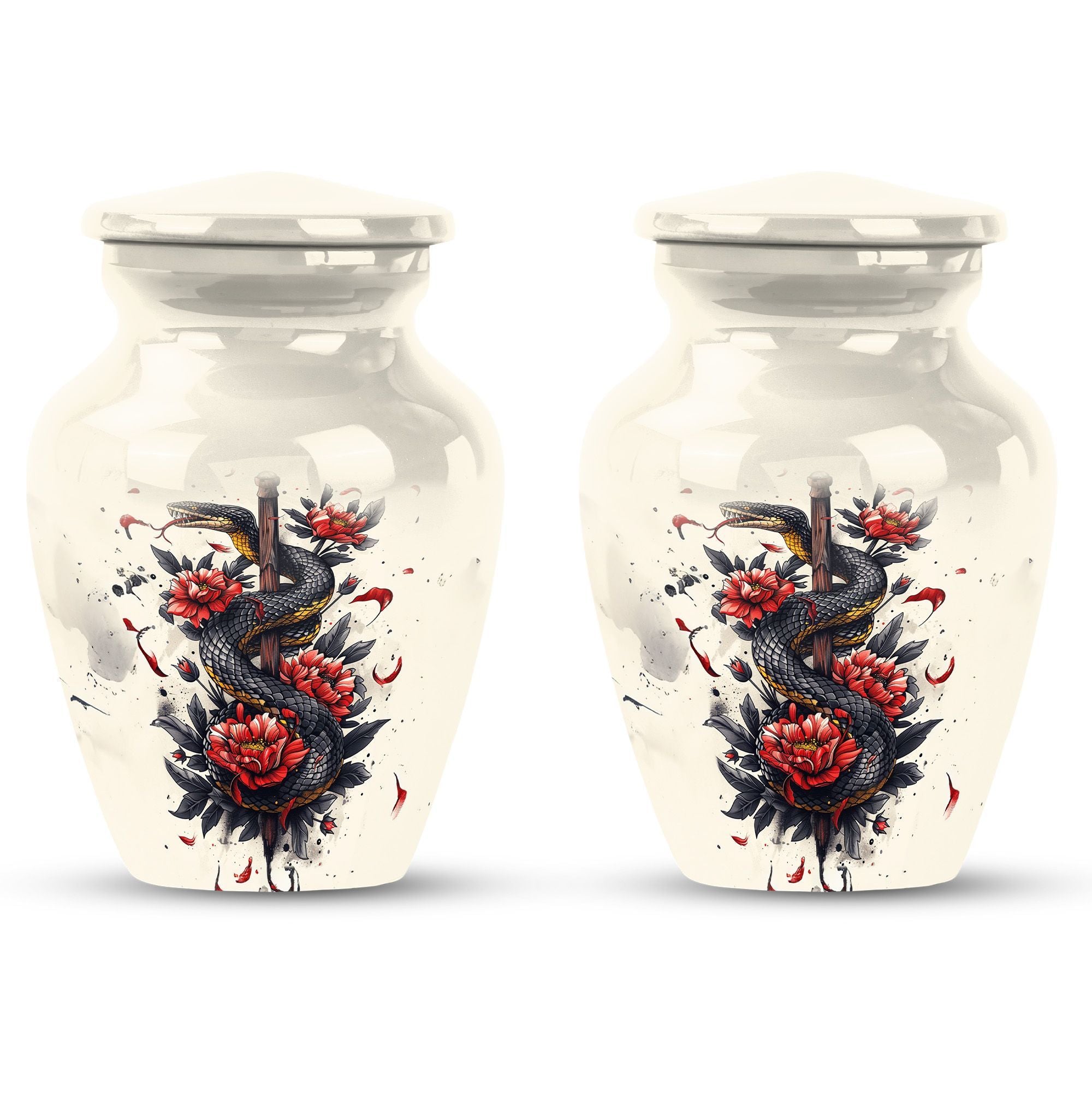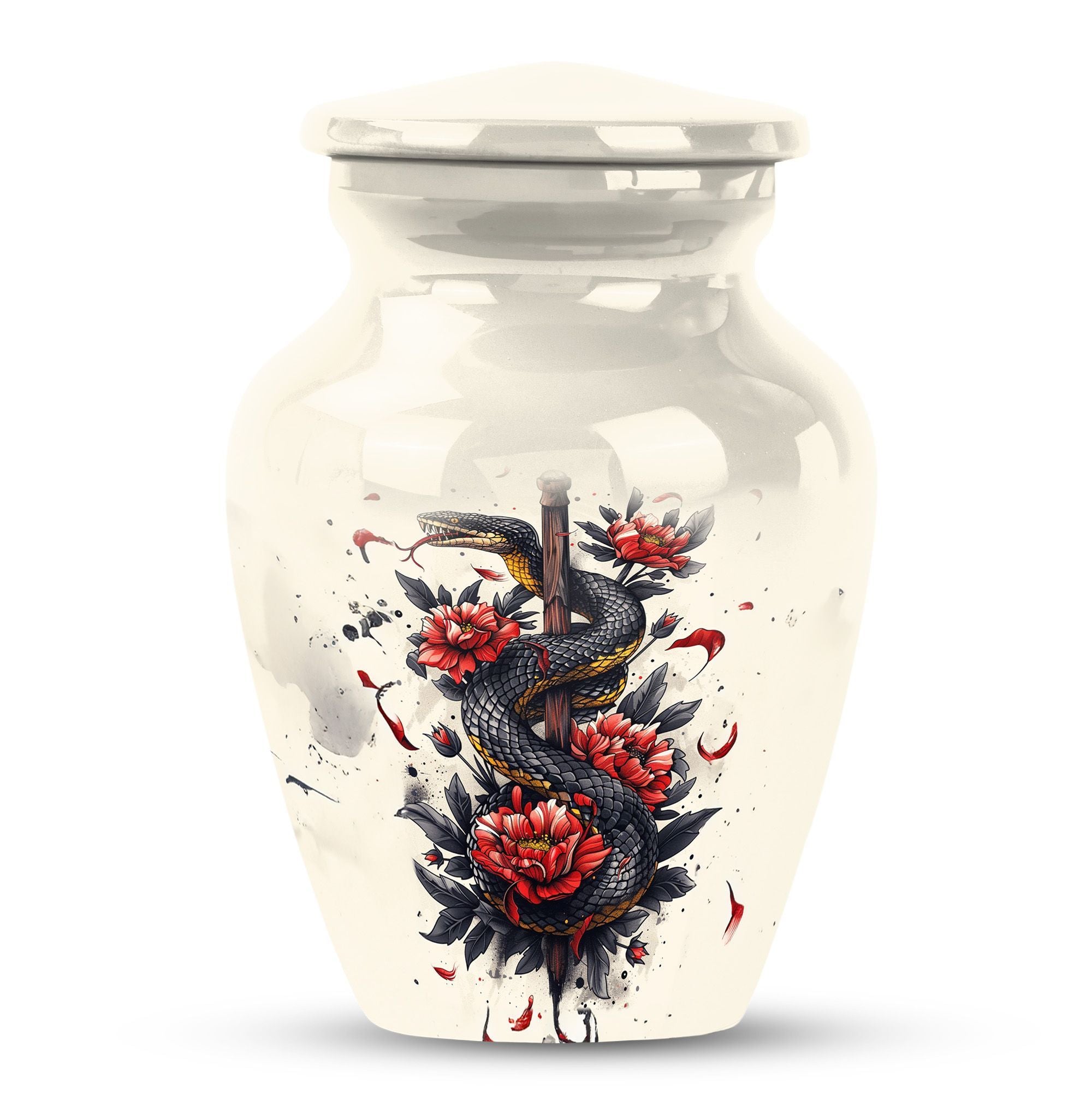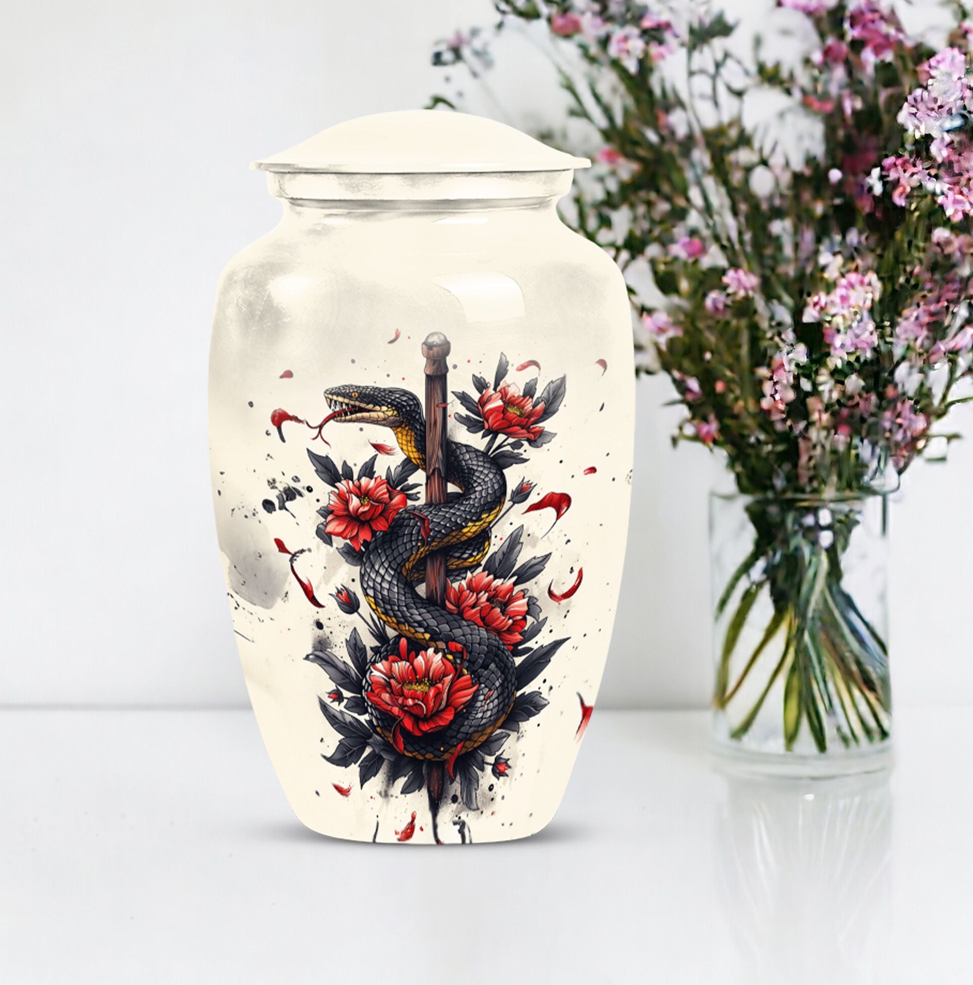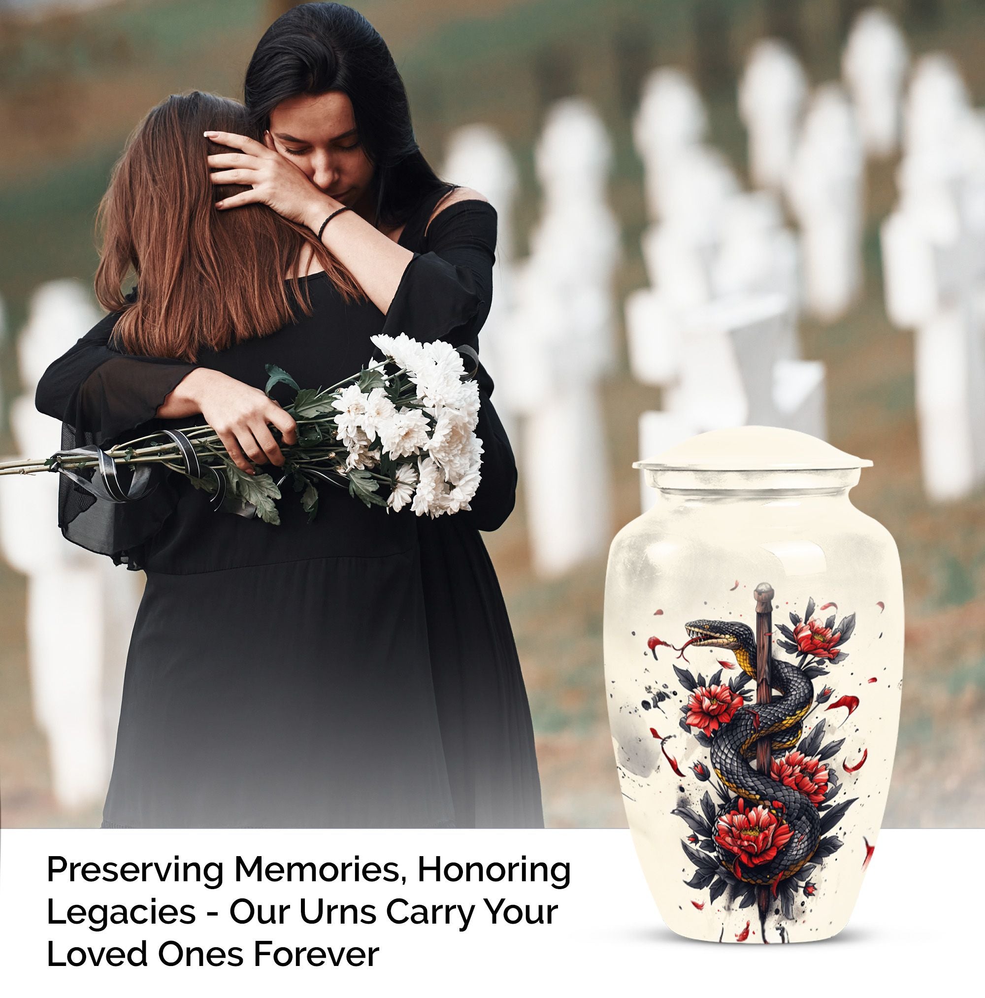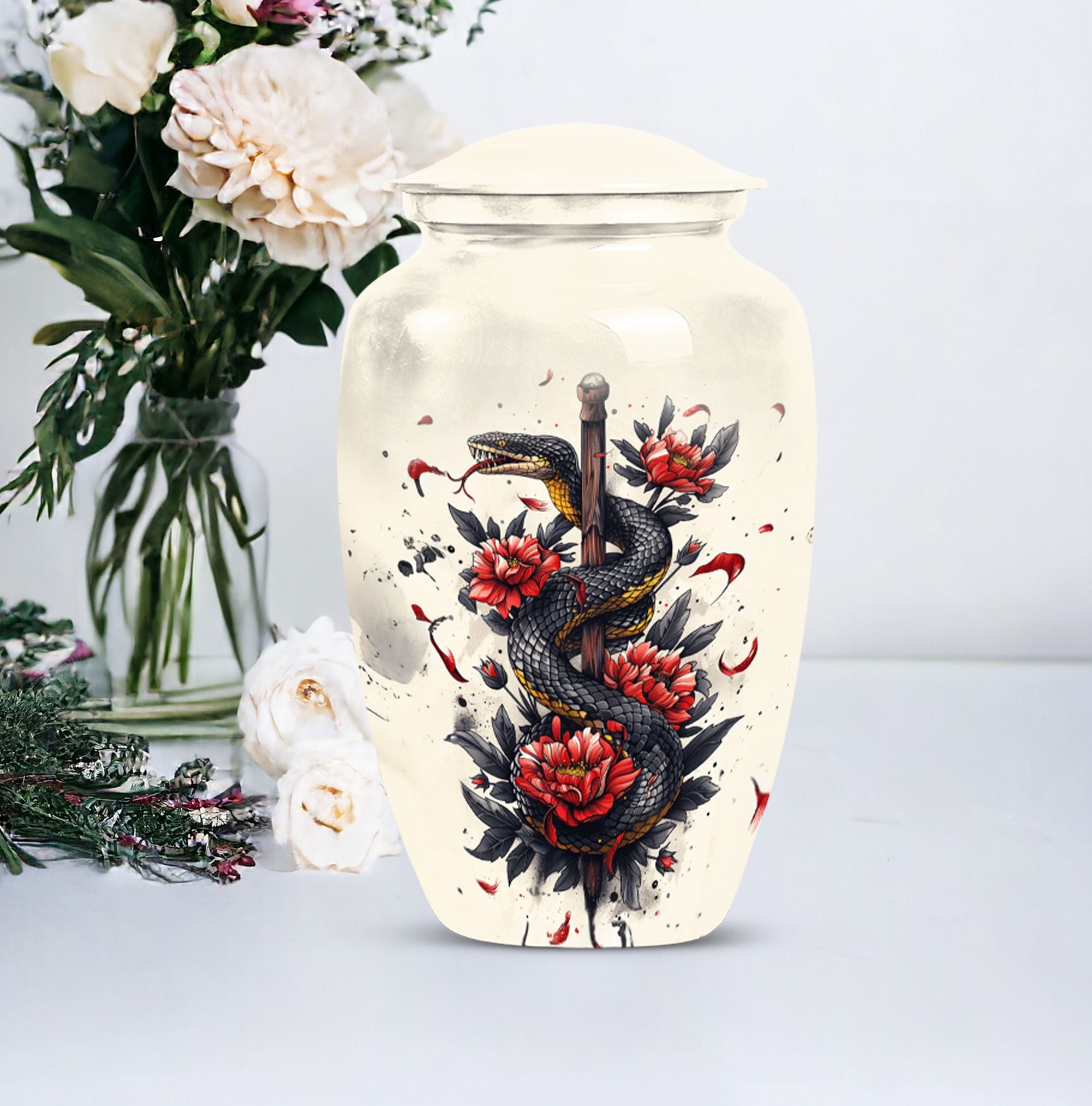 Keep your loved ones close forever with this remarkable 'Snake Urn'. Commemorate and remember the life of a beloved family member or friend with this elegantly designed 10-inch cremation urn. Our classic urn is masterfully crafted, weighs 3.3 pounds, and exhibits an abstract theme that signifies eternal love and devotion. The exceptional large urn is capable of holding 200 cubic inches of ashes and is made from high-quality aluminum, giving it durability and longevity. In addition, the urn package includes a velvet pouch for secure containment of ashes, ensuring utmost respect for the departed soul. Personalize the urn with engraved names, creating a unique memorial unrivaled in design and quality. Perfect for human ashes, it's an ideal choice for those searching for memorable and decorative urns. This urn is not just a resting place for the departed; it's also a work of art, encapsulating the essence of their life. Please note, the design is not a key feature of this item.