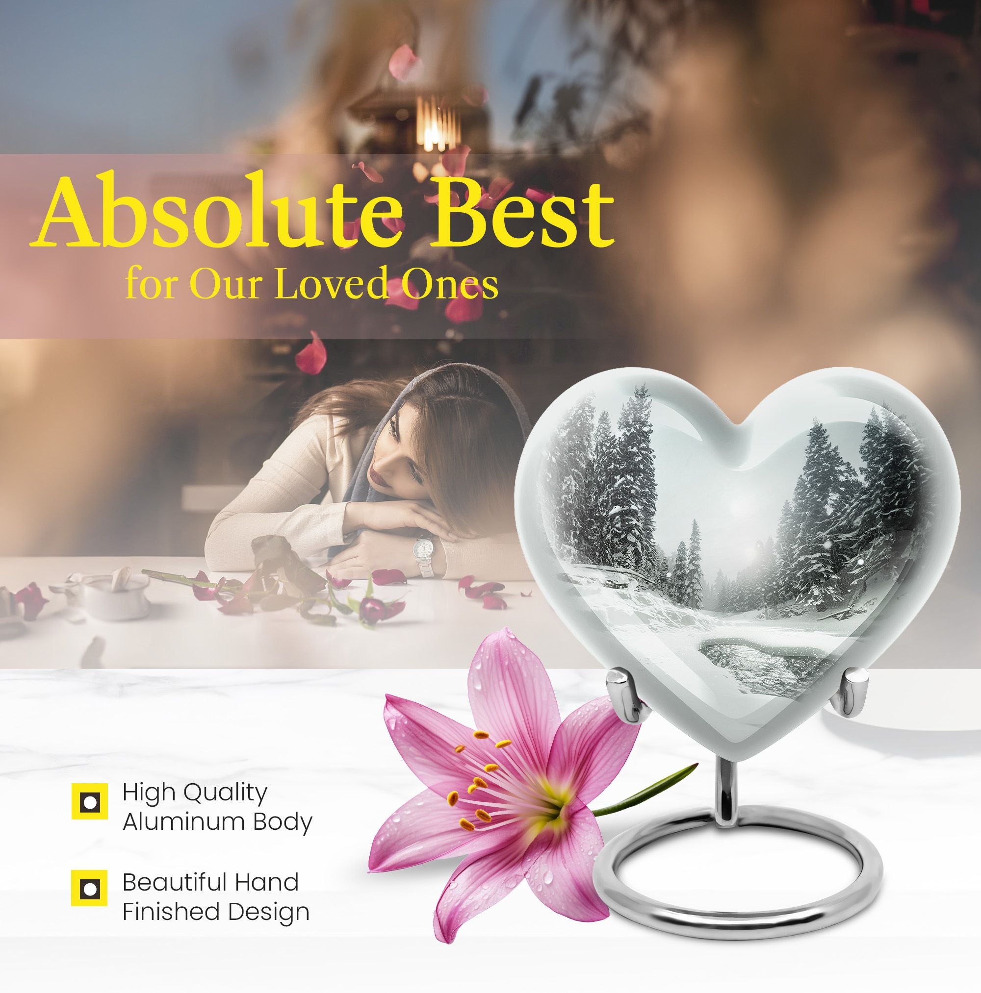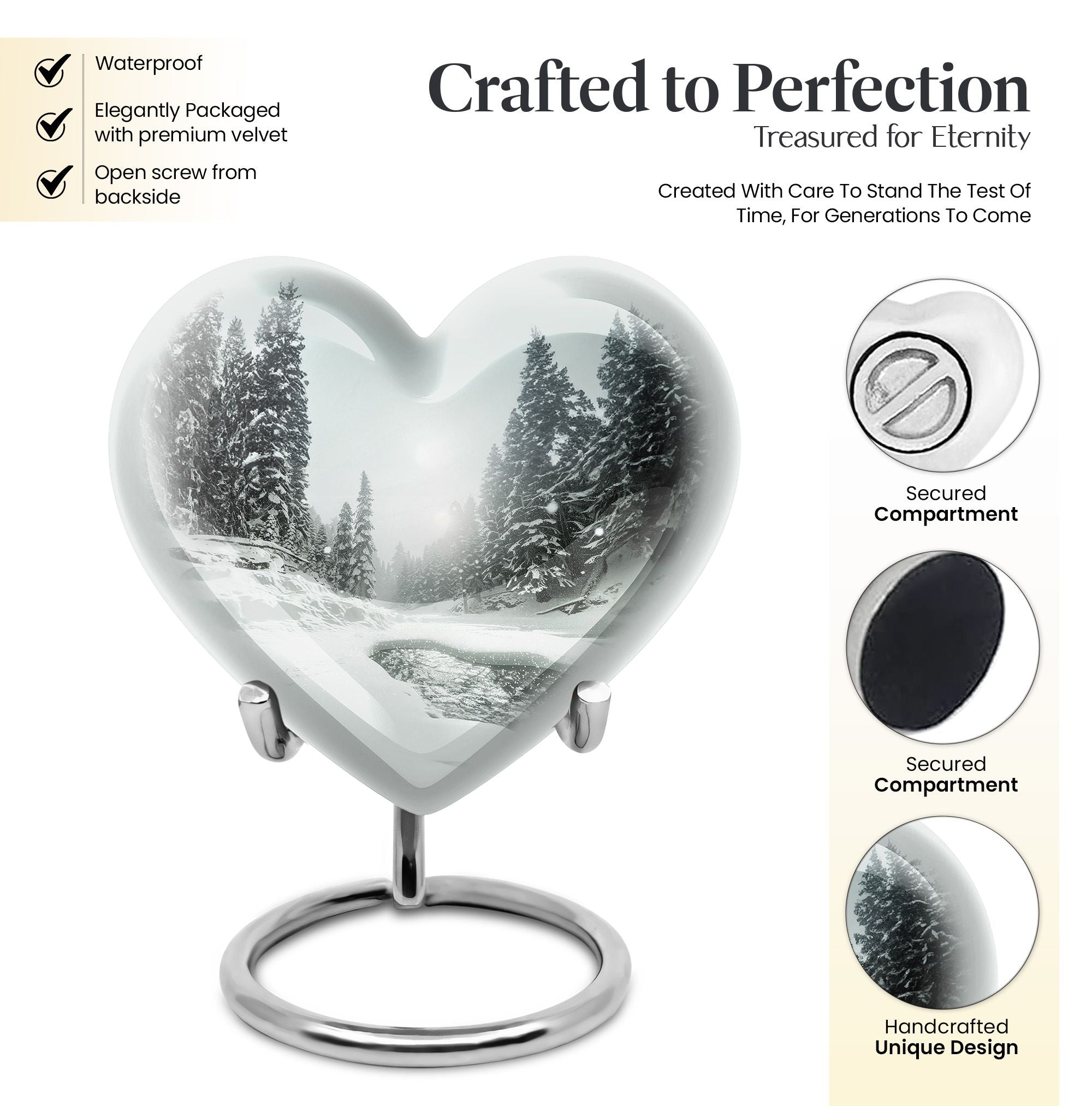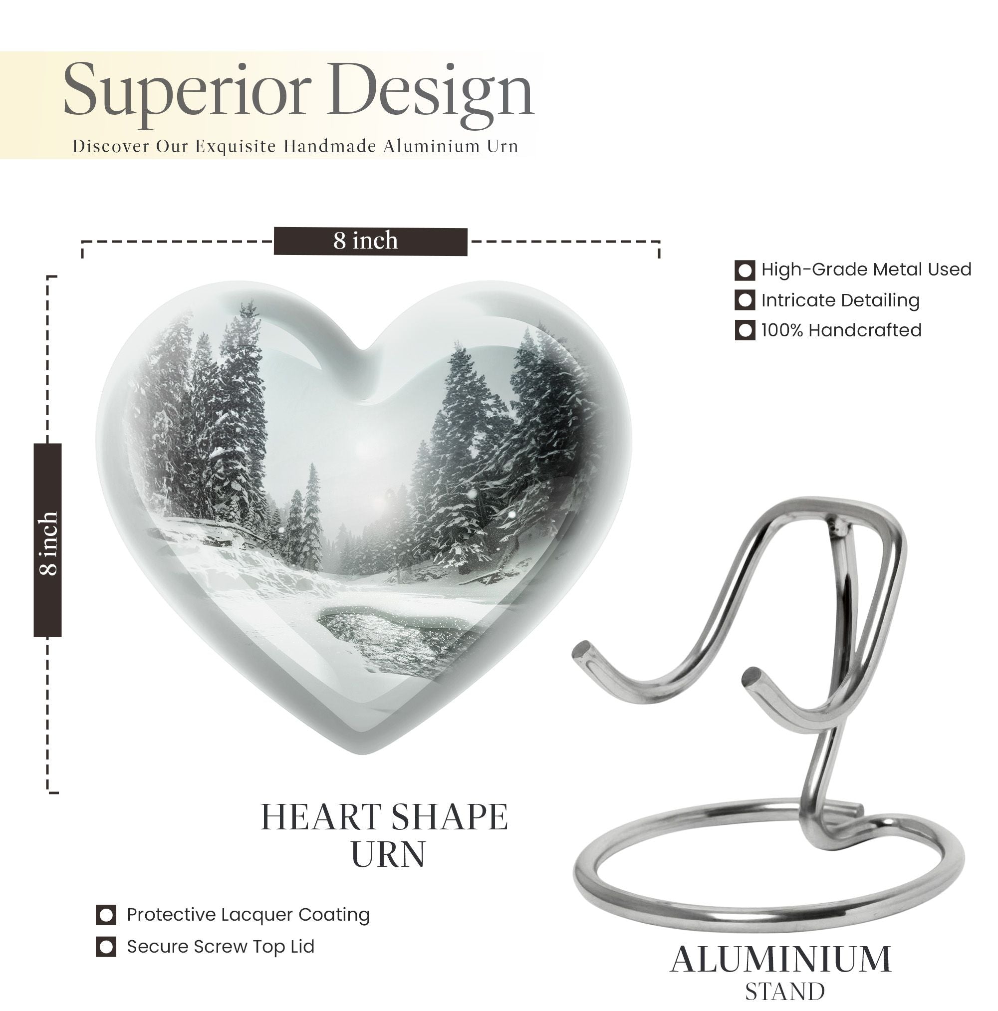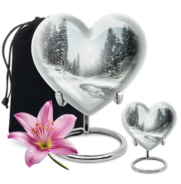 Pay tribute to a cherished loved one with our unique Snowflakes Urn, meticulously crafted from high-quality aluminium. This large, funeral urn for human ashes stands at an impressive 10 inches in height and weighs a solid 3.3 pounds. Internally, it provides ample space with a capacity of 200 cubic inches, sufficient to securely hold the ashes of an adult. The heartfelt theme of snowflakes provides a serene and peaceful image, existing as a touching memory of the affection and warmth your loved one brought to your life. Every Snowflakes Urn also includes a velvet pouch, which serves as an additional layer of protection and containment. Adding further uniqueness, there is an option to personalize the urn with engraved names; a special way to keep your dear one's memory alive. This distinct yet refined memorial urn is sure to stand as a timeless tribute. It is not just a resting place but also an artwork that reflects love and respect for the departed.