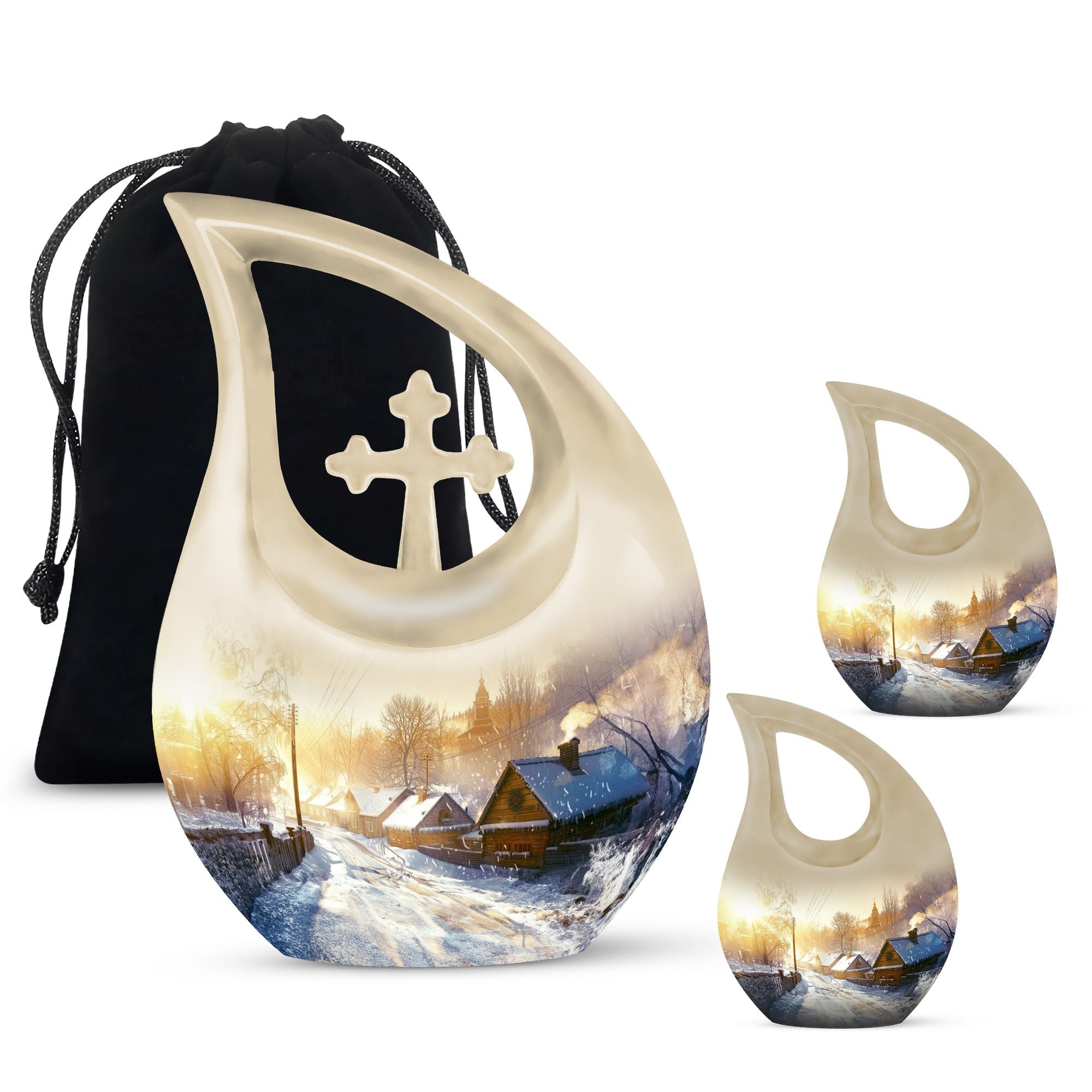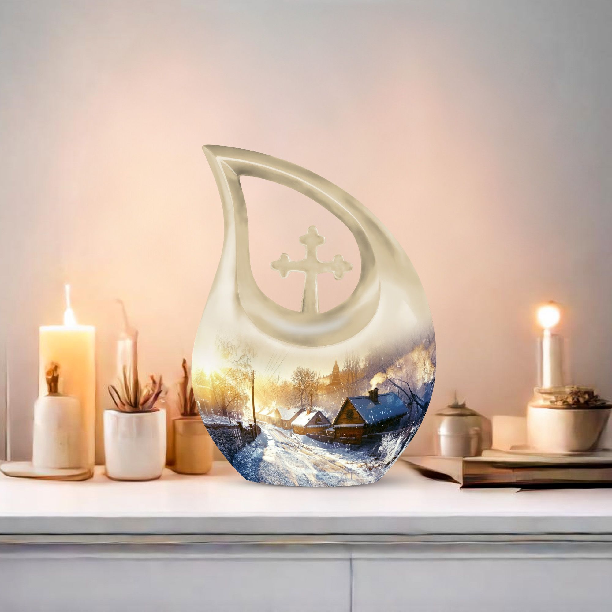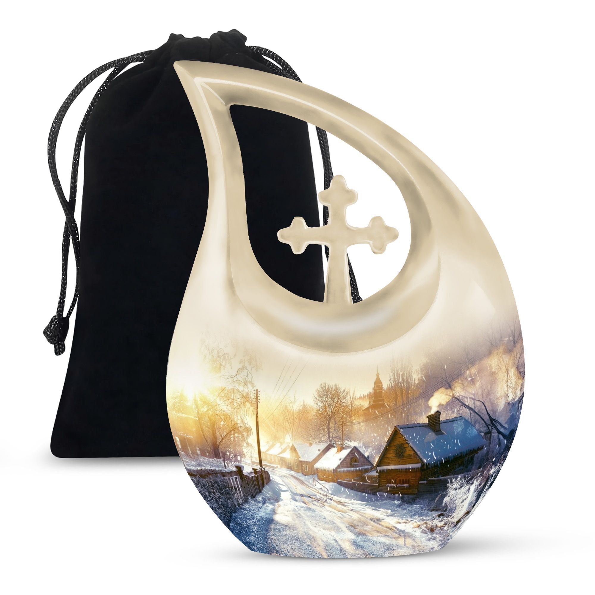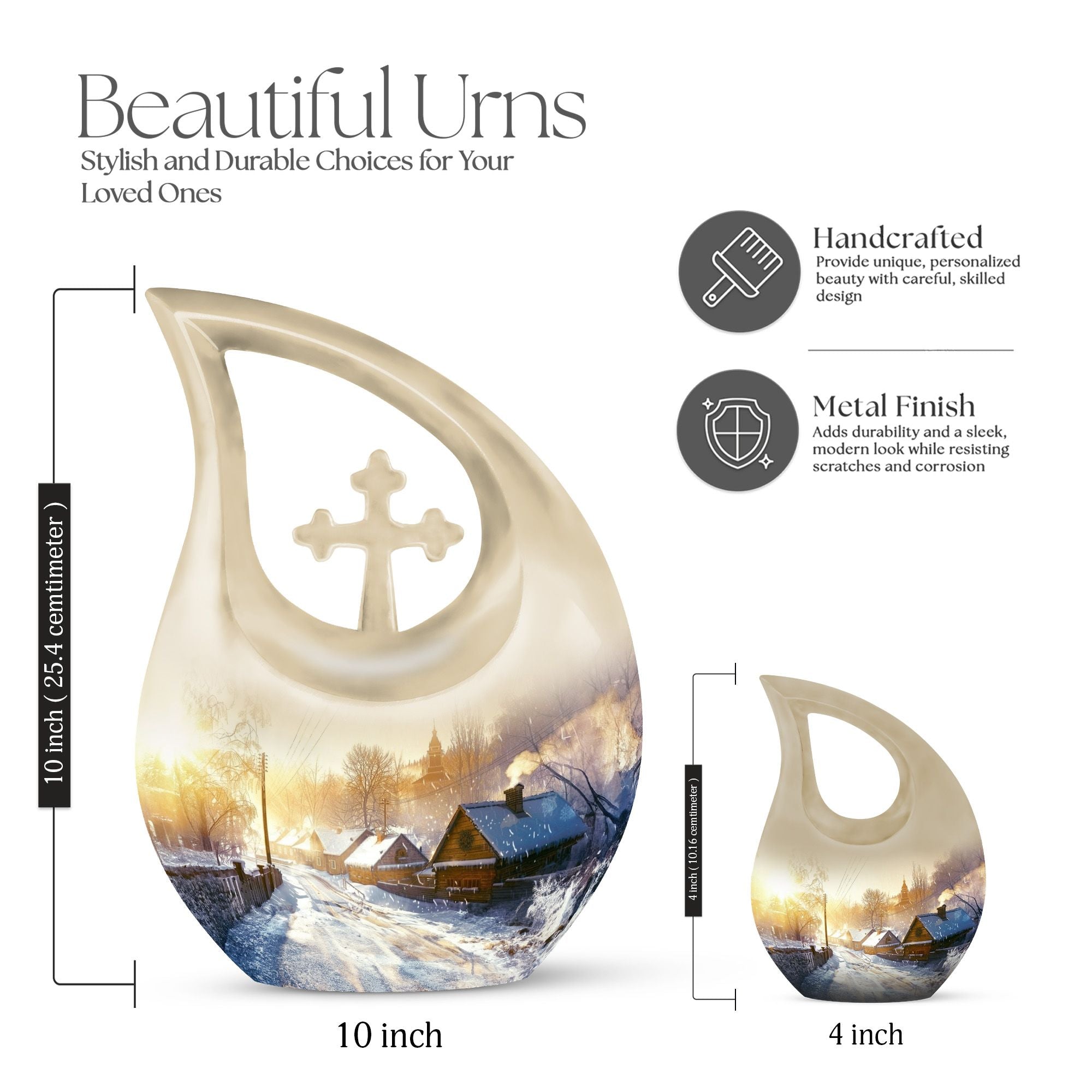 Honor the memory of your beloved with the exquisitely crafted Snowflakes Urn, a beautifully symbolic and functional vase. The design features a unique 'Cross Drop' engraving, a stellar convergence of solemnity and elegance. Sized at a respectful 10 inch stature, it is substantial enough to serve as a memorial centerpiece, while intricately designed to invite a closer look. The urn is constructed from resolute Aluminium, designed to withstand outdoor conditions, making it perfect for an outdoor memorial ceremony. The Urn is of 200 cubic inches capacity, weighing a substantial 3.3 pounds, providing a solid and stable footprint for safe storage of ashes. The package comes with a velvet pouch to softly preserve the remains of your loved one. The urn is customizable - engrave the names of your beloved as a lasting testament of your love. This sizable urn typifies the dignity and irreplacability of human life, an Adult-size memorial marker that never ceases to remind us of the bond we shared with the departed. It also serves as a timeless reminder of the transience of life, making it ideal for religious and memorial ceremonies. As a touch of personalization, our Pet Urn Vase can be engraved with names. Uniquely enamoured with a Theme reflecting glistening Snowflakes, this urn exudes a peaceful disposition that reflects in its aura. Highly searched terminologies such as 'Urns for Women's Ashes', 'Outdoor Cremation Urns', and 'Outdoor Urns' align well with this product.