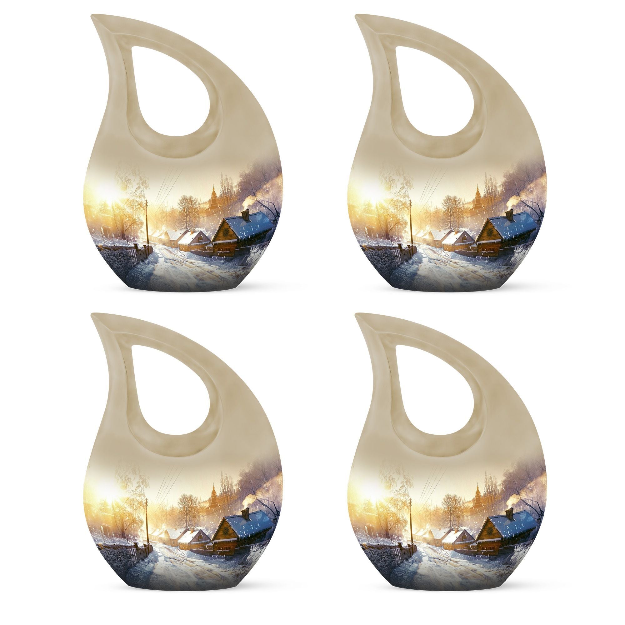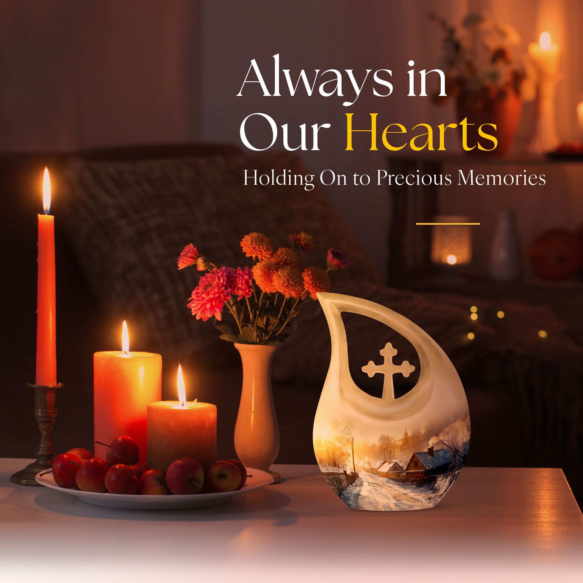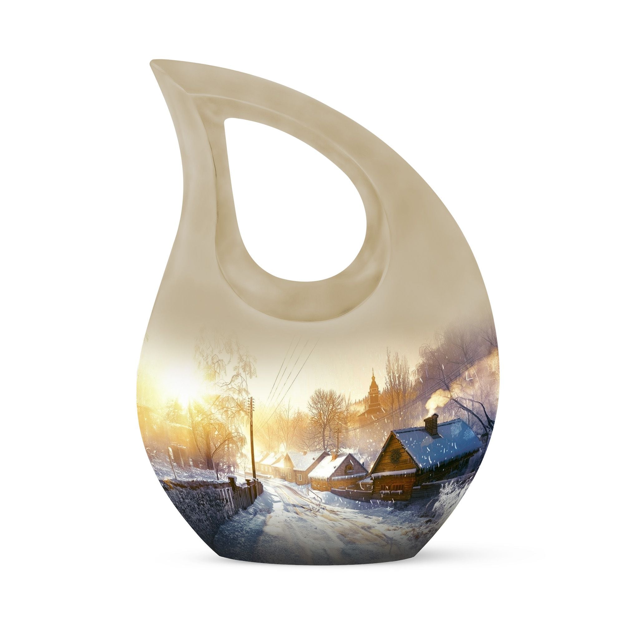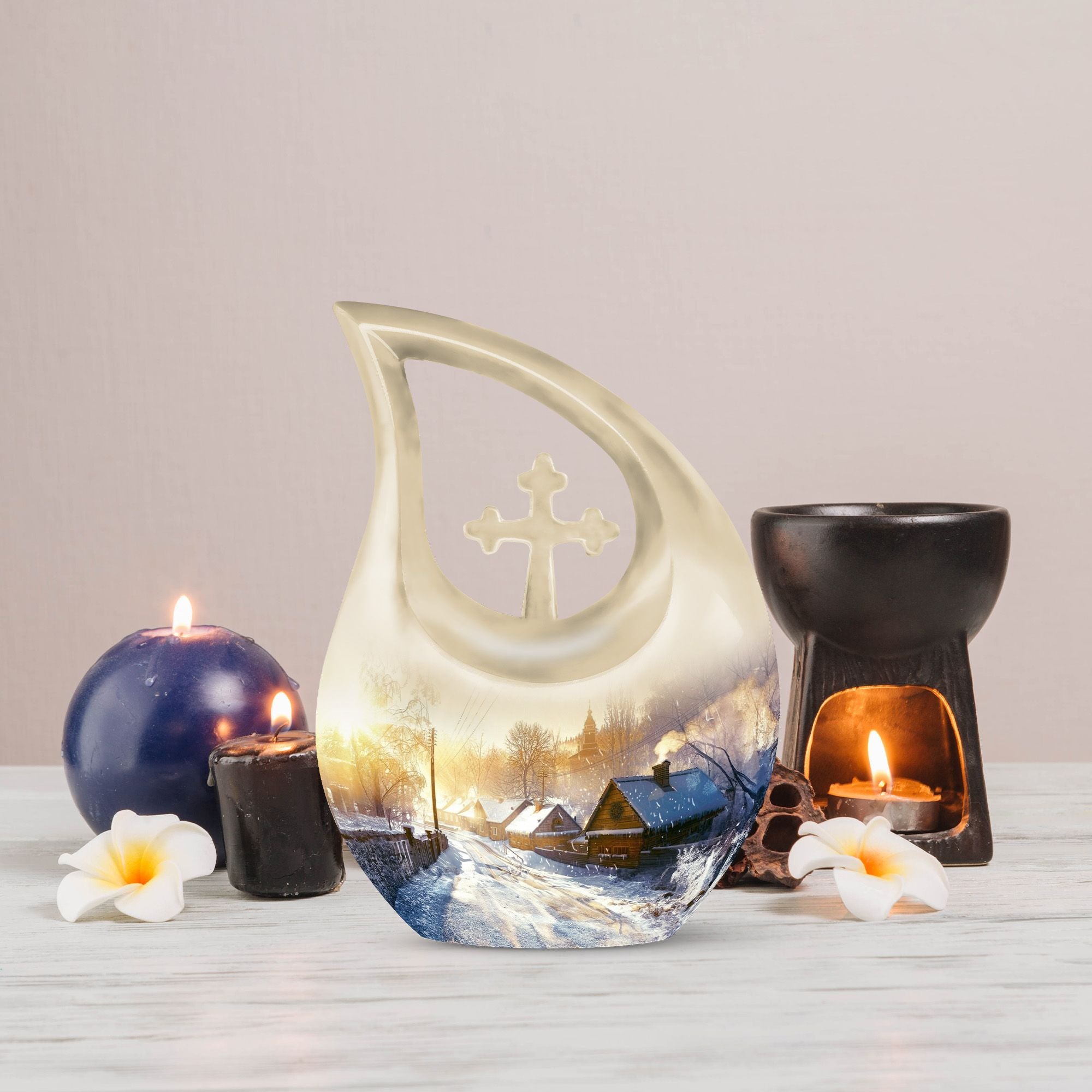 Honor the memory of your beloved with the exquisitely crafted Snowflakes Urn, a beautifully symbolic and functional vase. The design features a unique 'Cross Drop' engraving, a stellar convergence of solemnity and elegance. Sized at a respectful 10 inch stature, it is substantial enough to serve as a memorial centerpiece, while intricately designed to invite a closer look. The urn is constructed from resolute Aluminium, designed to withstand outdoor conditions, making it perfect for an outdoor memorial ceremony. The Urn is of 200 cubic inches capacity, weighing a substantial 3.3 pounds, providing a solid and stable footprint for safe storage of ashes. The package comes with a velvet pouch to softly preserve the remains of your loved one. The urn is customizable - engrave the names of your beloved as a lasting testament of your love. This sizable urn typifies the dignity and irreplacability of human life, an Adult-size memorial marker that never ceases to remind us of the bond we shared with the departed. It also serves as a timeless reminder of the transience of life, making it ideal for religious and memorial ceremonies. As a touch of personalization, our Pet Urn Vase can be engraved with names. Uniquely enamoured with a Theme reflecting glistening Snowflakes, this urn exudes a peaceful disposition that reflects in its aura. Highly searched terminologies such as 'Urns for Women's Ashes', 'Outdoor Cremation Urns', and 'Outdoor Urns' align well with this product.