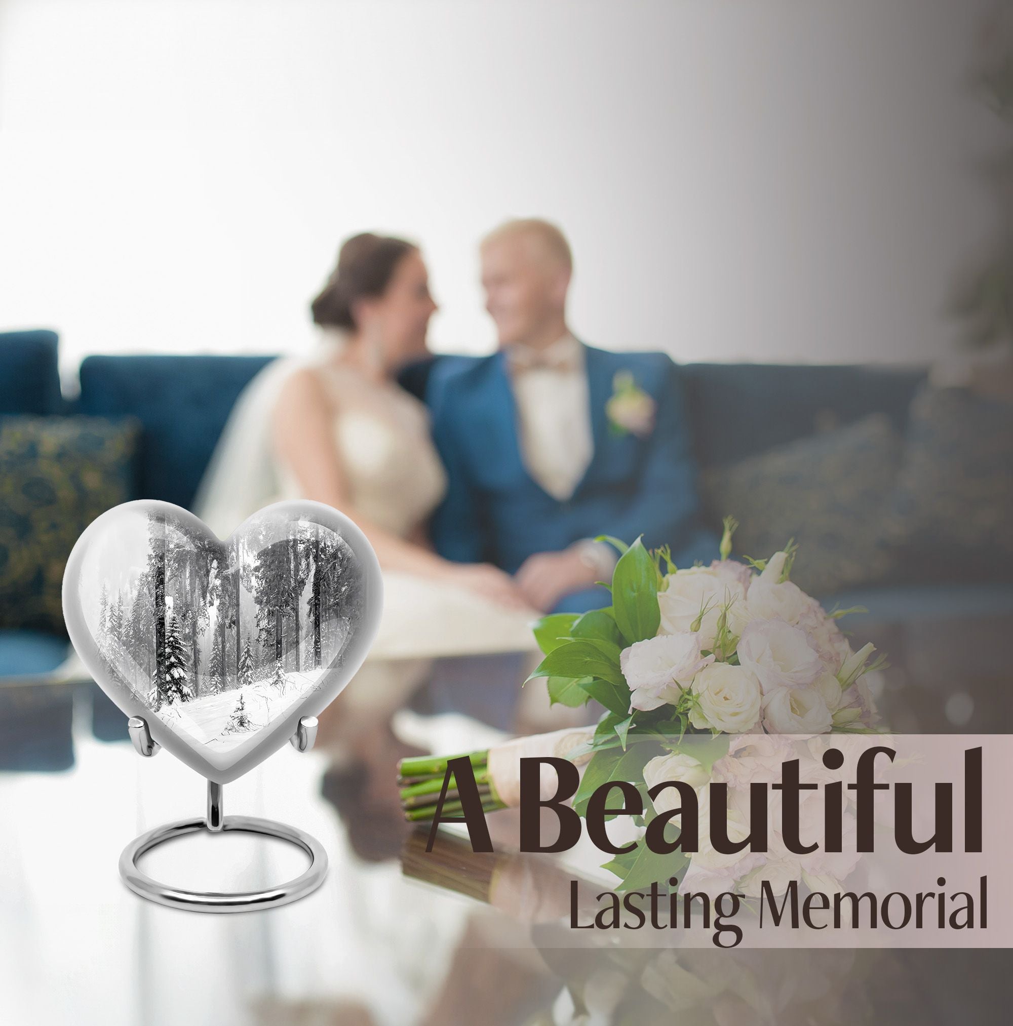 Experience the memory-embracing tranquility with our large-sized, snowflakes-theme urn for memorializing loved ones. This alluring 10 inch aluminium-made masterpiece, recognized as the heart urn, stands out as a grand emblem of love and respect. The dignified weight of 3.3 pounds coupled with a capacity of 200 cubic inches affordably accommodates ashes while firmly standing its ground. Incorporated with a treasured snowflakes theme, our urn is not your ordinary funeral remnant. It allows personalizing with engraved names, bestowing a more intimate touch. Together with your purchase, enjoy a complimentary velvet pouch perfect for containment of ashes. An emblematic vessel for preserving memories, this piece resonates with artistic souls longing for a unique, handcrafted cremation piece. As one of our most sought-after memorial urns, grab one today and let memories of your loved ones thrive in the soft ambiance of affection and reverence.
