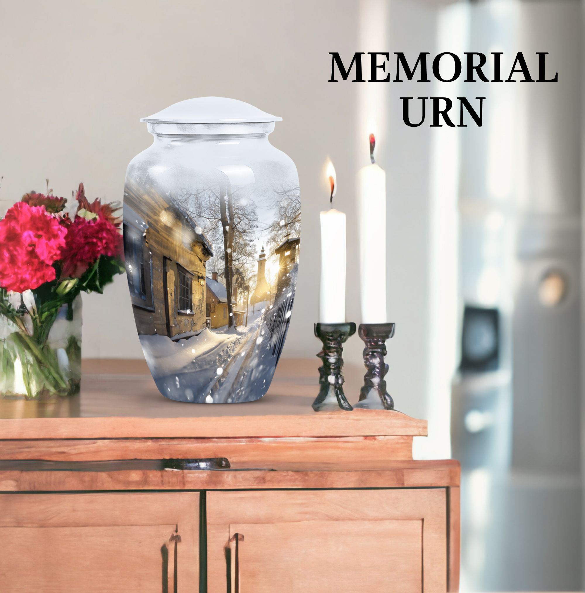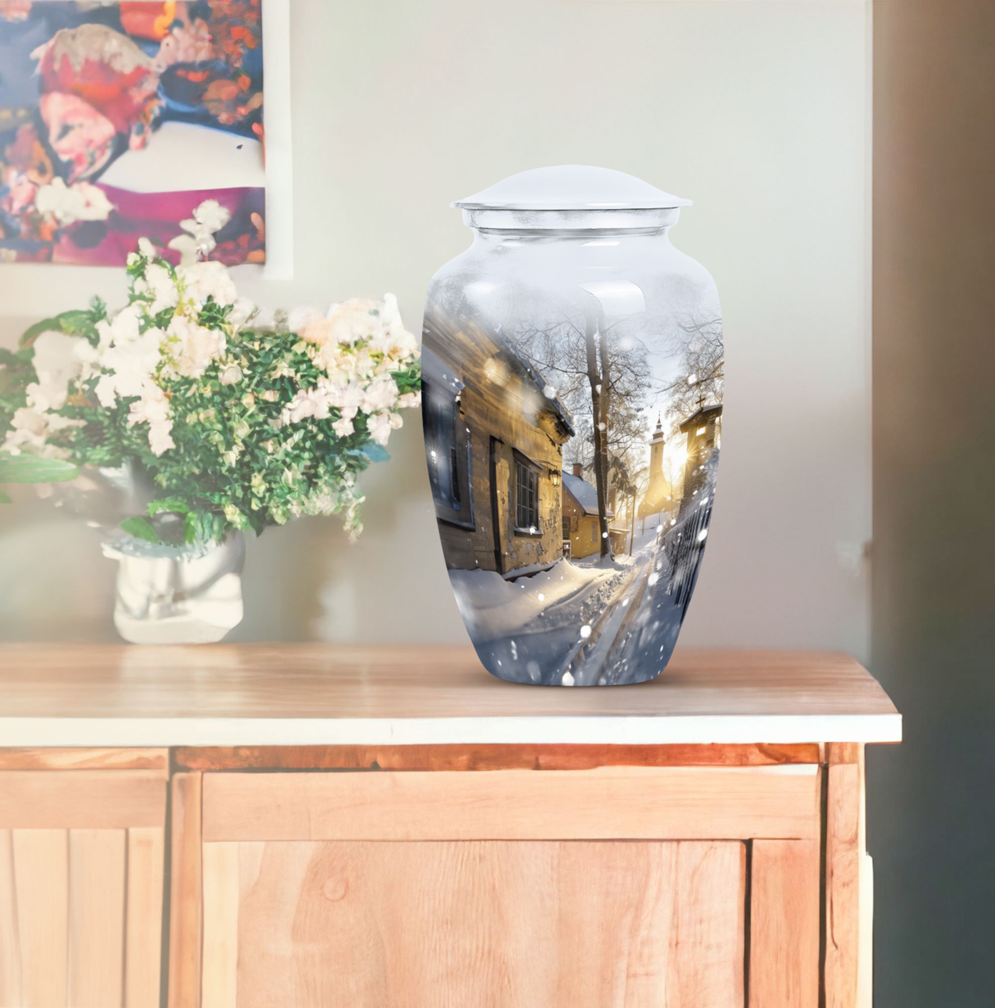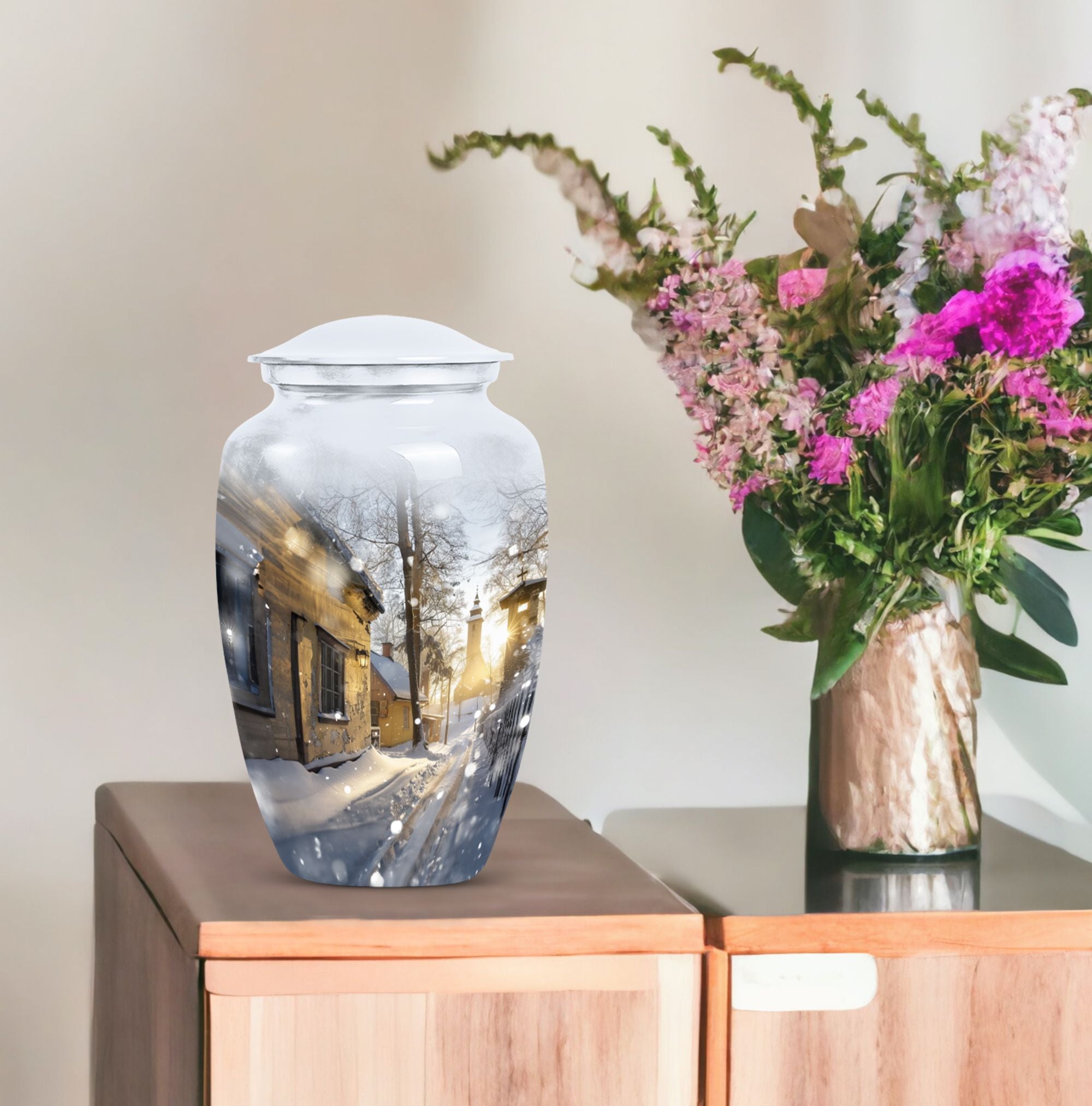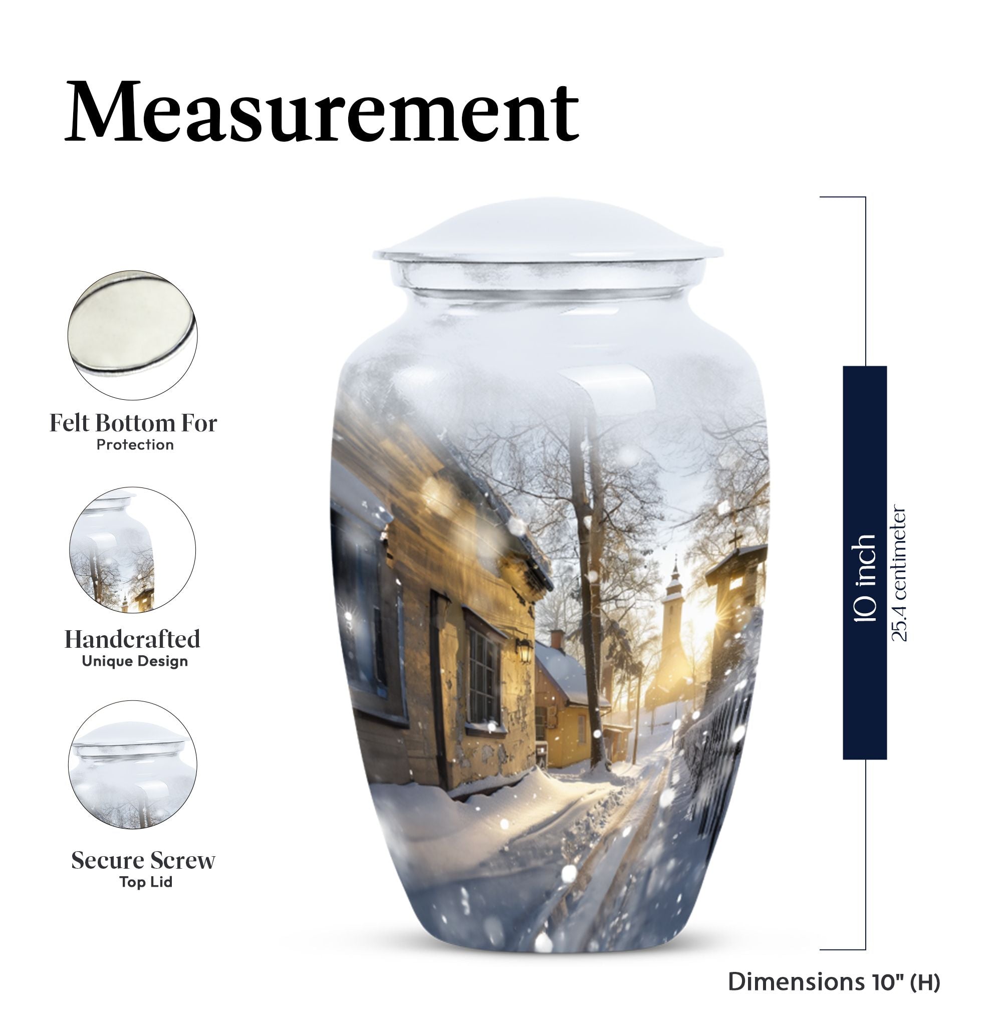 Preserve the treasured memory of a loved one with finesse and grace with our Snowflakes Urn. This elegant solution for storing ashes stands 10 inches tall, flaunting a tasteful, classic urn design crafted from top-quality aluminium. The urn provides ample space, with a capacity to hold 200 cubic inches of ash, and weigh a sturdy 3.3 pounds. This elegantly proportioned memorial urn lets you personalize a heart-touching tribute as it allows customization with engraved names, making the urn one-of-a-kind. Your purchase includes a velvet pouch, a thoughtful containment solution for the cherished ashes. The subtle snowflakes theme soothingly intertwined with this large urn’s design serves as a serene, visual reminder of the winter's first snowfall. Give your memory a dignified resting place with our funeral metal urn. This item is not merely an urn for burial, it serves as a heartfelt tribute and a constant reminder of unconditional love. Ideal for your search of urns metal, this unique shaped ashes urn is an embodiment of elegance and lasting homage.