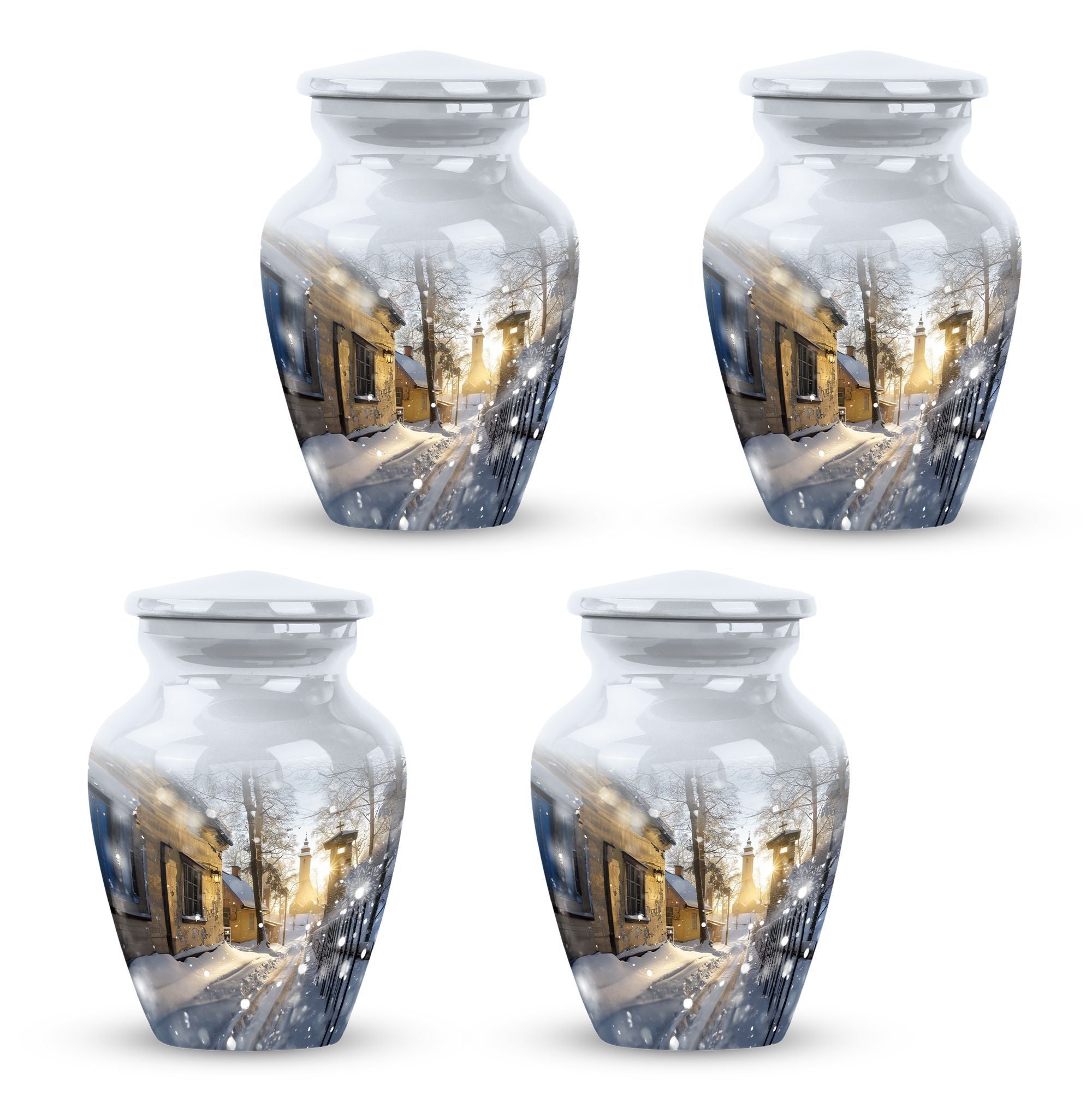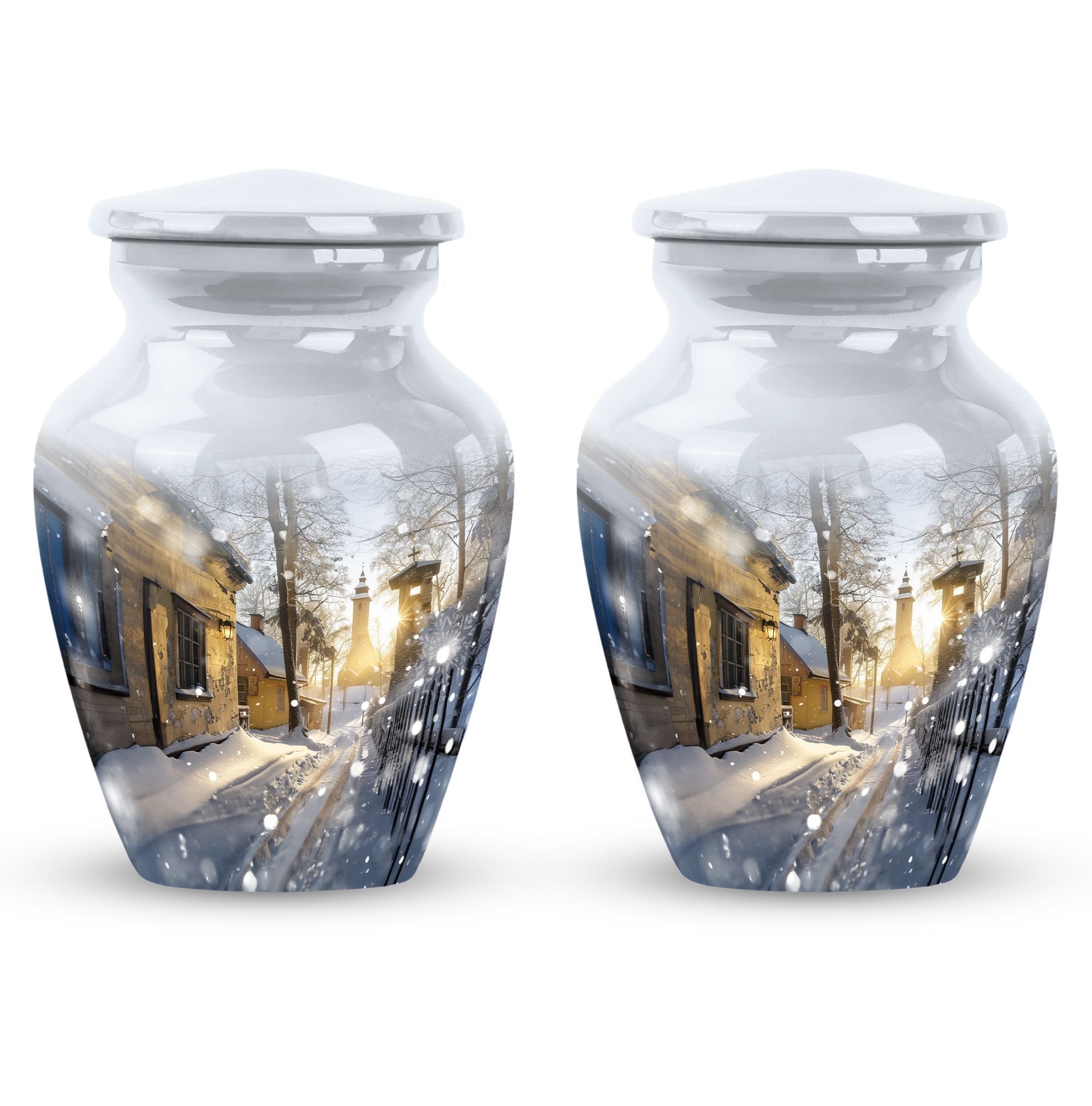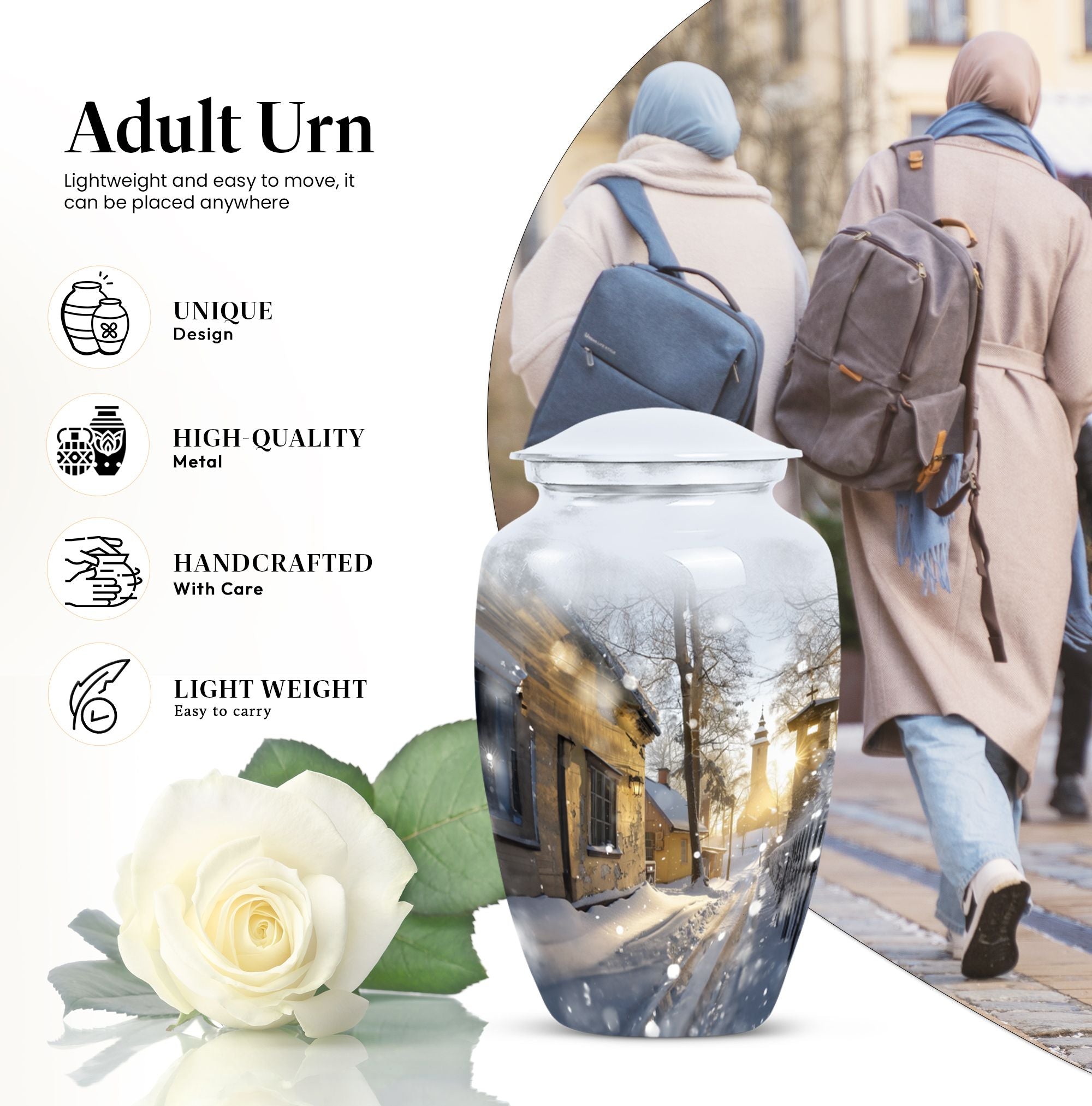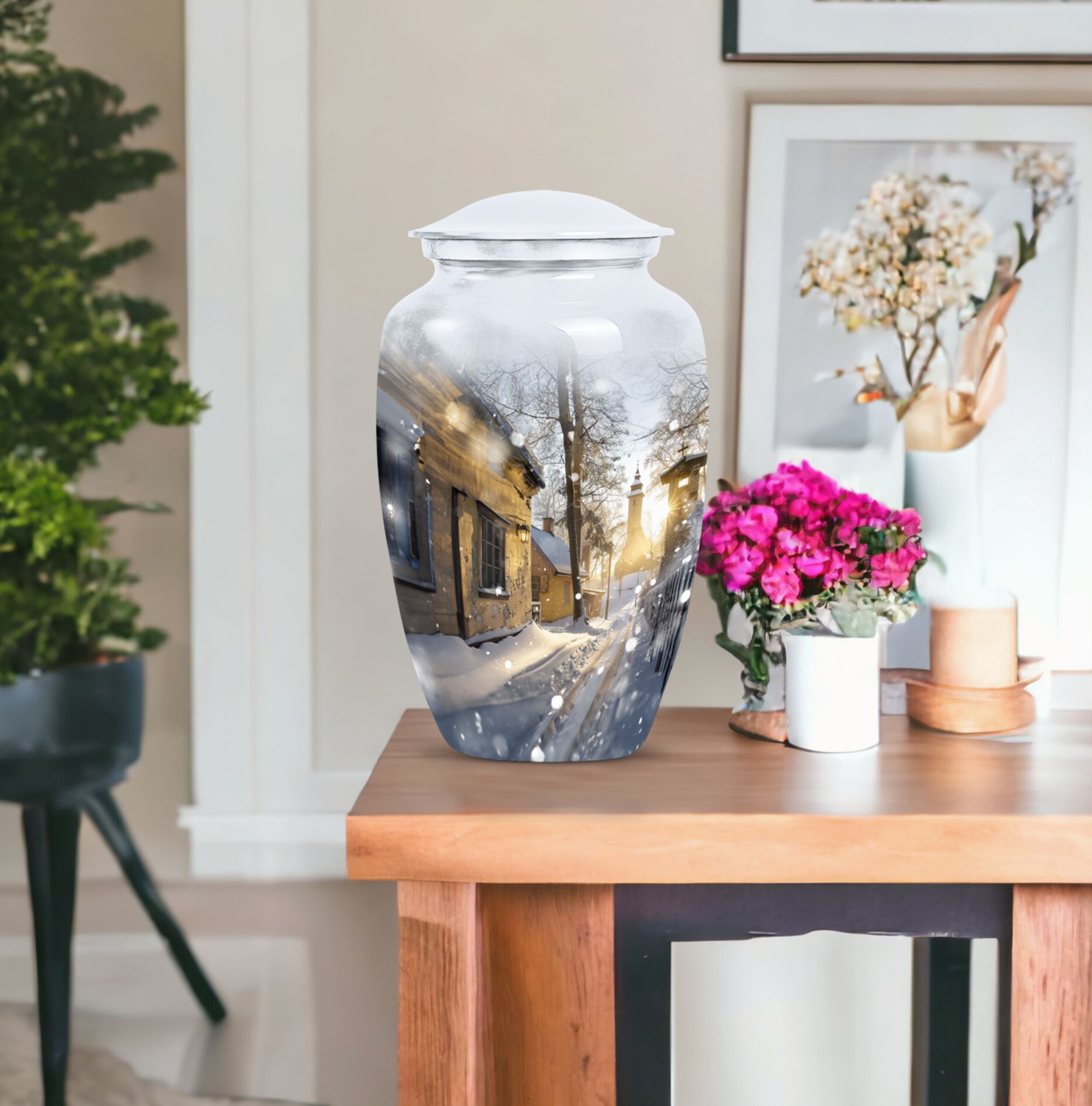 Preserve the treasured memory of a loved one with finesse and grace with our Snowflakes Urn. This elegant solution for storing ashes stands 10 inches tall, flaunting a tasteful, classic urn design crafted from top-quality aluminium. The urn provides ample space, with a capacity to hold 200 cubic inches of ash, and weigh a sturdy 3.3 pounds. This elegantly proportioned memorial urn lets you personalize a heart-touching tribute as it allows customization with engraved names, making the urn one-of-a-kind. Your purchase includes a velvet pouch, a thoughtful containment solution for the cherished ashes. The subtle snowflakes theme soothingly intertwined with this large urn’s design serves as a serene, visual reminder of the winter's first snowfall. Give your memory a dignified resting place with our funeral metal urn. This item is not merely an urn for burial, it serves as a heartfelt tribute and a constant reminder of unconditional love. Ideal for your search of urns metal, this unique shaped ashes urn is an embodiment of elegance and lasting homage.